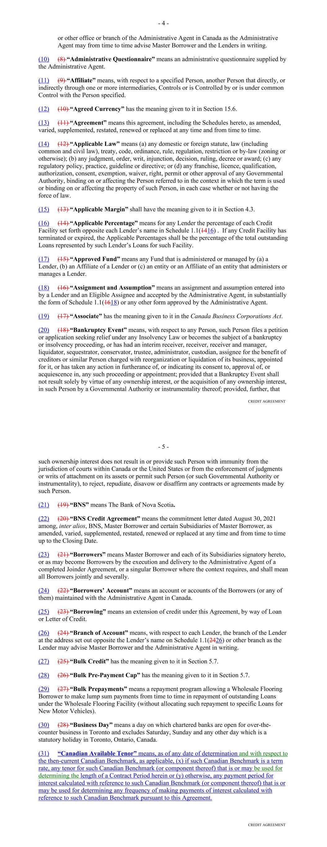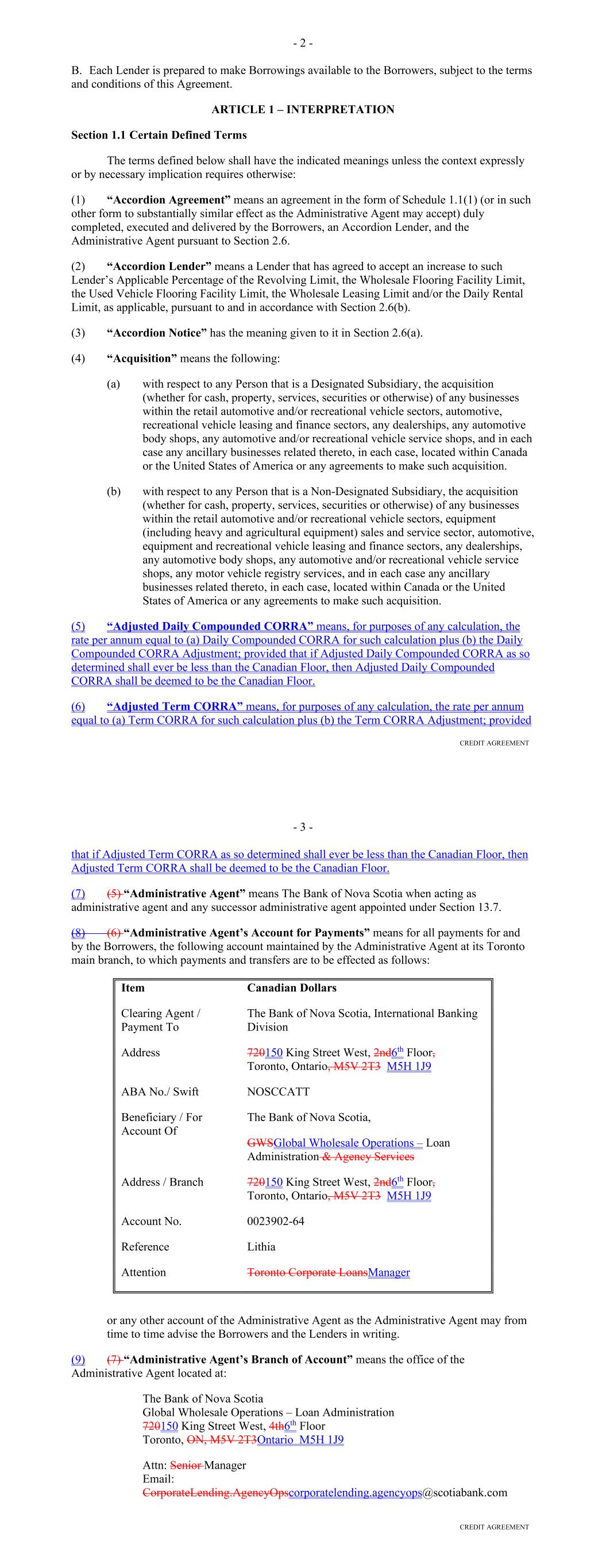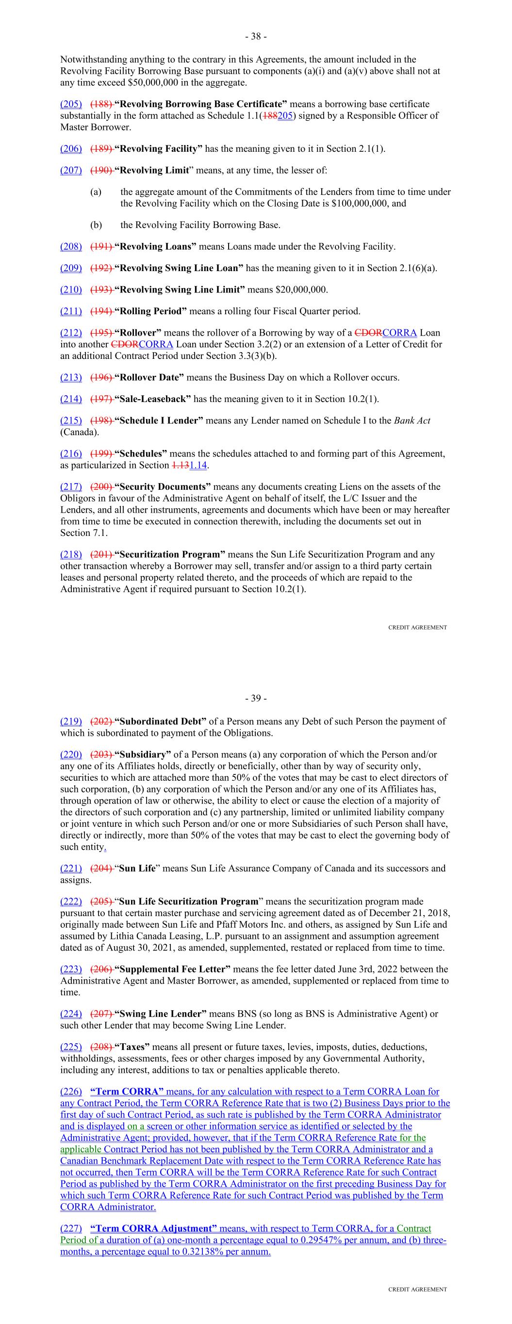 annum with respect to a Receivable as of such Funding Date is reduced (i) as a result of an Insolvency Proceeding involving the related Obligor or (ii) pursuant to the Servicemembers Civil Relief Act or similar State law, "Annual Percentage Rate" or "APR" shall refer to such reduced rate. "Anti-Corruption Laws" means all laws, rules, and regulations of the United States or any State that are applicable to DFC, Lithia, the Borrower or their respective Affiliates or Subsidiaries from time to time concerning or relating to bribery or corruption. "Applicable Law" means, for any Person, all existing and future applicable laws, rules, regulations (including proposed, temporary and final income tax regulations), statutes, treaties, codes, ordinances, permits, certificates, orders and licenses of and interpretations by any Governmental Authority (including usury laws, the Federal Truth in Lending Act, Regulation Z and Regulation B of the Federal Reserve Board, the Securities Act (including Regulation AB thereunder) and the Exchange Act), and applicable judgments, decrees, injunctions, writs, orders or line actions of any court, arbitrator or other administrative, judicial or quasi-judicial tribunal or agency of competent jurisdiction. "Applicable Margin" has the meaning given to such term in the Fee Letter. "Assignment and Acceptance" means an assignment and acceptance agreement between a Lender and an Eligible Assignee, in substantially the form of Exhibit B hereto. "Available Amount" means, with respect to any day, the positive amount, if any, by which the Facility Amount exceeds the Loans Outstanding on such day. "Available Funds" means, for any Payment Date and the related Collection Period, Collections on deposit in the Collection Account, to the extent received during the related Collection Period. "Backup Servicer" means a Person that is (i) reasonably acceptable to the Administrative Agent and that has been (ii) appointed as the "Backup Servicer" under a Backup Servicing Agreement that is entered into in accordance with Section 7.09. "Backup Servicing Agreement" means an agreement entered into by the Servicer, the Borrower and a Person that is either (i) listed on Schedule G hereto (as the same may be updated from time to time by the Administrative Agent in its sole discretion) or (ii) otherwise reasonably acceptable to the Administrative Agent, and who agrees thereunder to serve as the backup servicer, pursuant to which such Person agrees (a) to perform certain servicing duties with respect to the Receivables as set forth therein, including but not limited to providing a Monthly Backup Servicer Certificate to the Administrative Agent and the Lenders each month, (b) to be bound by the terms and provisions relating to the Backup Servicer as set forth in the Basic Documents, except for any such terms and provisions that are expressly modified or waived in the Backup Servicing Agreement (with the express consent of the Administrative Agent), and (c) to succeed to the role of Servicer if the initial Servicer resigns or is terminated in accordance with the terms of this Agreement. 4 "Backup Servicing Fee" means (i) prior to the appointment of a Backup Servicer, $0, and (ii) thereafter, the fees payable to the Backup Servicer as set forth in the Backup Servicing Agreement. "Backup Servicing Fee Rate" means, (i) with respect to any Collection Period prior to the appointment of a Backup Servicer, 0%, and (ii) with respect to the Collection Period during which the Backup Servicer was first engaged pursuant to Section 7.09 and for each Collection Period thereafter, (a) the percentage equivalent of a fraction, (1) the numerator of which is the Backup Servicing Fee and (2) the denominator of which is the average daily Pool Balance during the related Collection Period, times (b) 12. "Bankruptcy Code" means the United States Bankruptcy Code (Title 11 of the United States Code). "Basel II" means the second Basel Accord issued by the Basel Committee on Banking Supervision. "Basel III" means the third Basel Accord issued by the Basel Committee on Banking Supervision. "Basic Documents" means this Agreement, the Purchase Agreement, each Purchase Agreement Supplement, the Fee Letter, all Hedging Agreements, the Control Agreement, the Performance Guaranty, each Electronic Vault Services Agreement, and any other document, certificate, opinion, agreement or writing the execution of which is necessary or incidental to carrying out the transactions contemplated by this Agreement or any of the other foregoing documents. "Benchmark" means, with respect to the portion of the Loans Outstanding that is funded or maintained either (i) by a Conduit Lender other than by issuing Commercial Paper Notes or (ii) by a Committed Lender, initially, Daily Simple SOFR; provided, that if a Benchmark Transition Event and the related Benchmark Replacement Date have occurred with respect to Daily Simple SOFR or the then-current Benchmark, then 'Benchmark' means the applicable Benchmark Replacement to the extent that such Benchmark Replacement has replaced such prior benchmark rate pursuant to clause (b) of Section 2.17. "Benchmark Replacement" means, with respect to the portion of the Loans Outstanding that is funded or maintained either (i) by a Conduit Lender other than by issuing Commercial Paper Notes or (ii) by a Committed Lender, the sum of: (a) the alternate benchmark rate that has been selected by the Administrative Agent and the Borrower as the replacement for the then-current Benchmark giving due consideration to (1) any selection or recommendation of a replacement benchmark rate or the mechanism for determining such a rate by the Relevant Governmental Body or (2) any evolving or then-prevailing market convention for determining a benchmark rate as a replacement for the then-current Benchmark for dollar-denominated syndicated credit facilities at such time in the United States and (b) the related Benchmark Replacement Adju