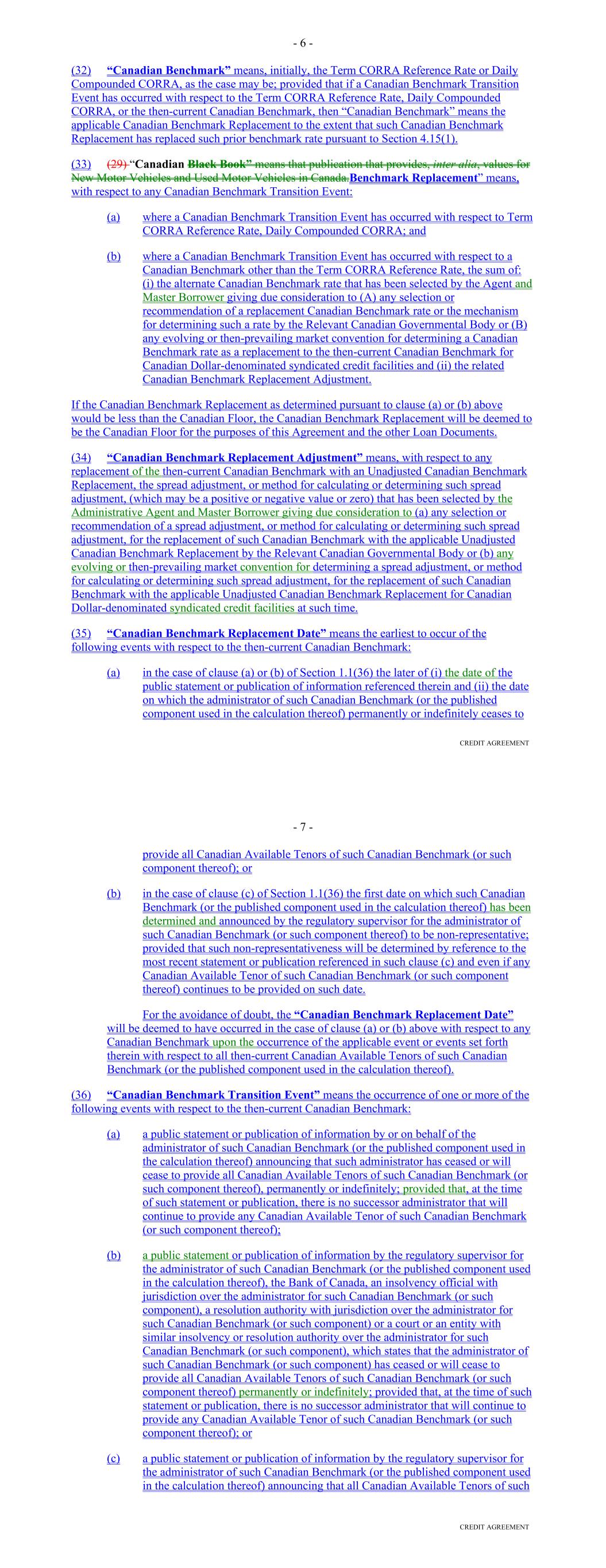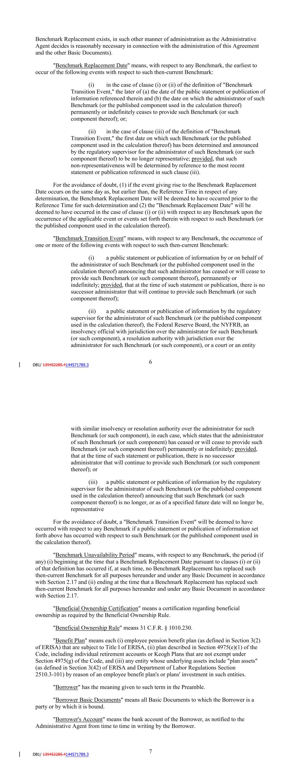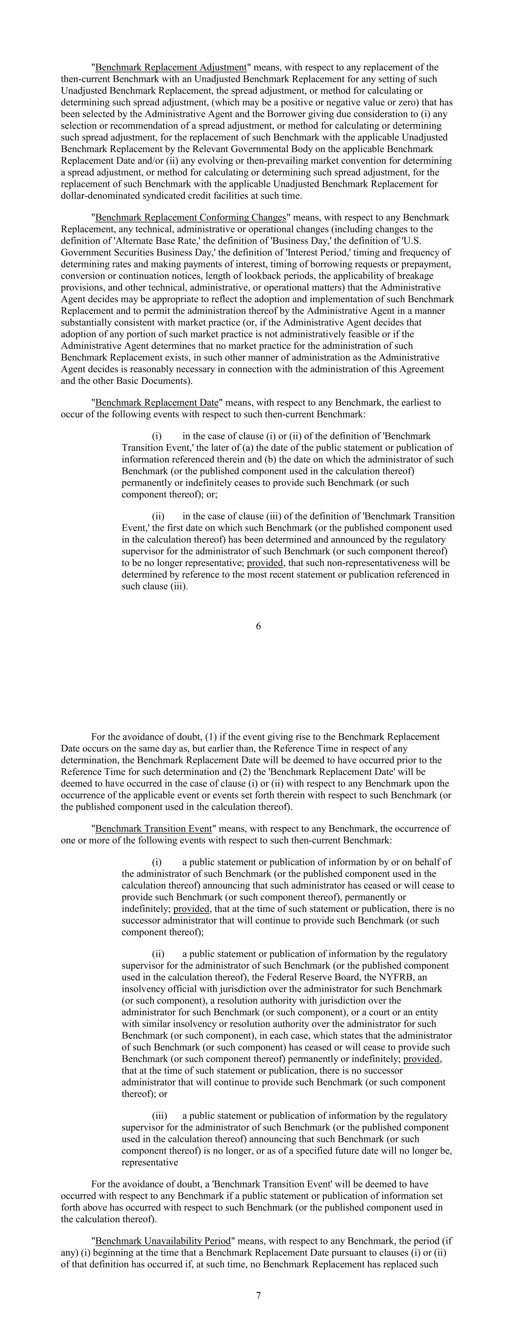 "Benchmark Replacement Adjustment" means, with respect to any replacement of the then-current Benchmark with an Unadjusted Benchmark Replacement for any setting of such Unadjusted Benchmark Replacement, the spread adjustment, or method for calculating or determining such spread adjustment, (which may be a positive or negative value or zero) that has been selected by the Administrative Agent and the Borrower giving due consideration to (i) any selection or recommendation of a spread adjustment, or method for calculating or determining such spread adjustment, for the replacement of such Benchmark with the applicable Unadjusted Benchmark Replacement by the Relevant Governmental Body on the applicable Benchmark Replacement Date and/or (ii) any evolving or then-prevailing market convention for determining a spread adjustment, or method for calculating or determining such spread adjustment, for the replacement of such Benchmark with the applicable Unadjusted Benchmark Replacement for dollar-denominated syndicated credit facilities at such time. "Benchmark Replacement Conforming Changes" means, with respect to any Benchmark Replacement, any technical, administrative or operational changes (including changes to the definition of 'Alternate Base Rate,' the definition of 'Business Day,' the definition of 'U.S. Government Securities Business Day,' the definition of 'Interest Period,' timing and frequency of determining rates and making payments of interest, timing of borrowing requests or prepayment, conversion or continuation notices, length of lookback periods, the applicability of breakage provisions, and other technical, administrative, or operational matters) that the Administrative Agent decides may be appropriate to reflect the adoption and implementation of such Benchmark Replacement and to permit the administration thereof by the Administrative Agent in a manner substantially consistent with market practice (or, if the Administrative Agent decides that adoption of any portion of such market practice is not administratively feasible or if the Administrative Agent determines that no market practice for the administration of such Benchmark Replacement exists, in such other manner of administration as the Administrative Agent decides is reasonably necessary in connection with the administration of this Agreement and the other Basic Documents). "Benchmark Replacement Date" means, with respect to any Benchmark, the earliest to occur of the following events with respect to such then-current Benchmark: (i) in the case of clause (i) or (ii) of the definition of 'Benchmark Transition Event,' the later of (a) the date of the public statement or publication of information referenced therein and (b) the date on which the administrator of such Benchmark (or the published component used in the calculation thereof) permanently or indefinitely ceases to provide such Benchmark (or such component thereof); or; (ii) in the case of clause (iii) of the definition of 'Benchmark Transition Event,' the first date on which such Benchmark (or the published component used in the calculation thereof) has been determined and announced by the regulatory supervisor for the administrator of such Benchmark (or such component thereof) to be no longer representative; provided, that such non-representativeness will be determined by reference to the most recent statement or publication referenced in such clause (iii). 6 For the avoidance of doubt, (1) if the event giving rise to the Benchmark Replacement Date occurs on the same day as, but earlier than, the Reference Time in respect of any determination, the Benchmark Replacement Date will be deemed to have occurred prior to the Reference Time for such determination and (2) the 'Benchmark Replacement Date' will be deemed to have occurred in the case of clause (i) or (ii) with respect to any Benchmark upon the occurrence of the applicable event or events set forth therein with respect to such Benchmark (or the published component used in the calculation thereof). "Benchmark Transition Event" means, with respect to any Benchmark, the occurrence of one or more of the following events with respect to such then-current Benchmark: (i) a public statement or publication of information by or on behalf of the administrator of such Benchmark (or the published component used in the calculation thereof) announcing that such administrator has ceased or will cease to provide such Benchmark (or such component thereof), permanently or indefinitely; provided, that at the time of such statement or publication, there is no successor administrator that will continue to provide such Benchmark (or such component thereof); (ii) a public statement or publication of information by the regulatory supervisor for the administrator of such Benchmark (or the published component used in the calculation thereof), the Federal Reserve Board, the NYFRB, an insolvency official with jurisdiction over the administrator for such Benchmark (or such component), a resolution authority with jurisdiction over the administrator for such Benchmark (or such component), or a court or an entity with similar insolvency or resolution authority over the administrator for such Benchmark (or such component), in each case, which states that the administrator of such Benchmark (or such component) has ceased or will cease to provide such Benchmark (or such component thereof) permanently or indefinitely; provided, that at the time of such statement or publication, there is no successor administrator that will continue to provide such Benchmark (or such component thereof); or (iii) a public statement or publication of information by the regulatory supervisor for the administrator of such Benchmark (or the published component used in the calculation thereof) announcing that such Benchmark (or such component thereof) is no longer, or as of a specified future date will no longer be, representative For the avoidance of doubt, a 'Benchmark 