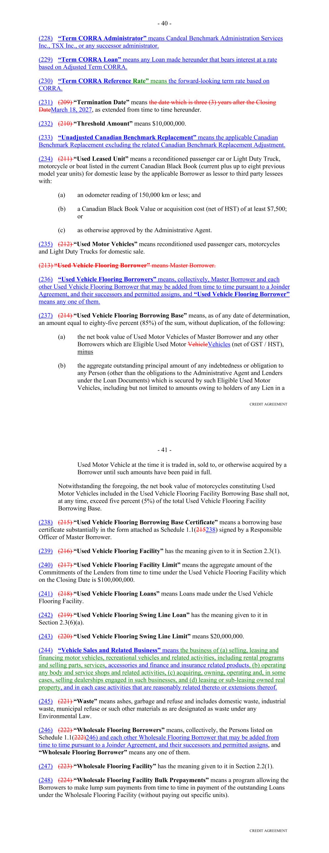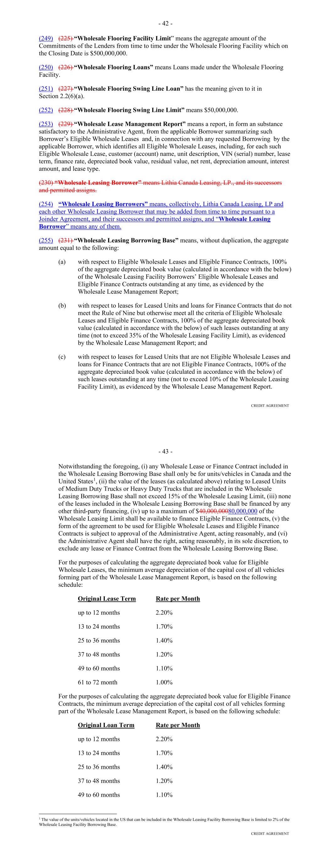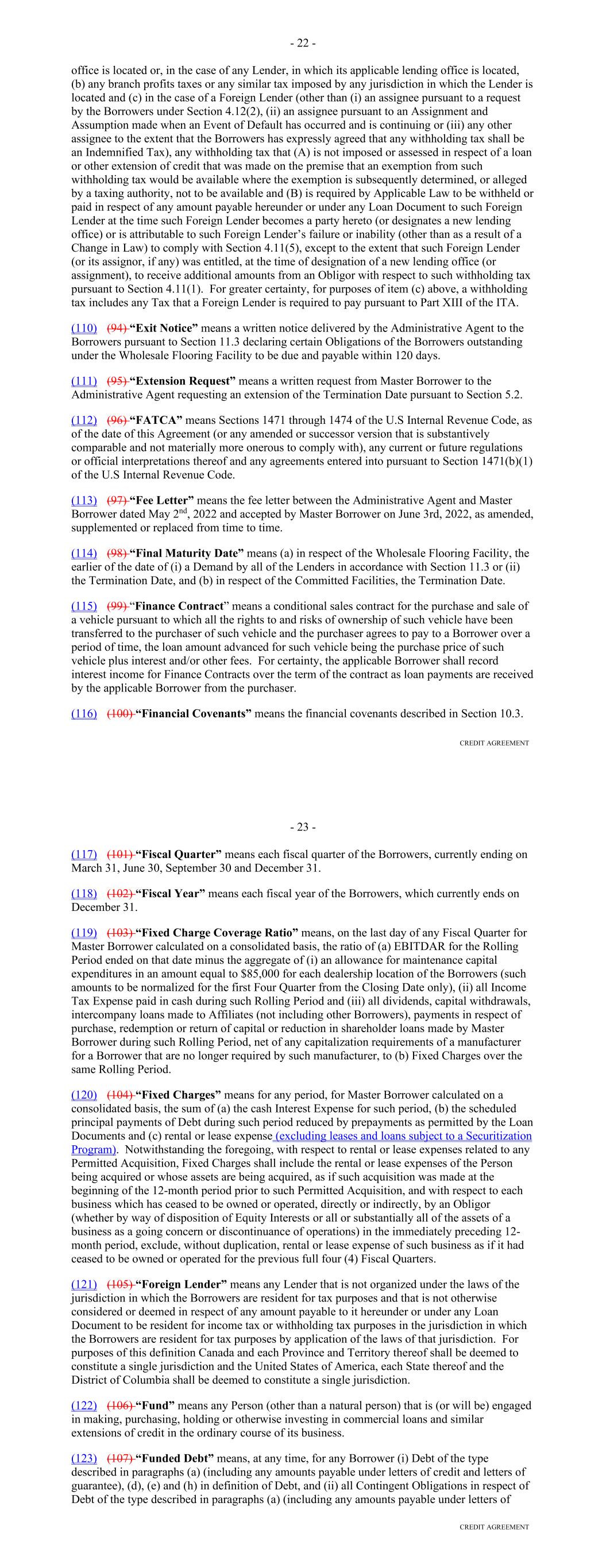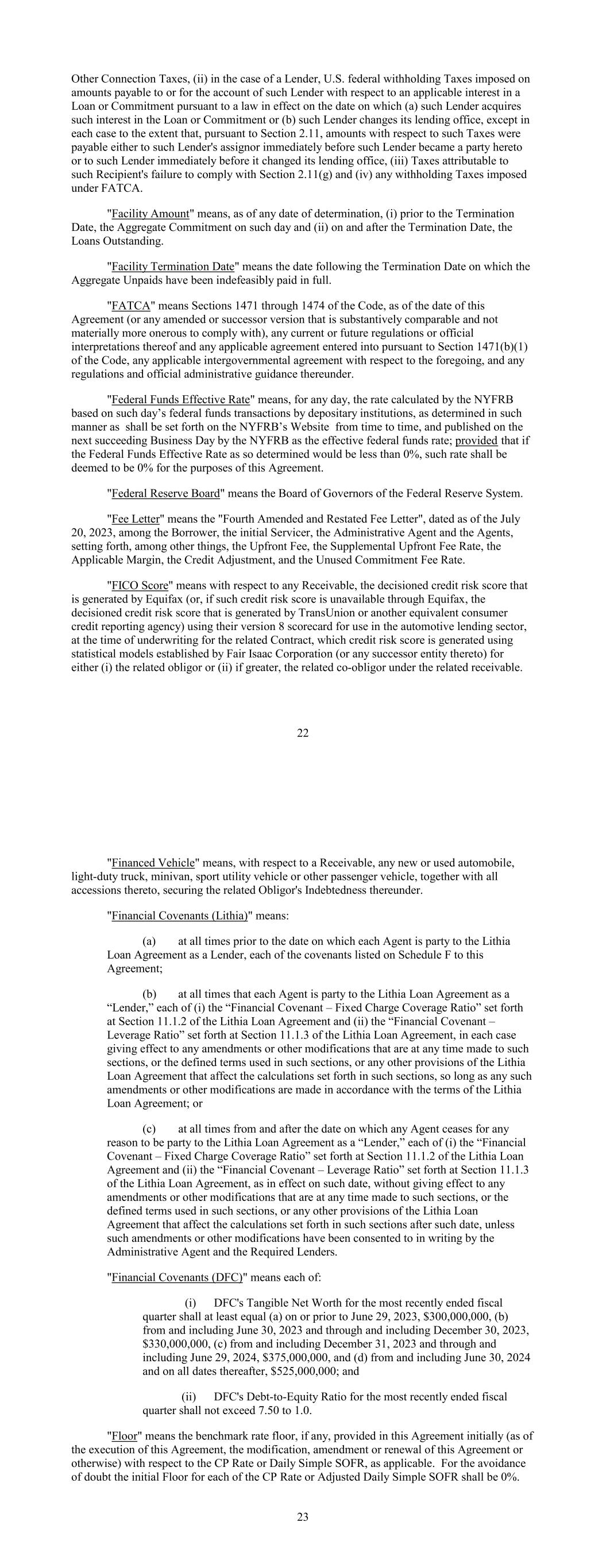 Other Connection Taxes, (ii) in the case of a Lender, U.S. federal withholding Taxes imposed on amounts payable to or for the account of such Lender with respect to an applicable interest in a Loan or Commitment pursuant to a law in effect on the date on which (a) such Lender acquires such interest in the Loan or Commitment or (b) such Lender changes its lending office, except in each case to the extent that, pursuant to Section 2.11, amounts with respect to such Taxes were payable either to such Lender's assignor immediately before such Lender became a party hereto or to such Lender immediately before it changed its lending office, (iii) Taxes attributable to such Recipient's failure to comply with Section 2.11(g) and (iv) any withholding Taxes imposed under FATCA. "Facility Amount" means, as of any date of determination, (i) prior to the Termination Date, the Aggregate Commitment on such day and (ii) on and after the Termination Date, the Loans Outstanding. "Facility Termination Date" means the date following the Termination Date on which the Aggregate Unpaids have been indefeasibly paid in full. "FATCA" means Sections 1471 through 1474 of the Code, as of the date of this Agreement (or any amended or successor version that is substantively comparable and not materially more onerous to comply with), any current or future regulations or official interpretations thereof and any applicable agreement entered into pursuant to Section 1471(b)(1) of the Code, any applicable intergovernmental agreement with respect to the foregoing, and any regulations and official administrative guidance thereunder. "Federal Funds Effective Rate" means, for any day, the rate calculated by the NYFRB based on such day’s federal funds transactions by depositary institutions, as determined in such manner as shall be set forth on the NYFRB’s Website from time to time, and published on the next succeeding Business Day by the NYFRB as the effective federal funds rate; provided that if the Federal Funds Effective Rate as so determined would be less than 0%, such rate shall be deemed to be 0% for the purposes of this Agreement. "Federal Reserve Board" means the Board of Governors of the Federal Reserve System. "Fee Letter" means the "Fourth Amended and Restated Fee Letter", dated as of the July 20, 2023, among the Borrower, the initial Servicer, the Administrative Agent and the Agents, setting forth, among other things, the Upfront Fee, the Supplemental Upfront Fee Rate, the Applicable Margin, the Credit Adjustment, and the Unused Commitment Fee Rate. "FICO Score" means with respect to any Receivable, the decisioned credit risk score that is generated by Equifax (or, if such credit risk score is unavailable through Equifax, the decisioned credit risk score that is generated by TransUnion or another equivalent consumer credit reporting agency) using their version 8 scorecard for use in the automotive lending sector, at the time of underwriting for the related Contract, which credit risk score is generated using statistical models established by Fair Isaac Corporation (or any successor entity thereto) for either (i) the related obligor or (ii) if greater, the related co-obligor under the related receivable. 22 "Financed Vehicle" means, with respect to a Receivable, any new or used automobile, light-duty truck, minivan, sport utility vehicle or other passenger vehicle, together with all accessions thereto, securing the related Obligor's Indebtedness thereunder. "Financial Covenants (Lithia)" means: (a) at all times prior to the date on which each Agent is party to the Lithia Loan Agreement as a Lender, each of the covenants listed on Schedule F to this Agreement; (b) at all times that each Agent is party to the Lithia Loan Agreement as a “Lender,” each of (i) the “Financial Covenant – Fixed Charge Coverage Ratio” set forth at Section 11.1.2 of the Lithia Loan Agreement and (ii) the “Financial Covenant – Leverage Ratio” set forth at Section 11.1.3 of the Lithia Loan Agreement, in each case giving effect to any amendments or other modifications that are at any time made to such sections, or the defined terms used in such sections, or any other provisions of the Lithia Loan Agreement that affect the calculations set forth in such sections, so long as any such amendments or other modifications are made in accordance with the terms of the Lithia Loan Agreement; or (c) at all times from and after the date on which any Agent ceases for any reason to be party to the Lithia Loan Agreement as a “Lender,” each of (i) the “Financial Covenant – Fixed Charge Coverage Ratio” set forth at Section 11.1.2 of the Lithia Loan Agreement and (ii) the “Financial Covenant – Leverage Ratio” set forth at Section 11.1.3 of the Lithia Loan Agreement, as in effect on such date, without giving effect to any amendments or other modifications that are at any time made to such sections, or the defined terms used in such sections, or any other provisions of the Lithia Loan Agreement that affect the calculations set forth in such sections after such date, unless such amendments or other modifications have been consented to in writing by the Administrative Agent and the Required Lenders. "Financial Covenants (DFC)" means each of: (i) DFC's Tangible Net Worth for the most recently ended fiscal quarter shall at least equal (a) on or prior to June 29, 2023, $300,000,000, (b) from and including June 30, 2023 and through and including December 30, 2023, $330,000,000, (c) from and including December 31, 2023 and through and including June 29, 2024, $375,000,000, and (d) from and including June 30, 2024 and on all dates thereafter, $525,000,000; and (ii) DFC's Debt-to-Equity Ratio for the most recently ended fiscal quarter shall not exceed 7.50 to 1.0. "Floor" means the benchmark rate floor, if any, provided in this Agreement initially (as of the execution of this Agreement, the modification, amendment or renewal of this Agreeme