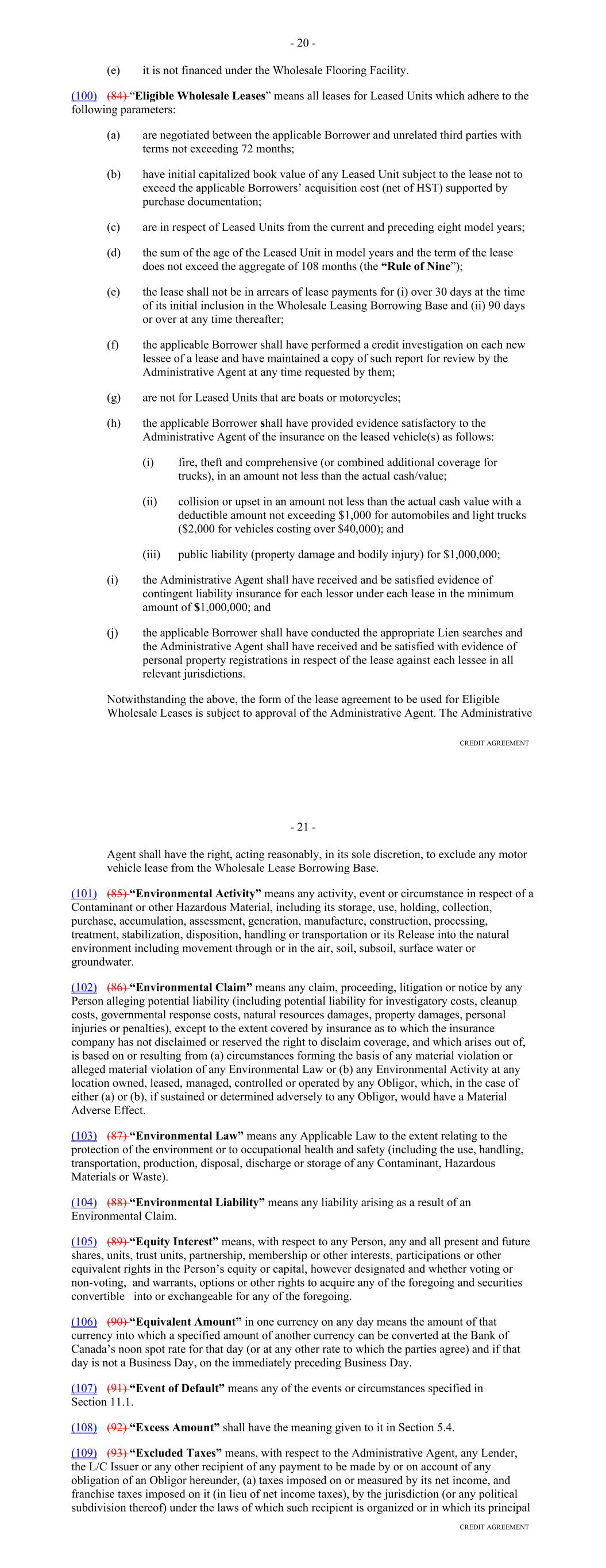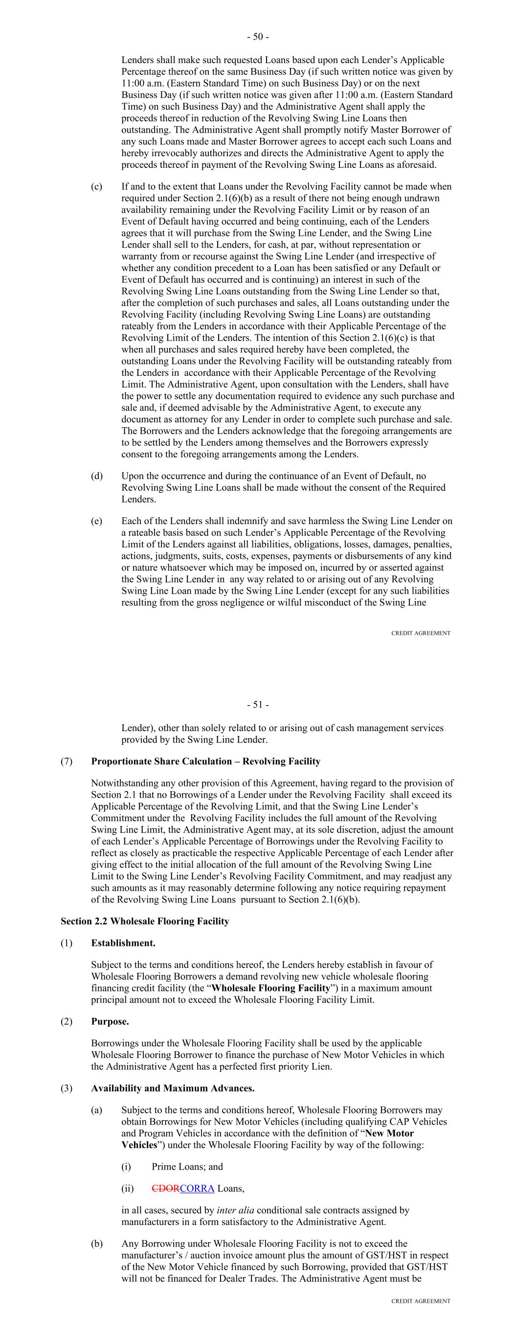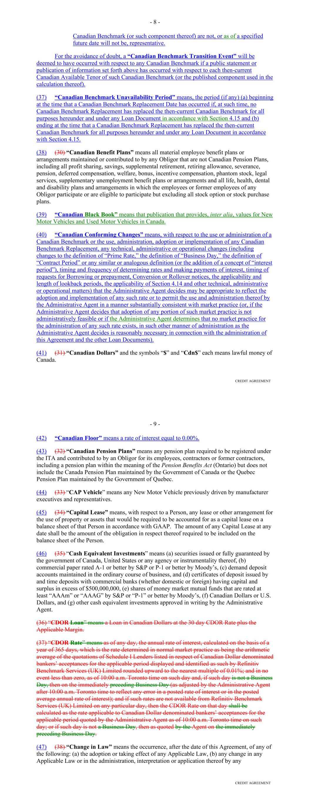 Other Connection Taxes, (ii) in the case of a Lender, U.S. federal withholding Taxes imposed on amounts payable to or for the account of such Lender with respect to an applicable interest in a Loan or Commitment pursuant to a law in effect on the date on which (a) such Lender acquires such interest in the Loan or Commitment or (b) such Lender changes its lending office, except in each case to the extent that, pursuant to Section 2.11, amounts with respect to such Taxes were payable either to such Lender's assignor immediately before such Lender became a party hereto or to such Lender immediately before it changed its lending office, (iii) Taxes attributable to such Recipient's failure to comply with Section 2.11(g) and (iv) any withholding Taxes imposed under FATCA. "Facility Amount" means, as of any date of determination, (i) prior to the Termination Date, the Aggregate Commitment on such day and (ii) on and after the Termination Date, the Loans Outstanding. "Facility Termination Date" means the date following the Termination Date on which the Aggregate Unpaids have been indefeasibly paid in full. "FATCA" means Sections 1471 through 1474 of the Code, as of the date of this Agreement (or any amended or successor version that is substantively comparable and not materially more onerous to comply with), any current or future regulations or official interpretations thereof and any applicable agreement entered into pursuant to Section 1471(b)(1) of the Code, any applicable intergovernmental agreement with respect to the foregoing, and any regulations and official administrative guidance thereunder. "Federal Funds Effective Rate" means, for any day, the rate calculated by the NYFRB based on such day’s federal funds transactions by depositary institutions, as determined in such manner as shall be set forth on the NYFRB’s Website from time to time, and published on the next succeeding Business Day by the NYFRB as the effective federal funds rate; provided that if the Federal Funds Effective Rate as so determined would be less than 0%, such rate shall be deemed to be 0% for the purposes of this Agreement. "Federal Reserve Board" means the Board of Governors of the Federal Reserve System. "Fee Letter" means the "Fourth Amended and Restated Fee Letter", dated as of the July 20, 2023, among the Borrower, the initial Servicer, the Administrative Agent and the Agents, setting forth, among other things, the Upfront Fee, the Supplemental Upfront Fee Rate, the Applicable Margin, the Credit Adjustment, and the Unused Commitment Fee Rate. "FICO Score" means with respect to any Receivable, the decisioned credit risk score that is generated by Equifax (or, if such credit risk score is unavailable through Equifax, the decisioned credit risk score that is generated by TransUnion or another equivalent consumer credit reporting agency) using their version 8 scorecard for use in the automotive lending sector, at the time of underwriting for the related Contract, which credit risk score is generated using statistical models established by Fair Isaac Corporation (or any successor entity thereto) for either (i) the related obligor or (ii) if greater, the related co-obligor under the related receivable. 22 "Financed Vehicle" means, with respect to a Receivable, any new or used automobile, light-duty truck, minivan, sport utility vehicle or other passenger vehicle, together with all accessions thereto, securing the related Obligor's Indebtedness thereunder. "Financial Covenants (Lithia)" means: (a) at all times prior to the date on which each Agent is party to the Lithia Loan Agreement as a Lender, each of the covenants listed on Schedule F to this Agreement; (b) at all times that each Agent is party to the Lithia Loan Agreement as a “Lender,” each of (i) the “Financial Covenant – Fixed Charge Coverage Ratio” set forth at Section 11.1.2 of the Lithia Loan Agreement and (ii) the “Financial Covenant – Leverage Ratio” set forth at Section 11.1.3 of the Lithia Loan Agreement, in each case giving effect to any amendments or other modifications that are at any time made to such sections, or the defined terms used in such sections, or any other provisions of the Lithia Loan Agreement that affect the calculations set forth in such sections, so long as any such amendments or other modifications are made in accordance with the terms of the Lithia Loan Agreement; or (c) at all times from and after the date on which any Agent ceases for any reason to be party to the Lithia Loan Agreement as a “Lender,” each of (i) the “Financial Covenant – Fixed Charge Coverage Ratio” set forth at Section 11.1.2 of the Lithia Loan Agreement and (ii) the “Financial Covenant – Leverage Ratio” set forth at Section 11.1.3 of the Lithia Loan Agreement, as in effect on such date, without giving effect to any amendments or other modifications that are at any time made to such sections, or the defined terms used in such sections, or any other provisions of the Lithia Loan Agreement that affect the calculations set forth in such sections after such date, unless such amendments or other modifications have been consented to in writing by the Administrative Agent and the Required Lenders. "Financial Covenants (DFC)" means each of: (i) DFC's Tangible Net Worth for the most recently ended fiscal quarter shall at least equal (a) on or prior to June 29, 2023, $300,000,000, (b) from and including June 30, 2023 and through and including December 30, 2023, $330,000,000, (c) from and including December 31, 2023 and through and including June 29, 2024, $375,000,000, and (d) from and including June 30, 2024 and on all dates thereafter, $525,000,000; and (ii) DFC's Debt-to-Equity Ratio for the most recently ended fiscal quarter shall not exceed 7.50 to 1.0. "Floor" means the benchmark rate floor, if any, provided in this Agreement initially (as of the execution of this Agreement, the modification, amendment or renewal of this Agreeme