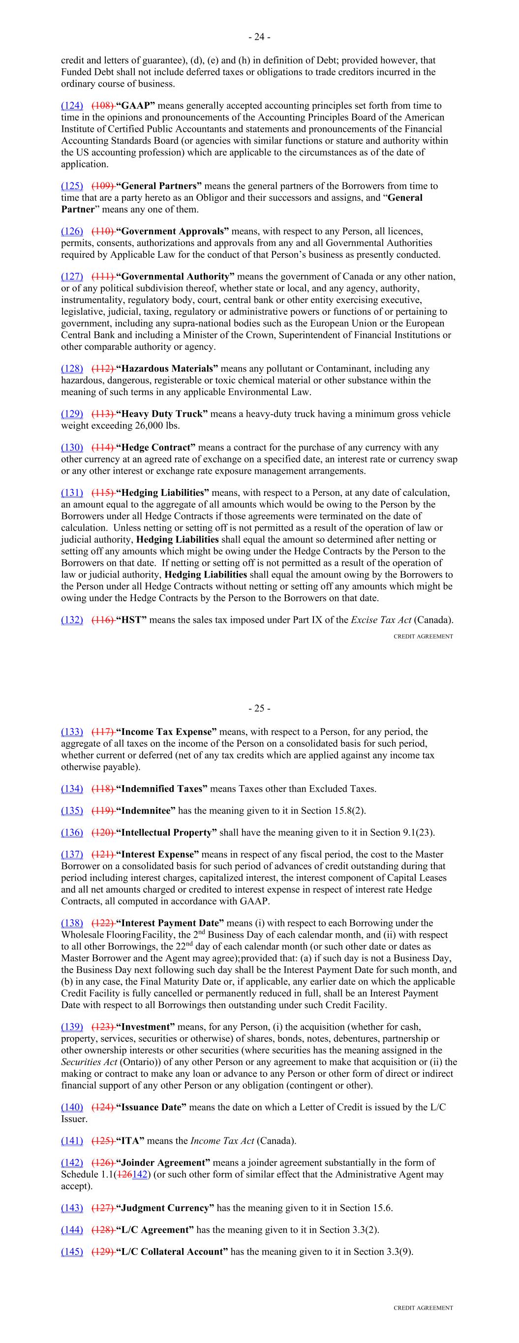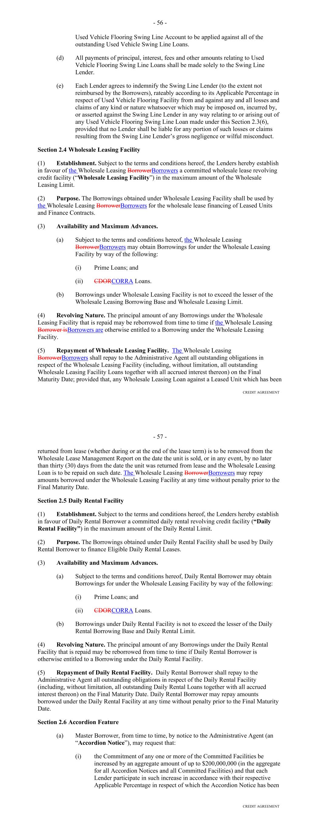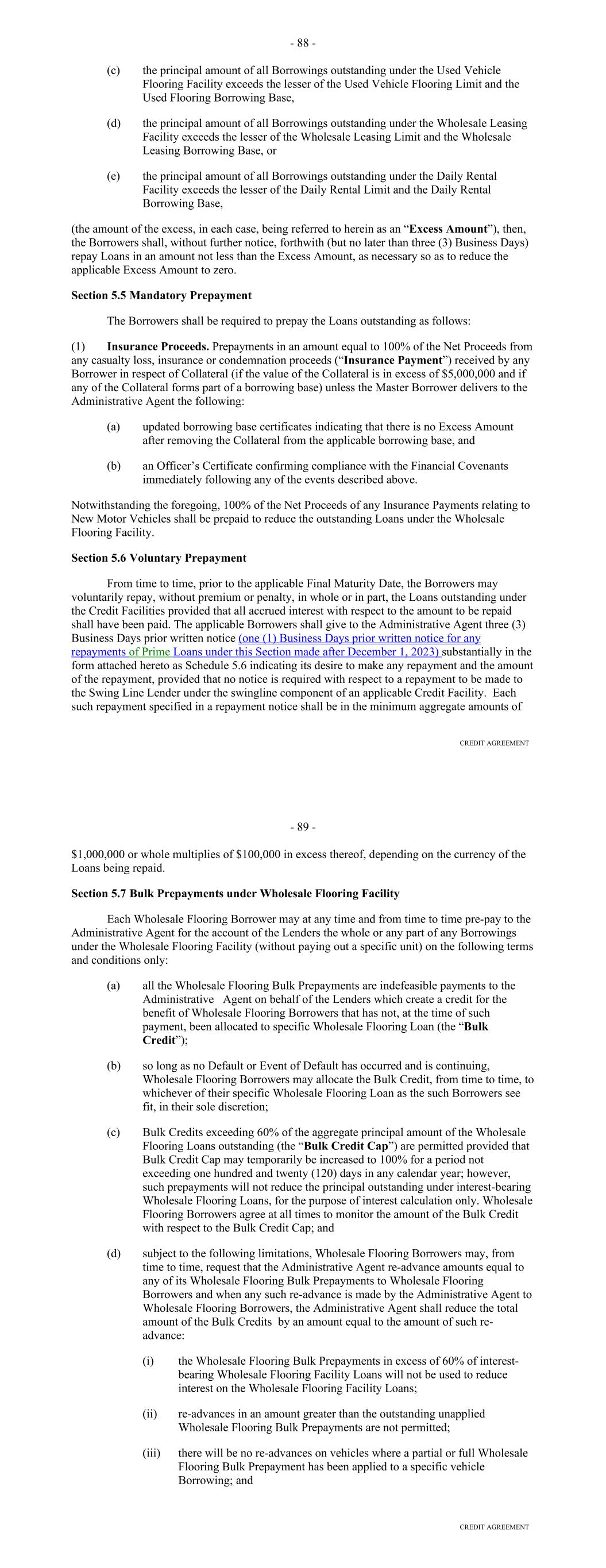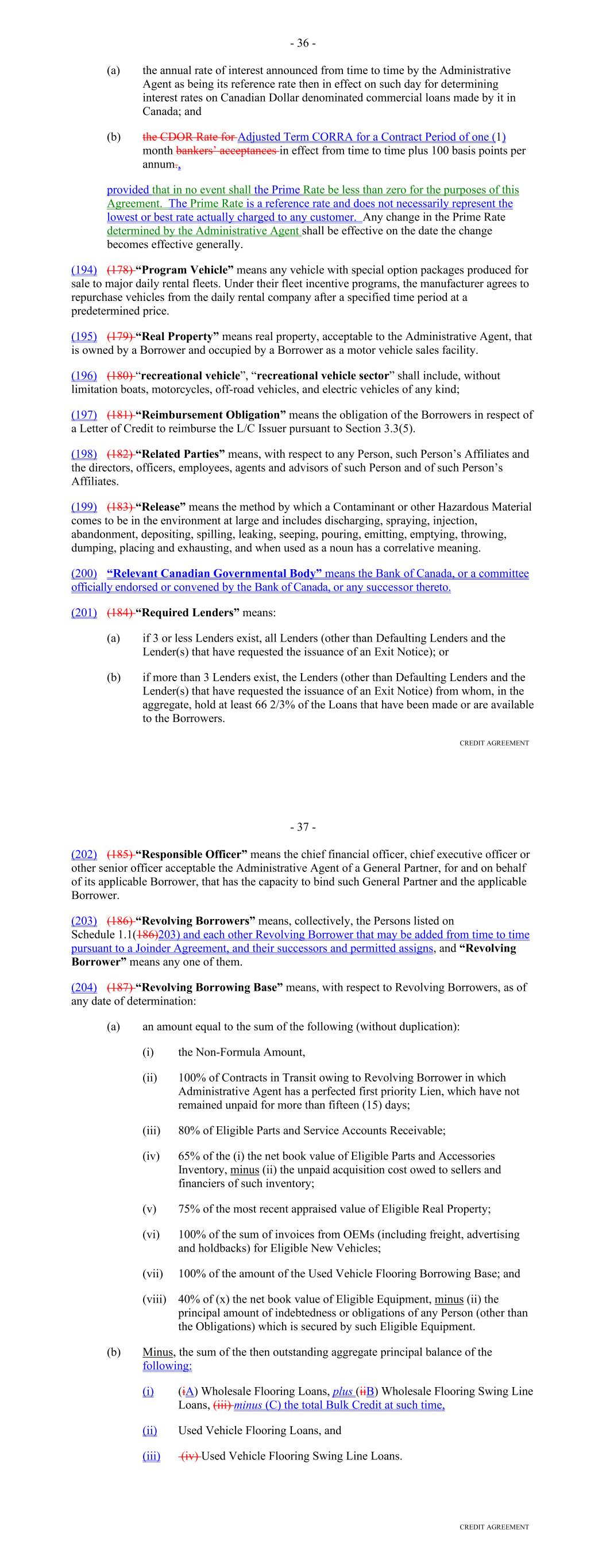 Other Connection Taxes, (ii) in the case of a Lender, U.S. federal withholding Taxes imposed on amounts payable to or for the account of such Lender with respect to an applicable interest in a Loan or Commitment pursuant to a law in effect on the date on which (a) such Lender acquires such interest in the Loan or Commitment or (b) such Lender changes its lending office, except in each case to the extent that, pursuant to Section 2.11, amounts with respect to such Taxes were payable either to such Lender's assignor immediately before such Lender became a party hereto or to such Lender immediately before it changed its lending office, (iii) Taxes attributable to such Recipient's failure to comply with Section 2.11(g) and (iv) any withholding Taxes imposed under FATCA. "Facility Amount" means, as of any date of determination, (i) prior to the Termination Date, the Aggregate Commitment on such day and (ii) on and after the Termination Date, the Loans Outstanding. "Facility Termination Date" means the date following the Termination Date on which the Aggregate Unpaids have been indefeasibly paid in full. "FATCA" means Sections 1471 through 1474 of the Code, as of the date of this Agreement (or any amended or successor version that is substantively comparable and not materially more onerous to comply with), any current or future regulations or official interpretations thereof and any applicable agreement entered into pursuant to Section 1471(b)(1) of the Code, any applicable intergovernmental agreement with respect to the foregoing, and any regulations and official administrative guidance thereunder. "Federal Funds Effective Rate" means, for any day, the rate calculated by the NYFRB based on such day’s federal funds transactions by depositary institutions, as determined in such manner as shall be set forth on the NYFRB’s Website from time to time, and published on the next succeeding Business Day by the NYFRB as the effective federal funds rate; provided that if the Federal Funds Effective Rate as so determined would be less than 0%, such rate shall be deemed to be 0% for the purposes of this Agreement. "Federal Reserve Board" means the Board of Governors of the Federal Reserve System. "Fee Letter" means the "Fourth Amended and Restated Fee Letter", dated as of the July 20, 2023, among the Borrower, the initial Servicer, the Administrative Agent and the Agents, setting forth, among other things, the Upfront Fee, the Supplemental Upfront Fee Rate, the Applicable Margin, the Credit Adjustment, and the Unused Commitment Fee Rate. "FICO Score" means with respect to any Receivable, the decisioned credit risk score that is generated by Equifax (or, if such credit risk score is unavailable through Equifax, the decisioned credit risk score that is generated by TransUnion or another equivalent consumer credit reporting agency) using their version 8 scorecard for use in the automotive lending sector, at the time of underwriting for the related Contract, which credit risk score is generated using statistical models established by Fair Isaac Corporation (or any successor entity thereto) for either (i) the related obligor or (ii) if greater, the related co-obligor under the related receivable. 22 "Financed Vehicle" means, with respect to a Receivable, any new or used automobile, light-duty truck, minivan, sport utility vehicle or other passenger vehicle, together with all accessions thereto, securing the related Obligor's Indebtedness thereunder. "Financial Covenants (Lithia)" means: (a) at all times prior to the date on which each Agent is party to the Lithia Loan Agreement as a Lender, each of the covenants listed on Schedule F to this Agreement; (b) at all times that each Agent is party to the Lithia Loan Agreement as a “Lender,” each of (i) the “Financial Covenant – Fixed Charge Coverage Ratio” set forth at Section 11.1.2 of the Lithia Loan Agreement and (ii) the “Financial Covenant – Leverage Ratio” set forth at Section 11.1.3 of the Lithia Loan Agreement, in each case giving effect to any amendments or other modifications that are at any time made to such sections, or the defined terms used in such sections, or any other provisions of the Lithia Loan Agreement that affect the calculations set forth in such sections, so long as any such amendments or other modifications are made in accordance with the terms of the Lithia Loan Agreement; or (c) at all times from and after the date on which any Agent ceases for any reason to be party to the Lithia Loan Agreement as a “Lender,” each of (i) the “Financial Covenant – Fixed Charge Coverage Ratio” set forth at Section 11.1.2 of the Lithia Loan Agreement and (ii) the “Financial Covenant – Leverage Ratio” set forth at Section 11.1.3 of the Lithia Loan Agreement, as in effect on such date, without giving effect to any amendments or other modifications that are at any time made to such sections, or the defined terms used in such sections, or any other provisions of the Lithia Loan Agreement that affect the calculations set forth in such sections after such date, unless such amendments or other modifications have been consented to in writing by the Administrative Agent and the Required Lenders. "Financial Covenants (DFC)" means each of: (i) DFC's Tangible Net Worth for the most recently ended fiscal quarter shall at least equal (a) on or prior to June 29, 2023, $300,000,000, (b) from and including June 30, 2023 and through and including December 30, 2023, $330,000,000, (c) from and including December 31, 2023 and through and including June 29, 2024, $375,000,000, and (d) from and including June 30, 2024 and on all dates thereafter, $525,000,000; and (ii) DFC's Debt-to-Equity Ratio for the most recently ended fiscal quarter shall not exceed 7.50 to 1.0. "Floor" means the benchmark rate floor, if any, provided in this Agreement initially (as of the execution of this Agreement, the modification, amendment or renewal of this Agreeme