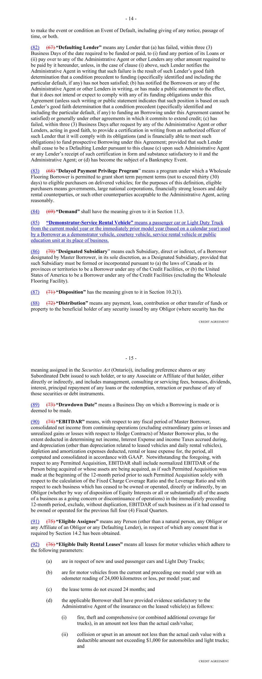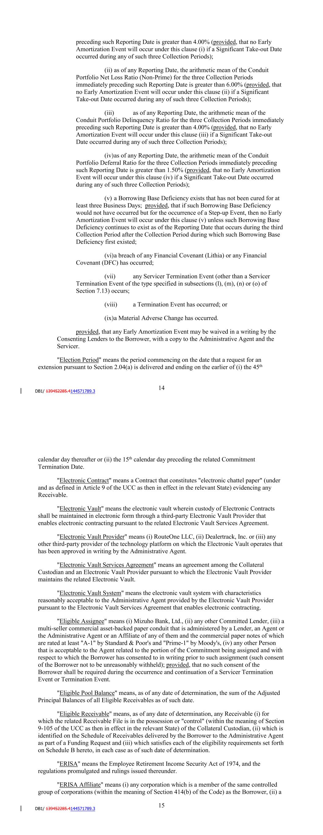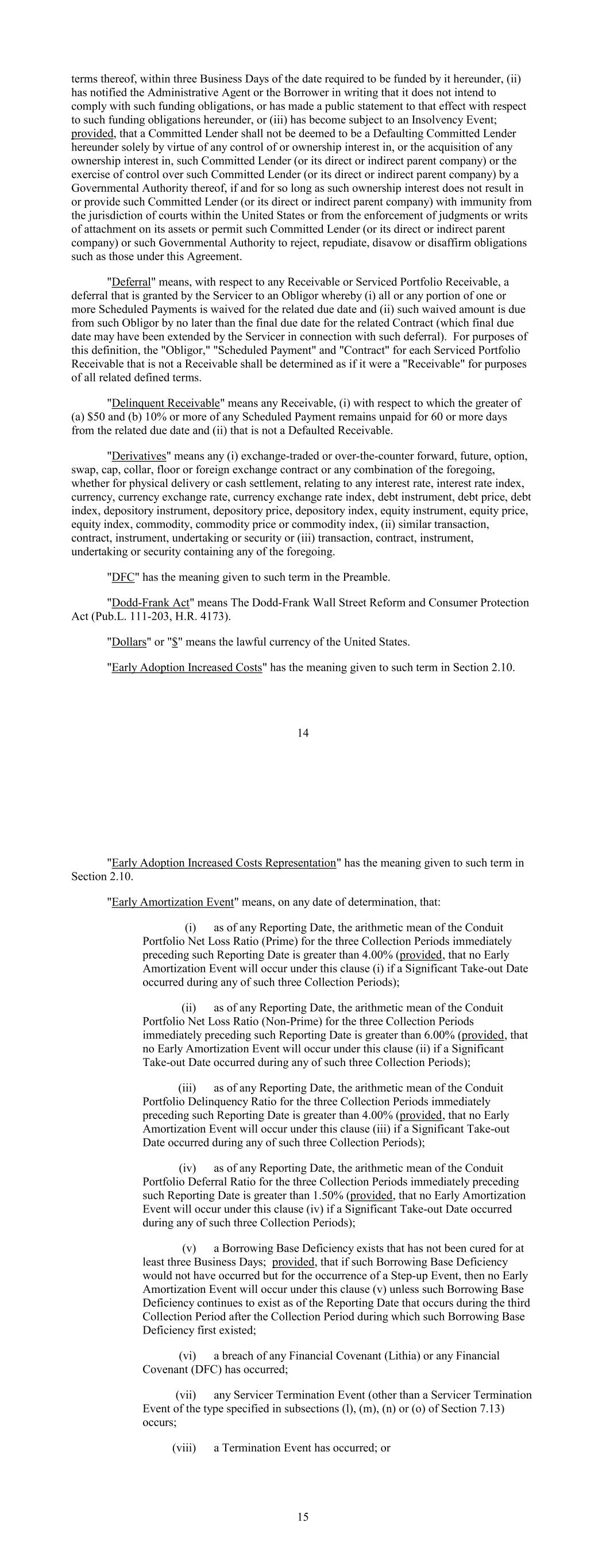 terms thereof, within three Business Days of the date required to be funded by it hereunder, (ii) has notified the Administrative Agent or the Borrower in writing that it does not intend to comply with such funding obligations, or has made a public statement to that effect with respect to such funding obligations hereunder, or (iii) has become subject to an Insolvency Event; provided, that a Committed Lender shall not be deemed to be a Defaulting Committed Lender hereunder solely by virtue of any control of or ownership interest in, or the acquisition of any ownership interest in, such Committed Lender (or its direct or indirect parent company) or the exercise of control over such Committed Lender (or its direct or indirect parent company) by a Governmental Authority thereof, if and for so long as such ownership interest does not result in or provide such Committed Lender (or its direct or indirect parent company) with immunity from the jurisdiction of courts within the United States or from the enforcement of judgments or writs of attachment on its assets or permit such Committed Lender (or its direct or indirect parent company) or such Governmental Authority to reject, repudiate, disavow or disaffirm obligations such as those under this Agreement. "Deferral" means, with respect to any Receivable or Serviced Portfolio Receivable, a deferral that is granted by the Servicer to an Obligor whereby (i) all or any portion of one or more Scheduled Payments is waived for the related due date and (ii) such waived amount is due from such Obligor by no later than the final due date for the related Contract (which final due date may have been extended by the Servicer in connection with such deferral). For purposes of this definition, the "Obligor," "Scheduled Payment" and "Contract" for each Serviced Portfolio Receivable that is not a Receivable shall be determined as if it were a "Receivable" for purposes of all related defined terms. "Delinquent Receivable" means any Receivable, (i) with respect to which the greater of (a) $50 and (b) 10% or more of any Scheduled Payment remains unpaid for 60 or more days from the related due date and (ii) that is not a Defaulted Receivable. "Derivatives" means any (i) exchange-traded or over-the-counter forward, future, option, swap, cap, collar, floor or foreign exchange contract or any combination of the foregoing, whether for physical delivery or cash settlement, relating to any interest rate, interest rate index, currency, currency exchange rate, currency exchange rate index, debt instrument, debt price, debt index, depository instrument, depository price, depository index, equity instrument, equity price, equity index, commodity, commodity price or commodity index, (ii) similar transaction, contract, instrument, undertaking or security or (iii) transaction, contract, instrument, undertaking or security containing any of the foregoing. "DFC" has the meaning given to such term in the Preamble. "Dodd-Frank Act" means The Dodd-Frank Wall Street Reform and Consumer Protection Act (Pub.L. 111-203, H.R. 4173). "Dollars" or "$" means the lawful currency of the United States. "Early Adoption Increased Costs" has the meaning given to such term in Section 2.10. 14 "Early Adoption Increased Costs Representation" has the meaning given to such term in Section 2.10. "Early Amortization Event" means, on any date of determination, that: (i) as of any Reporting Date, the arithmetic mean of the Conduit Portfolio Net Loss Ratio (Prime) for the three Collection Periods immediately preceding such Reporting Date is greater than 4.00% (provided, that no Early Amortization Event will occur under this clause (i) if a Significant Take-out Date occurred during any of such three Collection Periods); (ii) as of any Reporting Date, the arithmetic mean of the Conduit Portfolio Net Loss Ratio (Non-Prime) for the three Collection Periods immediately preceding such Reporting Date is greater than 6.00% (provided, that no Early Amortization Event will occur under this clause (ii) if a Significant Take-out Date occurred during any of such three Collection Periods); (iii) as of any Reporting Date, the arithmetic mean of the Conduit Portfolio Delinquency Ratio for the three Collection Periods immediately preceding such Reporting Date is greater than 4.00% (provided, that no Early Amortization Event will occur under this clause (iii) if a Significant Take-out Date occurred during any of such three Collection Periods); (iv) as of any Reporting Date, the arithmetic mean of the Conduit Portfolio Deferral Ratio for the three Collection Periods immediately preceding such Reporting Date is greater than 1.50% (provided, that no Early Amortization Event will occur under this clause (iv) if a Significant Take-out Date occurred during any of such three Collection Periods); (v) a Borrowing Base Deficiency exists that has not been cured for at least three Business Days; provided, that if such Borrowing Base Deficiency would not have occurred but for the occurrence of a Step-up Event, then no Early Amortization Event will occur under this clause (v) unless such Borrowing Base Deficiency continues to exist as of the Reporting Date that occurs during the third Collection Period after the Collection Period during which such Borrowing Base Deficiency first existed; (vi) a breach of any Financial Covenant (Lithia) or any Financial Covenant (DFC) has occurred; (vii) any Servicer Termination Event (other than a Servicer Termination Event of the type specified in subsections (l), (m), (n) or (o) of Section 7.13) occurs; (viii) a Termination Event has occurred; or 15