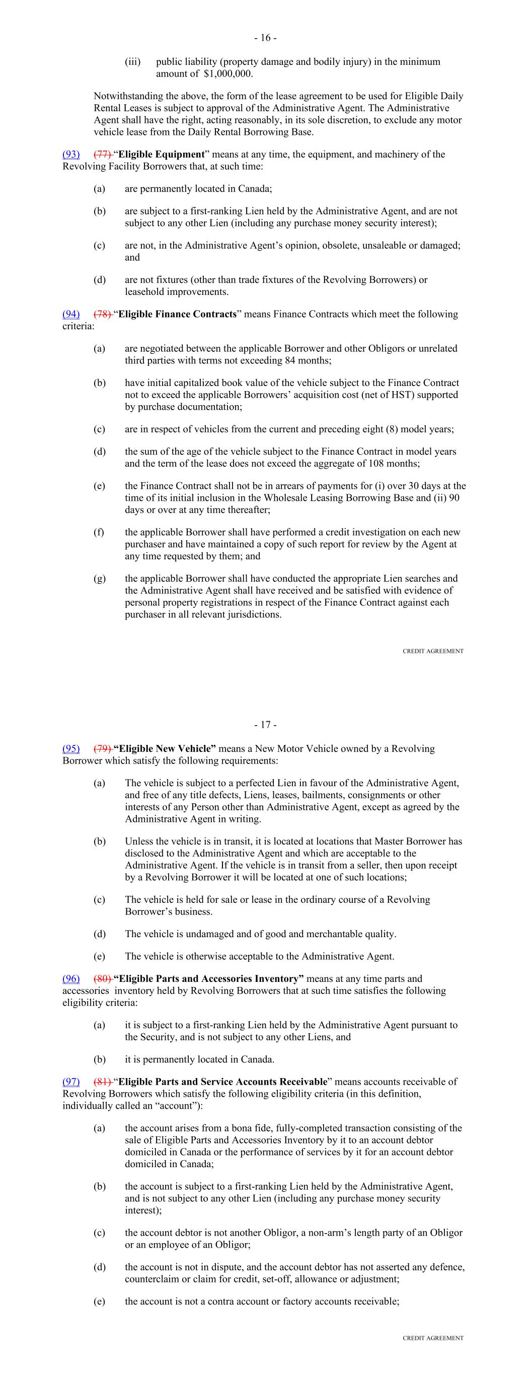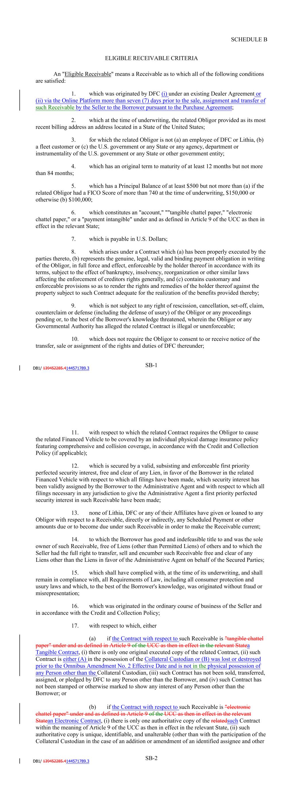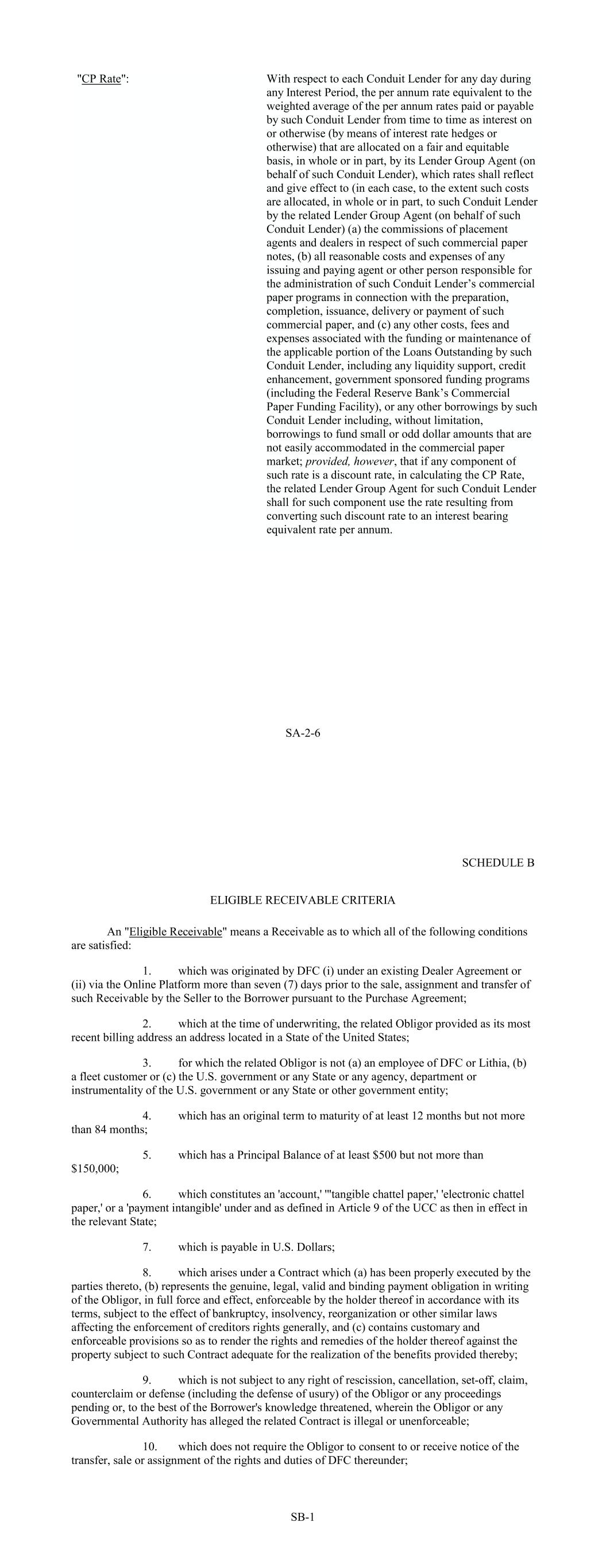 SA-2-6 "CP Rate": With respect to each Conduit Lender for any day during any Interest Period, the per annum rate equivalent to the weighted average of the per annum rates paid or payable by such Conduit Lender from time to time as interest on or otherwise (by means of interest rate hedges or otherwise) that are allocated on a fair and equitable basis, in whole or in part, by its Lender Group Agent (on behalf of such Conduit Lender), which rates shall reflect and give effect to (in each case, to the extent such costs are allocated, in whole or in part, to such Conduit Lender by the related Lender Group Agent (on behalf of such Conduit Lender) (a) the commissions of placement agents and dealers in respect of such commercial paper notes, (b) all reasonable costs and expenses of any issuing and paying agent or other person responsible for the administration of such Conduit Lender’s commercial paper programs in connection with the preparation, completion, issuance, delivery or payment of such commercial paper, and (c) any other costs, fees and expenses associated with the funding or maintenance of the applicable portion of the Loans Outstanding by such Conduit Lender, including any liquidity support, credit enhancement, government sponsored funding programs (including the Federal Reserve Bank’s Commercial Paper Funding Facility), or any other borrowings by such Conduit Lender including, without limitation, borrowings to fund small or odd dollar amounts that are not easily accommodated in the commercial paper market; provided, however, that if any component of such rate is a discount rate, in calculating the CP Rate, the related Lender Group Agent for such Conduit Lender shall for such component use the rate resulting from converting such discount rate to an interest bearing equivalent rate per annum. SCHEDULE B ELIGIBLE RECEIVABLE CRITERIA An "Eligible Receivable" means a Receivable as to which all of the following conditions are satisfied: 1. which was originated by DFC (i) under an existing Dealer Agreement or (ii) via the Online Platform more than seven (7) days prior to the sale, assignment and transfer of such Receivable by the Seller to the Borrower pursuant to the Purchase Agreement; 2. which at the time of underwriting, the related Obligor provided as its most recent billing address an address located in a State of the United States; 3. for which the related Obligor is not (a) an employee of DFC or Lithia, (b) a fleet customer or (c) the U.S. government or any State or any agency, department or instrumentality of the U.S. government or any State or other government entity; 4. which has an original term to maturity of at least 12 months but not more than 84 months; 5. which has a Principal Balance of at least $500 but not more than $150,000; 6. which constitutes an 'account,' '"tangible chattel paper,' 'electronic chattel paper,' or a 'payment intangible' under and as defined in Article 9 of the UCC as then in effect in the relevant State; 7. which is payable in U.S. Dollars; 8. which arises under a Contract which (a) has been properly executed by the parties thereto, (b) represents the genuine, legal, valid and binding payment obligation in writing of the Obligor, in full force and effect, enforceable by the holder thereof in accordance with its terms, subject to the effect of bankruptcy, insolvency, reorganization or other similar laws affecting the enforcement of creditors rights generally, and (c) contains customary and enforceable provisions so as to render the rights and remedies of the holder thereof against the property subject to such Contract adequate for the realization of the benefits provided thereby; 9. which is not subject to any right of rescission, cancellation, set-off, claim, counterclaim or defense (including the defense of usury) of the Obligor or any proceedings pending or, to the best of the Borrower's knowledge threatened, wherein the Obligor or any Governmental Authority has alleged the related Contract is illegal or unenforceable; 10. which does not require the Obligor to consent to or receive notice of the transfer, sale or assignment of the rights and duties of DFC thereunder; SB-1