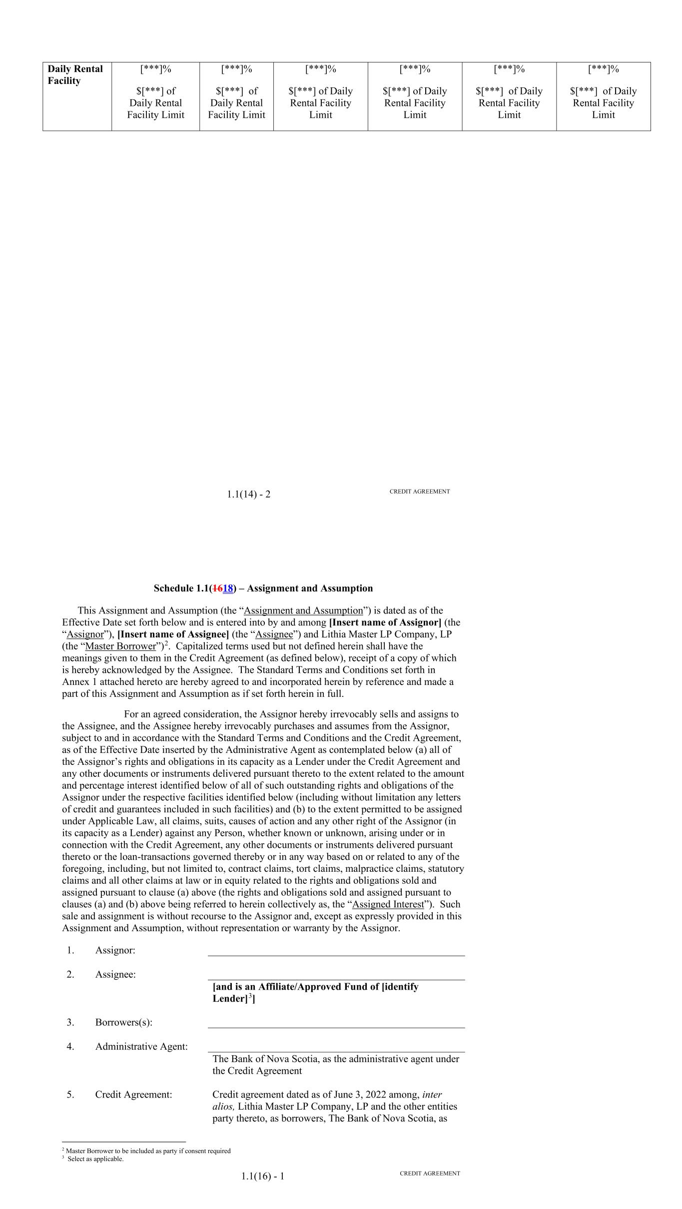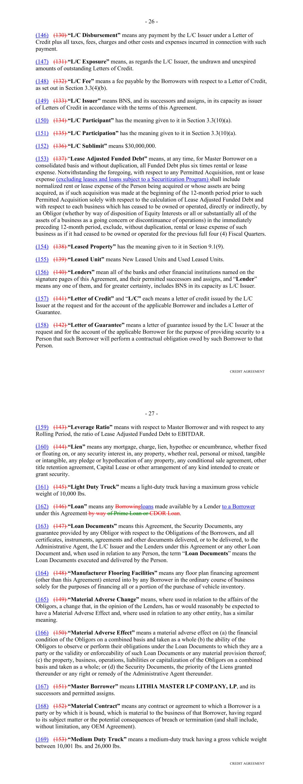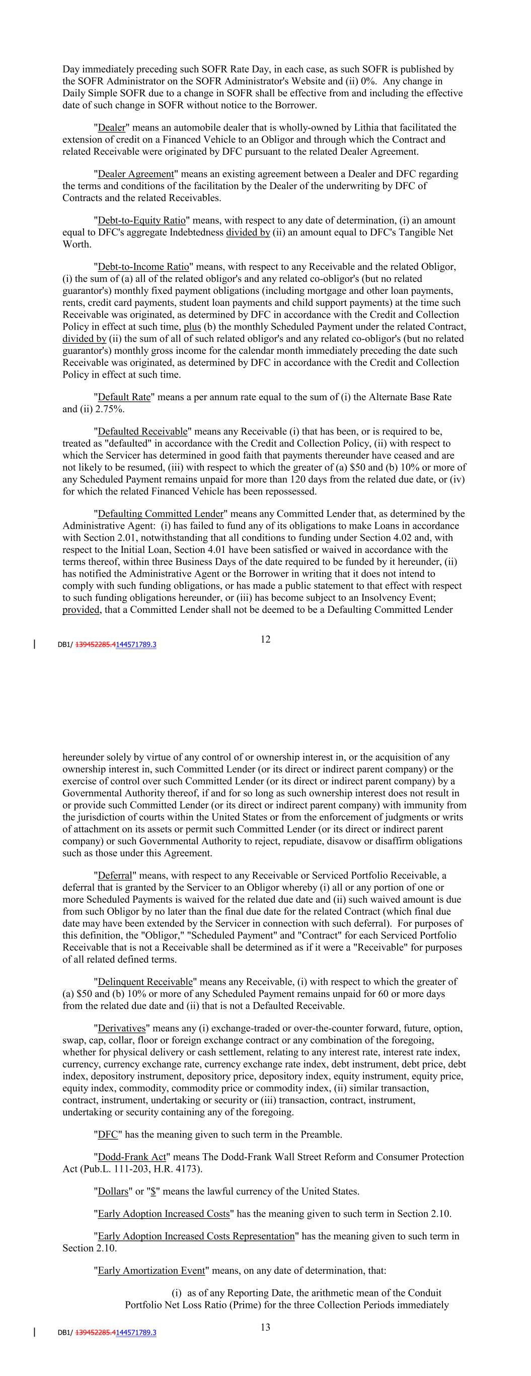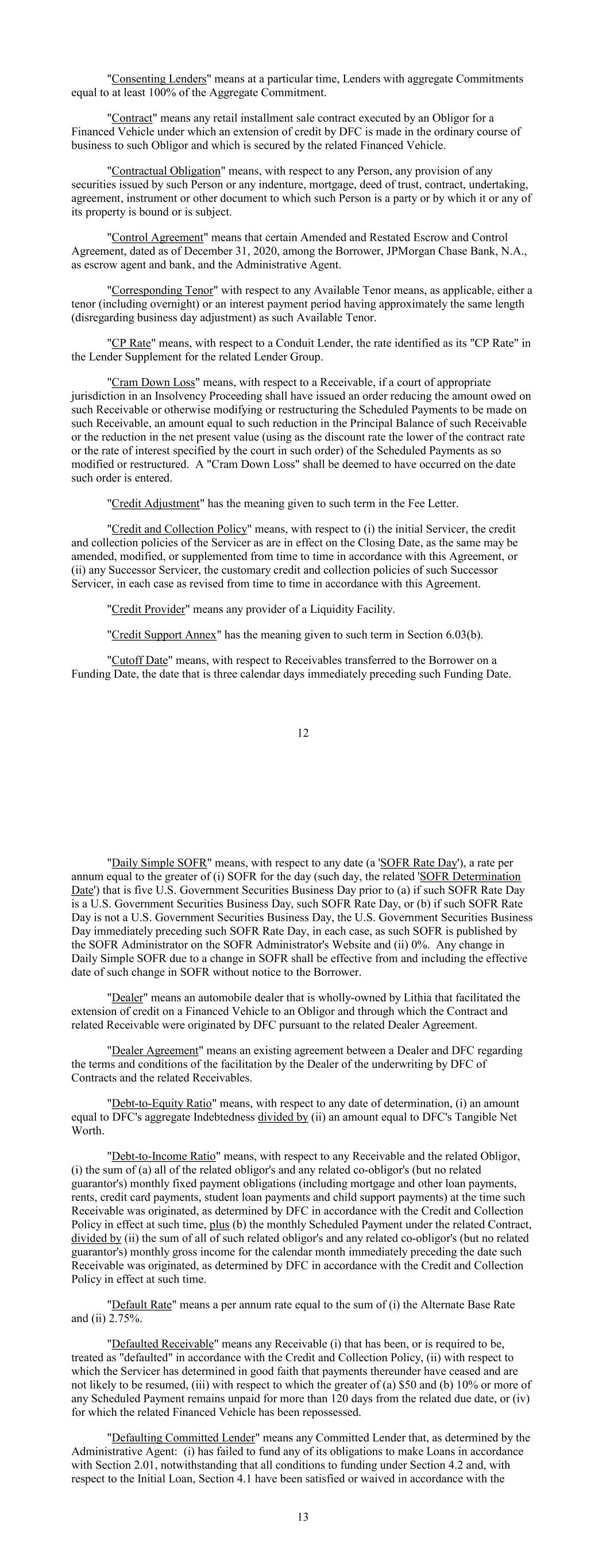 "Consenting Lenders" means at a particular time, Lenders with aggregate Commitments equal to at least 100% of the Aggregate Commitment. "Contract" means any retail installment sale contract executed by an Obligor for a Financed Vehicle under which an extension of credit by DFC is made in the ordinary course of business to such Obligor and which is secured by the related Financed Vehicle. "Contractual Obligation" means, with respect to any Person, any provision of any securities issued by such Person or any indenture, mortgage, deed of trust, contract, undertaking, agreement, instrument or other document to which such Person is a party or by which it or any of its property is bound or is subject. "Control Agreement" means that certain Amended and Restated Escrow and Control Agreement, dated as of December 31, 2020, among the Borrower, JPMorgan Chase Bank, N.A., as escrow agent and bank, and the Administrative Agent. "Corresponding Tenor" with respect to any Available Tenor means, as applicable, either a tenor (including overnight) or an interest payment period having approximately the same length (disregarding business day adjustment) as such Available Tenor. "CP Rate" means, with respect to a Conduit Lender, the rate identified as its "CP Rate" in the Lender Supplement for the related Lender Group. "Cram Down Loss" means, with respect to a Receivable, if a court of appropriate jurisdiction in an Insolvency Proceeding shall have issued an order reducing the amount owed on such Receivable or otherwise modifying or restructuring the Scheduled Payments to be made on such Receivable, an amount equal to such reduction in the Principal Balance of such Receivable or the reduction in the net present value (using as the discount rate the lower of the contract rate or the rate of interest specified by the court in such order) of the Scheduled Payments as so modified or restructured. A "Cram Down Loss" shall be deemed to have occurred on the date such order is entered. "Credit Adjustment" has the meaning given to such term in the Fee Letter. "Credit and Collection Policy" means, with respect to (i) the initial Servicer, the credit and collection policies of the Servicer as are in effect on the Closing Date, as the same may be amended, modified, or supplemented from time to time in accordance with this Agreement, or (ii) any Successor Servicer, the customary credit and collection policies of such Successor Servicer, in each case as revised from time to time in accordance with this Agreement. "Credit Provider" means any provider of a Liquidity Facility. "Credit Support Annex" has the meaning given to such term in Section 6.03(b). "Cutoff Date" means, with respect to Receivables transferred to the Borrower on a Funding Date, the date that is three calendar days immediately preceding such Funding Date. 12 "Daily Simple SOFR" means, with respect to any date (a 'SOFR Rate Day'), a rate per annum equal to the greater of (i) SOFR for the day (such day, the related 'SOFR Determination Date') that is five U.S. Government Securities Business Day prior to (a) if such SOFR Rate Day is a U.S. Government Securities Business Day, such SOFR Rate Day, or (b) if such SOFR Rate Day is not a U.S. Government Securities Business Day, the U.S. Government Securities Business Day immediately preceding such SOFR Rate Day, in each case, as such SOFR is published by the SOFR Administrator on the SOFR Administrator's Website and (ii) 0%. Any change in Daily Simple SOFR due to a change in SOFR shall be effective from and including the effective date of such change in SOFR without notice to the Borrower. "Dealer" means an automobile dealer that is wholly-owned by Lithia that facilitated the extension of credit on a Financed Vehicle to an Obligor and through which the Contract and related Receivable were originated by DFC pursuant to the related Dealer Agreement. "Dealer Agreement" means an existing agreement between a Dealer and DFC regarding the terms and conditions of the facilitation by the Dealer of the underwriting by DFC of Contracts and the related Receivables. "Debt-to-Equity Ratio" means, with respect to any date of determination, (i) an amount equal to DFC's aggregate Indebtedness divided by (ii) an amount equal to DFC's Tangible Net Worth. "Debt-to-Income Ratio" means, with respect to any Receivable and the related Obligor, (i) the sum of (a) all of the related obligor's and any related co-obligor's (but no related guarantor's) monthly fixed payment obligations (including mortgage and other loan payments, rents, credit card payments, student loan payments and child support payments) at the time such Receivable was originated, as determined by DFC in accordance with the Credit and Collection Policy in effect at such time, plus (b) the monthly Scheduled Payment under the related Contract, divided by (ii) the sum of all of such related obligor's and any related co-obligor's (but no related guarantor's) monthly gross income for the calendar month immediately preceding the date such Receivable was originated, as determined by DFC in accordance with the Credit and Collection Policy in effect at such time. "Default Rate" means a per annum rate equal to the sum of (i) the Alternate Base Rate and (ii) 2.75%. "Defaulted Receivable" means any Receivable (i) that has been, or is required to be, treated as "defaulted" in accordance with the Credit and Collection Policy, (ii) with respect to which the Servicer has determined in good faith that payments thereunder have ceased and are not likely to be resumed, (iii) with respect to which the greater of (a) $50 and (b) 10% or more of any Scheduled Payment remains unpaid for more than 120 days from the related due date, or (iv) for which the related Financed Vehicle has been repossessed. "Defaulting Committed Lender" means any Committed Lender that, as determined by the Administrative Agent: (i) has failed to fund any of its obligations to make Loans in accordance with Section 2.01, notw