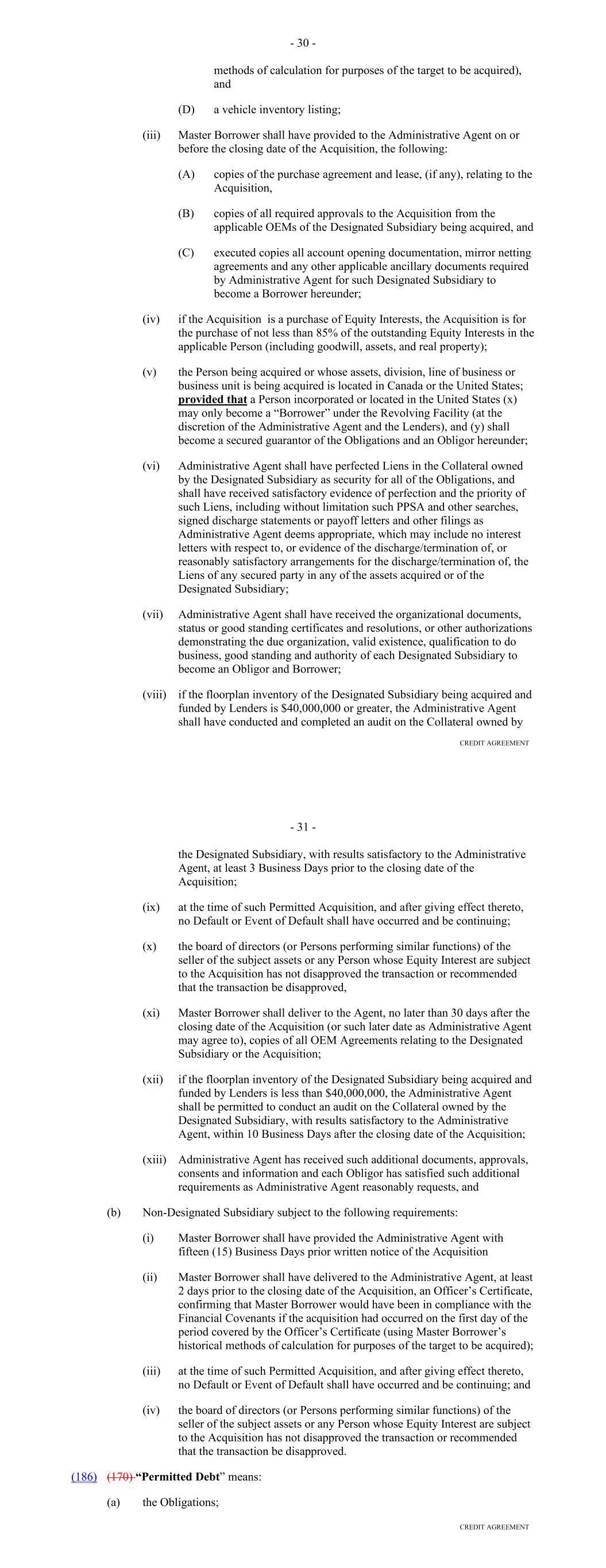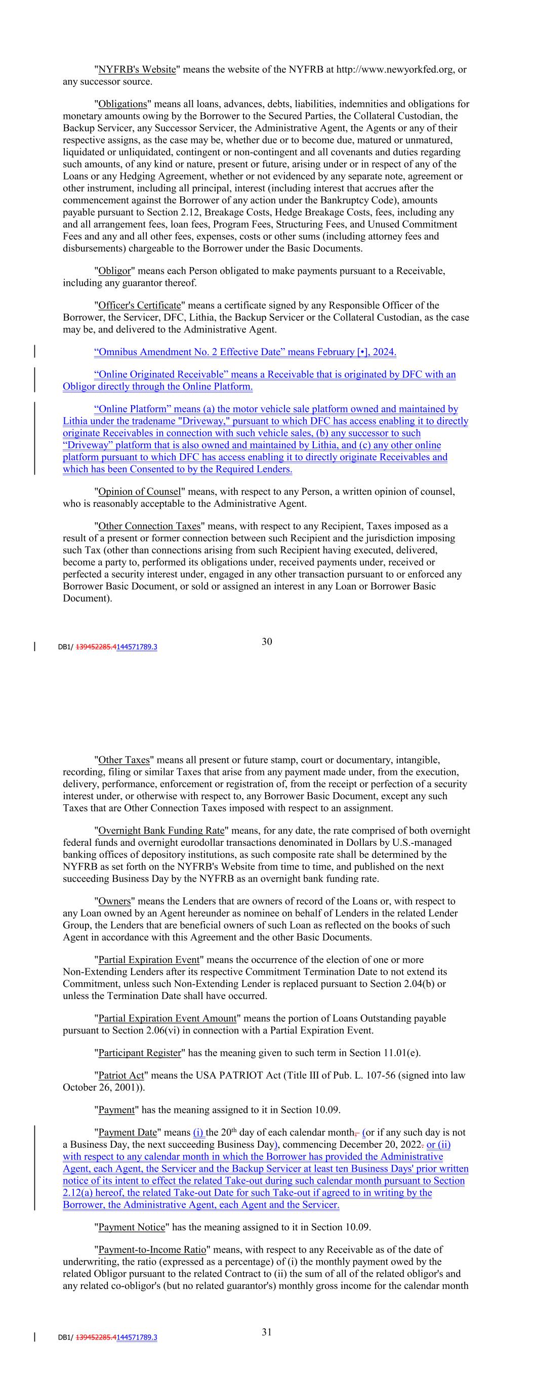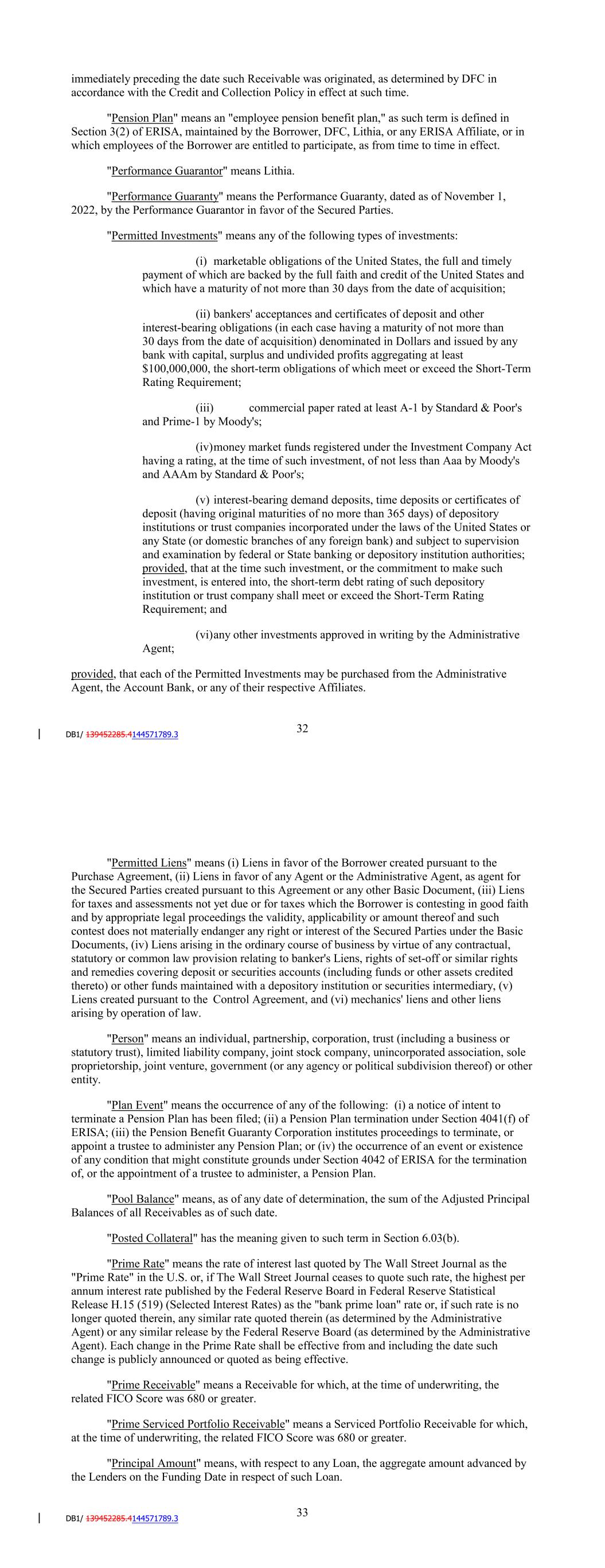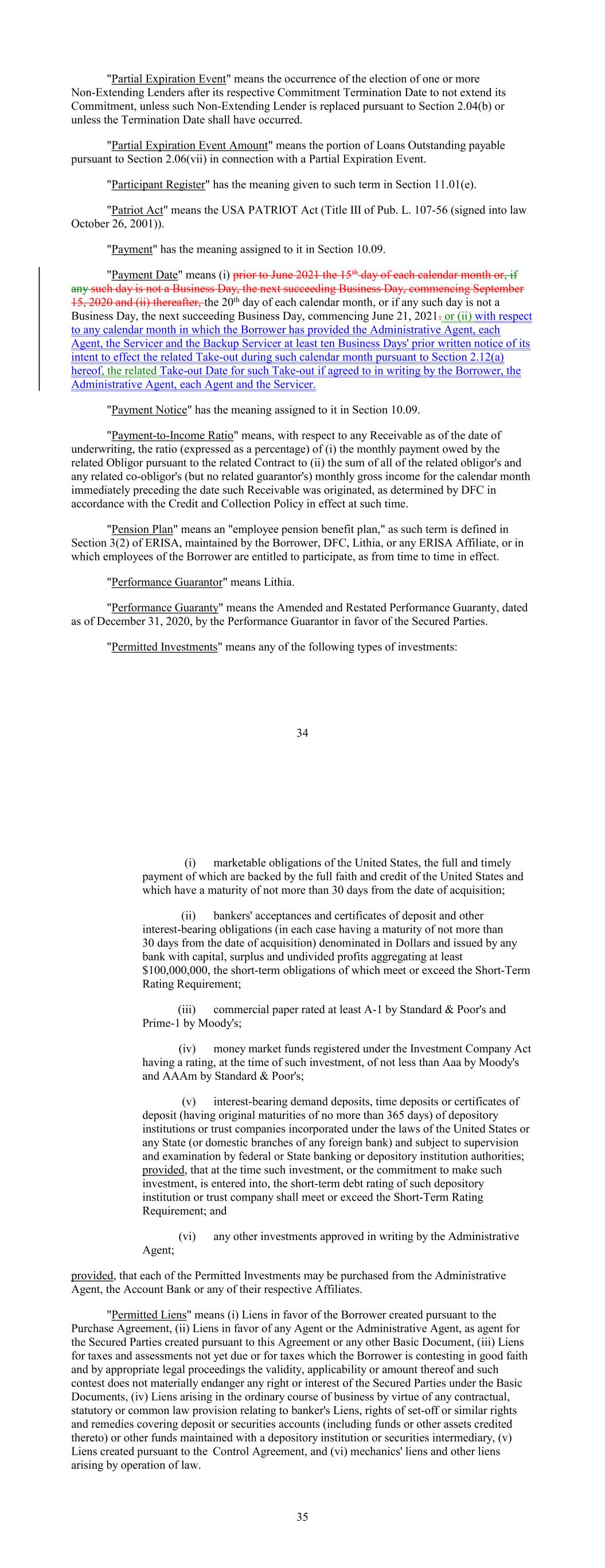 "Partial Expiration Event" means the occurrence of the election of one or more Non-Extending Lenders after its respective Commitment Termination Date to not extend its Commitment, unless such Non-Extending Lender is replaced pursuant to Section 2.04(b) or unless the Termination Date shall have occurred. "Partial Expiration Event Amount" means the portion of Loans Outstanding payable pursuant to Section 2.06(vii) in connection with a Partial Expiration Event. "Participant Register" has the meaning given to such term in Section 11.01(e). "Patriot Act" means the USA PATRIOT Act (Title III of Pub. L. 107-56 (signed into law October 26, 2001)). "Payment" has the meaning assigned to it in Section 10.09. "Payment Date" means (i) prior to June 2021 the 15th day of each calendar month or, if any such day is not a Business Day, the next succeeding Business Day, commencing September 15, 2020 and (ii) thereafter, the 20th day of each calendar month, or if any such day is not a Business Day, the next succeeding Business Day, commencing June 21, 2021. or (ii) with respect to any calendar month in which the Borrower has provided the Administrative Agent, each Agent, the Servicer and the Backup Servicer at least ten Business Days' prior written notice of its intent to effect the related Take-out during such calendar month pursuant to Section 2.12(a) hereof, the related Take-out Date for such Take-out if agreed to in writing by the Borrower, the Administrative Agent, each Agent and the Servicer. "Payment Notice" has the meaning assigned to it in Section 10.09. "Payment-to-Income Ratio" means, with respect to any Receivable as of the date of underwriting, the ratio (expressed as a percentage) of (i) the monthly payment owed by the related Obligor pursuant to the related Contract to (ii) the sum of all of the related obligor's and any related co-obligor's (but no related guarantor's) monthly gross income for the calendar month immediately preceding the date such Receivable was originated, as determined by DFC in accordance with the Credit and Collection Policy in effect at such time. "Pension Plan" means an "employee pension benefit plan," as such term is defined in Section 3(2) of ERISA, maintained by the Borrower, DFC, Lithia, or any ERISA Affiliate, or in which employees of the Borrower are entitled to participate, as from time to time in effect. "Performance Guarantor" means Lithia. "Performance Guaranty" means the Amended and Restated Performance Guaranty, dated as of December 31, 2020, by the Performance Guarantor in favor of the Secured Parties. "Permitted Investments" means any of the following types of investments: 34 (i) marketable obligations of the United States, the full and timely payment of which are backed by the full faith and credit of the United States and which have a maturity of not more than 30 days from the date of acquisition; (ii) bankers' acceptances and certificates of deposit and other interest-bearing obligations (in each case having a maturity of not more than 30 days from the date of acquisition) denominated in Dollars and issued by any bank with capital, surplus and undivided profits aggregating at least $100,000,000, the short-term obligations of which meet or exceed the Short-Term Rating Requirement; (iii) commercial paper rated at least A-1 by Standard & Poor's and Prime-1 by Moody's; (iv) money market funds registered under the Investment Company Act having a rating, at the time of such investment, of not less than Aaa by Moody's and AAAm by Standard & Poor's; (v) interest-bearing demand deposits, time deposits or certificates of deposit (having original maturities of no more than 365 days) of depository institutions or trust companies incorporated under the laws of the United States or any State (or domestic branches of any foreign bank) and subject to supervision and examination by federal or State banking or depository institution authorities; provided, that at the time such investment, or the commitment to make such investment, is entered into, the short-term debt rating of such depository institution or trust company shall meet or exceed the Short-Term Rating Requirement; and (vi) any other investments approved in writing by the Administrative Agent; provided, that each of the Permitted Investments may be purchased from the Administrative Agent, the Account Bank or any of their respective Affiliates. "Permitted Liens" means (i) Liens in favor of the Borrower created pursuant to the Purchase Agreement, (ii) Liens in favor of any Agent or the Administrative Agent, as agent for the Secured Parties created pursuant to this Agreement or any other Basic Document, (iii) Liens for taxes and assessments not yet due or for taxes which the Borrower is contesting in good faith and by appropriate legal proceedings the validity, applicability or amount thereof and such contest does not materially endanger any right or interest of the Secured Parties under the Basic Documents, (iv) Liens arising in the ordinary course of business by virtue of any contractual, statutory or common law provision relating to banker's Liens, rights of set-off or similar rights and remedies covering deposit or securities accounts (including funds or other assets credited thereto) or other funds maintained with a depository institution or securities intermediary, (v) Liens created pursuant to the Control Agreement, and (vi) mechanics' liens and other liens arising by operation of law. 35