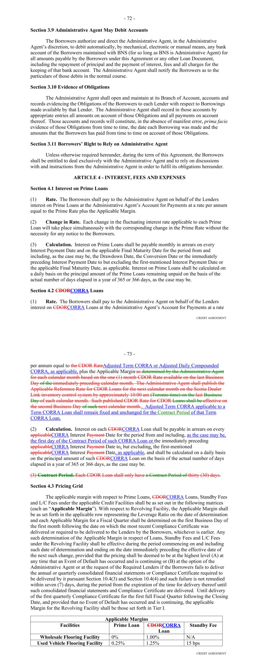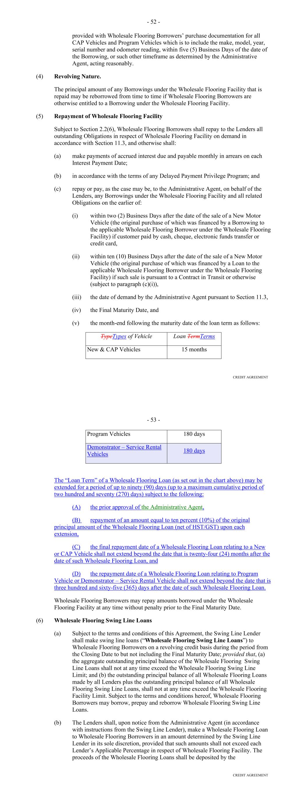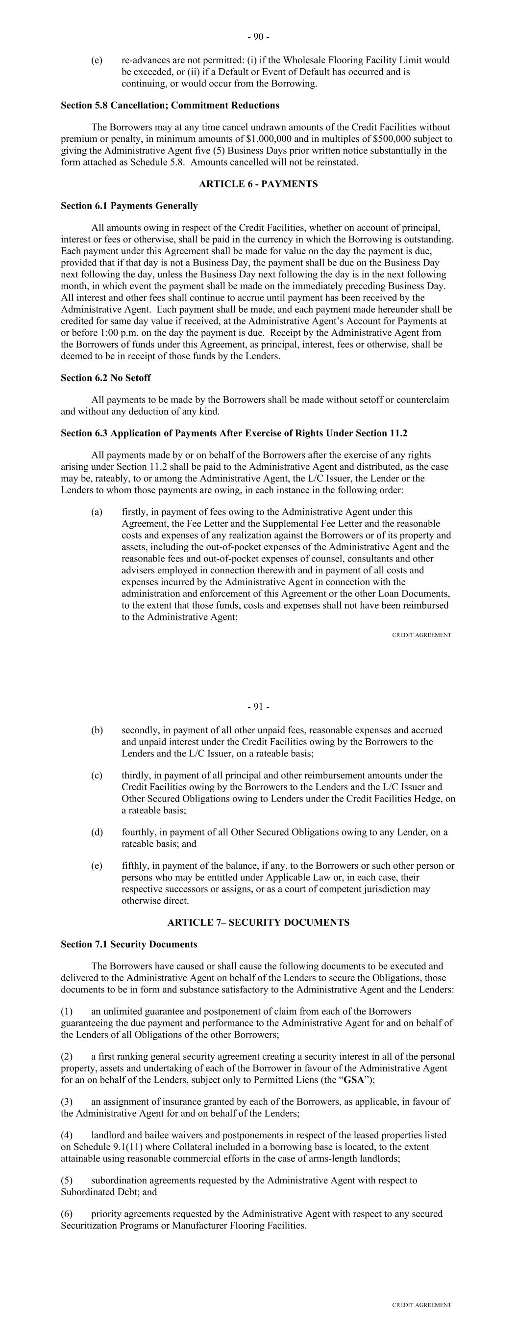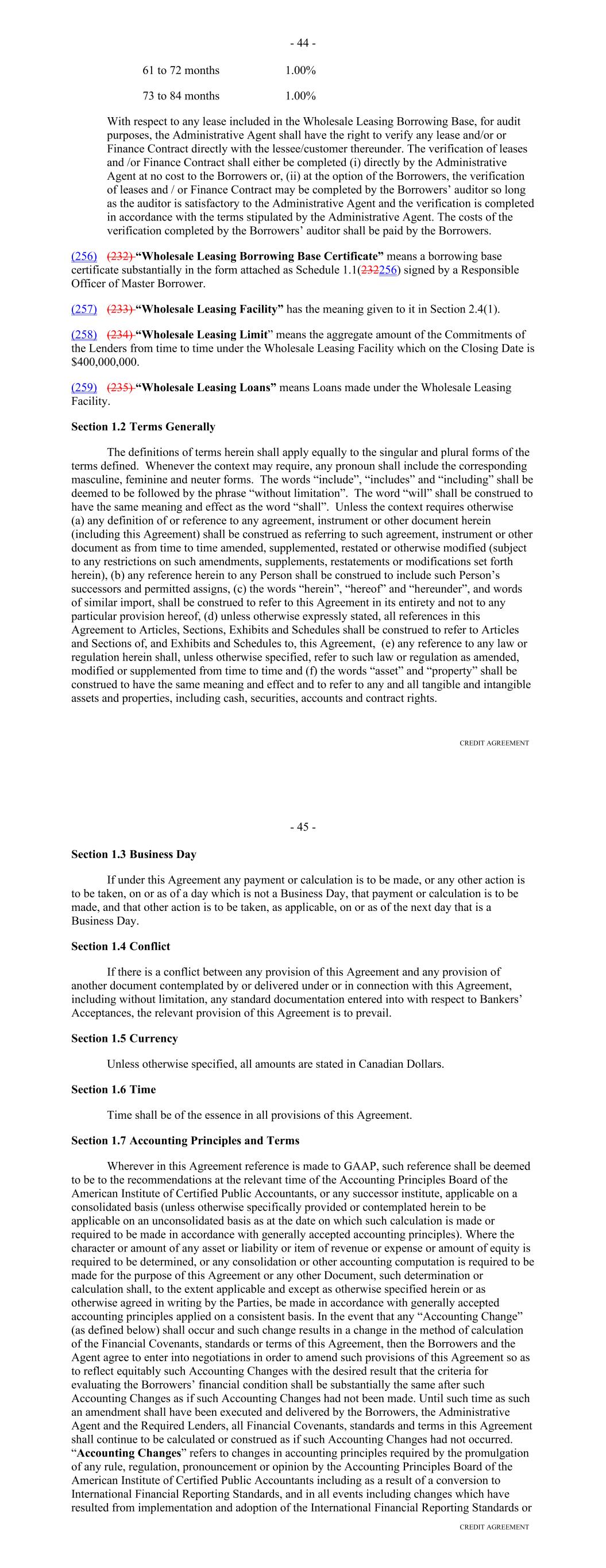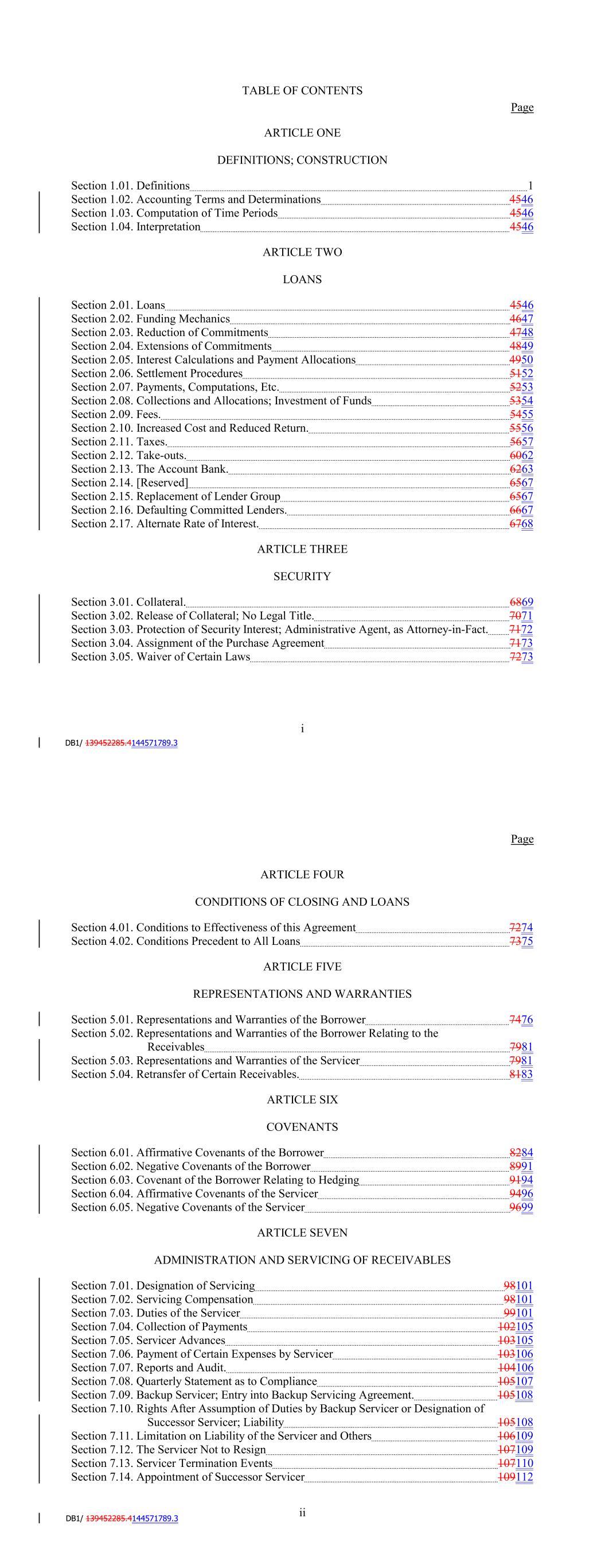 TABLE OF CONTENTS Page ARTICLE ONE DEFINITIONS; CONSTRUCTION Section 1.01. Definitions 1 Section 1.02. Accounting Terms and Determinations 4748 Section 1.03. Computation of Time Periods 4748 Section 1.04. Interpretation 4748 ARTICLE TWO LOANS Section 2.01. Loans 4849 Section 2.02. Funding Mechanics 4950 Section 2.03. Reduction of Commitments 5051 Section 2.04. Extensions of Commitments 5152 Section 2.05. Payments 5253 Section 2.06. Settlement Procedures 5455 Section 2.07. Payments, Computations, Etc. 5657 Section 2.08. Collections and Allocations; Investment of Funds 5658 Section 2.09. Fees 5859 Section 2.10. Increased Cost and Reduced Return 5860 Section 2.11. Taxes 6061 Section 2.12. Take-outs 6466 Section 2.13. The Account Bank. 6667 Section 2.14. Cost of Funds Disclosure and Exculpatory Language 6970 Section 2.15. Replacement of Lender Group 6971 Section 2.16. Defaulting Committed Lenders. 7071 Section 2.17. Alternate Rate of Interest. 7172 ARTICLE THREE SECURITY Section 3.01. Collateral. 7274 Section 3.02. Release of Collateral; No Legal Title 7476 Section 3.03. Protection of Security Interest; Administrative Agent, as Attorney-in-Fact 7576 Section 3.04. Assignment of the Purchase Agreement 7677 Section 3.05. Waiver of Certain Laws 7677 Section 3.06. [Reserved] 7678 i Page ARTICLE FOUR CONDITIONS OF CLOSING AND LOANS Section 4.01. Conditions to Effectiveness of this Agreement 7778 Section 4.02. Conditions Precedent to All Loans 7879 ARTICLE FIVE REPRESENTATIONS AND WARRANTIES Section 5.01. Representations and Warranties of the Borrower 7981 Section 5.02. Representations and Warranties of the Borrower Relating to the Receivables 8485 Section 5.03. Representations and Warranties of the Servicer 8485 Section 5.04. Retransfer of Certain Receivables. 87 ARTICLE SIX COVENANTS Section 6.01. Affirmative Covenants of the Borrower 8889 Section 6.02. Negative Covenants of the Borrower 9596 Section 6.03. Covenant of the Borrower Relating to Hedging 9798 Section 6.04. Affirmative Covenants of the Servicer 99100 Section 6.05. Negative Covenants of the Servicer 102103 ARTICLE SEVEN ADMINISTRATION AND SERVICING OF RECEIVABLES Section 7.01. Designation of Servicing 104105 Section 7.02. Servicing Compensation 104105 Section 7.03. Duties of the Servicer 104105 Section 7.04. Collection of Payments 108109 Section 7.05. Servicer Advances 108109 Section 7.06. Payment of Certain Expenses by Servicer 109110 Section 7.07. Reports and Audit. 109110 Section 7.08. Quarterly Statement as to Compliance 110111 Section 7.09. Backup Servicer; Entry into Backup Servicing Agreement 110112 Section 7.10. Rights After Assumption of Duties by Backup Servicer or Designation of Successor Servicer; Liability 111112 Section 7.11. Limitation on Liability of the Servicer and Others 112113 Section 7.12. The Servicer Not to Resign 112113 Section 7.13. Servicer Termination Events 112114 Section 7.14. Appointment of Successor Servicer 114116 ii