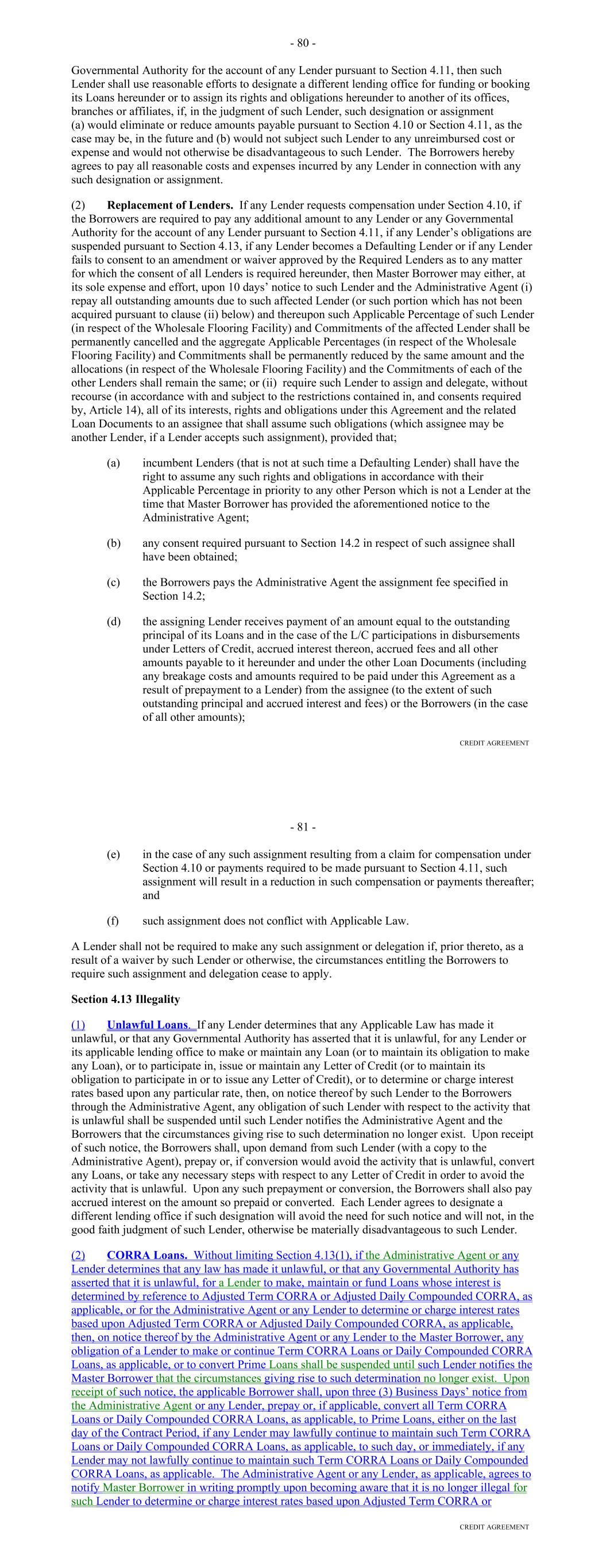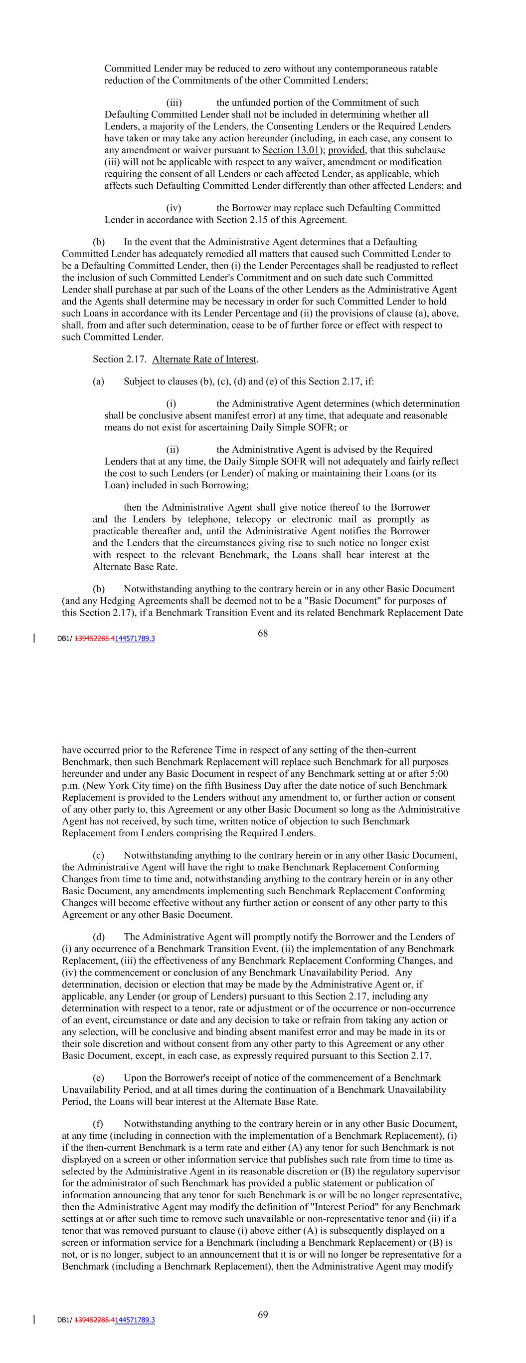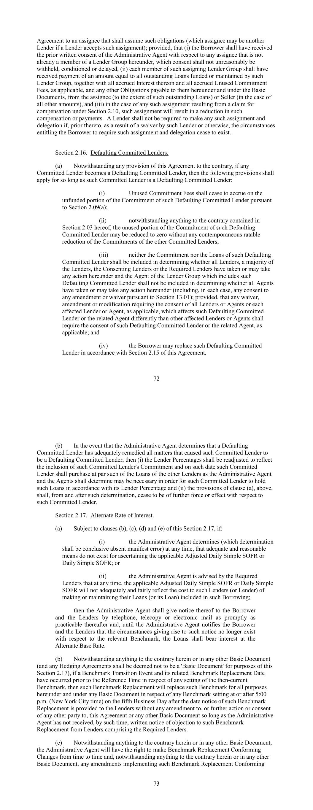 Agreement to an assignee that shall assume such obligations (which assignee may be another Lender if a Lender accepts such assignment); provided, that (i) the Borrower shall have received the prior written consent of the Administrative Agent with respect to any assignee that is not already a member of a Lender Group hereunder, which consent shall not unreasonably be withheld, conditioned or delayed, (ii) each member of such assigning Lender Group shall have received payment of an amount equal to all outstanding Loans funded or maintained by such Lender Group, together with all accrued Interest thereon and all accrued Unused Commitment Fees, as applicable, and any other Obligations payable to them hereunder and under the Basic Documents, from the assignee (to the extent of such outstanding Loans) or Seller (in the case of all other amounts), and (iii) in the case of any such assignment resulting from a claim for compensation under Section 2.10, such assignment will result in a reduction in such compensation or payments. A Lender shall not be required to make any such assignment and delegation if, prior thereto, as a result of a waiver by such Lender or otherwise, the circumstances entitling the Borrower to require such assignment and delegation cease to exist. Section 2.16. Defaulting Committed Lenders. (a) Notwithstanding any provision of this Agreement to the contrary, if any Committed Lender becomes a Defaulting Committed Lender, then the following provisions shall apply for so long as such Committed Lender is a Defaulting Committed Lender: (i) Unused Commitment Fees shall cease to accrue on the unfunded portion of the Commitment of such Defaulting Committed Lender pursuant to Section 2.09(a); (ii) notwithstanding anything to the contrary contained in Section 2.03 hereof, the unused portion of the Commitment of such Defaulting Committed Lender may be reduced to zero without any contemporaneous ratable reduction of the Commitments of the other Committed Lenders; (iii) neither the Commitment nor the Loans of such Defaulting Committed Lender shall be included in determining whether all Lenders, a majority of the Lenders, the Consenting Lenders or the Required Lenders have taken or may take any action hereunder and the Agent of the Lender Group which includes such Defaulting Committed Lender shall not be included in determining whether all Agents have taken or may take any action hereunder (including, in each case, any consent to any amendment or waiver pursuant to Section 13.01); provided, that any waiver, amendment or modification requiring the consent of all Lenders or Agents or each affected Lender or Agent, as applicable, which affects such Defaulting Committed Lender or the related Agent differently than other affected Lenders or Agents shall require the consent of such Defaulting Committed Lender or the related Agent, as applicable; and (iv) the Borrower may replace such Defaulting Committed Lender in accordance with Section 2.15 of this Agreement. 72 (b) In the event that the Administrative Agent determines that a Defaulting Committed Lender has adequately remedied all matters that caused such Committed Lender to be a Defaulting Committed Lender, then (i) the Lender Percentages shall be readjusted to reflect the inclusion of such Committed Lender's Commitment and on such date such Committed Lender shall purchase at par such of the Loans of the other Lenders as the Administrative Agent and the Agents shall determine may be necessary in order for such Committed Lender to hold such Loans in accordance with its Lender Percentage and (ii) the provisions of clause (a), above, shall, from and after such determination, cease to be of further force or effect with respect to such Committed Lender. Section 2.17. Alternate Rate of Interest. (a) Subject to clauses (b), (c), (d) and (e) of this Section 2.17, if: (i) the Administrative Agent determines (which determination shall be conclusive absent manifest error) at any time, that adequate and reasonable means do not exist for ascertaining the applicable Adjusted Daily Simple SOFR or Daily Simple SOFR; or (ii) the Administrative Agent is advised by the Required Lenders that at any time, the applicable Adjusted Daily Simple SOFR or Daily Simple SOFR will not adequately and fairly reflect the cost to such Lenders (or Lender) of making or maintaining their Loans (or its Loan) included in such Borrowing; then the Administrative Agent shall give notice thereof to the Borrower and the Lenders by telephone, telecopy or electronic mail as promptly as practicable thereafter and, until the Administrative Agent notifies the Borrower and the Lenders that the circumstances giving rise to such notice no longer exist with respect to the relevant Benchmark, the Loans shall bear interest at the Alternate Base Rate. (b) Notwithstanding anything to the contrary herein or in any other Basic Document (and any Hedging Agreements shall be deemed not to be a 'Basic Document' for purposes of this Section 2.17), if a Benchmark Transition Event and its related Benchmark Replacement Date have occurred prior to the Reference Time in respect of any setting of the then-current Benchmark, then such Benchmark Replacement will replace such Benchmark for all purposes hereunder and under any Basic Document in respect of any Benchmark setting at or after 5:00 p.m. (New York City time) on the fifth Business Day after the date notice of such Benchmark Replacement is provided to the Lenders without any amendment to, or further action or consent of any other party to, this Agreement or any other Basic Document so long as the Administrative Agent has not received, by such time, written notice of objection to such Benchmark Replacement from Lenders comprising the Required Lenders. (c) Notwithstanding anything to the contrary herein or in any other Basic Document, the Administrative Agent will have the right to make Benchmark Replacement Conforming Changes from time to time and, notwiths
