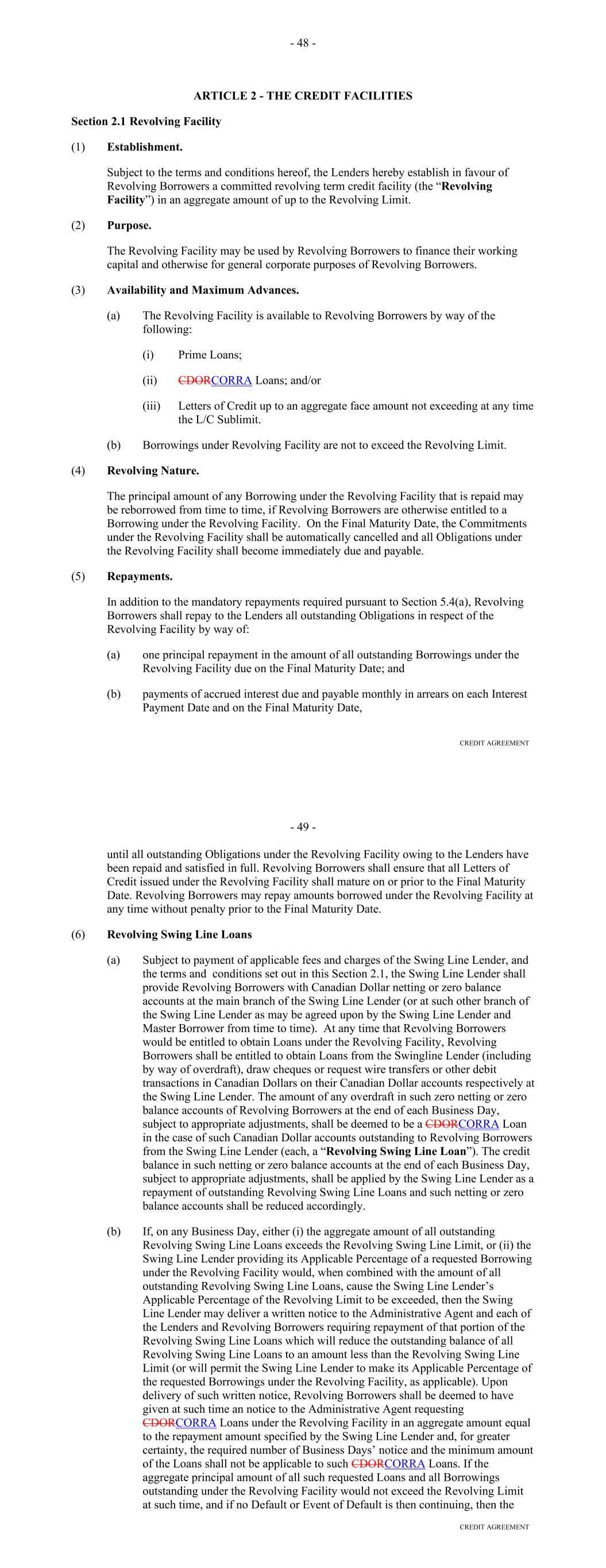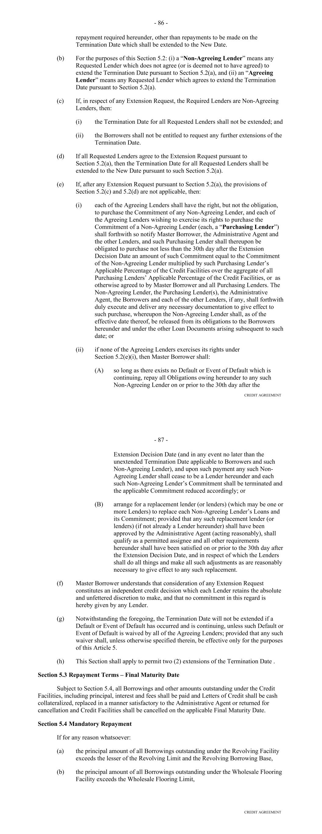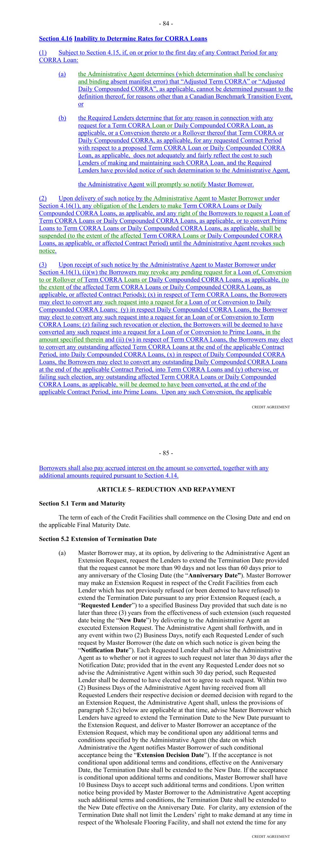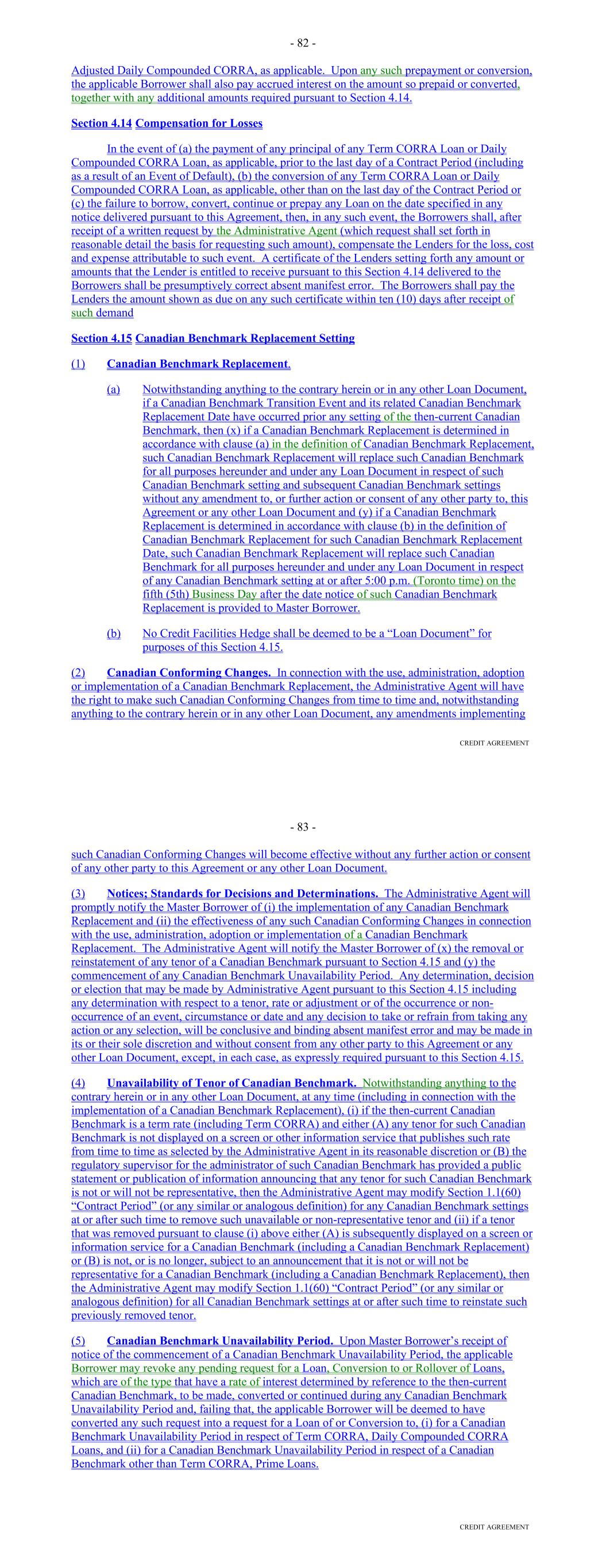 Agreement to an assignee that shall assume such obligations (which assignee may be another Lender if a Lender accepts such assignment); provided, that (i) the Borrower shall have received the prior written consent of the Administrative Agent with respect to any assignee that is not already a member of a Lender Group hereunder, which consent shall not unreasonably be withheld, conditioned or delayed, (ii) each member of such assigning Lender Group shall have received payment of an amount equal to all outstanding Loans funded or maintained by such Lender Group, together with all accrued Interest thereon and all accrued Unused Commitment Fees, as applicable, and any other Obligations payable to them hereunder and under the Basic Documents, from the assignee (to the extent of such outstanding Loans) or Seller (in the case of all other amounts), and (iii) in the case of any such assignment resulting from a claim for compensation under Section 2.10, such assignment will result in a reduction in such compensation or payments. A Lender shall not be required to make any such assignment and delegation if, prior thereto, as a result of a waiver by such Lender or otherwise, the circumstances entitling the Borrower to require such assignment and delegation cease to exist. Section 2.16. Defaulting Committed Lenders. (a) Notwithstanding any provision of this Agreement to the contrary, if any Committed Lender becomes a Defaulting Committed Lender, then the following provisions shall apply for so long as such Committed Lender is a Defaulting Committed Lender: (i) Unused Commitment Fees shall cease to accrue on the unfunded portion of the Commitment of such Defaulting Committed Lender pursuant to Section 2.09(a); (ii) notwithstanding anything to the contrary contained in Section 2.03 hereof, the unused portion of the Commitment of such Defaulting Committed Lender may be reduced to zero without any contemporaneous ratable reduction of the Commitments of the other Committed Lenders; (iii) neither the Commitment nor the Loans of such Defaulting Committed Lender shall be included in determining whether all Lenders, a majority of the Lenders, the Consenting Lenders or the Required Lenders have taken or may take any action hereunder and the Agent of the Lender Group which includes such Defaulting Committed Lender shall not be included in determining whether all Agents have taken or may take any action hereunder (including, in each case, any consent to any amendment or waiver pursuant to Section 13.01); provided, that any waiver, amendment or modification requiring the consent of all Lenders or Agents or each affected Lender or Agent, as applicable, which affects such Defaulting Committed Lender or the related Agent differently than other affected Lenders or Agents shall require the consent of such Defaulting Committed Lender or the related Agent, as applicable; and (iv) the Borrower may replace such Defaulting Committed Lender in accordance with Section 2.15 of this Agreement. 72 (b) In the event that the Administrative Agent determines that a Defaulting Committed Lender has adequately remedied all matters that caused such Committed Lender to be a Defaulting Committed Lender, then (i) the Lender Percentages shall be readjusted to reflect the inclusion of such Committed Lender's Commitment and on such date such Committed Lender shall purchase at par such of the Loans of the other Lenders as the Administrative Agent and the Agents shall determine may be necessary in order for such Committed Lender to hold such Loans in accordance with its Lender Percentage and (ii) the provisions of clause (a), above, shall, from and after such determination, cease to be of further force or effect with respect to such Committed Lender. Section 2.17. Alternate Rate of Interest. (a) Subject to clauses (b), (c), (d) and (e) of this Section 2.17, if: (i) the Administrative Agent determines (which determination shall be conclusive absent manifest error) at any time, that adequate and reasonable means do not exist for ascertaining the applicable Adjusted Daily Simple SOFR or Daily Simple SOFR; or (ii) the Administrative Agent is advised by the Required Lenders that at any time, the applicable Adjusted Daily Simple SOFR or Daily Simple SOFR will not adequately and fairly reflect the cost to such Lenders (or Lender) of making or maintaining their Loans (or its Loan) included in such Borrowing; then the Administrative Agent shall give notice thereof to the Borrower and the Lenders by telephone, telecopy or electronic mail as promptly as practicable thereafter and, until the Administrative Agent notifies the Borrower and the Lenders that the circumstances giving rise to such notice no longer exist with respect to the relevant Benchmark, the Loans shall bear interest at the Alternate Base Rate. (b) Notwithstanding anything to the contrary herein or in any other Basic Document (and any Hedging Agreements shall be deemed not to be a 'Basic Document' for purposes of this Section 2.17), if a Benchmark Transition Event and its related Benchmark Replacement Date have occurred prior to the Reference Time in respect of any setting of the then-current Benchmark, then such Benchmark Replacement will replace such Benchmark for all purposes hereunder and under any Basic Document in respect of any Benchmark setting at or after 5:00 p.m. (New York City time) on the fifth Business Day after the date notice of such Benchmark Replacement is provided to the Lenders without any amendment to, or further action or consent of any other party to, this Agreement or any other Basic Document so long as the Administrative Agent has not received, by such time, written notice of objection to such Benchmark Replacement from Lenders comprising the Required Lenders. (c) Notwithstanding anything to the contrary herein or in any other Basic Document, the Administrative Agent will have the right to make Benchmark Replacement Conforming Changes from time to time and, notwiths
