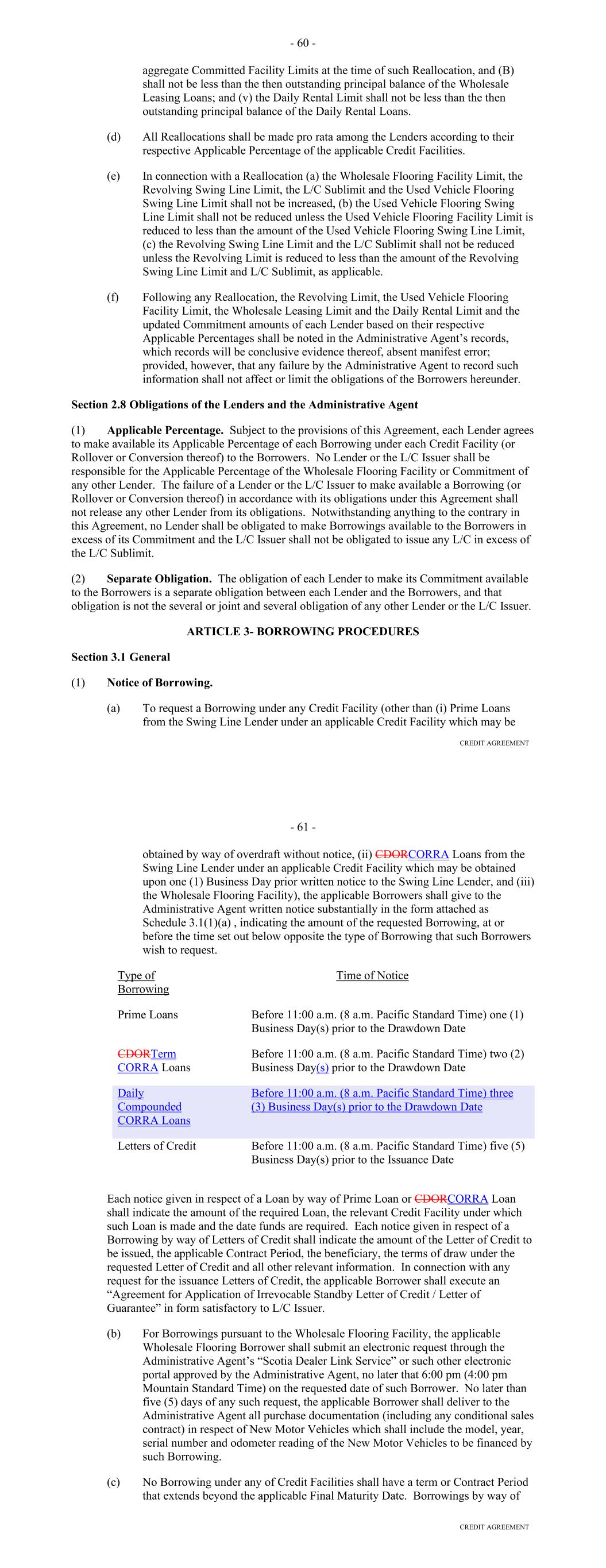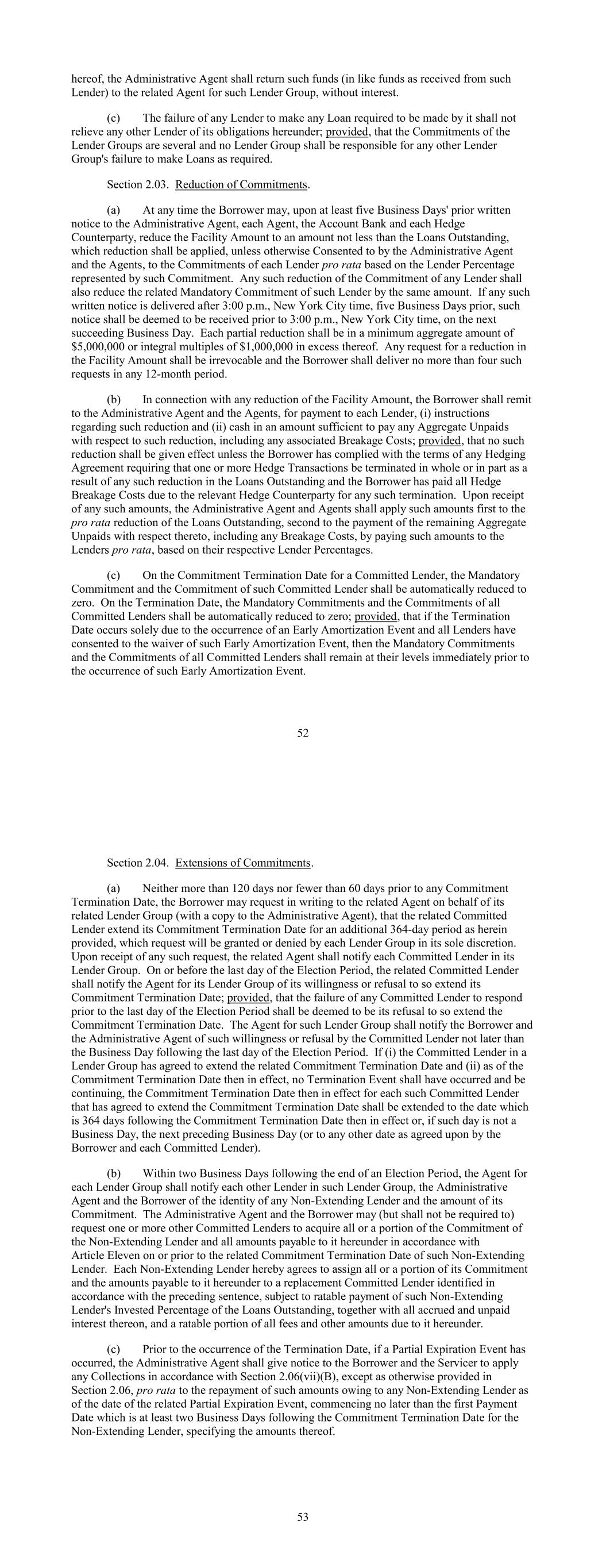 hereof, the Administrative Agent shall return such funds (in like funds as received from such Lender) to the related Agent for such Lender Group, without interest. (c) The failure of any Lender to make any Loan required to be made by it shall not relieve any other Lender of its obligations hereunder; provided, that the Commitments of the Lender Groups are several and no Lender Group shall be responsible for any other Lender Group's failure to make Loans as required. Section 2.03. Reduction of Commitments. (a) At any time the Borrower may, upon at least five Business Days' prior written notice to the Administrative Agent, each Agent, the Account Bank and each Hedge Counterparty, reduce the Facility Amount to an amount not less than the Loans Outstanding, which reduction shall be applied, unless otherwise Consented to by the Administrative Agent and the Agents, to the Commitments of each Lender pro rata based on the Lender Percentage represented by such Commitment. Any such reduction of the Commitment of any Lender shall also reduce the related Mandatory Commitment of such Lender by the same amount. If any such written notice is delivered after 3:00 p.m., New York City time, five Business Days prior, such notice shall be deemed to be received prior to 3:00 p.m., New York City time, on the next succeeding Business Day. Each partial reduction shall be in a minimum aggregate amount of $5,000,000 or integral multiples of $1,000,000 in excess thereof. Any request for a reduction in the Facility Amount shall be irrevocable and the Borrower shall deliver no more than four such requests in any 12-month period. (b) In connection with any reduction of the Facility Amount, the Borrower shall remit to the Administrative Agent and the Agents, for payment to each Lender, (i) instructions regarding such reduction and (ii) cash in an amount sufficient to pay any Aggregate Unpaids with respect to such reduction, including any associated Breakage Costs; provided, that no such reduction shall be given effect unless the Borrower has complied with the terms of any Hedging Agreement requiring that one or more Hedge Transactions be terminated in whole or in part as a result of any such reduction in the Loans Outstanding and the Borrower has paid all Hedge Breakage Costs due to the relevant Hedge Counterparty for any such termination. Upon receipt of any such amounts, the Administrative Agent and Agents shall apply such amounts first to the pro rata reduction of the Loans Outstanding, second to the payment of the remaining Aggregate Unpaids with respect thereto, including any Breakage Costs, by paying such amounts to the Lenders pro rata, based on their respective Lender Percentages. (c) On the Commitment Termination Date for a Committed Lender, the Mandatory Commitment and the Commitment of such Committed Lender shall be automatically reduced to zero. On the Termination Date, the Mandatory Commitments and the Commitments of all Committed Lenders shall be automatically reduced to zero; provided, that if the Termination Date occurs solely due to the occurrence of an Early Amortization Event and all Lenders have consented to the waiver of such Early Amortization Event, then the Mandatory Commitments and the Commitments of all Committed Lenders shall remain at their levels immediately prior to the occurrence of such Early Amortization Event. 52 Section 2.04. Extensions of Commitments. (a) Neither more than 120 days nor fewer than 60 days prior to any Commitment Termination Date, the Borrower may request in writing to the related Agent on behalf of its related Lender Group (with a copy to the Administrative Agent), that the related Committed Lender extend its Commitment Termination Date for an additional 364-day period as herein provided, which request will be granted or denied by each Lender Group in its sole discretion. Upon receipt of any such request, the related Agent shall notify each Committed Lender in its Lender Group. On or before the last day of the Election Period, the related Committed Lender shall notify the Agent for its Lender Group of its willingness or refusal to so extend its Commitment Termination Date; provided, that the failure of any Committed Lender to respond prior to the last day of the Election Period shall be deemed to be its refusal to so extend the Commitment Termination Date. The Agent for such Lender Group shall notify the Borrower and the Administrative Agent of such willingness or refusal by the Committed Lender not later than the Business Day following the last day of the Election Period. If (i) the Committed Lender in a Lender Group has agreed to extend the related Commitment Termination Date and (ii) as of the Commitment Termination Date then in effect, no Termination Event shall have occurred and be continuing, the Commitment Termination Date then in effect for each such Committed Lender that has agreed to extend the Commitment Termination Date shall be extended to the date which is 364 days following the Commitment Termination Date then in effect or, if such day is not a Business Day, the next preceding Business Day (or to any other date as agreed upon by the Borrower and each Committed Lender). (b) Within two Business Days following the end of an Election Period, the Agent for each Lender Group shall notify each other Lender in such Lender Group, the Administrative Agent and the Borrower of the identity of any Non-Extending Lender and the amount of its Commitment. The Administrative Agent and the Borrower may (but shall not be required to) request one or more other Committed Lenders to acquire all or a portion of the Commitment of the Non-Extending Lender and all amounts payable to it hereunder in accordance with Article Eleven on or prior to the related Commitment Termination Date of such Non-Extending Lender. Each Non-Extending Lender hereby agrees to assign all or a portion of its Commitment and the amounts payable to it hereunder to a replacement Committed Lender identified