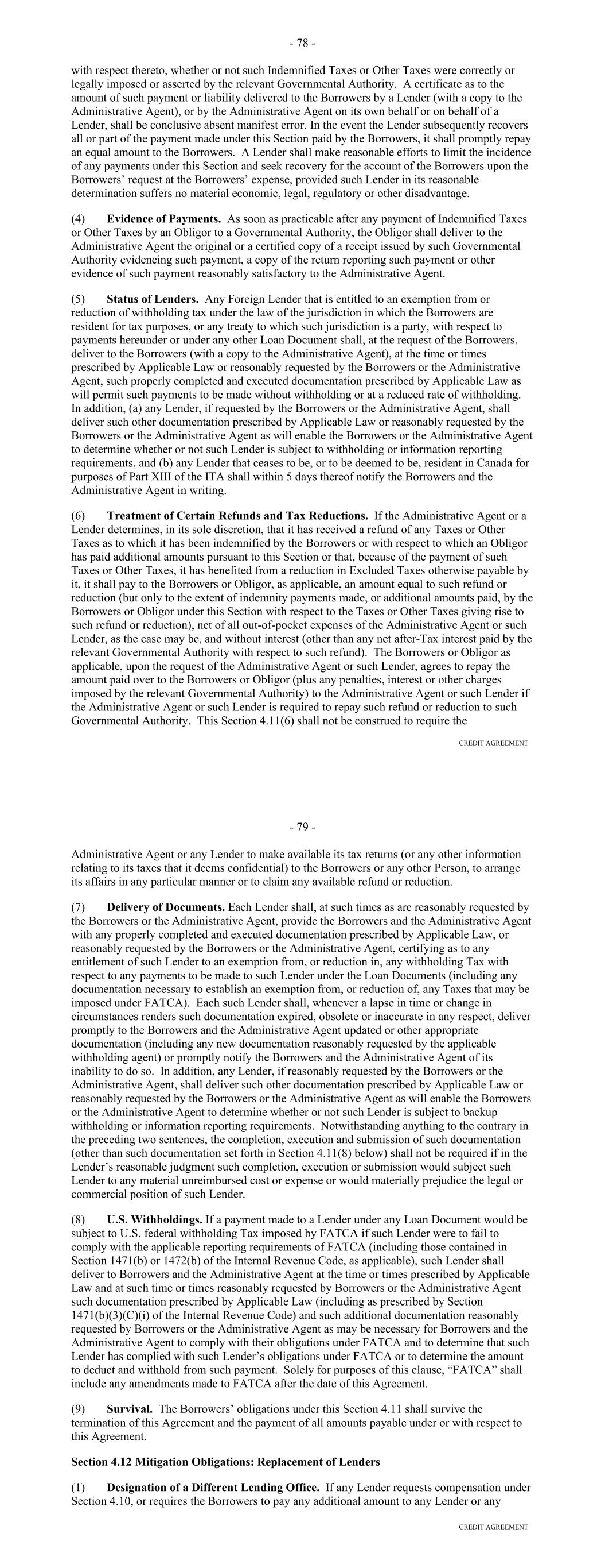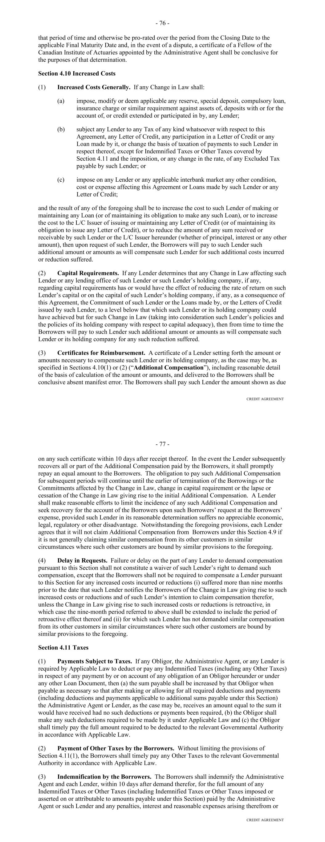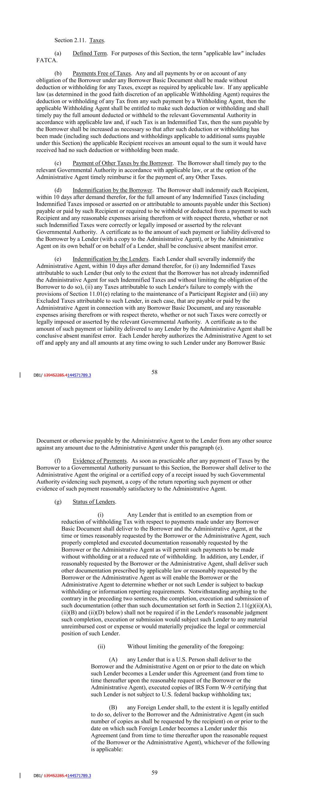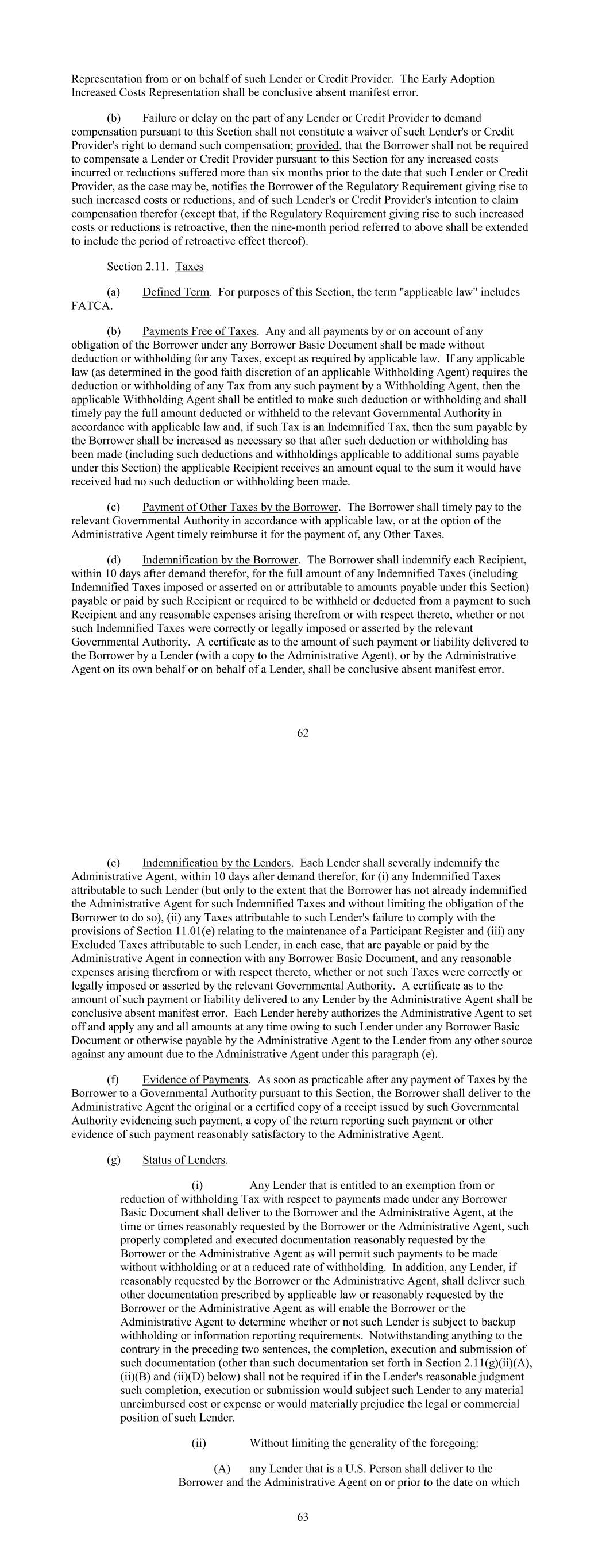 Representation from or on behalf of such Lender or Credit Provider. The Early Adoption Increased Costs Representation shall be conclusive absent manifest error. (b) Failure or delay on the part of any Lender or Credit Provider to demand compensation pursuant to this Section shall not constitute a waiver of such Lender's or Credit Provider's right to demand such compensation; provided, that the Borrower shall not be required to compensate a Lender or Credit Provider pursuant to this Section for any increased costs incurred or reductions suffered more than six months prior to the date that such Lender or Credit Provider, as the case may be, notifies the Borrower of the Regulatory Requirement giving rise to such increased costs or reductions, and of such Lender's or Credit Provider's intention to claim compensation therefor (except that, if the Regulatory Requirement giving rise to such increased costs or reductions is retroactive, then the nine-month period referred to above shall be extended to include the period of retroactive effect thereof). Section 2.11. Taxes (a) Defined Term. For purposes of this Section, the term "applicable law" includes FATCA. (b) Payments Free of Taxes. Any and all payments by or on account of any obligation of the Borrower under any Borrower Basic Document shall be made without deduction or withholding for any Taxes, except as required by applicable law. If any applicable law (as determined in the good faith discretion of an applicable Withholding Agent) requires the deduction or withholding of any Tax from any such payment by a Withholding Agent, then the applicable Withholding Agent shall be entitled to make such deduction or withholding and shall timely pay the full amount deducted or withheld to the relevant Governmental Authority in accordance with applicable law and, if such Tax is an Indemnified Tax, then the sum payable by the Borrower shall be increased as necessary so that after such deduction or withholding has been made (including such deductions and withholdings applicable to additional sums payable under this Section) the applicable Recipient receives an amount equal to the sum it would have received had no such deduction or withholding been made. (c) Payment of Other Taxes by the Borrower. The Borrower shall timely pay to the relevant Governmental Authority in accordance with applicable law, or at the option of the Administrative Agent timely reimburse it for the payment of, any Other Taxes. (d) Indemnification by the Borrower. The Borrower shall indemnify each Recipient, within 10 days after demand therefor, for the full amount of any Indemnified Taxes (including Indemnified Taxes imposed or asserted on or attributable to amounts payable under this Section) payable or paid by such Recipient or required to be withheld or deducted from a payment to such Recipient and any reasonable expenses arising therefrom or with respect thereto, whether or not such Indemnified Taxes were correctly or legally imposed or asserted by the relevant Governmental Authority. A certificate as to the amount of such payment or liability delivered to the Borrower by a Lender (with a copy to the Administrative Agent), or by the Administrative Agent on its own behalf or on behalf of a Lender, shall be conclusive absent manifest error. 62 (e) Indemnification by the Lenders. Each Lender shall severally indemnify the Administrative Agent, within 10 days after demand therefor, for (i) any Indemnified Taxes attributable to such Lender (but only to the extent that the Borrower has not already indemnified the Administrative Agent for such Indemnified Taxes and without limiting the obligation of the Borrower to do so), (ii) any Taxes attributable to such Lender's failure to comply with the provisions of Section 11.01(e) relating to the maintenance of a Participant Register and (iii) any Excluded Taxes attributable to such Lender, in each case, that are payable or paid by the Administrative Agent in connection with any Borrower Basic Document, and any reasonable expenses arising therefrom or with respect thereto, whether or not such Taxes were correctly or legally imposed or asserted by the relevant Governmental Authority. A certificate as to the amount of such payment or liability delivered to any Lender by the Administrative Agent shall be conclusive absent manifest error. Each Lender hereby authorizes the Administrative Agent to set off and apply any and all amounts at any time owing to such Lender under any Borrower Basic Document or otherwise payable by the Administrative Agent to the Lender from any other source against any amount due to the Administrative Agent under this paragraph (e). (f) Evidence of Payments. As soon as practicable after any payment of Taxes by the Borrower to a Governmental Authority pursuant to this Section, the Borrower shall deliver to the Administrative Agent the original or a certified copy of a receipt issued by such Governmental Authority evidencing such payment, a copy of the return reporting such payment or other evidence of such payment reasonably satisfactory to the Administrative Agent. (g) Status of Lenders. (i) Any Lender that is entitled to an exemption from or reduction of withholding Tax with respect to payments made under any Borrower Basic Document shall deliver to the Borrower and the Administrative Agent, at the time or times reasonably requested by the Borrower or the Administrative Agent, such properly completed and executed documentation reasonably requested by the Borrower or the Administrative Agent as will permit such payments to be made without withholding or at a reduced rate of withholding. In addition, any Lender, if reasonably requested by the Borrower or the Administrative Agent, shall deliver such other documentation prescribed by applicable law or reasonably requested by the Borrower or the Administrative Agent as will enable the Borrower or the Administrative Agent to determine whether or not such Lender is subject to b