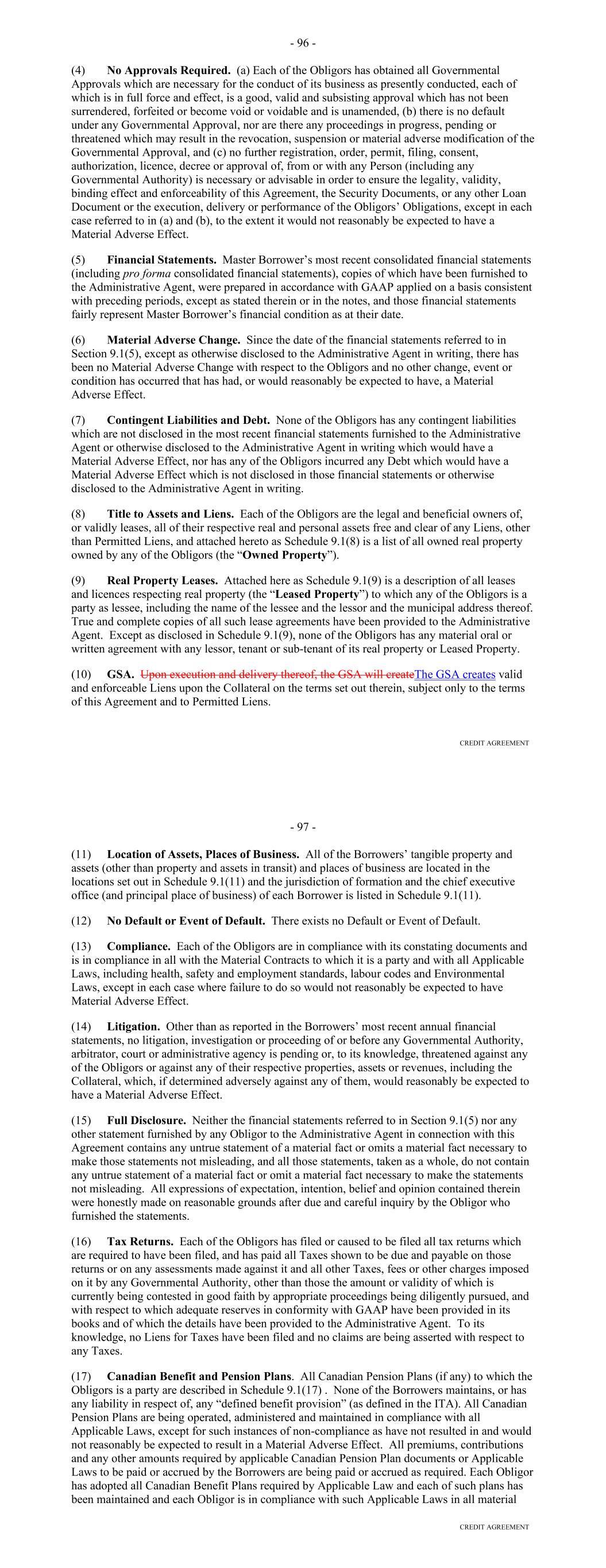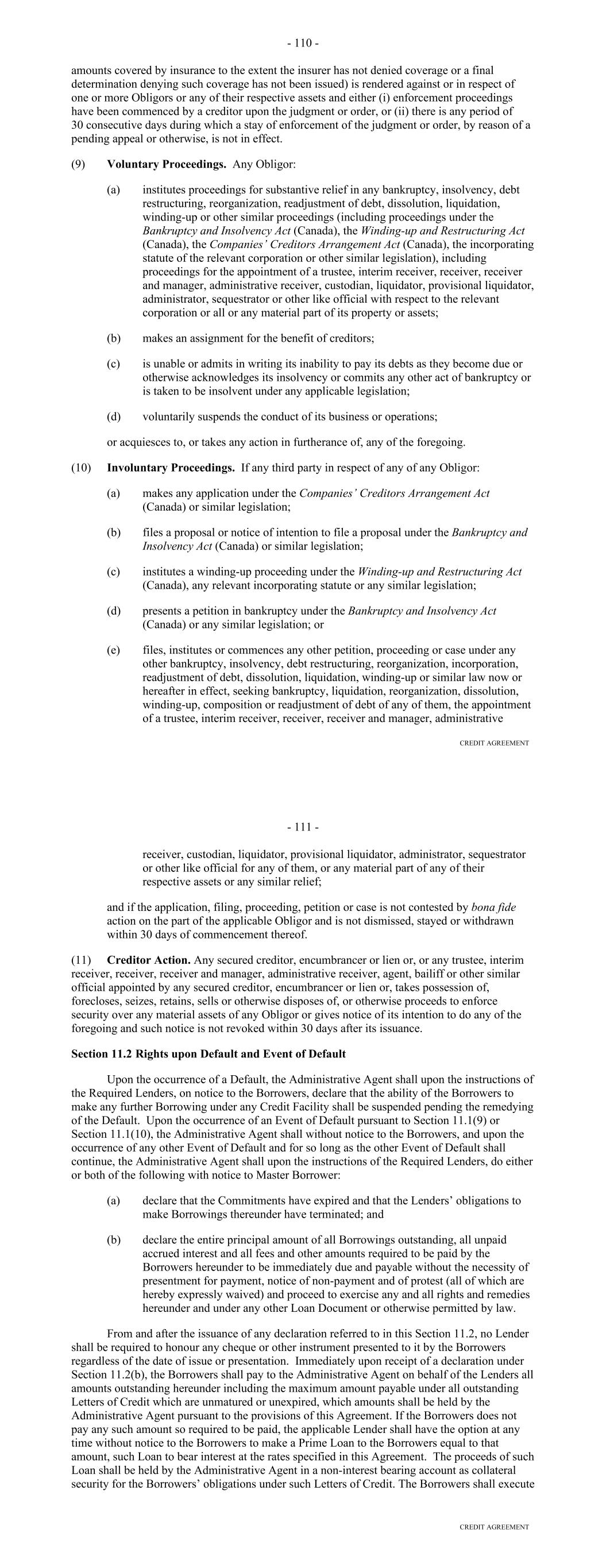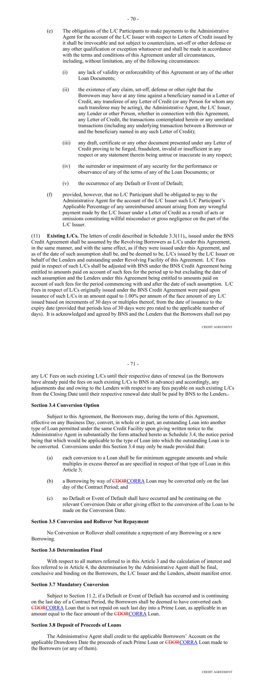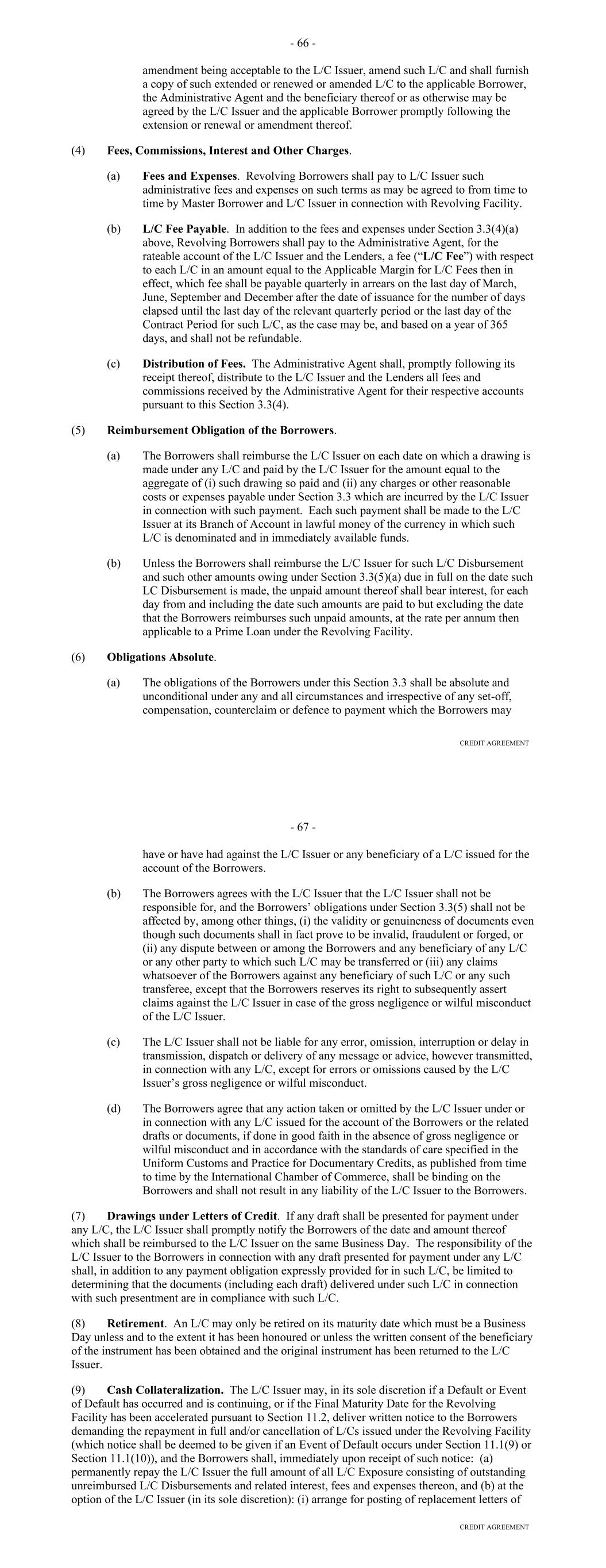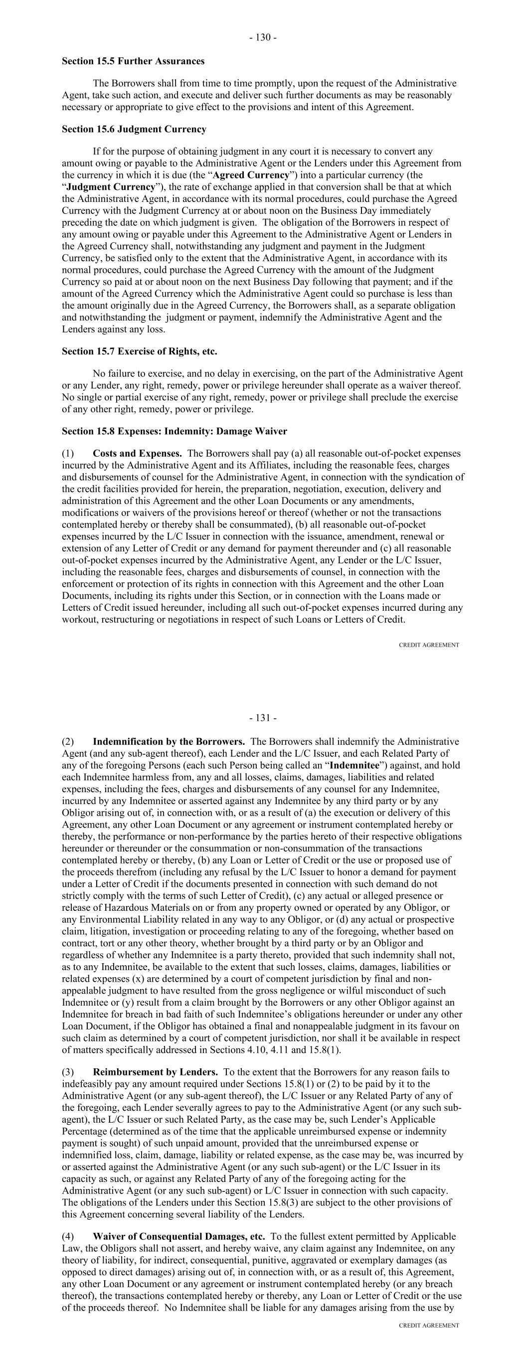 Representation from or on behalf of such Lender or Credit Provider. The Early Adoption Increased Costs Representation shall be conclusive absent manifest error. (b) Failure or delay on the part of any Lender or Credit Provider to demand compensation pursuant to this Section shall not constitute a waiver of such Lender's or Credit Provider's right to demand such compensation; provided, that the Borrower shall not be required to compensate a Lender or Credit Provider pursuant to this Section for any increased costs incurred or reductions suffered more than six months prior to the date that such Lender or Credit Provider, as the case may be, notifies the Borrower of the Regulatory Requirement giving rise to such increased costs or reductions, and of such Lender's or Credit Provider's intention to claim compensation therefor (except that, if the Regulatory Requirement giving rise to such increased costs or reductions is retroactive, then the nine-month period referred to above shall be extended to include the period of retroactive effect thereof). Section 2.11. Taxes (a) Defined Term. For purposes of this Section, the term "applicable law" includes FATCA. (b) Payments Free of Taxes. Any and all payments by or on account of any obligation of the Borrower under any Borrower Basic Document shall be made without deduction or withholding for any Taxes, except as required by applicable law. If any applicable law (as determined in the good faith discretion of an applicable Withholding Agent) requires the deduction or withholding of any Tax from any such payment by a Withholding Agent, then the applicable Withholding Agent shall be entitled to make such deduction or withholding and shall timely pay the full amount deducted or withheld to the relevant Governmental Authority in accordance with applicable law and, if such Tax is an Indemnified Tax, then the sum payable by the Borrower shall be increased as necessary so that after such deduction or withholding has been made (including such deductions and withholdings applicable to additional sums payable under this Section) the applicable Recipient receives an amount equal to the sum it would have received had no such deduction or withholding been made. (c) Payment of Other Taxes by the Borrower. The Borrower shall timely pay to the relevant Governmental Authority in accordance with applicable law, or at the option of the Administrative Agent timely reimburse it for the payment of, any Other Taxes. (d) Indemnification by the Borrower. The Borrower shall indemnify each Recipient, within 10 days after demand therefor, for the full amount of any Indemnified Taxes (including Indemnified Taxes imposed or asserted on or attributable to amounts payable under this Section) payable or paid by such Recipient or required to be withheld or deducted from a payment to such Recipient and any reasonable expenses arising therefrom or with respect thereto, whether or not such Indemnified Taxes were correctly or legally imposed or asserted by the relevant Governmental Authority. A certificate as to the amount of such payment or liability delivered to the Borrower by a Lender (with a copy to the Administrative Agent), or by the Administrative Agent on its own behalf or on behalf of a Lender, shall be conclusive absent manifest error. 62 (e) Indemnification by the Lenders. Each Lender shall severally indemnify the Administrative Agent, within 10 days after demand therefor, for (i) any Indemnified Taxes attributable to such Lender (but only to the extent that the Borrower has not already indemnified the Administrative Agent for such Indemnified Taxes and without limiting the obligation of the Borrower to do so), (ii) any Taxes attributable to such Lender's failure to comply with the provisions of Section 11.01(e) relating to the maintenance of a Participant Register and (iii) any Excluded Taxes attributable to such Lender, in each case, that are payable or paid by the Administrative Agent in connection with any Borrower Basic Document, and any reasonable expenses arising therefrom or with respect thereto, whether or not such Taxes were correctly or legally imposed or asserted by the relevant Governmental Authority. A certificate as to the amount of such payment or liability delivered to any Lender by the Administrative Agent shall be conclusive absent manifest error. Each Lender hereby authorizes the Administrative Agent to set off and apply any and all amounts at any time owing to such Lender under any Borrower Basic Document or otherwise payable by the Administrative Agent to the Lender from any other source against any amount due to the Administrative Agent under this paragraph (e). (f) Evidence of Payments. As soon as practicable after any payment of Taxes by the Borrower to a Governmental Authority pursuant to this Section, the Borrower shall deliver to the Administrative Agent the original or a certified copy of a receipt issued by such Governmental Authority evidencing such payment, a copy of the return reporting such payment or other evidence of such payment reasonably satisfactory to the Administrative Agent. (g) Status of Lenders. (i) Any Lender that is entitled to an exemption from or reduction of withholding Tax with respect to payments made under any Borrower Basic Document shall deliver to the Borrower and the Administrative Agent, at the time or times reasonably requested by the Borrower or the Administrative Agent, such properly completed and executed documentation reasonably requested by the Borrower or the Administrative Agent as will permit such payments to be made without withholding or at a reduced rate of withholding. In addition, any Lender, if reasonably requested by the Borrower or the Administrative Agent, shall deliver such other documentation prescribed by applicable law or reasonably requested by the Borrower or the Administrative Agent as will enable the Borrower or the Administrative Agent to determine whether or not such Lender is subject to b