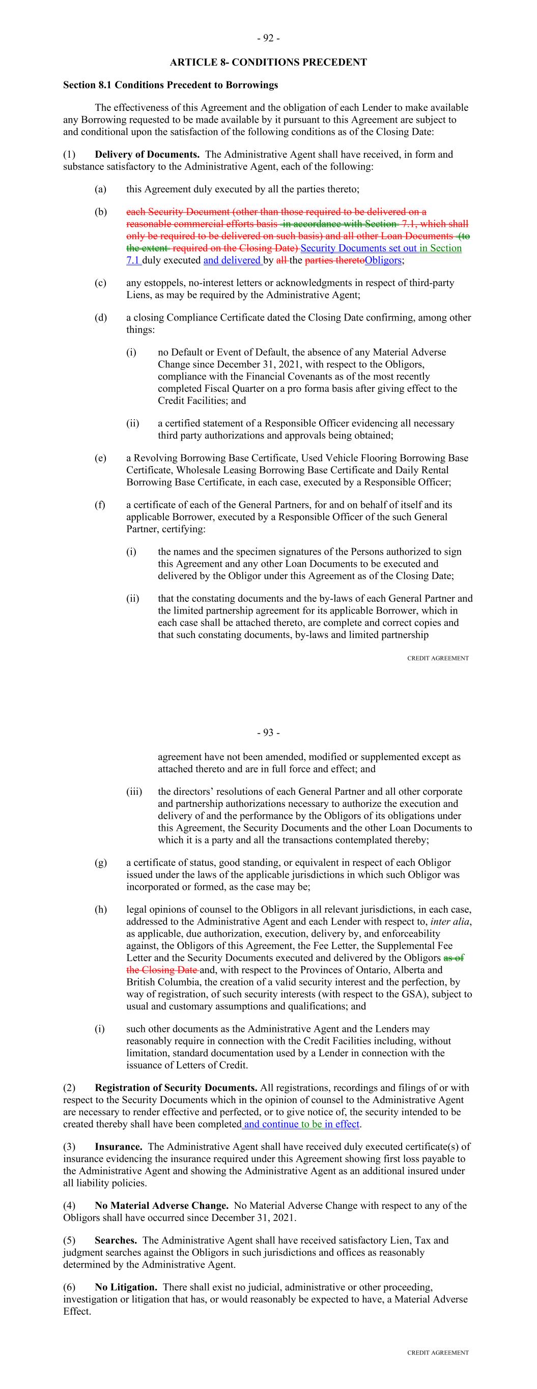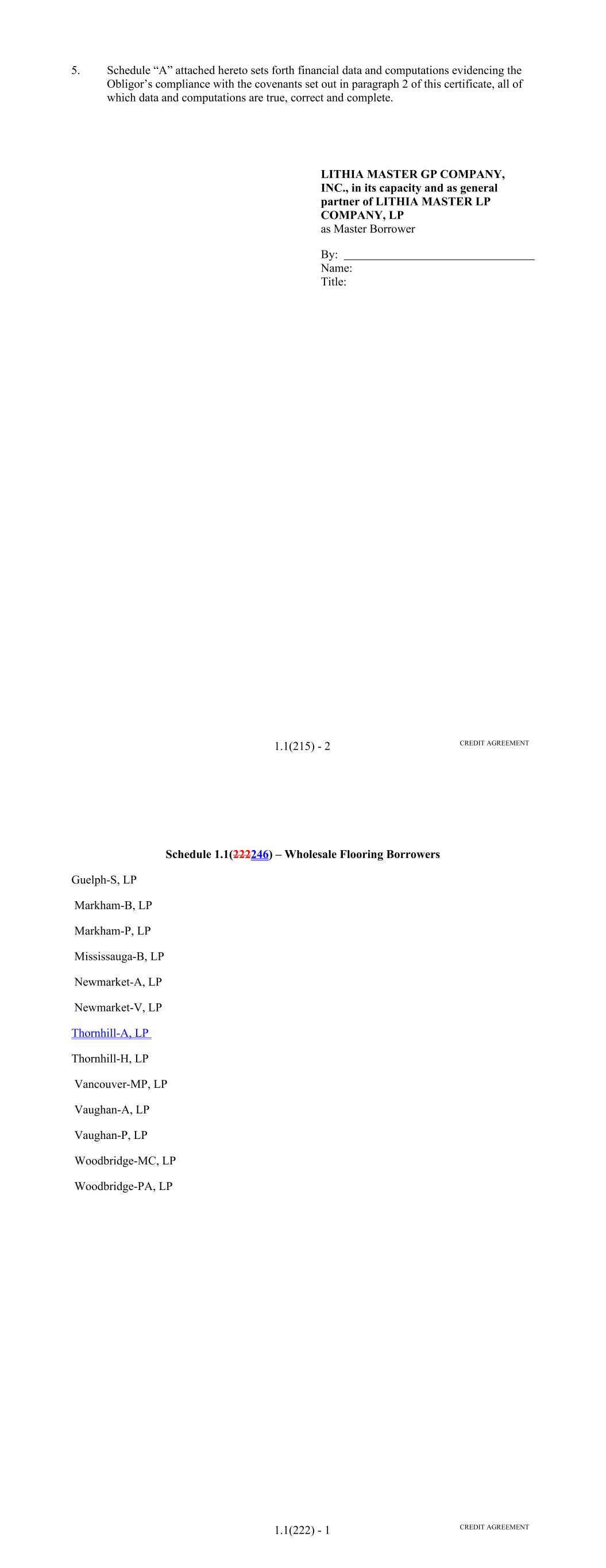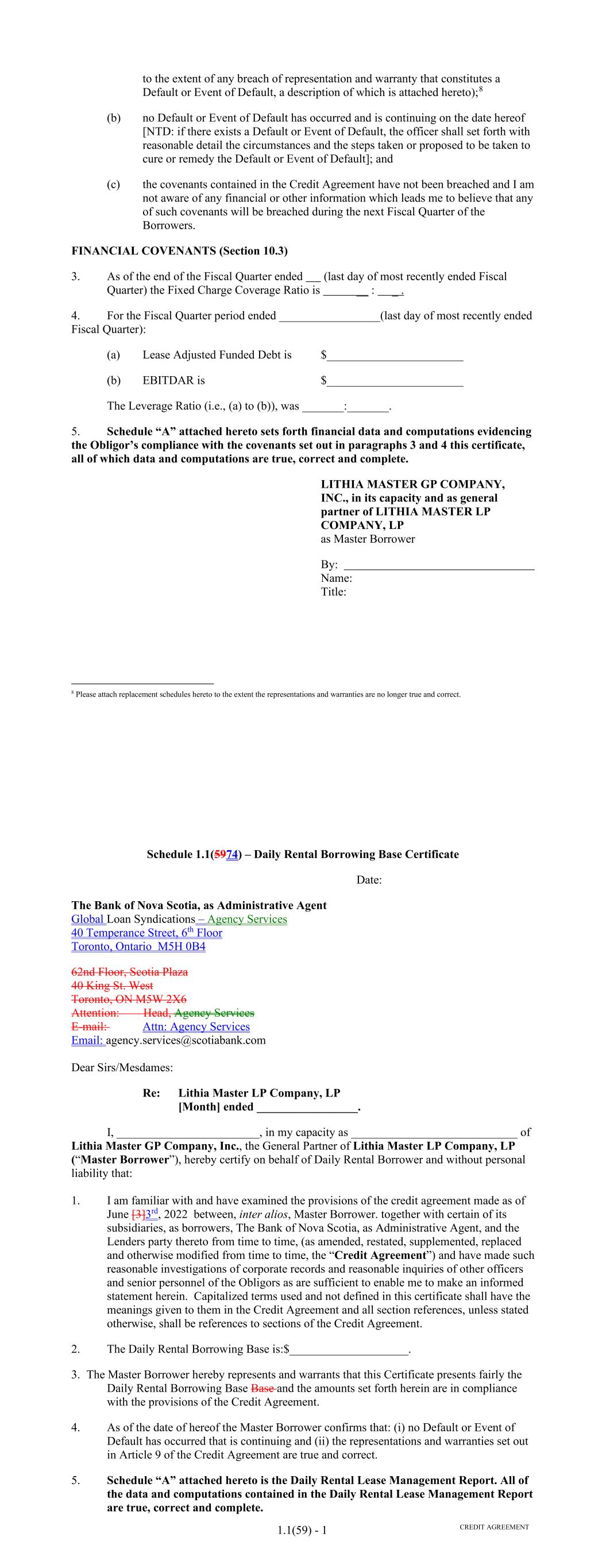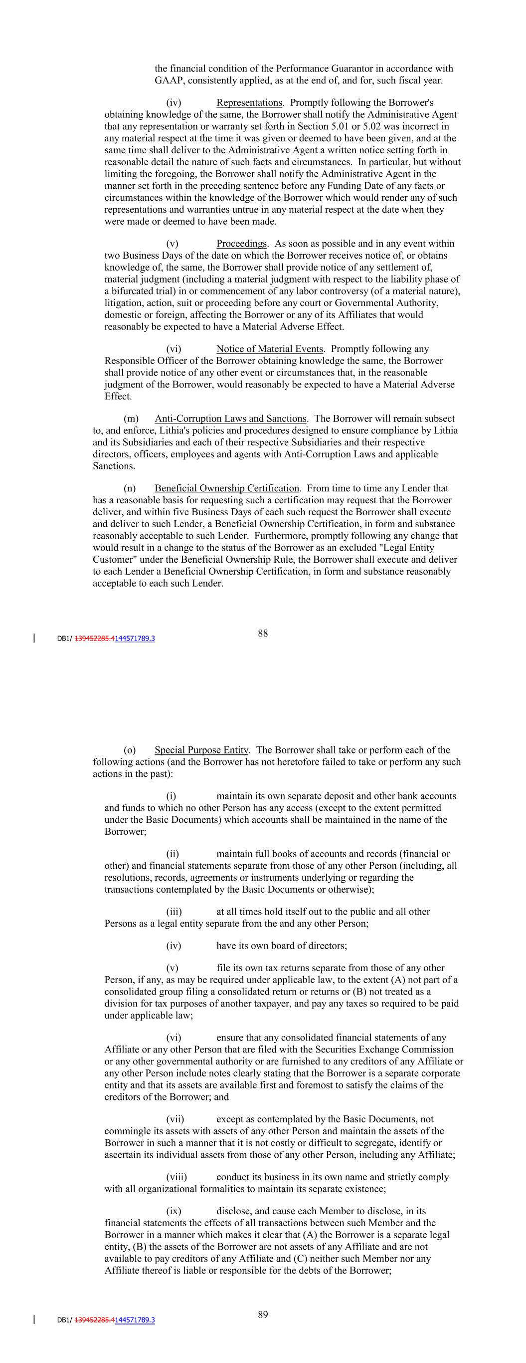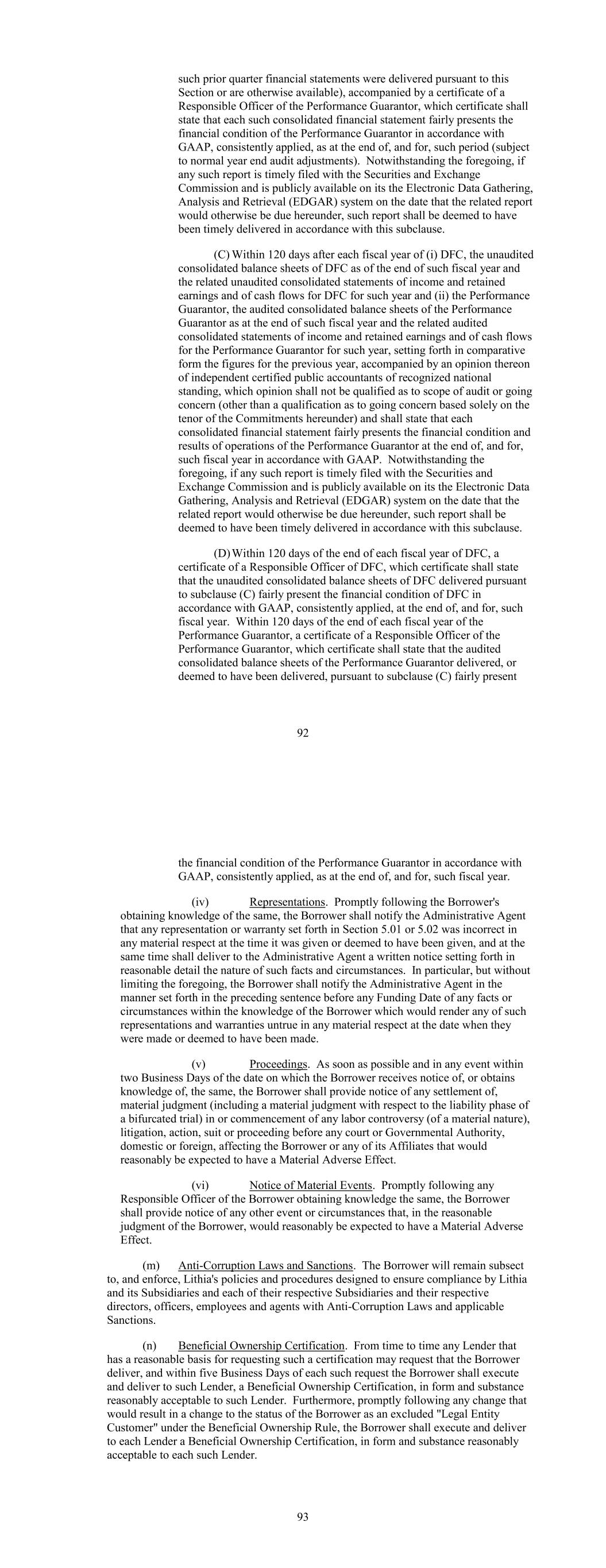 such prior quarter financial statements were delivered pursuant to this Section or are otherwise available), accompanied by a certificate of a Responsible Officer of the Performance Guarantor, which certificate shall state that each such consolidated financial statement fairly presents the financial condition of the Performance Guarantor in accordance with GAAP, consistently applied, as at the end of, and for, such period (subject to normal year end audit adjustments). Notwithstanding the foregoing, if any such report is timely filed with the Securities and Exchange Commission and is publicly available on its the Electronic Data Gathering, Analysis and Retrieval (EDGAR) system on the date that the related report would otherwise be due hereunder, such report shall be deemed to have been timely delivered in accordance with this subclause. (C) Within 120 days after each fiscal year of (i) DFC, the unaudited consolidated balance sheets of DFC as of the end of such fiscal year and the related unaudited consolidated statements of income and retained earnings and of cash flows for DFC for such year and (ii) the Performance Guarantor, the audited consolidated balance sheets of the Performance Guarantor as at the end of such fiscal year and the related audited consolidated statements of income and retained earnings and of cash flows for the Performance Guarantor for such year, setting forth in comparative form the figures for the previous year, accompanied by an opinion thereon of independent certified public accountants of recognized national standing, which opinion shall not be qualified as to scope of audit or going concern (other than a qualification as to going concern based solely on the tenor of the Commitments hereunder) and shall state that each consolidated financial statement fairly presents the financial condition and results of operations of the Performance Guarantor at the end of, and for, such fiscal year in accordance with GAAP. Notwithstanding the foregoing, if any such report is timely filed with the Securities and Exchange Commission and is publicly available on its the Electronic Data Gathering, Analysis and Retrieval (EDGAR) system on the date that the related report would otherwise be due hereunder, such report shall be deemed to have been timely delivered in accordance with this subclause. (D)Within 120 days of the end of each fiscal year of DFC, a certificate of a Responsible Officer of DFC, which certificate shall state that the unaudited consolidated balance sheets of DFC delivered pursuant to subclause (C) fairly present the financial condition of DFC in accordance with GAAP, consistently applied, at the end of, and for, such fiscal year. Within 120 days of the end of each fiscal year of the Performance Guarantor, a certificate of a Responsible Officer of the Performance Guarantor, which certificate shall state that the audited consolidated balance sheets of the Performance Guarantor delivered, or deemed to have been delivered, pursuant to subclause (C) fairly present 92 the financial condition of the Performance Guarantor in accordance with GAAP, consistently applied, as at the end of, and for, such fiscal year. (iv) Representations. Promptly following the Borrower's obtaining knowledge of the same, the Borrower shall notify the Administrative Agent that any representation or warranty set forth in Section 5.01 or 5.02 was incorrect in any material respect at the time it was given or deemed to have been given, and at the same time shall deliver to the Administrative Agent a written notice setting forth in reasonable detail the nature of such facts and circumstances. In particular, but without limiting the foregoing, the Borrower shall notify the Administrative Agent in the manner set forth in the preceding sentence before any Funding Date of any facts or circumstances within the knowledge of the Borrower which would render any of such representations and warranties untrue in any material respect at the date when they were made or deemed to have been made. (v) Proceedings. As soon as possible and in any event within two Business Days of the date on which the Borrower receives notice of, or obtains knowledge of, the same, the Borrower shall provide notice of any settlement of, material judgment (including a material judgment with respect to the liability phase of a bifurcated trial) in or commencement of any labor controversy (of a material nature), litigation, action, suit or proceeding before any court or Governmental Authority, domestic or foreign, affecting the Borrower or any of its Affiliates that would reasonably be expected to have a Material Adverse Effect. (vi) Notice of Material Events. Promptly following any Responsible Officer of the Borrower obtaining knowledge the same, the Borrower shall provide notice of any other event or circumstances that, in the reasonable judgment of the Borrower, would reasonably be expected to have a Material Adverse Effect. (m) Anti-Corruption Laws and Sanctions. The Borrower will remain subsect to, and enforce, Lithia's policies and procedures designed to ensure compliance by Lithia and its Subsidiaries and each of their respective Subsidiaries and their respective directors, officers, employees and agents with Anti-Corruption Laws and applicable Sanctions. (n) Beneficial Ownership Certification. From time to time any Lender that has a reasonable basis for requesting such a certification may request that the Borrower deliver, and within five Business Days of each such request the Borrower shall execute and deliver to such Lender, a Beneficial Ownership Certification, in form and substance reasonably acceptable to such Lender. Furthermore, promptly following any change that would result in a change to the status of the Borrower as an excluded "Legal Entity Customer" under the Beneficial Ownership Rule, the Borrower shall execute and deliver to each Lender a Beneficial Ownership Certification, in form and substance reasonably accep