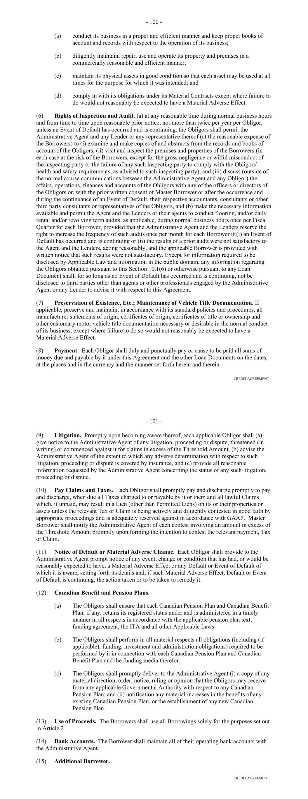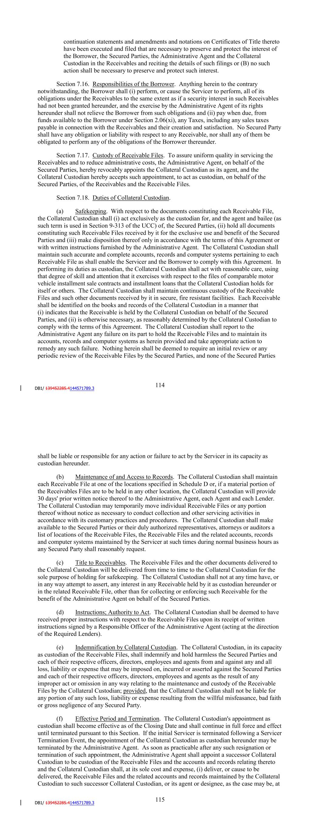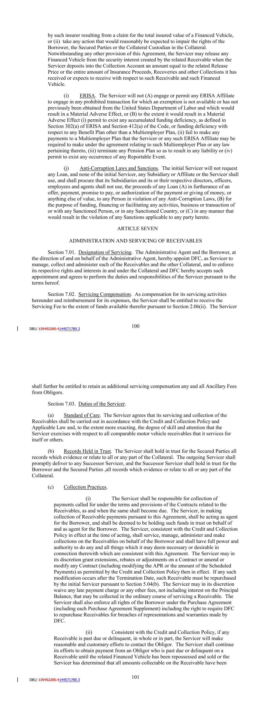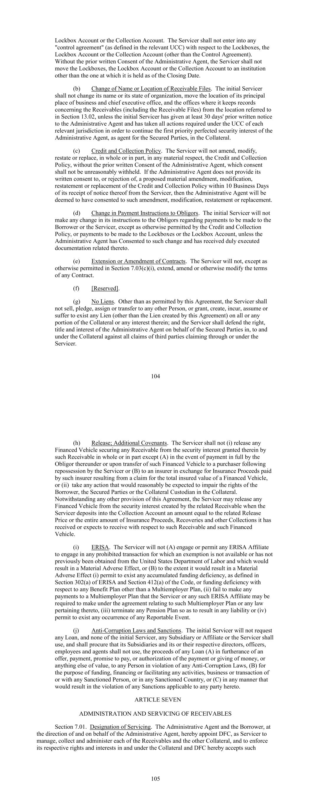 Lockbox Account or the Collection Account. The Servicer shall not enter into any "control agreement" (as defined in the relevant UCC) with respect to the Lockboxes, the Lockbox Account or the Collection Account (other than the Control Agreement). Without the prior written Consent of the Administrative Agent, the Servicer shall not move the Lockboxes, the Lockbox Account or the Collection Account to an institution other than the one at which it is held as of the Closing Date. (b) Change of Name or Location of Receivable Files. The initial Servicer shall not change its name or its state of organization, move the location of its principal place of business and chief executive office, and the offices where it keeps records concerning the Receivables (including the Receivable Files) from the location referred to in Section 13.02, unless the initial Servicer has given at least 30 days' prior written notice to the Administrative Agent and has taken all actions required under the UCC of each relevant jurisdiction in order to continue the first priority perfected security interest of the Administrative Agent, as agent for the Secured Parties, in the Collateral. (c) Credit and Collection Policy. The Servicer will not amend, modify, restate or replace, in whole or in part, in any material respect, the Credit and Collection Policy, without the prior written Consent of the Administrative Agent, which consent shall not be unreasonably withheld. If the Administrative Agent does not provide its written consent to, or rejection of, a proposed material amendment, modification, restatement or replacement of the Credit and Collection Policy within 10 Business Days of its receipt of notice thereof from the Servicer, then the Administrative Agent will be deemed to have consented to such amendment, modification, restatement or replacement. (d) Change in Payment Instructions to Obligors. The initial Servicer will not make any change in its instructions to the Obligors regarding payments to be made to the Borrower or the Servicer, except as otherwise permitted by the Credit and Collection Policy, or payments to be made to the Lockboxes or the Lockbox Account, unless the Administrative Agent has Consented to such change and has received duly executed documentation related thereto. (e) Extension or Amendment of Contracts. The Servicer will not, except as otherwise permitted in Section 7.03(c)(i), extend, amend or otherwise modify the terms of any Contract. (f) [Reserved]. (g) No Liens. Other than as permitted by this Agreement, the Servicer shall not sell, pledge, assign or transfer to any other Person, or grant, create, incur, assume or suffer to exist any Lien (other than the Lien created by this Agreement) on all or any portion of the Collateral or any interest therein; and the Servicer shall defend the right, title and interest of the Administrative Agent on behalf of the Secured Parties in, to and under the Collateral against all claims of third parties claiming through or under the Servicer. 104 (h) Release; Additional Covenants. The Servicer shall not (i) release any Financed Vehicle securing any Receivable from the security interest granted therein by such Receivable in whole or in part except (A) in the event of payment in full by the Obligor thereunder or upon transfer of such Financed Vehicle to a purchaser following repossession by the Servicer or (B) to an insurer in exchange for Insurance Proceeds paid by such insurer resulting from a claim for the total insured value of a Financed Vehicle, or (ii) take any action that would reasonably be expected to impair the rights of the Borrower, the Secured Parties or the Collateral Custodian in the Collateral. Notwithstanding any other provision of this Agreement, the Servicer may release any Financed Vehicle from the security interest created by the related Receivable when the Servicer deposits into the Collection Account an amount equal to the related Release Price or the entire amount of Insurance Proceeds, Recoveries and other Collections it has received or expects to receive with respect to such Receivable and such Financed Vehicle. (i) ERISA. The Servicer will not (A) engage or permit any ERISA Affiliate to engage in any prohibited transaction for which an exemption is not available or has not previously been obtained from the United States Department of Labor and which would result in a Material Adverse Effect, or (B) to the extent it would result in a Material Adverse Effect (i) permit to exist any accumulated funding deficiency, as defined in Section 302(a) of ERISA and Section 412(a) of the Code, or funding deficiency with respect to any Benefit Plan other than a Multiemployer Plan, (ii) fail to make any payments to a Multiemployer Plan that the Servicer or any such ERISA Affiliate may be required to make under the agreement relating to such Multiemployer Plan or any law pertaining thereto, (iii) terminate any Pension Plan so as to result in any liability or (iv) permit to exist any occurrence of any Reportable Event. (j) Anti-Corruption Laws and Sanctions. The initial Servicer will not request any Loan, and none of the initial Servicer, any Subsidiary or Affiliate or the Servicer shall use, and shall procure that its Subsidiaries and its or their respective directors, officers, employees and agents shall not use, the proceeds of any Loan (A) in furtherance of an offer, payment, promise to pay, or authorization of the payment or giving of money, or anything else of value, to any Person in violation of any Anti-Corruption Laws, (B) for the purpose of funding, financing or facilitating any activities, business or transaction of or with any Sanctioned Person, or in any Sanctioned Country, or (C) in any manner that would result in the violation of any Sanctions applicable to any party hereto. ARTICLE SEVEN ADMINISTRATION AND SERVICING OF RECEIVABLES Section 7.01. Designation of Servicing. The Administrative Agent and the Borrower, at the direction of and