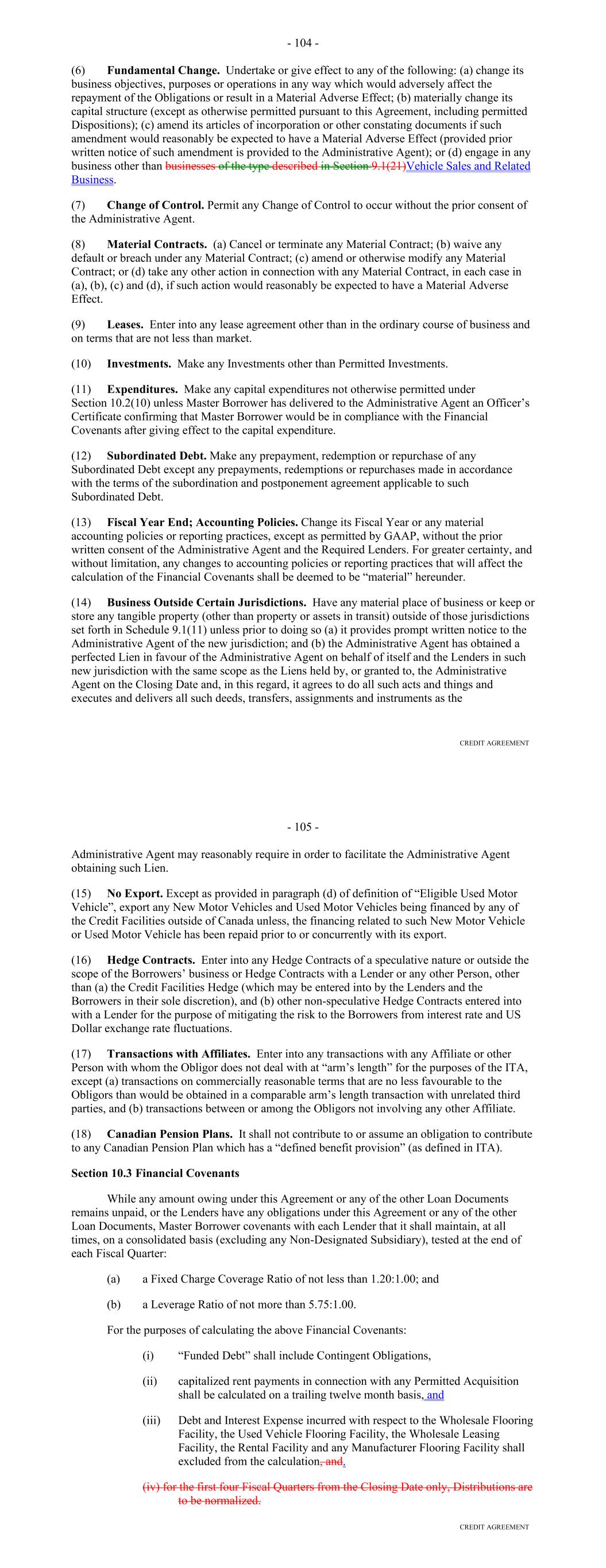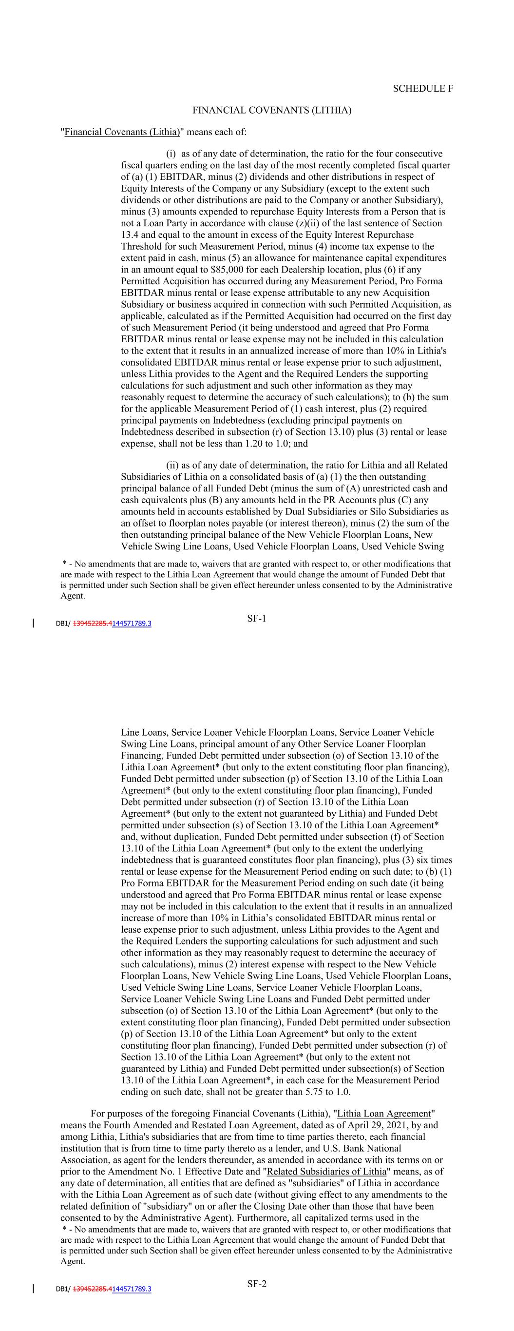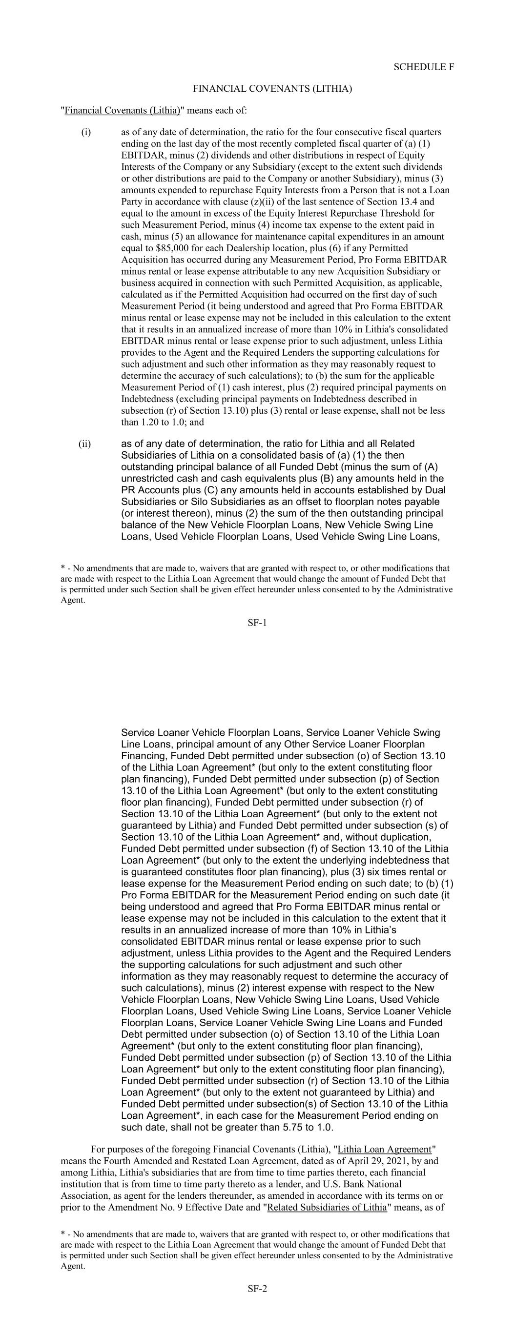 SCHEDULE F FINANCIAL COVENANTS (LITHIA) "Financial Covenants (Lithia)" means each of: (i) as of any date of determination, the ratio for the four consecutive fiscal quarters ending on the last day of the most recently completed fiscal quarter of (a) (1) EBITDAR, minus (2) dividends and other distributions in respect of Equity Interests of the Company or any Subsidiary (except to the extent such dividends or other distributions are paid to the Company or another Subsidiary), minus (3) amounts expended to repurchase Equity Interests from a Person that is not a Loan Party in accordance with clause (z)(ii) of the last sentence of Section 13.4 and equal to the amount in excess of the Equity Interest Repurchase Threshold for such Measurement Period, minus (4) income tax expense to the extent paid in cash, minus (5) an allowance for maintenance capital expenditures in an amount equal to $85,000 for each Dealership location, plus (6) if any Permitted Acquisition has occurred during any Measurement Period, Pro Forma EBITDAR minus rental or lease expense attributable to any new Acquisition Subsidiary or business acquired in connection with such Permitted Acquisition, as applicable, calculated as if the Permitted Acquisition had occurred on the first day of such Measurement Period (it being understood and agreed that Pro Forma EBITDAR minus rental or lease expense may not be included in this calculation to the extent that it results in an annualized increase of more than 10% in Lithia's consolidated EBITDAR minus rental or lease expense prior to such adjustment, unless Lithia provides to the Agent and the Required Lenders the supporting calculations for such adjustment and such other information as they may reasonably request to determine the accuracy of such calculations); to (b) the sum for the applicable Measurement Period of (1) cash interest, plus (2) required principal payments on Indebtedness (excluding principal payments on Indebtedness described in subsection (r) of Section 13.10) plus (3) rental or lease expense, shall not be less than 1.20 to 1.0; and (ii) as of any date of determination, the ratio for Lithia and all Related Subsidiaries of Lithia on a consolidated basis of (a) (1) the then outstanding principal balance of all Funded Debt (minus the sum of (A) unrestricted cash and cash equivalents plus (B) any amounts held in the PR Accounts plus (C) any amounts held in accounts established by Dual Subsidiaries or Silo Subsidiaries as an offset to floorplan notes payable (or interest thereon), minus (2) the sum of the then outstanding principal balance of the New Vehicle Floorplan Loans, New Vehicle Swing Line Loans, Used Vehicle Floorplan Loans, Used Vehicle Swing Line Loans, * - No amendments that are made to, waivers that are granted with respect to, or other modifications that are made with respect to the Lithia Loan Agreement that would change the amount of Funded Debt that is permitted under such Section shall be given effect hereunder unless consented to by the Administrative Agent. SF-1 Service Loaner Vehicle Floorplan Loans, Service Loaner Vehicle Swing Line Loans, principal amount of any Other Service Loaner Floorplan Financing, Funded Debt permitted under subsection (o) of Section 13.10 of the Lithia Loan Agreement* (but only to the extent constituting floor plan financing), Funded Debt permitted under subsection (p) of Section 13.10 of the Lithia Loan Agreement* (but only to the extent constituting floor plan financing), Funded Debt permitted under subsection (r) of Section 13.10 of the Lithia Loan Agreement* (but only to the extent not guaranteed by Lithia) and Funded Debt permitted under subsection (s) of Section 13.10 of the Lithia Loan Agreement* and, without duplication, Funded Debt permitted under subsection (f) of Section 13.10 of the Lithia Loan Agreement* (but only to the extent the underlying indebtedness that is guaranteed constitutes floor plan financing), plus (3) six times rental or lease expense for the Measurement Period ending on such date; to (b) (1) Pro Forma EBITDAR for the Measurement Period ending on such date (it being understood and agreed that Pro Forma EBITDAR minus rental or lease expense may not be included in this calculation to the extent that it results in an annualized increase of more than 10% in Lithia’s consolidated EBITDAR minus rental or lease expense prior to such adjustment, unless Lithia provides to the Agent and the Required Lenders the supporting calculations for such adjustment and such other information as they may reasonably request to determine the accuracy of such calculations), minus (2) interest expense with respect to the New Vehicle Floorplan Loans, New Vehicle Swing Line Loans, Used Vehicle Floorplan Loans, Used Vehicle Swing Line Loans, Service Loaner Vehicle Floorplan Loans, Service Loaner Vehicle Swing Line Loans and Funded Debt permitted under subsection (o) of Section 13.10 of the Lithia Loan Agreement* (but only to the extent constituting floor plan financing), Funded Debt permitted under subsection (p) of Section 13.10 of the Lithia Loan Agreement* but only to the extent constituting floor plan financing), Funded Debt permitted under subsection (r) of Section 13.10 of the Lithia Loan Agreement* (but only to the extent not guaranteed by Lithia) and Funded Debt permitted under subsection(s) of Section 13.10 of the Lithia Loan Agreement*, in each case for the Measurement Period ending on such date, shall not be greater than 5.75 to 1.0. For purposes of the foregoing Financial Covenants (Lithia), "Lithia Loan Agreement" means the Fourth Amended and Restated Loan Agreement, dated as of April 29, 2021, by and among Lithia, Lithia's subsidiaries that are from time to time parties thereto, each financial institution that is from time to time party thereto as a lender, and U.S. Bank National Association, as agent for the lenders thereunder, as amended in accordance with its terms on or prior to the Amendment No. 9 Effective