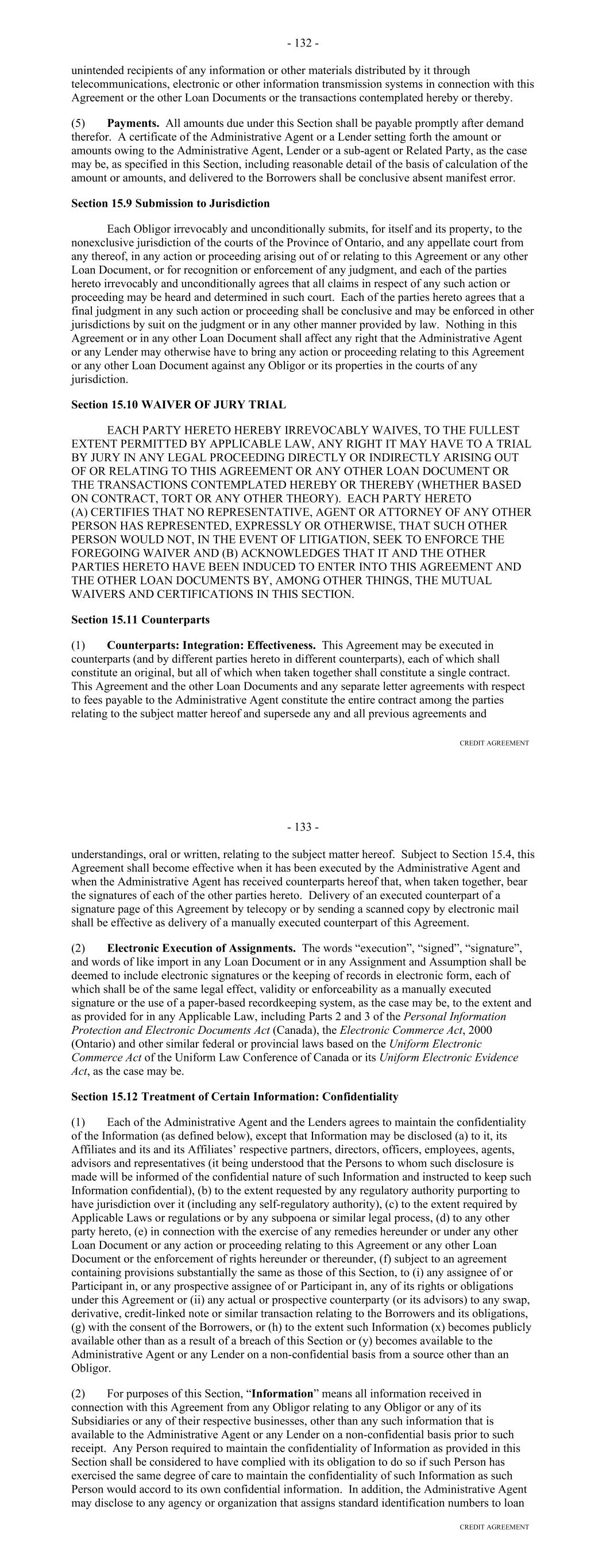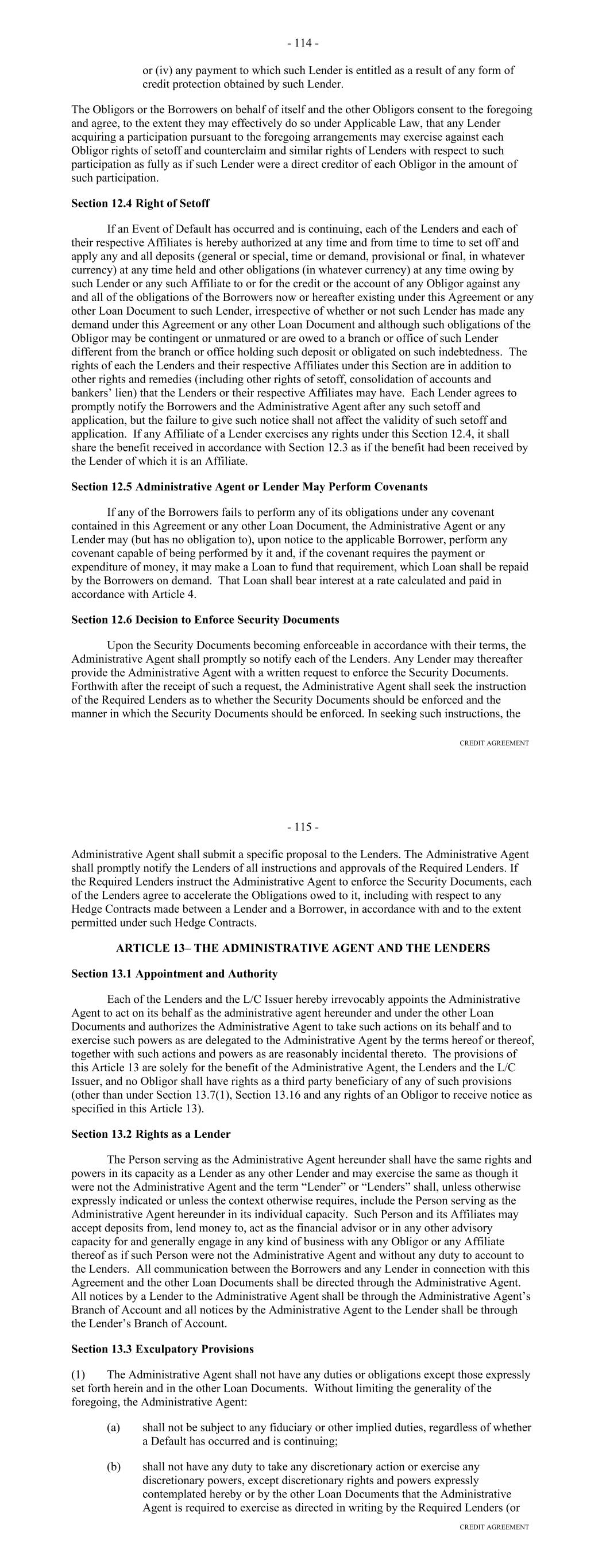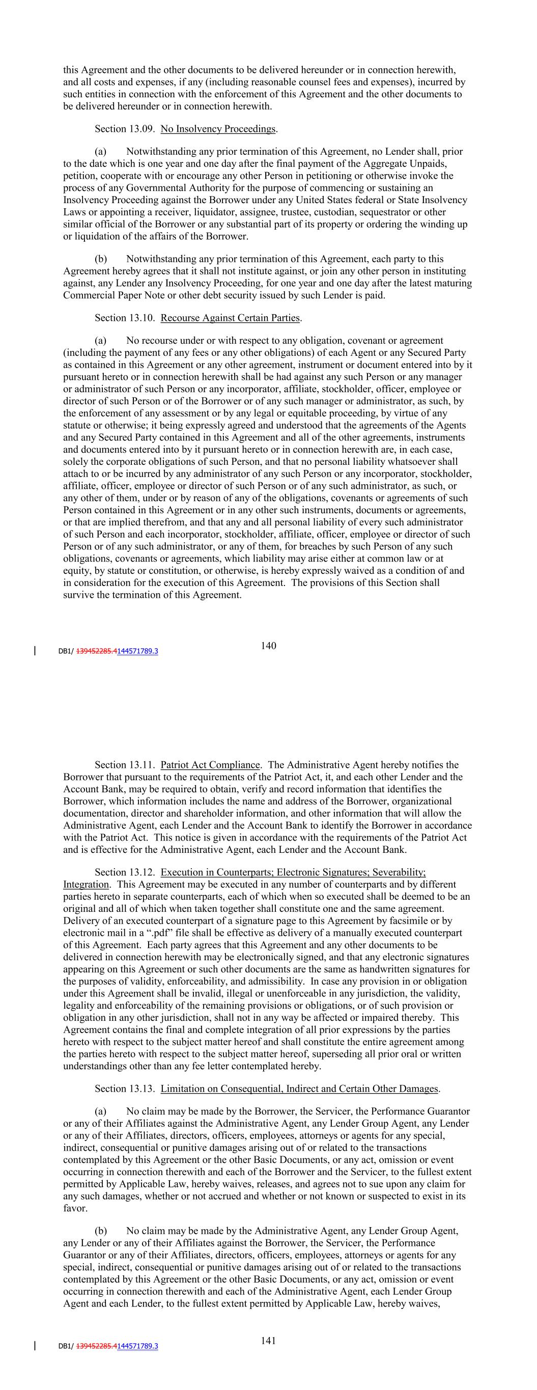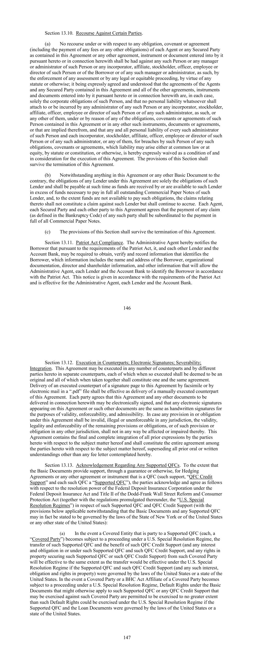 Section 13.10. Recourse Against Certain Parties. (a) No recourse under or with respect to any obligation, covenant or agreement (including the payment of any fees or any other obligations) of each Agent or any Secured Party as contained in this Agreement or any other agreement, instrument or document entered into by it pursuant hereto or in connection herewith shall be had against any such Person or any manager or administrator of such Person or any incorporator, affiliate, stockholder, officer, employee or director of such Person or of the Borrower or of any such manager or administrator, as such, by the enforcement of any assessment or by any legal or equitable proceeding, by virtue of any statute or otherwise; it being expressly agreed and understood that the agreements of the Agents and any Secured Party contained in this Agreement and all of the other agreements, instruments and documents entered into by it pursuant hereto or in connection herewith are, in each case, solely the corporate obligations of such Person, and that no personal liability whatsoever shall attach to or be incurred by any administrator of any such Person or any incorporator, stockholder, affiliate, officer, employee or director of such Person or of any such administrator, as such, or any other of them, under or by reason of any of the obligations, covenants or agreements of such Person contained in this Agreement or in any other such instruments, documents or agreements, or that are implied therefrom, and that any and all personal liability of every such administrator of such Person and each incorporator, stockholder, affiliate, officer, employee or director of such Person or of any such administrator, or any of them, for breaches by such Person of any such obligations, covenants or agreements, which liability may arise either at common law or at equity, by statute or constitution, or otherwise, is hereby expressly waived as a condition of and in consideration for the execution of this Agreement. The provisions of this Section shall survive the termination of this Agreement. (b) Notwithstanding anything in this Agreement or any other Basic Document to the contrary, the obligations of any Lender under this Agreement are solely the obligations of such Lender and shall be payable at such time as funds are received by or are available to such Lender in excess of funds necessary to pay in full all outstanding Commercial Paper Notes of such Lender, and, to the extent funds are not available to pay such obligations, the claims relating thereto shall not constitute a claim against such Lender but shall continue to accrue. Each Agent, each Secured Party and each other party to this Agreement agrees that the payment of any claim (as defined in the Bankruptcy Code) of any such party shall be subordinated to the payment in full of all Commercial Paper Notes. (c) The provisions of this Section shall survive the termination of this Agreement. Section 13.11. Patriot Act Compliance. The Administrative Agent hereby notifies the Borrower that pursuant to the requirements of the Patriot Act, it, and each other Lender and the Account Bank, may be required to obtain, verify and record information that identifies the Borrower, which information includes the name and address of the Borrower, organizational documentation, director and shareholder information, and other information that will allow the Administrative Agent, each Lender and the Account Bank to identify the Borrower in accordance with the Patriot Act. This notice is given in accordance with the requirements of the Patriot Act and is effective for the Administrative Agent, each Lender and the Account Bank. 146 Section 13.12. Execution in Counterparts; Electronic Signatures; Severability; Integration. This Agreement may be executed in any number of counterparts and by different parties hereto in separate counterparts, each of which when so executed shall be deemed to be an original and all of which when taken together shall constitute one and the same agreement. Delivery of an executed counterpart of a signature page to this Agreement by facsimile or by electronic mail in a “.pdf” file shall be effective as delivery of a manually executed counterpart of this Agreement. Each party agrees that this Agreement and any other documents to be delivered in connection herewith may be electronically signed, and that any electronic signatures appearing on this Agreement or such other documents are the same as handwritten signatures for the purposes of validity, enforceability, and admissibility. In case any provision in or obligation under this Agreement shall be invalid, illegal or unenforceable in any jurisdiction, the validity, legality and enforceability of the remaining provisions or obligations, or of such provision or obligation in any other jurisdiction, shall not in any way be affected or impaired thereby. This Agreement contains the final and complete integration of all prior expressions by the parties hereto with respect to the subject matter hereof and shall constitute the entire agreement among the parties hereto with respect to the subject matter hereof, superseding all prior oral or written understandings other than any fee letter contemplated hereby. Section 13.13. Acknowledgement Regarding Any Supported QFCs. To the extent that the Basic Documents provide support, through a guarantee or otherwise, for Hedging Agreements or any other agreement or instrument that is a QFC (such support, “QFC Credit Support” and each such QFC a “Supported QFC”), the parties acknowledge and agree as follows with respect to the resolution power of the Federal Deposit Insurance Corporation under the Federal Deposit Insurance Act and Title II of the Dodd-Frank Wall Street Reform and Consumer Protection Act (together with the regulations promulgated thereunder, the “U.S. Special Resolution Regimes”) in respect of such Supported QFC and QFC Credit Support (with the provisions b