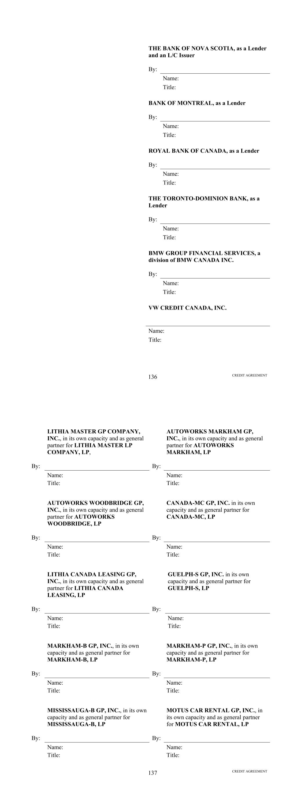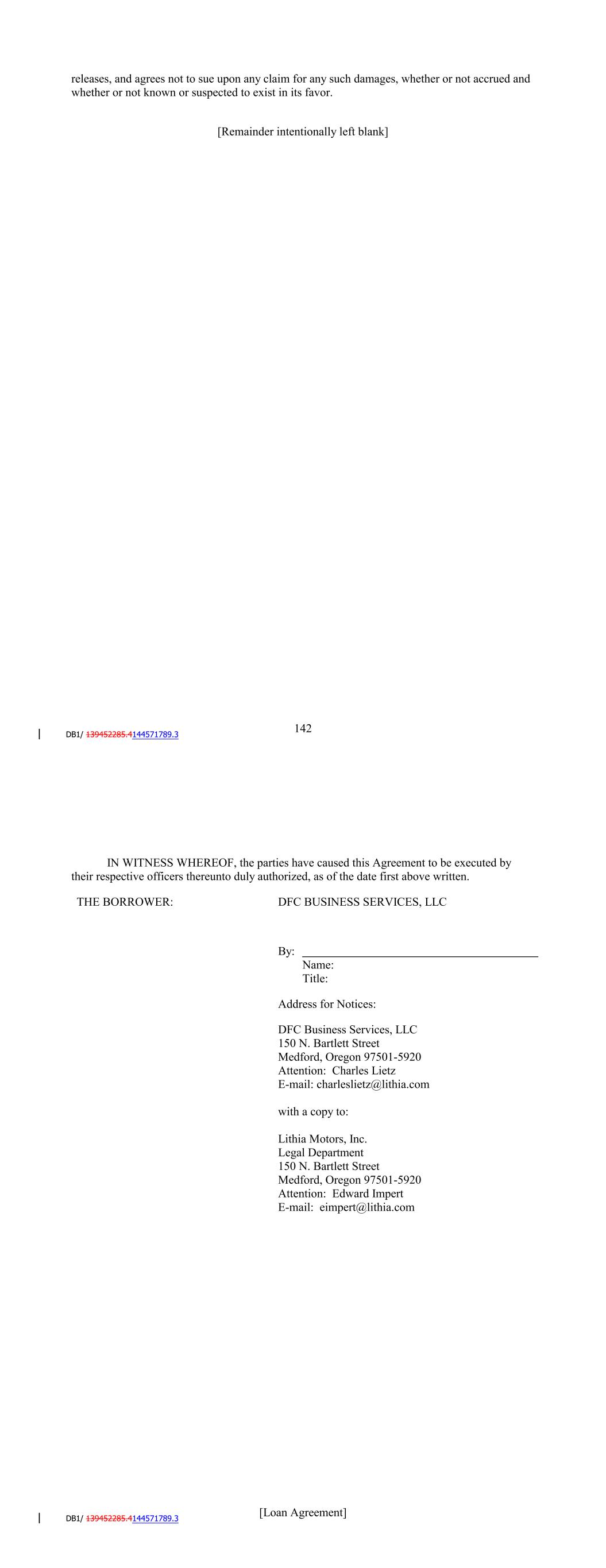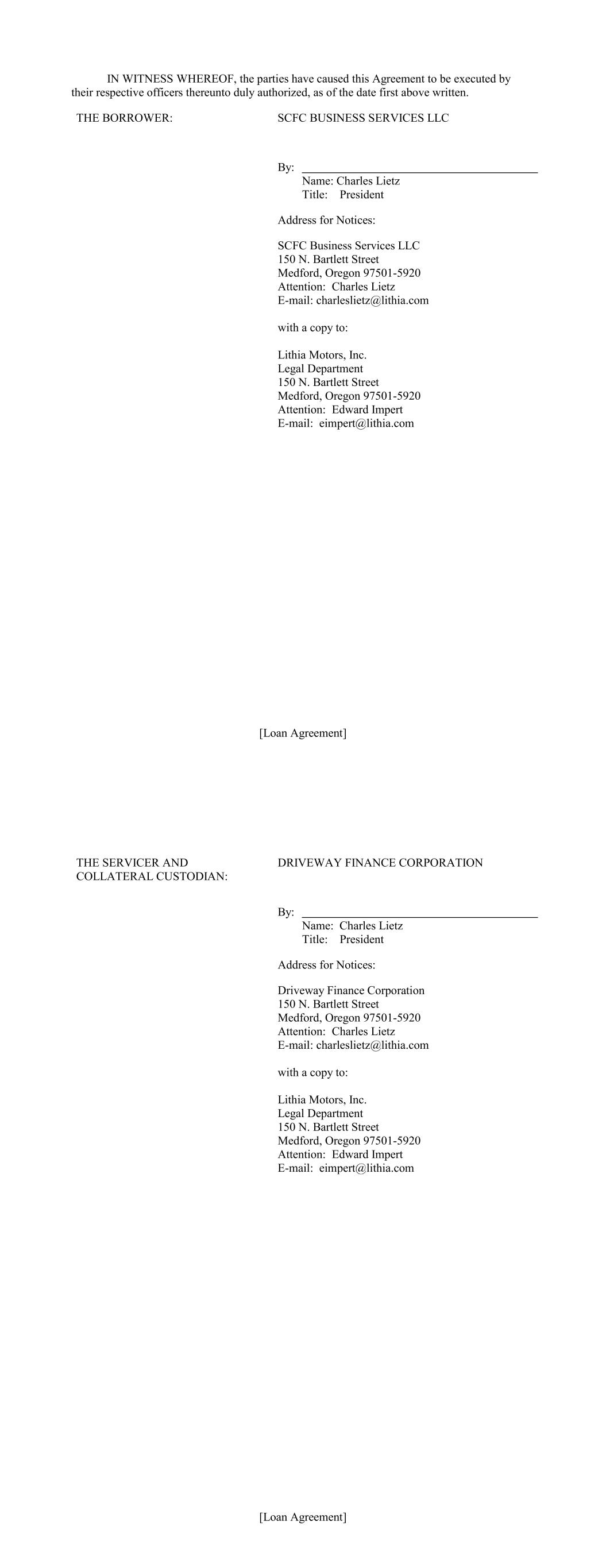 [Loan Agreement] THE BORROWER: SCFC BUSINESS SERVICES LLC By: Name: Charles Lietz Title: President Address for Notices: SCFC Business Services LLC 150 N. Bartlett Street Medford, Oregon 97501-5920 Attention: Charles Lietz E-mail: charleslietz@lithia.com with a copy to: Lithia Motors, Inc. Legal Department 150 N. Bartlett Street Medford, Oregon 97501-5920 Attention: Edward Impert E-mail: eimpert@lithia.com IN WITNESS WHEREOF, the parties have caused this Agreement to be executed by their respective officers thereunto duly authorized, as of the date first above written. [Loan Agreement] THE SERVICER AND COLLATERAL CUSTODIAN: DRIVEWAY FINANCE CORPORATION By: Name: Charles Lietz Title: President Address for Notices: Driveway Finance Corporation 150 N. Bartlett Street Medford, Oregon 97501-5920 Attention: Charles Lietz E-mail: charleslietz@lithia.com with a copy to: Lithia Motors, Inc. Legal Department 150 N. Bartlett Street Medford, Oregon 97501-5920 Attention: Edward Impert E-mail: eimpert@lithia.com