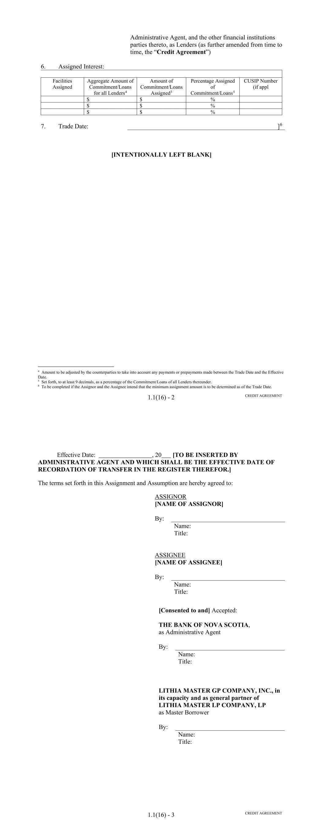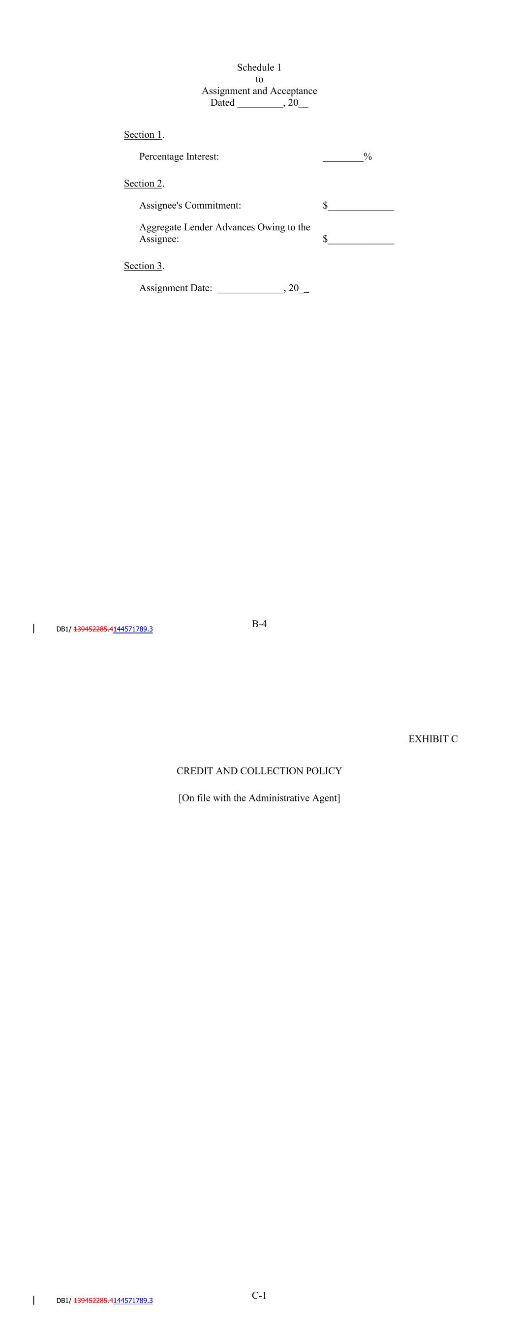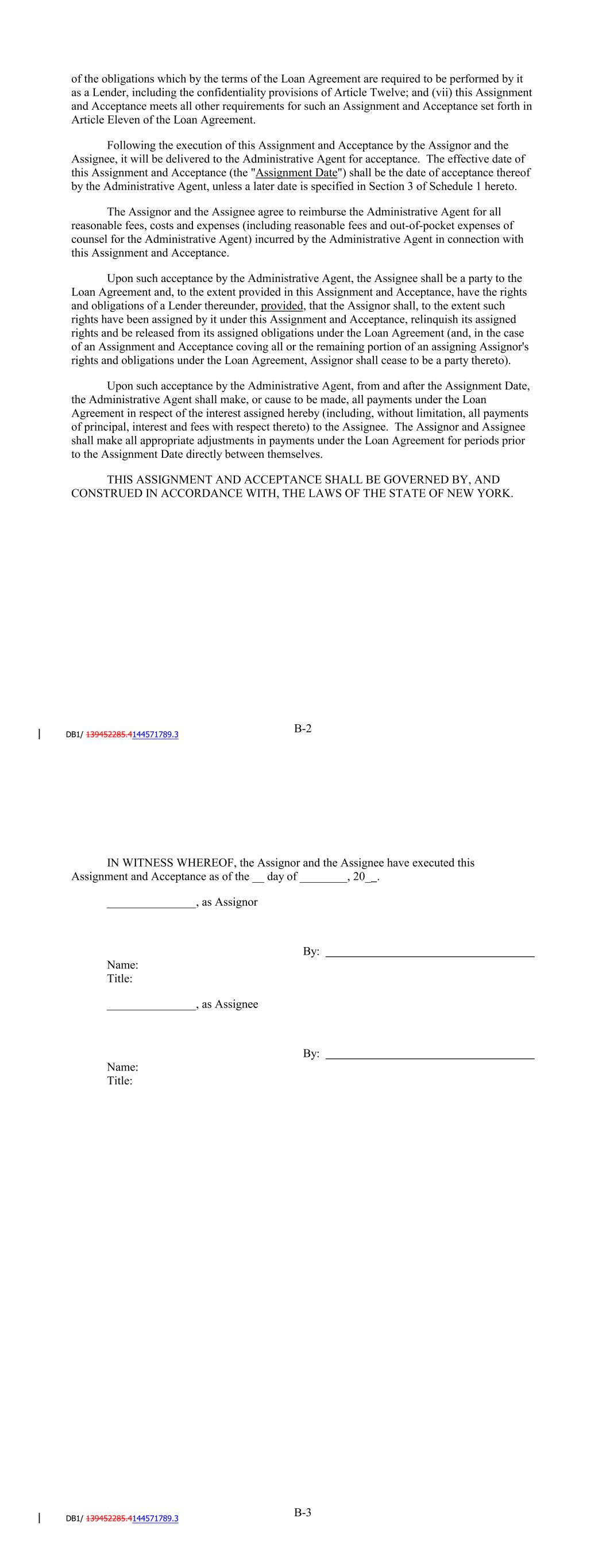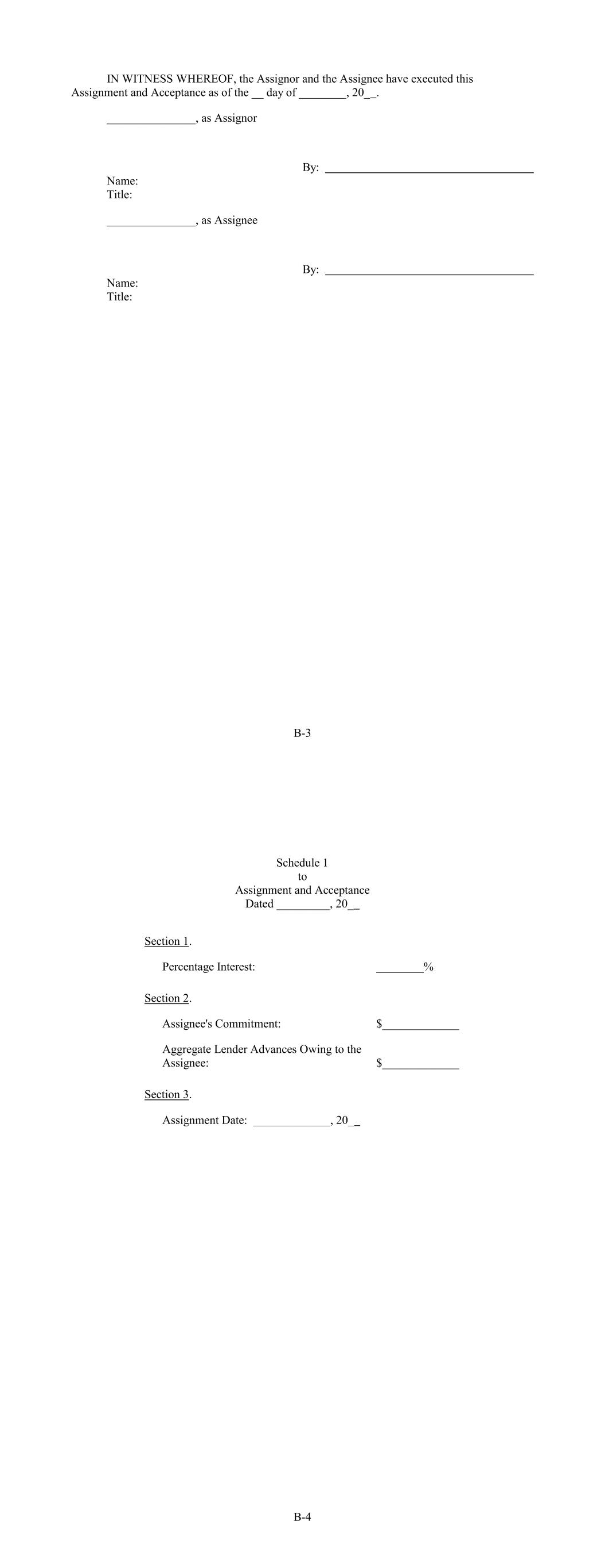 IN WITNESS WHEREOF, the Assignor and the Assignee have executed this Assignment and Acceptance as of the __ day of ________, 20_ . _______________, as Assignor By: Name: Title: _______________, as Assignee By: Name: Title: B-3 B-4 Assignee's Commitment: $_____________ Percentage Interest: Aggregate Lender Advances Owing to the Assignee: ________% $_____________ Section 1. Section 3. Section 2. Assignment Date: _____________, 20_ Schedule 1 to Assignment and Acceptance Dated _________, 20_