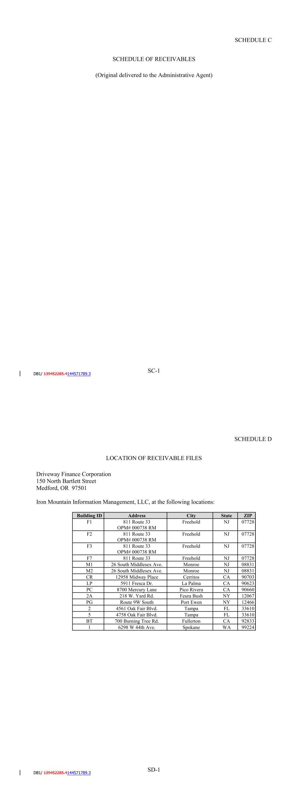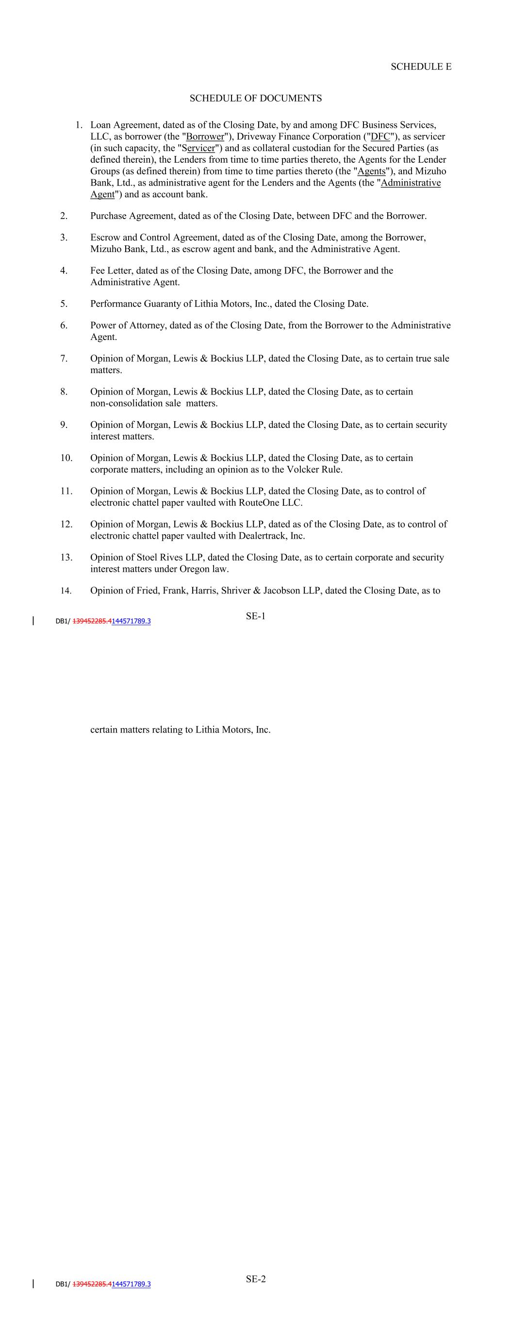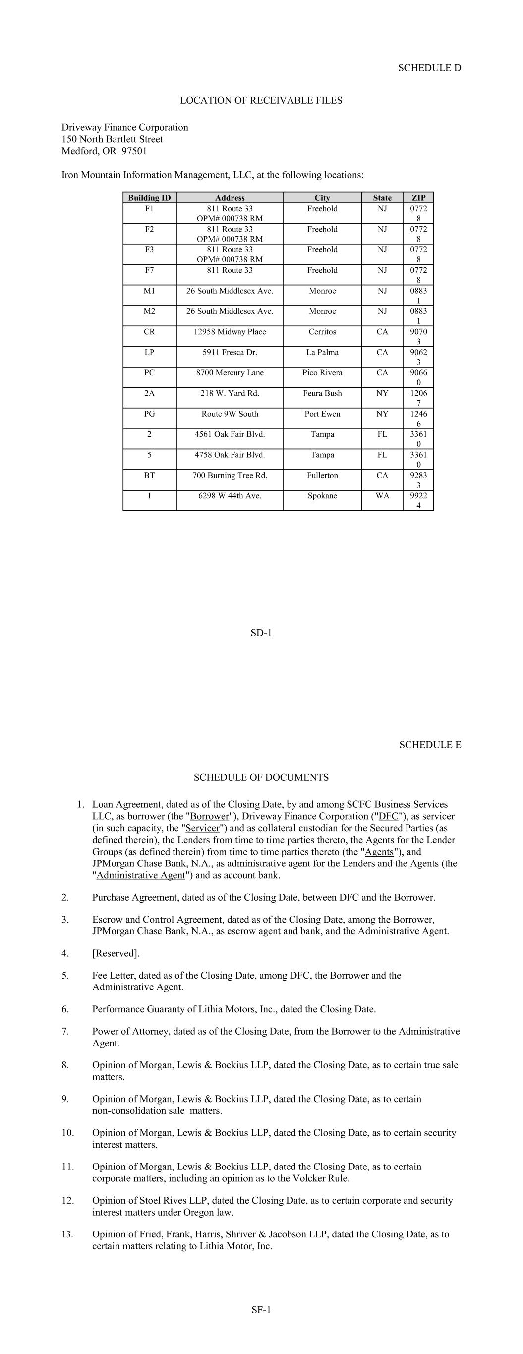 SD-1 9070 3 NJ City LP 0772 8 5911 Fresca Dr. NJ La Palma CA 9062 3 F7 0772 8 PC 811 Route 33 8700 Mercury Lane State Pico Rivera Freehold CA 9066 0 NJ 2A 0772 8 218 W. Yard Rd. F2 Feura Bush NY ZIP 1206 7 M1 811 Route 33 OPM# 000738 RM PG 26 South Middlesex Ave. Route 9W South Building ID Port Ewen Monroe NY Freehold 1246 6 NJ 2 0883 1 4561 Oak Fair Blvd. NJ Tampa FL 3361 0 M2 0772 8 5 26 South Middlesex Ave. 4758 Oak Fair Blvd. F1 Tampa Monroe FL 3361 0 NJ Address BT 0883 1 700 Burning Tree Rd. F3 Fullerton CA 811 Route 33 OPM# 000738 RM 9283 3 CR 811 Route 33 OPM# 000738 RM 1 12958 Midway Place 6298 W 44th Ave. SCHEDULE D LOCATION OF RECEIVABLE FILES Driveway Finance Corporation 150 North Bartlett Street Medford, OR 97501 Iron Mountain Information Management, LLC, at the following locations: Spokane Cerritos WA Freehold 9922 4 CA Freehold SCHEDULE E SCHEDULE OF DOCUMENTS 1. Loan Agreement, dated as of the Closing Date, by and among SCFC Business Services LLC, as borrower (the "Borrower"), Driveway Finance Corporation ("DFC"), as servicer (in such capacity, the "Servicer") and as collateral custodian for the Secured Parties (as defined therein), the Lenders from time to time parties thereto, the Agents for the Lender Groups (as defined therein) from time to time parties thereto (the "Agents"), and JPMorgan Chase Bank, N.A., as administrative agent for the Lenders and the Agents (the "Administrative Agent") and as account bank. 2. Purchase Agreement, dated as of the Closing Date, between DFC and the Borrower. 3. Escrow and Control Agreement, dated as of the Closing Date, among the Borrower, JPMorgan Chase Bank, N.A., as escrow agent and bank, and the Administrative Agent. 4. [Reserved]. 5. Fee Letter, dated as of the Closing Date, among DFC, the Borrower and the Administrative Agent. 6. Performance Guaranty of Lithia Motors, Inc., dated the Closing Date. 7. Power of Attorney, dated as of the Closing Date, from the Borrower to the Administrative Agent. 8. Opinion of Morgan, Lewis & Bockius LLP, dated the Closing Date, as to certain true sale matters. 9. Opinion of Morgan, Lewis & Bockius LLP, dated the Closing Date, as to certain non-consolidation sale matters. 10. Opinion of Morgan, Lewis & Bockius LLP, dated the Closing Date, as to certain security interest matters. 11. Opinion of Morgan, Lewis & Bockius LLP, dated the Closing Date, as to certain corporate matters, including an opinion as to the Volcker Rule. 12. Opinion of Stoel Rives LLP, dated the Closing Date, as to certain corporate and security interest matters under Oregon law. 13. Opinion of Fried, Frank, Harris, Shriver & Jacobson LLP, dated the Closing Date, as to certain matters relating to Lithia Motor, Inc. SF-1