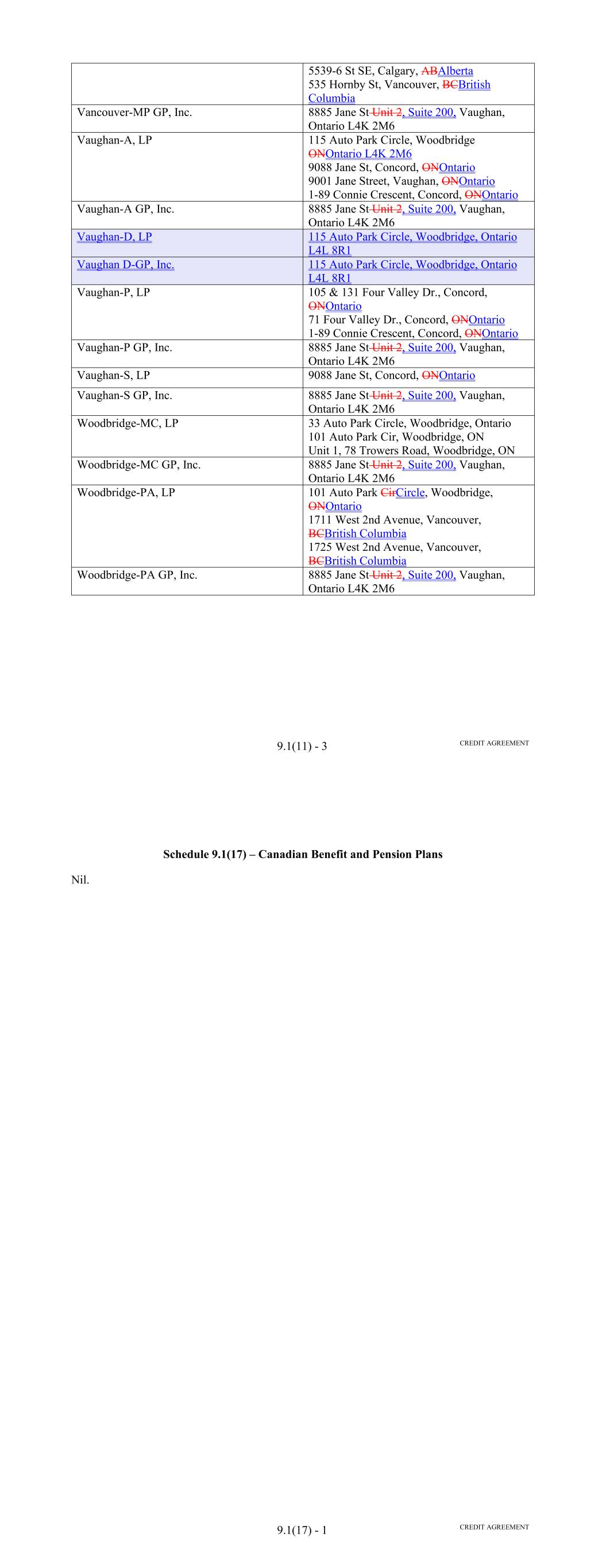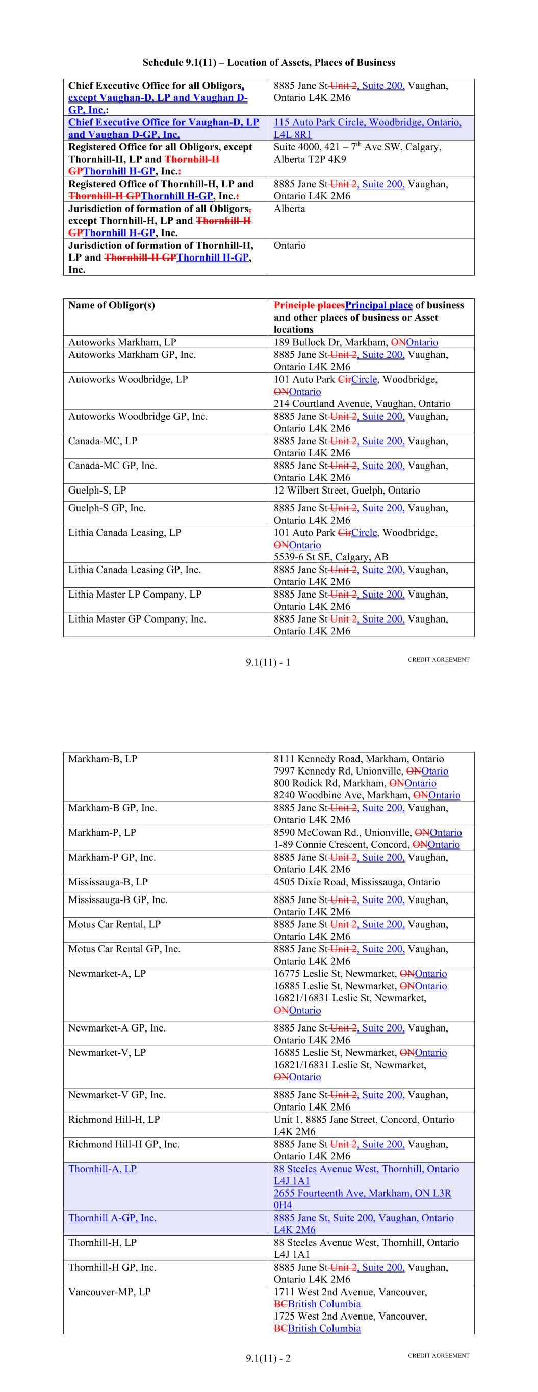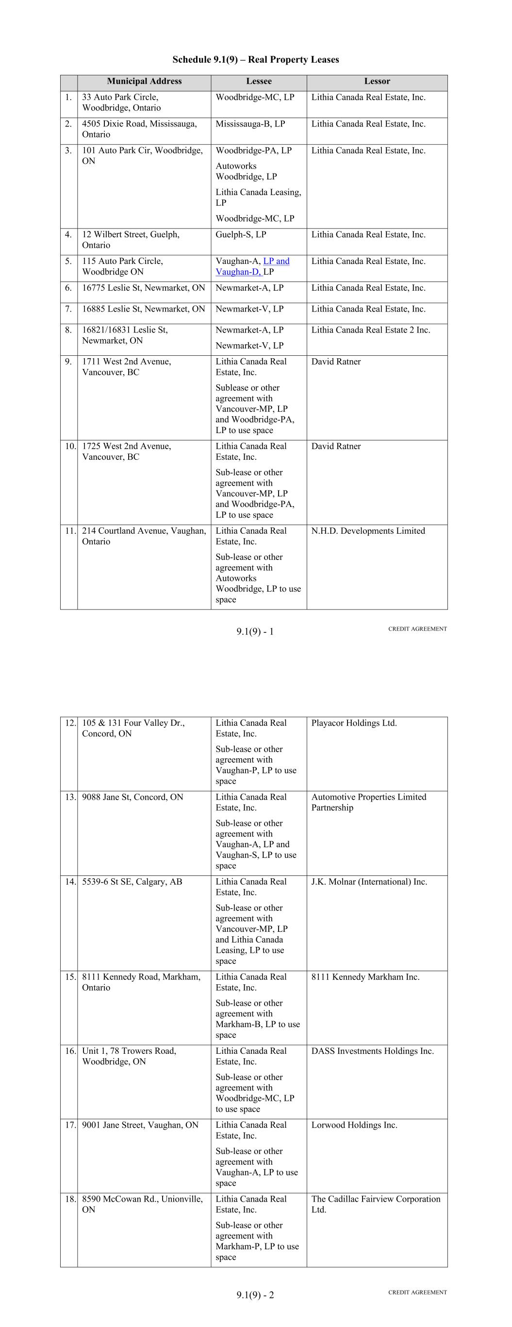 SD-1 9070 3 NJ City LP 0772 8 5911 Fresca Dr. NJ La Palma CA 9062 3 F7 0772 8 PC 811 Route 33 8700 Mercury Lane State Pico Rivera Freehold CA 9066 0 NJ 2A 0772 8 218 W. Yard Rd. F2 Feura Bush NY ZIP 1206 7 M1 811 Route 33 OPM# 000738 RM PG 26 South Middlesex Ave. Route 9W South Building ID Port Ewen Monroe NY Freehold 1246 6 NJ 2 0883 1 4561 Oak Fair Blvd. NJ Tampa FL 3361 0 M2 0772 8 5 26 South Middlesex Ave. 4758 Oak Fair Blvd. F1 Tampa Monroe FL 3361 0 NJ Address BT 0883 1 700 Burning Tree Rd. F3 Fullerton CA 811 Route 33 OPM# 000738 RM 9283 3 CR 811 Route 33 OPM# 000738 RM 1 12958 Midway Place 6298 W 44th Ave. SCHEDULE D LOCATION OF RECEIVABLE FILES Driveway Finance Corporation 150 North Bartlett Street Medford, OR 97501 Iron Mountain Information Management, LLC, at the following locations: Spokane Cerritos WA Freehold 9922 4 CA Freehold SCHEDULE E SCHEDULE OF DOCUMENTS 1. Loan Agreement, dated as of the Closing Date, by and among SCFC Business Services LLC, as borrower (the "Borrower"), Driveway Finance Corporation ("DFC"), as servicer (in such capacity, the "Servicer") and as collateral custodian for the Secured Parties (as defined therein), the Lenders from time to time parties thereto, the Agents for the Lender Groups (as defined therein) from time to time parties thereto (the "Agents"), and JPMorgan Chase Bank, N.A., as administrative agent for the Lenders and the Agents (the "Administrative Agent") and as account bank. 2. Purchase Agreement, dated as of the Closing Date, between DFC and the Borrower. 3. Escrow and Control Agreement, dated as of the Closing Date, among the Borrower, JPMorgan Chase Bank, N.A., as escrow agent and bank, and the Administrative Agent. 4. [Reserved]. 5. Fee Letter, dated as of the Closing Date, among DFC, the Borrower and the Administrative Agent. 6. Performance Guaranty of Lithia Motors, Inc., dated the Closing Date. 7. Power of Attorney, dated as of the Closing Date, from the Borrower to the Administrative Agent. 8. Opinion of Morgan, Lewis & Bockius LLP, dated the Closing Date, as to certain true sale matters. 9. Opinion of Morgan, Lewis & Bockius LLP, dated the Closing Date, as to certain non-consolidation sale matters. 10. Opinion of Morgan, Lewis & Bockius LLP, dated the Closing Date, as to certain security interest matters. 11. Opinion of Morgan, Lewis & Bockius LLP, dated the Closing Date, as to certain corporate matters, including an opinion as to the Volcker Rule. 12. Opinion of Stoel Rives LLP, dated the Closing Date, as to certain corporate and security interest matters under Oregon law. 13. Opinion of Fried, Frank, Harris, Shriver & Jacobson LLP, dated the Closing Date, as to certain matters relating to Lithia Motor, Inc. SF-1