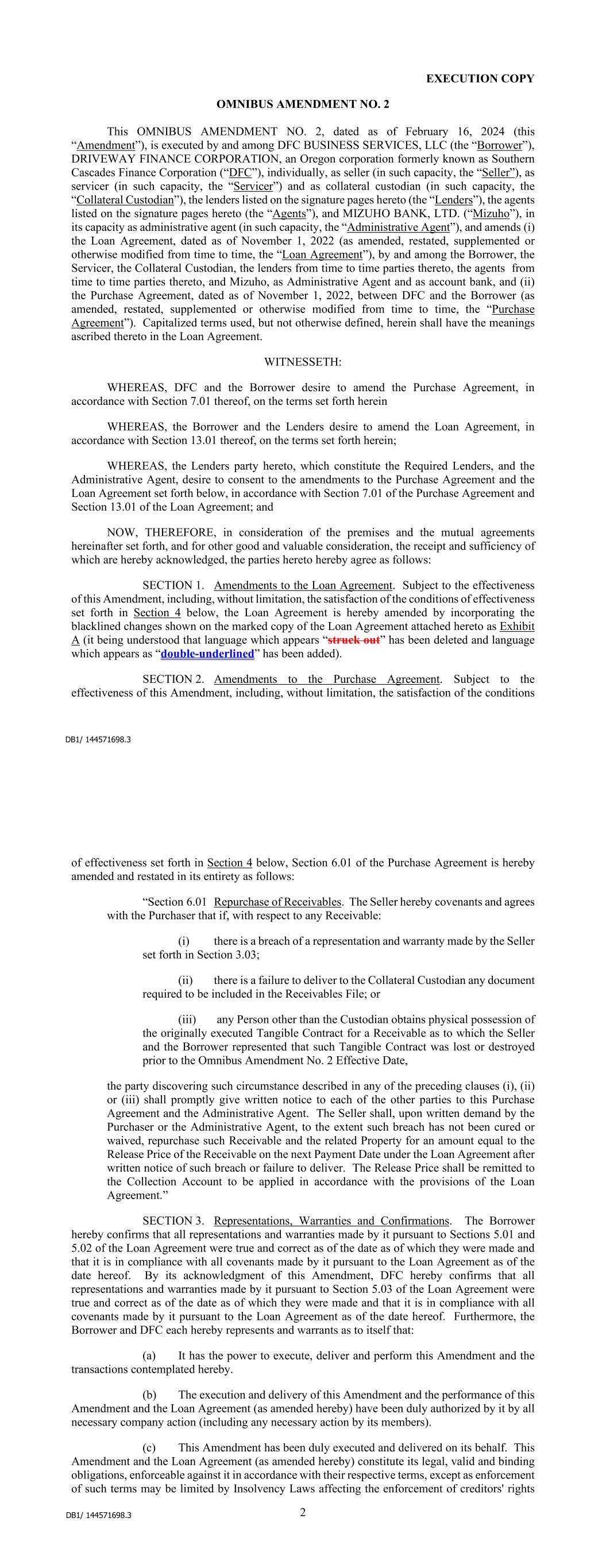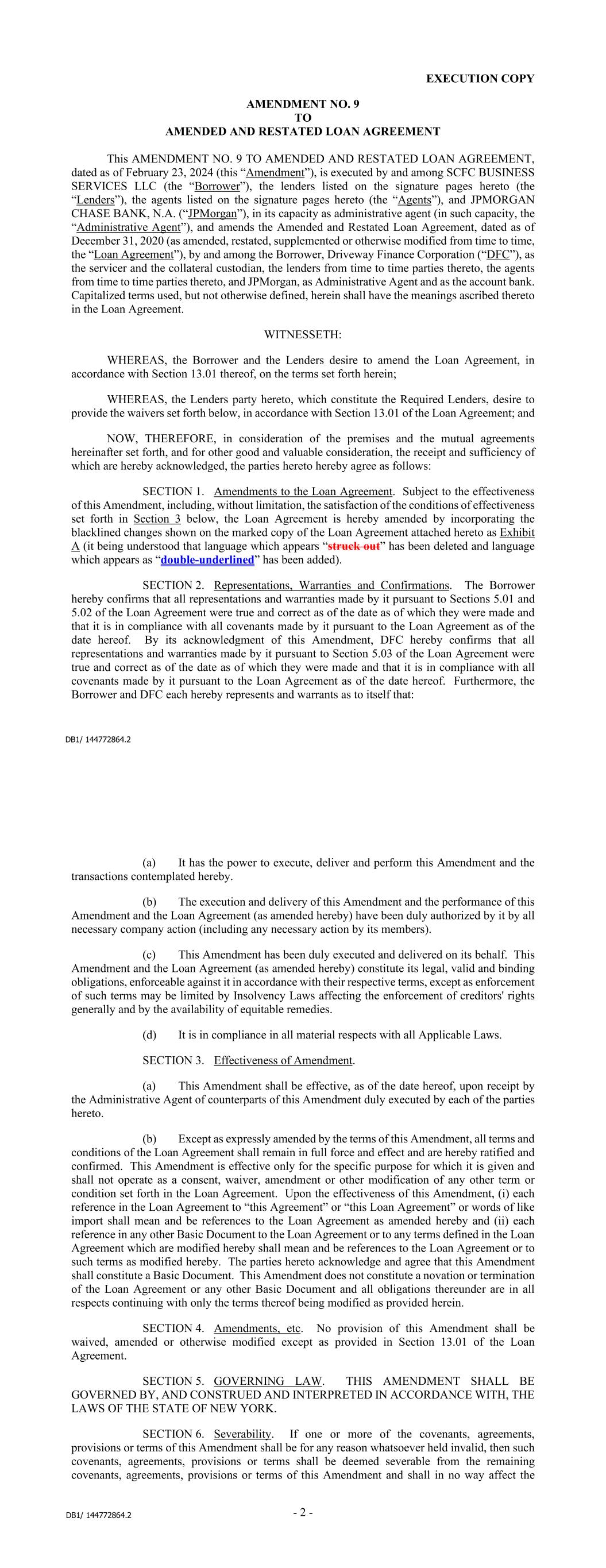 DB1/ 144772864.2 EXECUTION COPY AMENDMENT NO. 9 TO AMENDED AND RESTATED LOAN AGREEMENT This AMENDMENT NO. 9 TO AMENDED AND RESTATED LOAN AGREEMENT, dated as of February 23, 2024 (this “Amendment”), is executed by and among SCFC BUSINESS SERVICES LLC (the “Borrower”), the lenders listed on the signature pages hereto (the “Lenders”), the agents listed on the signature pages hereto (the “Agents”), and JPMORGAN CHASE BANK, N.A. (“JPMorgan”), in its capacity as administrative agent (in such capacity, the “Administrative Agent”), and amends the Amended and Restated Loan Agreement, dated as of December 31, 2020 (as amended, restated, supplemented or otherwise modified from time to time, the “Loan Agreement”), by and among the Borrower, Driveway Finance Corporation (“DFC”), as the servicer and the collateral custodian, the lenders from time to time parties thereto, the agents from time to time parties thereto, and JPMorgan, as Administrative Agent and as the account bank. Capitalized terms used, but not otherwise defined, herein shall have the meanings ascribed thereto in the Loan Agreement. WITNESSETH: WHEREAS, the Borrower and the Lenders desire to amend the Loan Agreement, in accordance with Section 13.01 thereof, on the terms set forth herein; WHEREAS, the Lenders party hereto, which constitute the Required Lenders, desire to provide the waivers set forth below, in accordance with Section 13.01 of the Loan Agreement; and NOW, THEREFORE, in consideration of the premises and the mutual agreements hereinafter set forth, and for other good and valuable consideration, the receipt and sufficiency of which are hereby acknowledged, the parties hereto hereby agree as follows: SECTION 1. Amendments to the Loan Agreement. Subject to the effectiveness of this Amendment, including, without limitation, the satisfaction of the conditions of effectiveness set forth in Section 3 below, the Loan Agreement is hereby amended by incorporating the blacklined changes shown on the marked copy of the Loan Agreement attached hereto as Exhibit A (it being understood that language which appears “struck out” has been deleted and language which appears as “double-underlined” has been added). SECTION 2. Representations, Warranties and Confirmations. The Borrower hereby confirms that all representations and warranties made by it pursuant to Sections 5.01 and 5.02 of the Loan Agreement were true and correct as of the date as of which they were made and that it is in compliance with all covenants made by it pursuant to the Loan Agreement as of the date hereof. By its acknowledgment of this Amendment, DFC hereby confirms that all representations and warranties made by it pursuant to Section 5.03 of the Loan Agreement were true and correct as of the date as of which they were made and that it is in compliance with all covenants made by it pursuant to the Loan Agreement as of the date hereof. Furthermore, the Borrower and DFC each hereby represents and warrants as to itself that: DB1/ 144772864.2 - 2 - (a) It has the power to execute, deliver and perform this Amendment and the transactions contemplated hereby. (b) The execution and delivery of this Amendment and the performance of this Amendment and the Loan Agreement (as amended hereby) have been duly authorized by it by all necessary company action (including any necessary action by its members). (c) This Amendment has been duly executed and delivered on its behalf. This Amendment and the Loan Agreement (as amended hereby) constitute its legal, valid and binding obligations, enforceable against it in accordance with their respective terms, except as enforcement of such terms may be limited by Insolvency Laws affecting the enforcement of creditors' rights generally and by the availability of equitable remedies. (d) It is in compliance in all material respects with all Applicable Laws. SECTION 3. Effectiveness of Amendment. (a) This Amendment shall be effective, as of the date hereof, upon receipt by the Administrative Agent of counterparts of this Amendment duly executed by each of the parties hereto. (b) Except as expressly amended by the terms of this Amendment, all terms and conditions of the Loan Agreement shall remain in full force and effect and are hereby ratified and confirmed. This Amendment is effective only for the specific purpose for which it is given and shall not operate as a consent, waiver, amendment or other modification of any other term or condition set forth in the Loan Agreement. Upon the effectiveness of this Amendment, (i) each reference in the Loan Agreement to “this Agreement” or “this Loan Agreement” or words of like import shall mean and be references to the Loan Agreement as amended hereby and (ii) each reference in any other Basic Document to the Loan Agreement or to any terms defined in the Loan Agreement which are modified hereby shall mean and be references to the Loan Agreement or to such terms as modified hereby. The parties hereto acknowledge and agree that this Amendment shall constitute a Basic Document. This Amendment does not constitute a novation or termination of the Loan Agreement or any other Basic Document and all obligations thereunder are in all respects continuing with only the terms thereof being modified as provided herein. SECTION 4. Amendments, etc. No provision of this Amendment shall be waived, amended or otherwise modified except as provided in Section 13.01 of the Loan Agreement. SECTION 5. GOVERNING LAW. THIS AMENDMENT SHALL BE GOVERNED BY, AND CONSTRUED AND INTERPRETED IN ACCORDANCE WITH, THE LAWS OF THE STATE OF NEW YORK. SECTION 6. Severability. If one or more of the covenants, agreements, provisions or terms of this Amendment shall be for any reason whatsoever held invalid, then such covenants, agreements, provisions or terms shall be deemed severable from the remaining covenants, agreements, provisions or terms of this Amendment and shall in no way affect the