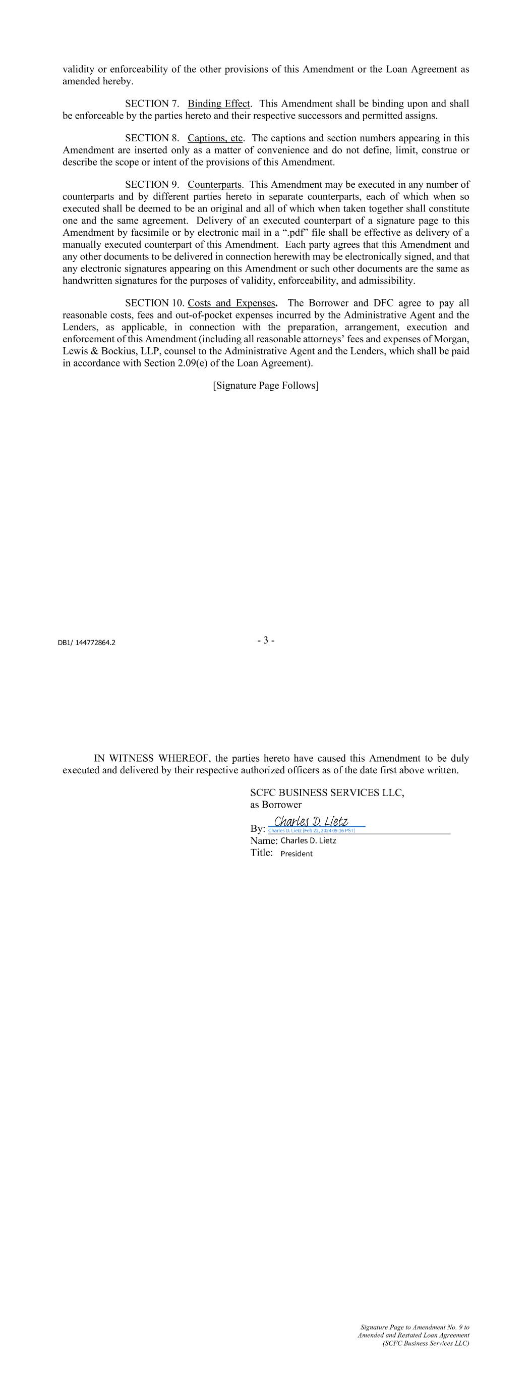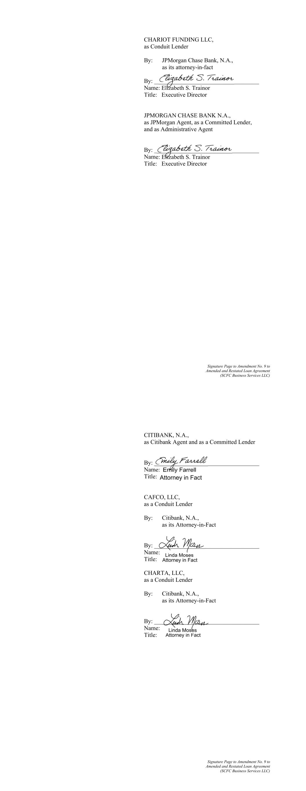 Signature Page to Amendment No. 9 to Amended and Restated Loan Agreement (SCFC Business Services LLC) CHARIOT FUNDING LLC, as Conduit Lender By: JPMorgan Chase Bank, N.A., as its attorney-in-fact By: ___________________________________ Name: Elizabeth S. Trainor Title: Executive Director JPMORGAN CHASE BANK N.A., as JPMorgan Agent, as a Committed Lender, and as Administrative Agent By: ___________________________________ Name: Elizabeth S. Trainor Title: Executive Director Signature Page to Amendment No. 9 to Amended and Restated Loan Agreement (SCFC Business Services LLC) CITIBANK, N.A., as Citibank Agent and as a Committed Lender By: ___________________________________ Name: Title: CAFCO, LLC, as a Conduit Lender By: Citibank, N.A., as its Attorney-in-Fact By: ___________________________________ Name: Title: CHARTA, LLC, as a Conduit Lender By: Citibank, N.A., as its Attorney-in-Fact By: ___________________________________ Name: Title: Linda Moses Attorney in Fact Linda Moses Attorney in Fact Emily Farrell Attorney in Fact