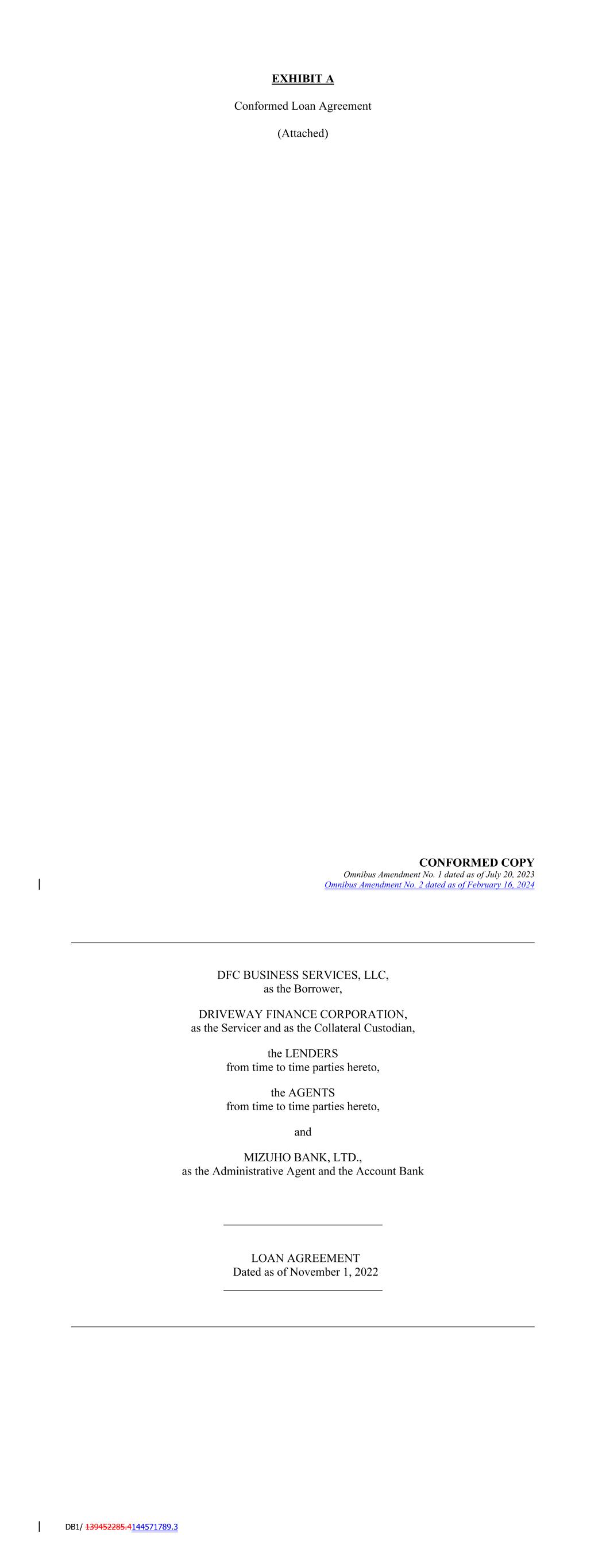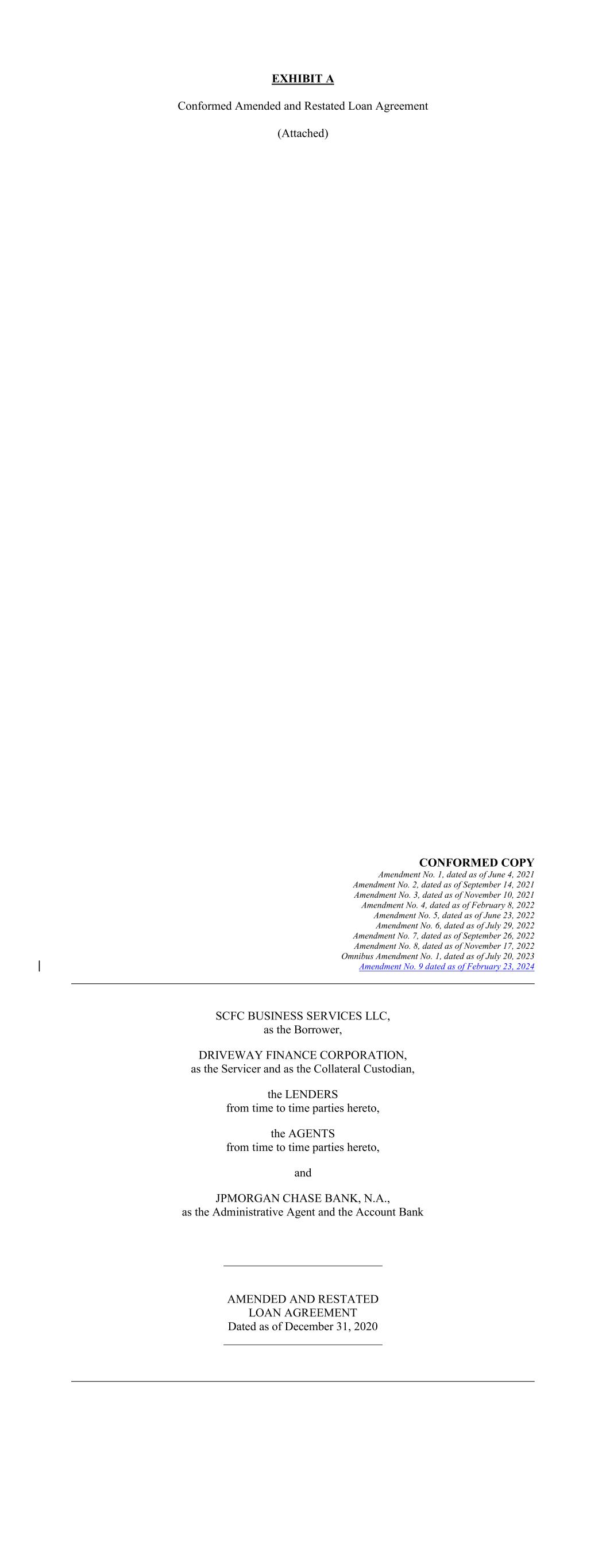 EXHIBIT A Conformed Amended and Restated Loan Agreement (Attached) AMENDED AND RESTATED LOAN AGREEMENT CONFORMED COPY Amendment No. 1, dated as of June 4, 2021 Amendment No. 2, dated as of September 14, 2021 Amendment No. 3, dated as of November 10, 2021 Amendment No. 4, dated as of February 8, 2022 Amendment No. 5, dated as of June 23, 2022 Amendment No. 6, dated as of July 29, 2022 Amendment No. 7, dated as of September 26, 2022 Amendment No. 8, dated as of November 17, 2022 Omnibus Amendment No. 1, dated as of July 20, 2023 Amendment No. 9 dated as of February 23, 2024 SCFC BUSINESS SERVICES LLC, as the Borrower, DRIVEWAY FINANCE CORPORATION, as the Servicer and as the Collateral Custodian, the LENDERS from time to time parties hereto, the AGENTS from time to time parties hereto, and JPMORGAN CHASE BANK, N.A., as the Administrative Agent and the Account Bank Dated as of December 31, 2020