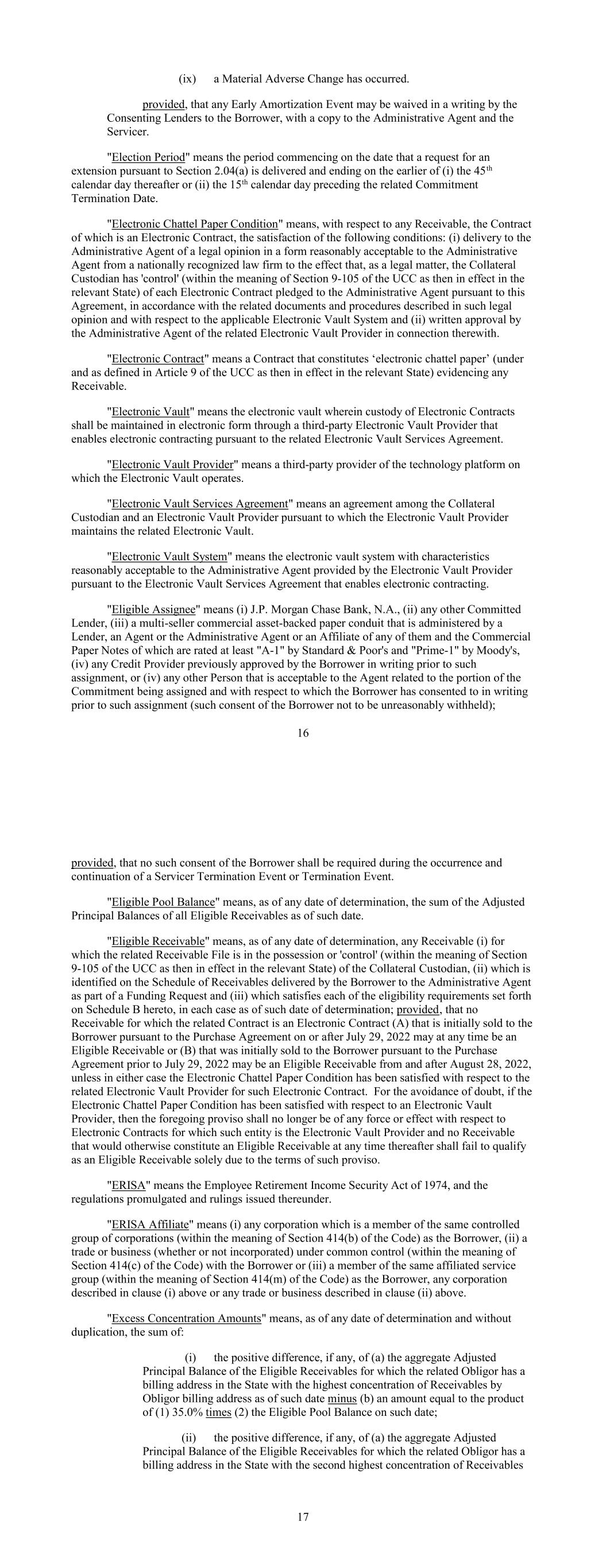 (ix) a Material Adverse Change has occurred. provided, that any Early Amortization Event may be waived in a writing by the Consenting Lenders to the Borrower, with a copy to the Administrative Agent and the Servicer. "Election Period" means the period commencing on the date that a request for an extension pursuant to Section 2.04(a) is delivered and ending on the earlier of (i) the 45 th calendar day thereafter or (ii) the 15th calendar day preceding the related Commitment Termination Date. "Electronic Chattel Paper Condition" means, with respect to any Receivable, the Contract of which is an Electronic Contract, the satisfaction of the following conditions: (i) delivery to the Administrative Agent of a legal opinion in a form reasonably acceptable to the Administrative Agent from a nationally recognized law firm to the effect that, as a legal matter, the Collateral Custodian has 'control' (within the meaning of Section 9-105 of the UCC as then in effect in the relevant State) of each Electronic Contract pledged to the Administrative Agent pursuant to this Agreement, in accordance with the related documents and procedures described in such legal opinion and with respect to the applicable Electronic Vault System and (ii) written approval by the Administrative Agent of the related Electronic Vault Provider in connection therewith. "Electronic Contract" means a Contract that constitutes ‘electronic chattel paper’ (under and as defined in Article 9 of the UCC as then in effect in the relevant State) evidencing any Receivable. "Electronic Vault" means the electronic vault wherein custody of Electronic Contracts shall be maintained in electronic form through a third-party Electronic Vault Provider that enables electronic contracting pursuant to the related Electronic Vault Services Agreement. "Electronic Vault Provider" means a third-party provider of the technology platform on which the Electronic Vault operates. "Electronic Vault Services Agreement" means an agreement among the Collateral Custodian and an Electronic Vault Provider pursuant to which the Electronic Vault Provider maintains the related Electronic Vault. "Electronic Vault System" means the electronic vault system with characteristics reasonably acceptable to the Administrative Agent provided by the Electronic Vault Provider pursuant to the Electronic Vault Services Agreement that enables electronic contracting. "Eligible Assignee" means (i) J.P. Morgan Chase Bank, N.A., (ii) any other Committed Lender, (iii) a multi-seller commercial asset-backed paper conduit that is administered by a Lender, an Agent or the Administrative Agent or an Affiliate of any of them and the Commercial Paper Notes of which are rated at least "A-1" by Standard & Poor's and "Prime-1" by Moody's, (iv) any Credit Provider previously approved by the Borrower in writing prior to such assignment, or (iv) any other Person that is acceptable to the Agent related to the portion of the Commitment being assigned and with respect to which the Borrower has consented to in writing prior to such assignment (such consent of the Borrower not to be unreasonably withheld); 16 provided, that no such consent of the Borrower shall be required during the occurrence and continuation of a Servicer Termination Event or Termination Event. "Eligible Pool Balance" means, as of any date of determination, the sum of the Adjusted Principal Balances of all Eligible Receivables as of such date. "Eligible Receivable" means, as of any date of determination, any Receivable (i) for which the related Receivable File is in the possession or 'control' (within the meaning of Section 9-105 of the UCC as then in effect in the relevant State) of the Collateral Custodian, (ii) which is identified on the Schedule of Receivables delivered by the Borrower to the Administrative Agent as part of a Funding Request and (iii) which satisfies each of the eligibility requirements set forth on Schedule B hereto, in each case as of such date of determination; provided, that no Receivable for which the related Contract is an Electronic Contract (A) that is initially sold to the Borrower pursuant to the Purchase Agreement on or after July 29, 2022 may at any time be an Eligible Receivable or (B) that was initially sold to the Borrower pursuant to the Purchase Agreement prior to July 29, 2022 may be an Eligible Receivable from and after August 28, 2022, unless in either case the Electronic Chattel Paper Condition has been satisfied with respect to the related Electronic Vault Provider for such Electronic Contract. For the avoidance of doubt, if the Electronic Chattel Paper Condition has been satisfied with respect to an Electronic Vault Provider, then the foregoing proviso shall no longer be of any force or effect with respect to Electronic Contracts for which such entity is the Electronic Vault Provider and no Receivable that would otherwise constitute an Eligible Receivable at any time thereafter shall fail to qualify as an Eligible Receivable solely due to the terms of such proviso. "ERISA" means the Employee Retirement Income Security Act of 1974, and the regulations promulgated and rulings issued thereunder. "ERISA Affiliate" means (i) any corporation which is a member of the same controlled group of corporations (within the meaning of Section 414(b) of the Code) as the Borrower, (ii) a trade or business (whether or not incorporated) under common control (within the meaning of Section 414(c) of the Code) with the Borrower or (iii) a member of the same affiliated service group (within the meaning of Section 414(m) of the Code) as the Borrower, any corporation described in clause (i) above or any trade or business described in clause (ii) above. "Excess Concentration Amounts" means, as of any date of determination and without duplication, the sum of: (i) the positive difference, if any, of (a) the aggregate Adjusted Principal Balance of the Eligible Receivables for which the related Obligor has a billing a