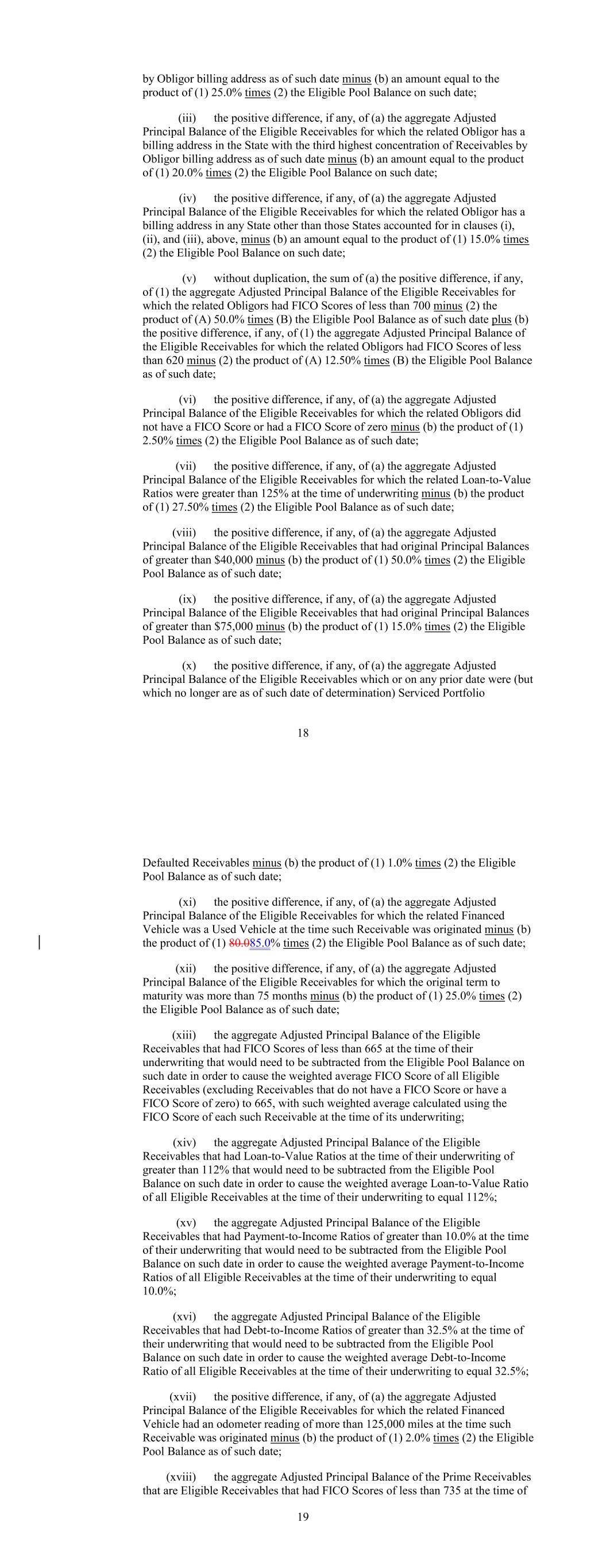 by Obligor billing address as of such date minus (b) an amount equal to the product of (1) 25.0% times (2) the Eligible Pool Balance on such date; (iii) the positive difference, if any, of (a) the aggregate Adjusted Principal Balance of the Eligible Receivables for which the related Obligor has a billing address in the State with the third highest concentration of Receivables by Obligor billing address as of such date minus (b) an amount equal to the product of (1) 20.0% times (2) the Eligible Pool Balance on such date; (iv) the positive difference, if any, of (a) the aggregate Adjusted Principal Balance of the Eligible Receivables for which the related Obligor has a billing address in any State other than those States accounted for in clauses (i), (ii), and (iii), above, minus (b) an amount equal to the product of (1) 15.0% times (2) the Eligible Pool Balance on such date; (v) without duplication, the sum of (a) the positive difference, if any, of (1) the aggregate Adjusted Principal Balance of the Eligible Receivables for which the related Obligors had FICO Scores of less than 700 minus (2) the product of (A) 50.0% times (B) the Eligible Pool Balance as of such date plus (b) the positive difference, if any, of (1) the aggregate Adjusted Principal Balance of the Eligible Receivables for which the related Obligors had FICO Scores of less than 620 minus (2) the product of (A) 12.50% times (B) the Eligible Pool Balance as of such date; (vi) the positive difference, if any, of (a) the aggregate Adjusted Principal Balance of the Eligible Receivables for which the related Obligors did not have a FICO Score or had a FICO Score of zero minus (b) the product of (1) 2.50% times (2) the Eligible Pool Balance as of such date; (vii) the positive difference, if any, of (a) the aggregate Adjusted Principal Balance of the Eligible Receivables for which the related Loan-to-Value Ratios were greater than 125% at the time of underwriting minus (b) the product of (1) 27.50% times (2) the Eligible Pool Balance as of such date; (viii) the positive difference, if any, of (a) the aggregate Adjusted Principal Balance of the Eligible Receivables that had original Principal Balances of greater than $40,000 minus (b) the product of (1) 50.0% times (2) the Eligible Pool Balance as of such date; (ix) the positive difference, if any, of (a) the aggregate Adjusted Principal Balance of the Eligible Receivables that had original Principal Balances of greater than $75,000 minus (b) the product of (1) 15.0% times (2) the Eligible Pool Balance as of such date; (x) the positive difference, if any, of (a) the aggregate Adjusted Principal Balance of the Eligible Receivables which or on any prior date were (but which no longer are as of such date of determination) Serviced Portfolio 18 Defaulted Receivables minus (b) the product of (1) 1.0% times (2) the Eligible Pool Balance as of such date; (xi) the positive difference, if any, of (a) the aggregate Adjusted Principal Balance of the Eligible Receivables for which the related Financed Vehicle was a Used Vehicle at the time such Receivable was originated minus (b) the product of (1) 80.085.0% times (2) the Eligible Pool Balance as of such date; (xii) the positive difference, if any, of (a) the aggregate Adjusted Principal Balance of the Eligible Receivables for which the original term to maturity was more than 75 months minus (b) the product of (1) 25.0% times (2) the Eligible Pool Balance as of such date; (xiii) the aggregate Adjusted Principal Balance of the Eligible Receivables that had FICO Scores of less than 665 at the time of their underwriting that would need to be subtracted from the Eligible Pool Balance on such date in order to cause the weighted average FICO Score of all Eligible Receivables (excluding Receivables that do not have a FICO Score or have a FICO Score of zero) to 665, with such weighted average calculated using the FICO Score of each such Receivable at the time of its underwriting; (xiv) the aggregate Adjusted Principal Balance of the Eligible Receivables that had Loan-to-Value Ratios at the time of their underwriting of greater than 112% that would need to be subtracted from the Eligible Pool Balance on such date in order to cause the weighted average Loan-to-Value Ratio of all Eligible Receivables at the time of their underwriting to equal 112%; (xv) the aggregate Adjusted Principal Balance of the Eligible Receivables that had Payment-to-Income Ratios of greater than 10.0% at the time of their underwriting that would need to be subtracted from the Eligible Pool Balance on such date in order to cause the weighted average Payment-to-Income Ratios of all Eligible Receivables at the time of their underwriting to equal 10.0%; (xvi) the aggregate Adjusted Principal Balance of the Eligible Receivables that had Debt-to-Income Ratios of greater than 32.5% at the time of their underwriting that would need to be subtracted from the Eligible Pool Balance on such date in order to cause the weighted average Debt-to-Income Ratio of all Eligible Receivables at the time of their underwriting to equal 32.5%; (xvii) the positive difference, if any, of (a) the aggregate Adjusted Principal Balance of the Eligible Receivables for which the related Financed Vehicle had an odometer reading of more than 125,000 miles at the time such Receivable was originated minus (b) the product of (1) 2.0% times (2) the Eligible Pool Balance as of such date; (xviii) the aggregate Adjusted Principal Balance of the Prime Receivables that are Eligible Receivables that had FICO Scores of less than 735 at the time of 19