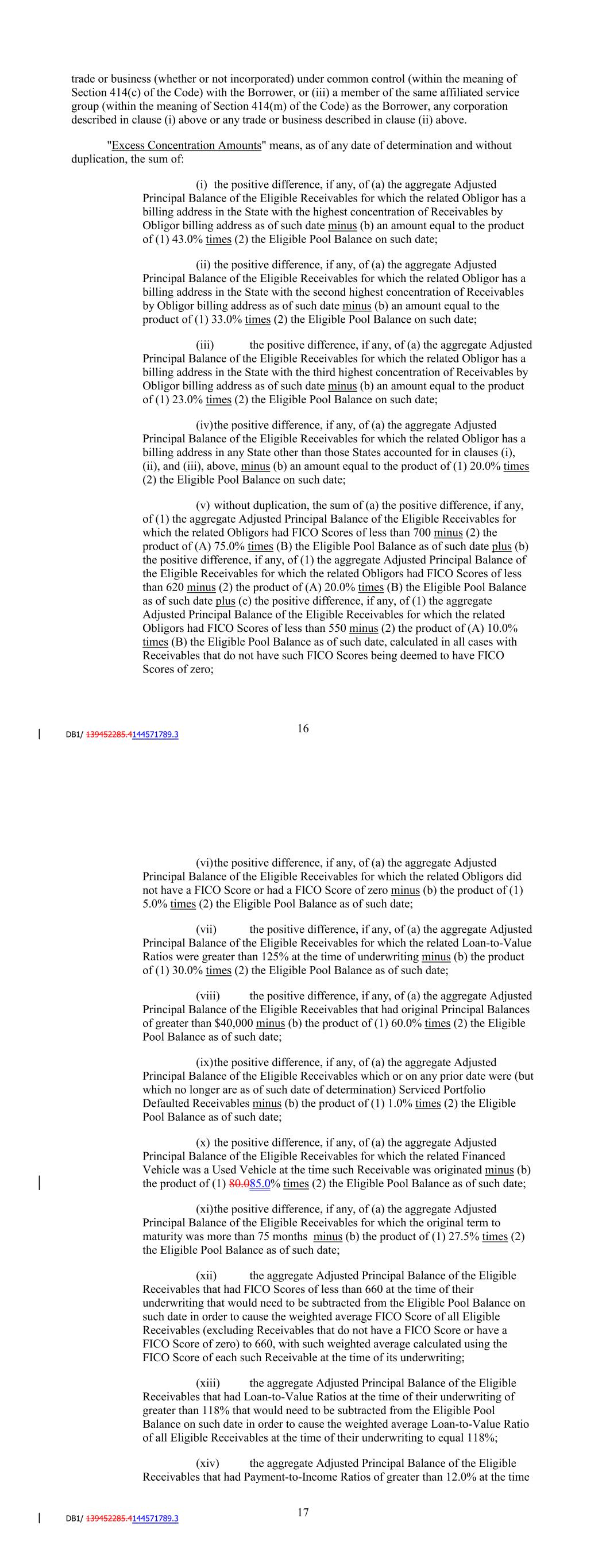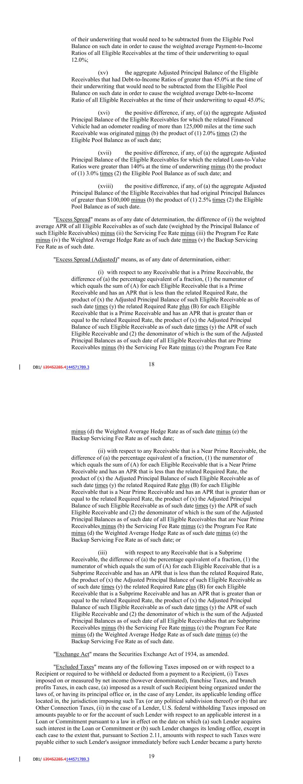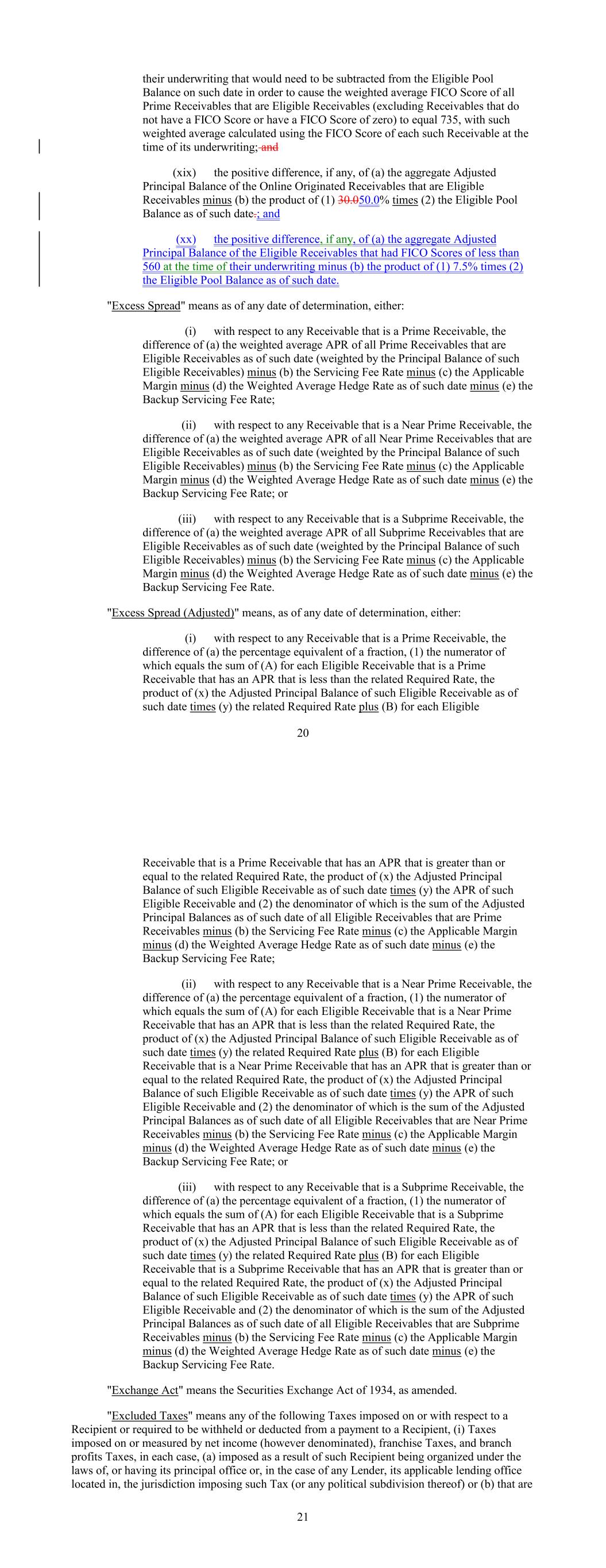 their underwriting that would need to be subtracted from the Eligible Pool Balance on such date in order to cause the weighted average FICO Score of all Prime Receivables that are Eligible Receivables (excluding Receivables that do not have a FICO Score or have a FICO Score of zero) to equal 735, with such weighted average calculated using the FICO Score of each such Receivable at the time of its underwriting; and (xix) the positive difference, if any, of (a) the aggregate Adjusted Principal Balance of the Online Originated Receivables that are Eligible Receivables minus (b) the product of (1) 30.050.0% times (2) the Eligible Pool Balance as of such date.; and (xx) the positive difference, if any, of (a) the aggregate Adjusted Principal Balance of the Eligible Receivables that had FICO Scores of less than 560 at the time of their underwriting minus (b) the product of (1) 7.5% times (2) the Eligible Pool Balance as of such date. "Excess Spread" means as of any date of determination, either: (i) with respect to any Receivable that is a Prime Receivable, the difference of (a) the weighted average APR of all Prime Receivables that are Eligible Receivables as of such date (weighted by the Principal Balance of such Eligible Receivables) minus (b) the Servicing Fee Rate minus (c) the Applicable Margin minus (d) the Weighted Average Hedge Rate as of such date minus (e) the Backup Servicing Fee Rate; (ii) with respect to any Receivable that is a Near Prime Receivable, the difference of (a) the weighted average APR of all Near Prime Receivables that are Eligible Receivables as of such date (weighted by the Principal Balance of such Eligible Receivables) minus (b) the Servicing Fee Rate minus (c) the Applicable Margin minus (d) the Weighted Average Hedge Rate as of such date minus (e) the Backup Servicing Fee Rate; or (iii) with respect to any Receivable that is a Subprime Receivable, the difference of (a) the weighted average APR of all Subprime Receivables that are Eligible Receivables as of such date (weighted by the Principal Balance of such Eligible Receivables) minus (b) the Servicing Fee Rate minus (c) the Applicable Margin minus (d) the Weighted Average Hedge Rate as of such date minus (e) the Backup Servicing Fee Rate. "Excess Spread (Adjusted)" means, as of any date of determination, either: (i) with respect to any Receivable that is a Prime Receivable, the difference of (a) the percentage equivalent of a fraction, (1) the numerator of which equals the sum of (A) for each Eligible Receivable that is a Prime Receivable that has an APR that is less than the related Required Rate, the product of (x) the Adjusted Principal Balance of such Eligible Receivable as of such date times (y) the related Required Rate plus (B) for each Eligible 20 Receivable that is a Prime Receivable that has an APR that is greater than or equal to the related Required Rate, the product of (x) the Adjusted Principal Balance of such Eligible Receivable as of such date times (y) the APR of such Eligible Receivable and (2) the denominator of which is the sum of the Adjusted Principal Balances as of such date of all Eligible Receivables that are Prime Receivables minus (b) the Servicing Fee Rate minus (c) the Applicable Margin minus (d) the Weighted Average Hedge Rate as of such date minus (e) the Backup Servicing Fee Rate; (ii) with respect to any Receivable that is a Near Prime Receivable, the difference of (a) the percentage equivalent of a fraction, (1) the numerator of which equals the sum of (A) for each Eligible Receivable that is a Near Prime Receivable that has an APR that is less than the related Required Rate, the product of (x) the Adjusted Principal Balance of such Eligible Receivable as of such date times (y) the related Required Rate plus (B) for each Eligible Receivable that is a Near Prime Receivable that has an APR that is greater than or equal to the related Required Rate, the product of (x) the Adjusted Principal Balance of such Eligible Receivable as of such date times (y) the APR of such Eligible Receivable and (2) the denominator of which is the sum of the Adjusted Principal Balances as of such date of all Eligible Receivables that are Near Prime Receivables minus (b) the Servicing Fee Rate minus (c) the Applicable Margin minus (d) the Weighted Average Hedge Rate as of such date minus (e) the Backup Servicing Fee Rate; or (iii) with respect to any Receivable that is a Subprime Receivable, the difference of (a) the percentage equivalent of a fraction, (1) the numerator of which equals the sum of (A) for each Eligible Receivable that is a Subprime Receivable that has an APR that is less than the related Required Rate, the product of (x) the Adjusted Principal Balance of such Eligible Receivable as of such date times (y) the related Required Rate plus (B) for each Eligible Receivable that is a Subprime Receivable that has an APR that is greater than or equal to the related Required Rate, the product of (x) the Adjusted Principal Balance of such Eligible Receivable as of such date times (y) the APR of such Eligible Receivable and (2) the denominator of which is the sum of the Adjusted Principal Balances as of such date of all Eligible Receivables that are Subprime Receivables minus (b) the Servicing Fee Rate minus (c) the Applicable Margin minus (d) the Weighted Average Hedge Rate as of such date minus (e) the Backup Servicing Fee Rate. "Exchange Act" means the Securities Exchange Act of 1934, as amended. "Excluded Taxes" means any of the following Taxes imposed on or with respect to a Recipient or required to be withheld or deducted from a payment to a Recipient, (i) Taxes imposed on or measured by net income (however denominated), franchise Taxes, and branch profits Taxes, in each case, (a) imposed as a result of such Recipient being organized under the laws of, or having its principal office or, in the case of any Lender, its applicable lending office located in, the jurisdiction imposing such Tax (