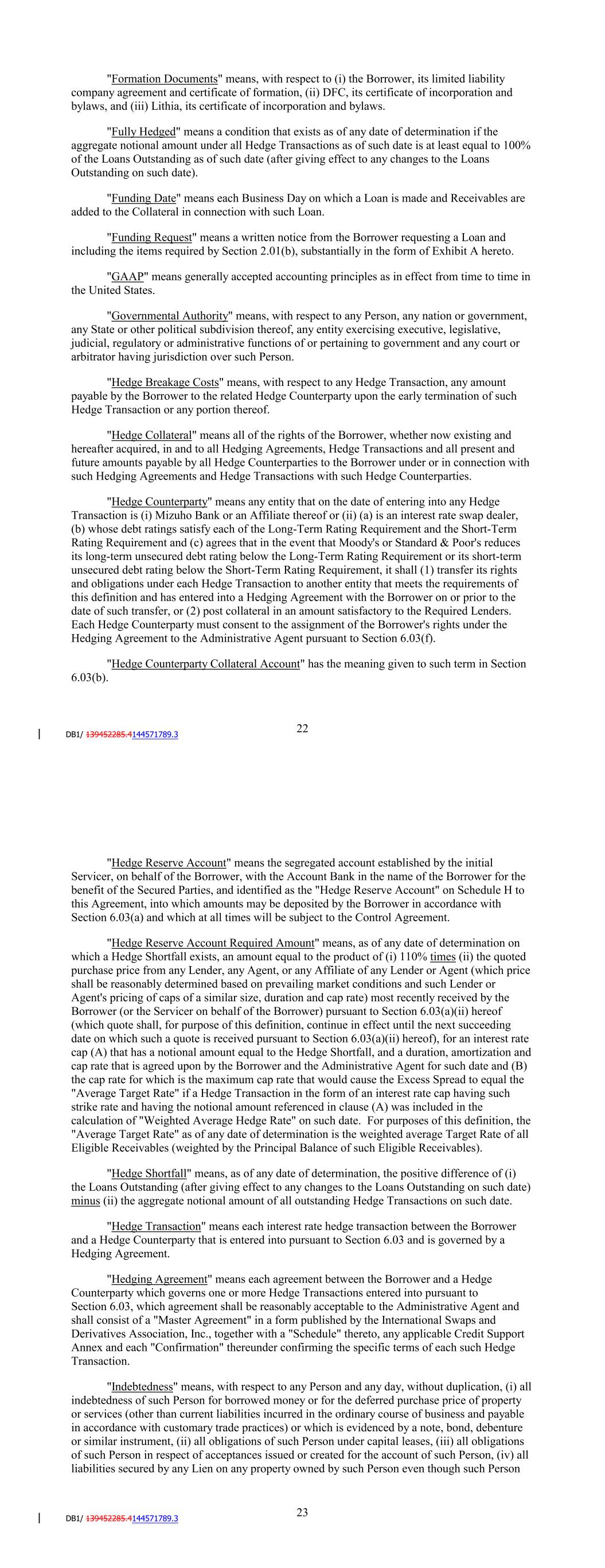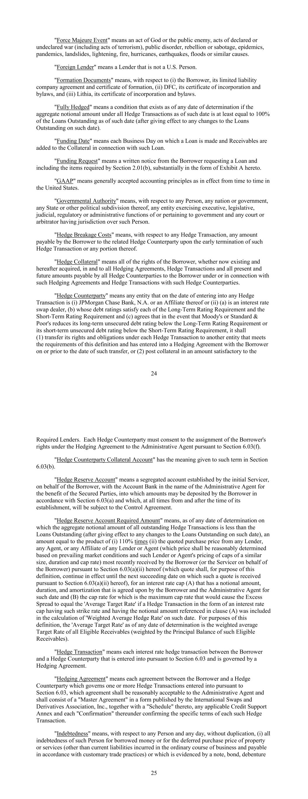 "Force Majeure Event" means an act of God or the public enemy, acts of declared or undeclared war (including acts of terrorism), public disorder, rebellion or sabotage, epidemics, pandemics, landslides, lightening, fire, hurricanes, earthquakes, floods or similar causes. "Foreign Lender" means a Lender that is not a U.S. Person. "Formation Documents" means, with respect to (i) the Borrower, its limited liability company agreement and certificate of formation, (ii) DFC, its certificate of incorporation and bylaws, and (iii) Lithia, its certificate of incorporation and bylaws. "Fully Hedged" means a condition that exists as of any date of determination if the aggregate notional amount under all Hedge Transactions as of such date is at least equal to 100% of the Loans Outstanding as of such date (after giving effect to any changes to the Loans Outstanding on such date). "Funding Date" means each Business Day on which a Loan is made and Receivables are added to the Collateral in connection with such Loan. "Funding Request" means a written notice from the Borrower requesting a Loan and including the items required by Section 2.01(b), substantially in the form of Exhibit A hereto. "GAAP" means generally accepted accounting principles as in effect from time to time in the United States. "Governmental Authority" means, with respect to any Person, any nation or government, any State or other political subdivision thereof, any entity exercising executive, legislative, judicial, regulatory or administrative functions of or pertaining to government and any court or arbitrator having jurisdiction over such Person. "Hedge Breakage Costs" means, with respect to any Hedge Transaction, any amount payable by the Borrower to the related Hedge Counterparty upon the early termination of such Hedge Transaction or any portion thereof. "Hedge Collateral" means all of the rights of the Borrower, whether now existing and hereafter acquired, in and to all Hedging Agreements, Hedge Transactions and all present and future amounts payable by all Hedge Counterparties to the Borrower under or in connection with such Hedging Agreements and Hedge Transactions with such Hedge Counterparties. "Hedge Counterparty" means any entity that on the date of entering into any Hedge Transaction is (i) JPMorgan Chase Bank, N.A. or an Affiliate thereof or (ii) (a) is an interest rate swap dealer, (b) whose debt ratings satisfy each of the Long-Term Rating Requirement and the Short-Term Rating Requirement and (c) agrees that in the event that Moody's or Standard & Poor's reduces its long-term unsecured debt rating below the Long-Term Rating Requirement or its short-term unsecured debt rating below the Short-Term Rating Requirement, it shall (1) transfer its rights and obligations under each Hedge Transaction to another entity that meets the requirements of this definition and has entered into a Hedging Agreement with the Borrower on or prior to the date of such transfer, or (2) post collateral in an amount satisfactory to the 24 Required Lenders. Each Hedge Counterparty must consent to the assignment of the Borrower's rights under the Hedging Agreement to the Administrative Agent pursuant to Section 6.03(f). "Hedge Counterparty Collateral Account" has the meaning given to such term in Section 6.03(b). "Hedge Reserve Account" means a segregated account established by the initial Servicer, on behalf of the Borrower, with the Account Bank in the name of the Administrative Agent for the benefit of the Secured Parties, into which amounts may be deposited by the Borrower in accordance with Section 6.03(a) and which, at all times from and after the time of its establishment, will be subject to the Control Agreement. "Hedge Reserve Account Required Amount" means, as of any date of determination on which the aggregate notional amount of all outstanding Hedge Transactions is less than the Loans Outstanding (after giving effect to any changes to the Loans Outstanding on such date), an amount equal to the product of (i) 110% times (ii) the quoted purchase price from any Lender, any Agent, or any Affiliate of any Lender or Agent (which price shall be reasonably determined based on prevailing market conditions and such Lender or Agent's pricing of caps of a similar size, duration and cap rate) most recently received by the Borrower (or the Servicer on behalf of the Borrower) pursuant to Section 6.03(a)(ii) hereof (which quote shall, for purpose of this definition, continue in effect until the next succeeding date on which such a quote is received pursuant to Section 6.03(a)(ii) hereof), for an interest rate cap (A) that has a notional amount, duration, and amortization that is agreed upon by the Borrower and the Administrative Agent for such date and (B) the cap rate for which is the maximum cap rate that would cause the Excess Spread to equal the 'Average Target Rate' if a Hedge Transaction in the form of an interest rate cap having such strike rate and having the notional amount referenced in clause (A) was included in the calculation of 'Weighted Average Hedge Rate' on such date. For purposes of this definition, the 'Average Target Rate' as of any date of determination is the weighted average Target Rate of all Eligible Receivables (weighted by the Principal Balance of such Eligible Receivables). "Hedge Transaction" means each interest rate hedge transaction between the Borrower and a Hedge Counterparty that is entered into pursuant to Section 6.03 and is governed by a Hedging Agreement. "Hedging Agreement" means each agreement between the Borrower and a Hedge Counterparty which governs one or more Hedge Transactions entered into pursuant to Section 6.03, which agreement shall be reasonably acceptable to the Administrative Agent and shall consist of a "Master Agreement" in a form published by the International Swaps and Derivatives Association, Inc., together with a "Schedule" thereto, any applicable Credit Support Annex and each "Confirmation" t
