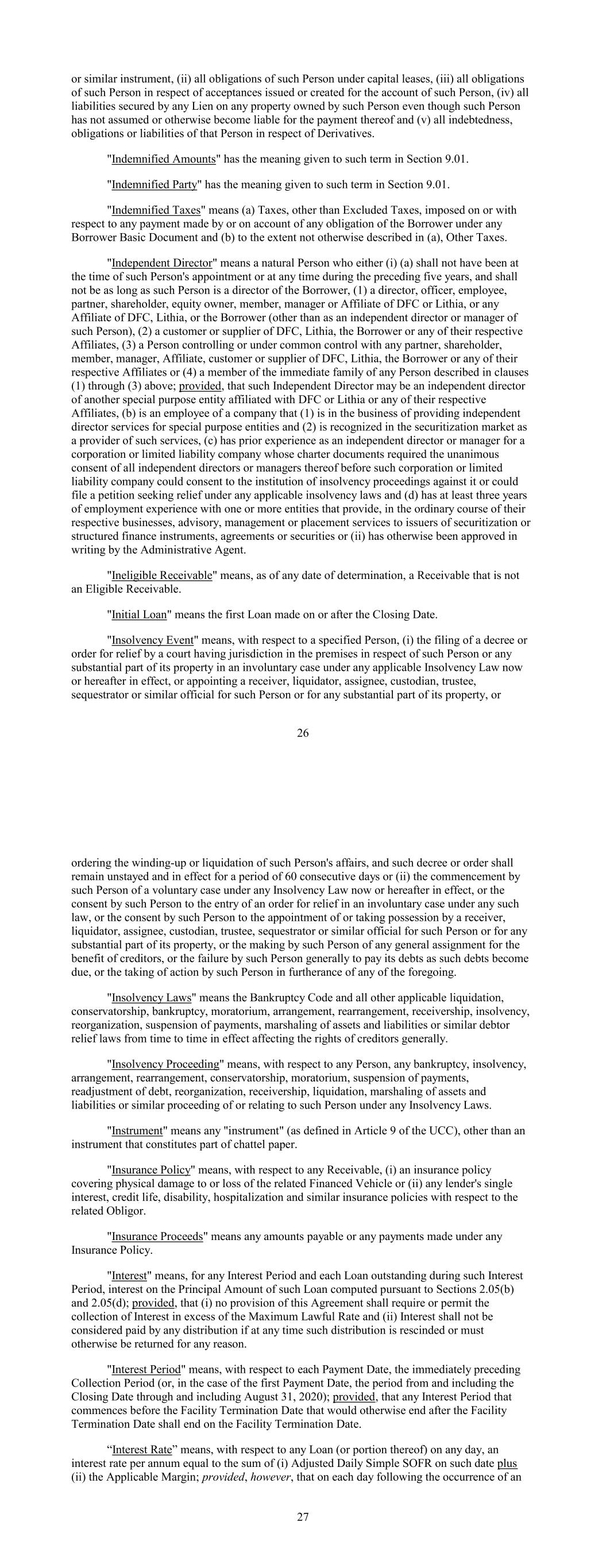 or similar instrument, (ii) all obligations of such Person under capital leases, (iii) all obligations of such Person in respect of acceptances issued or created for the account of such Person, (iv) all liabilities secured by any Lien on any property owned by such Person even though such Person has not assumed or otherwise become liable for the payment thereof and (v) all indebtedness, obligations or liabilities of that Person in respect of Derivatives. "Indemnified Amounts" has the meaning given to such term in Section 9.01. "Indemnified Party" has the meaning given to such term in Section 9.01. "Indemnified Taxes" means (a) Taxes, other than Excluded Taxes, imposed on or with respect to any payment made by or on account of any obligation of the Borrower under any Borrower Basic Document and (b) to the extent not otherwise described in (a), Other Taxes. "Independent Director" means a natural Person who either (i) (a) shall not have been at the time of such Person's appointment or at any time during the preceding five years, and shall not be as long as such Person is a director of the Borrower, (1) a director, officer, employee, partner, shareholder, equity owner, member, manager or Affiliate of DFC or Lithia, or any Affiliate of DFC, Lithia, or the Borrower (other than as an independent director or manager of such Person), (2) a customer or supplier of DFC, Lithia, the Borrower or any of their respective Affiliates, (3) a Person controlling or under common control with any partner, shareholder, member, manager, Affiliate, customer or supplier of DFC, Lithia, the Borrower or any of their respective Affiliates or (4) a member of the immediate family of any Person described in clauses (1) through (3) above; provided, that such Independent Director may be an independent director of another special purpose entity affiliated with DFC or Lithia or any of their respective Affiliates, (b) is an employee of a company that (1) is in the business of providing independent director services for special purpose entities and (2) is recognized in the securitization market as a provider of such services, (c) has prior experience as an independent director or manager for a corporation or limited liability company whose charter documents required the unanimous consent of all independent directors or managers thereof before such corporation or limited liability company could consent to the institution of insolvency proceedings against it or could file a petition seeking relief under any applicable insolvency laws and (d) has at least three years of employment experience with one or more entities that provide, in the ordinary course of their respective businesses, advisory, management or placement services to issuers of securitization or structured finance instruments, agreements or securities or (ii) has otherwise been approved in writing by the Administrative Agent. "Ineligible Receivable" means, as of any date of determination, a Receivable that is not an Eligible Receivable. "Initial Loan" means the first Loan made on or after the Closing Date. "Insolvency Event" means, with respect to a specified Person, (i) the filing of a decree or order for relief by a court having jurisdiction in the premises in respect of such Person or any substantial part of its property in an involuntary case under any applicable Insolvency Law now or hereafter in effect, or appointing a receiver, liquidator, assignee, custodian, trustee, sequestrator or similar official for such Person or for any substantial part of its property, or 26 ordering the winding-up or liquidation of such Person's affairs, and such decree or order shall remain unstayed and in effect for a period of 60 consecutive days or (ii) the commencement by such Person of a voluntary case under any Insolvency Law now or hereafter in effect, or the consent by such Person to the entry of an order for relief in an involuntary case under any such law, or the consent by such Person to the appointment of or taking possession by a receiver, liquidator, assignee, custodian, trustee, sequestrator or similar official for such Person or for any substantial part of its property, or the making by such Person of any general assignment for the benefit of creditors, or the failure by such Person generally to pay its debts as such debts become due, or the taking of action by such Person in furtherance of any of the foregoing. "Insolvency Laws" means the Bankruptcy Code and all other applicable liquidation, conservatorship, bankruptcy, moratorium, arrangement, rearrangement, receivership, insolvency, reorganization, suspension of payments, marshaling of assets and liabilities or similar debtor relief laws from time to time in effect affecting the rights of creditors generally. "Insolvency Proceeding" means, with respect to any Person, any bankruptcy, insolvency, arrangement, rearrangement, conservatorship, moratorium, suspension of payments, readjustment of debt, reorganization, receivership, liquidation, marshaling of assets and liabilities or similar proceeding of or relating to such Person under any Insolvency Laws. "Instrument" means any "instrument" (as defined in Article 9 of the UCC), other than an instrument that constitutes part of chattel paper. "Insurance Policy" means, with respect to any Receivable, (i) an insurance policy covering physical damage to or loss of the related Financed Vehicle or (ii) any lender's single interest, credit life, disability, hospitalization and similar insurance policies with respect to the related Obligor. "Insurance Proceeds" means any amounts payable or any payments made under any Insurance Policy. "Interest" means, for any Interest Period and each Loan outstanding during such Interest Period, interest on the Principal Amount of such Loan computed pursuant to Sections 2.05(b) and 2.05(d); provided, that (i) no provision of this Agreement shall require or permit the collection of Interest in excess of the Maximum Lawful Rate and (ii) Inter