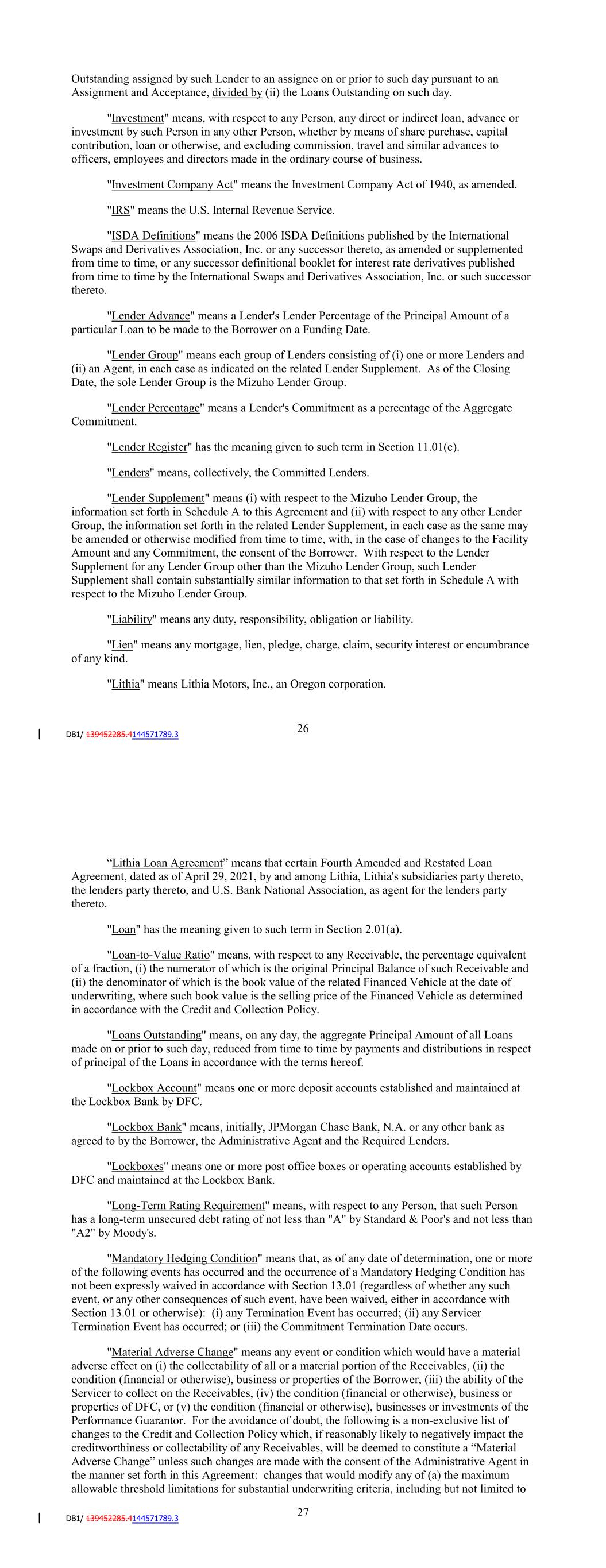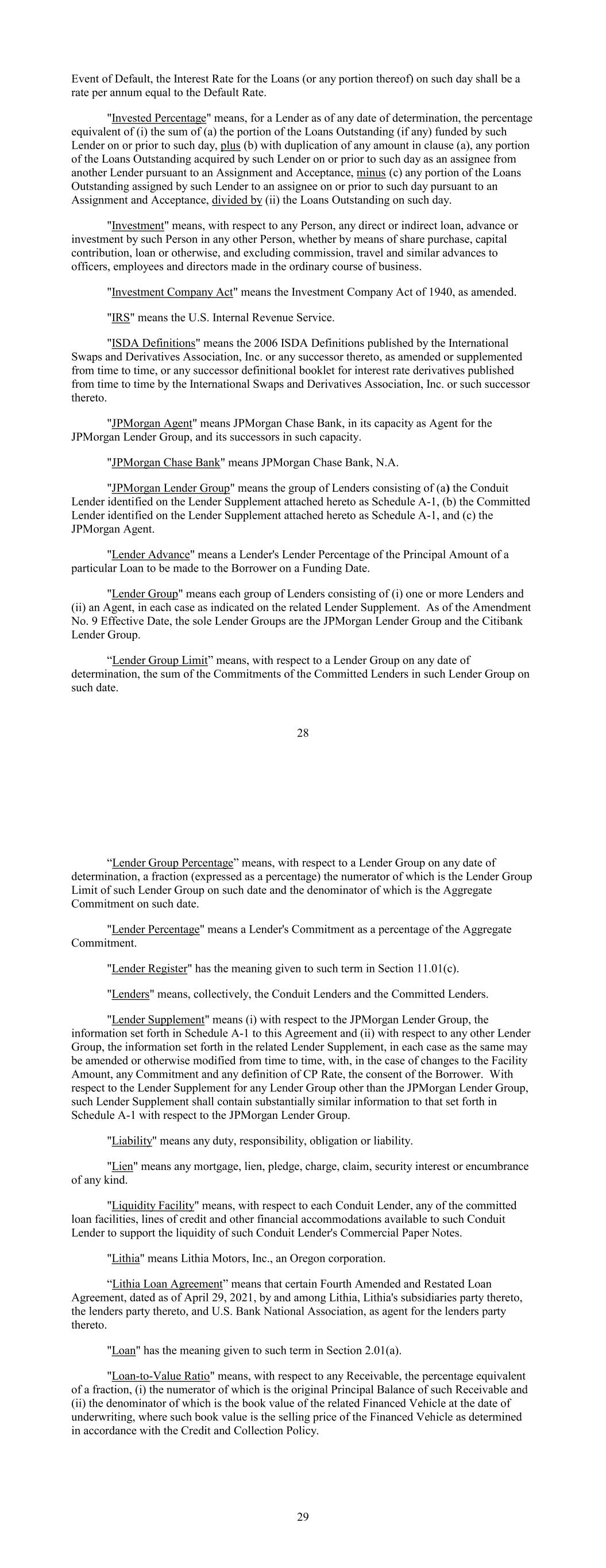 Event of Default, the Interest Rate for the Loans (or any portion thereof) on such day shall be a rate per annum equal to the Default Rate. "Invested Percentage" means, for a Lender as of any date of determination, the percentage equivalent of (i) the sum of (a) the portion of the Loans Outstanding (if any) funded by such Lender on or prior to such day, plus (b) with duplication of any amount in clause (a), any portion of the Loans Outstanding acquired by such Lender on or prior to such day as an assignee from another Lender pursuant to an Assignment and Acceptance, minus (c) any portion of the Loans Outstanding assigned by such Lender to an assignee on or prior to such day pursuant to an Assignment and Acceptance, divided by (ii) the Loans Outstanding on such day. "Investment" means, with respect to any Person, any direct or indirect loan, advance or investment by such Person in any other Person, whether by means of share purchase, capital contribution, loan or otherwise, and excluding commission, travel and similar advances to officers, employees and directors made in the ordinary course of business. "Investment Company Act" means the Investment Company Act of 1940, as amended. "IRS" means the U.S. Internal Revenue Service. "ISDA Definitions" means the 2006 ISDA Definitions published by the International Swaps and Derivatives Association, Inc. or any successor thereto, as amended or supplemented from time to time, or any successor definitional booklet for interest rate derivatives published from time to time by the International Swaps and Derivatives Association, Inc. or such successor thereto. "JPMorgan Agent" means JPMorgan Chase Bank, in its capacity as Agent for the JPMorgan Lender Group, and its successors in such capacity. "JPMorgan Chase Bank" means JPMorgan Chase Bank, N.A. "JPMorgan Lender Group" means the group of Lenders consisting of (a) the Conduit Lender identified on the Lender Supplement attached hereto as Schedule A-1, (b) the Committed Lender identified on the Lender Supplement attached hereto as Schedule A-1, and (c) the JPMorgan Agent. "Lender Advance" means a Lender's Lender Percentage of the Principal Amount of a particular Loan to be made to the Borrower on a Funding Date. "Lender Group" means each group of Lenders consisting of (i) one or more Lenders and (ii) an Agent, in each case as indicated on the related Lender Supplement. As of the Amendment No. 9 Effective Date, the sole Lender Groups are the JPMorgan Lender Group and the Citibank Lender Group. “Lender Group Limit” means, with respect to a Lender Group on any date of determination, the sum of the Commitments of the Committed Lenders in such Lender Group on such date. 28 “Lender Group Percentage” means, with respect to a Lender Group on any date of determination, a fraction (expressed as a percentage) the numerator of which is the Lender Group Limit of such Lender Group on such date and the denominator of which is the Aggregate Commitment on such date. "Lender Percentage" means a Lender's Commitment as a percentage of the Aggregate Commitment. "Lender Register" has the meaning given to such term in Section 11.01(c). "Lenders" means, collectively, the Conduit Lenders and the Committed Lenders. "Lender Supplement" means (i) with respect to the JPMorgan Lender Group, the information set forth in Schedule A-1 to this Agreement and (ii) with respect to any other Lender Group, the information set forth in the related Lender Supplement, in each case as the same may be amended or otherwise modified from time to time, with, in the case of changes to the Facility Amount, any Commitment and any definition of CP Rate, the consent of the Borrower. With respect to the Lender Supplement for any Lender Group other than the JPMorgan Lender Group, such Lender Supplement shall contain substantially similar information to that set forth in Schedule A-1 with respect to the JPMorgan Lender Group. "Liability" means any duty, responsibility, obligation or liability. "Lien" means any mortgage, lien, pledge, charge, claim, security interest or encumbrance of any kind. "Liquidity Facility" means, with respect to each Conduit Lender, any of the committed loan facilities, lines of credit and other financial accommodations available to such Conduit Lender to support the liquidity of such Conduit Lender's Commercial Paper Notes. "Lithia" means Lithia Motors, Inc., an Oregon corporation. “Lithia Loan Agreement” means that certain Fourth Amended and Restated Loan Agreement, dated as of April 29, 2021, by and among Lithia, Lithia's subsidiaries party thereto, the lenders party thereto, and U.S. Bank National Association, as agent for the lenders party thereto. "Loan" has the meaning given to such term in Section 2.01(a). "Loan-to-Value Ratio" means, with respect to any Receivable, the percentage equivalent of a fraction, (i) the numerator of which is the original Principal Balance of such Receivable and (ii) the denominator of which is the book value of the related Financed Vehicle at the date of underwriting, where such book value is the selling price of the Financed Vehicle as determined in accordance with the Credit and Collection Policy. 29