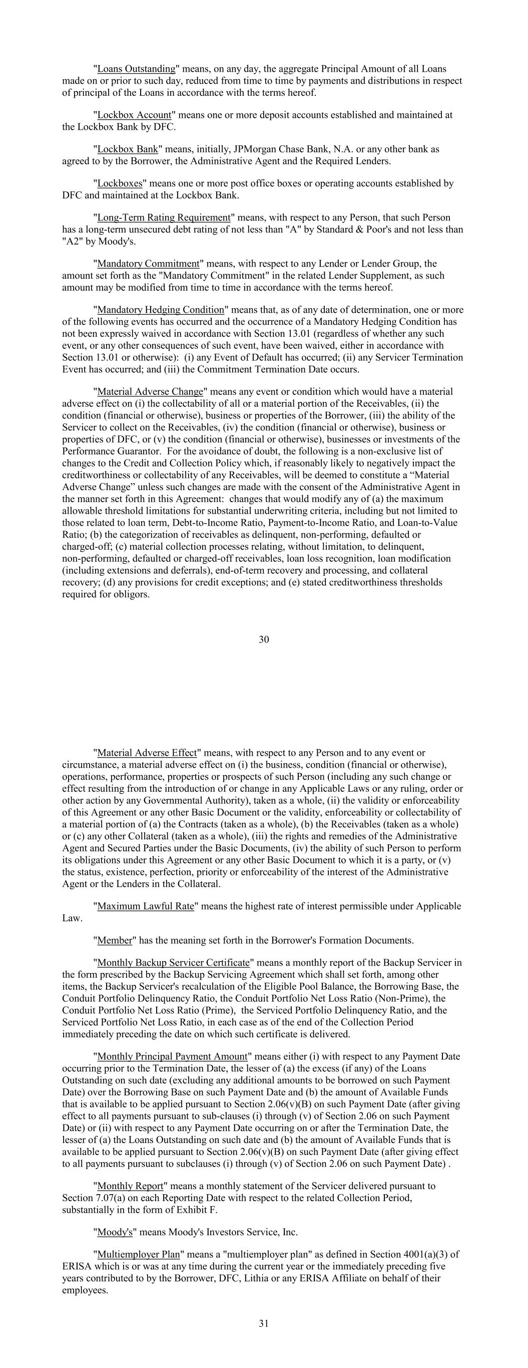 "Loans Outstanding" means, on any day, the aggregate Principal Amount of all Loans made on or prior to such day, reduced from time to time by payments and distributions in respect of principal of the Loans in accordance with the terms hereof. "Lockbox Account" means one or more deposit accounts established and maintained at the Lockbox Bank by DFC. "Lockbox Bank" means, initially, JPMorgan Chase Bank, N.A. or any other bank as agreed to by the Borrower, the Administrative Agent and the Required Lenders. "Lockboxes" means one or more post office boxes or operating accounts established by DFC and maintained at the Lockbox Bank. "Long-Term Rating Requirement" means, with respect to any Person, that such Person has a long-term unsecured debt rating of not less than "A" by Standard & Poor's and not less than "A2" by Moody's. "Mandatory Commitment" means, with respect to any Lender or Lender Group, the amount set forth as the "Mandatory Commitment" in the related Lender Supplement, as such amount may be modified from time to time in accordance with the terms hereof. "Mandatory Hedging Condition" means that, as of any date of determination, one or more of the following events has occurred and the occurrence of a Mandatory Hedging Condition has not been expressly waived in accordance with Section 13.01 (regardless of whether any such event, or any other consequences of such event, have been waived, either in accordance with Section 13.01 or otherwise): (i) any Event of Default has occurred; (ii) any Servicer Termination Event has occurred; and (iii) the Commitment Termination Date occurs. "Material Adverse Change" means any event or condition which would have a material adverse effect on (i) the collectability of all or a material portion of the Receivables, (ii) the condition (financial or otherwise), business or properties of the Borrower, (iii) the ability of the Servicer to collect on the Receivables, (iv) the condition (financial or otherwise), business or properties of DFC, or (v) the condition (financial or otherwise), businesses or investments of the Performance Guarantor. For the avoidance of doubt, the following is a non-exclusive list of changes to the Credit and Collection Policy which, if reasonably likely to negatively impact the creditworthiness or collectability of any Receivables, will be deemed to constitute a “Material Adverse Change” unless such changes are made with the consent of the Administrative Agent in the manner set forth in this Agreement: changes that would modify any of (a) the maximum allowable threshold limitations for substantial underwriting criteria, including but not limited to those related to loan term, Debt-to-Income Ratio, Payment-to-Income Ratio, and Loan-to-Value Ratio; (b) the categorization of receivables as delinquent, non-performing, defaulted or charged-off; (c) material collection processes relating, without limitation, to delinquent, non-performing, defaulted or charged-off receivables, loan loss recognition, loan modification (including extensions and deferrals), end-of-term recovery and processing, and collateral recovery; (d) any provisions for credit exceptions; and (e) stated creditworthiness thresholds required for obligors. 30 "Material Adverse Effect" means, with respect to any Person and to any event or circumstance, a material adverse effect on (i) the business, condition (financial or otherwise), operations, performance, properties or prospects of such Person (including any such change or effect resulting from the introduction of or change in any Applicable Laws or any ruling, order or other action by any Governmental Authority), taken as a whole, (ii) the validity or enforceability of this Agreement or any other Basic Document or the validity, enforceability or collectability of a material portion of (a) the Contracts (taken as a whole), (b) the Receivables (taken as a whole) or (c) any other Collateral (taken as a whole), (iii) the rights and remedies of the Administrative Agent and Secured Parties under the Basic Documents, (iv) the ability of such Person to perform its obligations under this Agreement or any other Basic Document to which it is a party, or (v) the status, existence, perfection, priority or enforceability of the interest of the Administrative Agent or the Lenders in the Collateral. "Maximum Lawful Rate" means the highest rate of interest permissible under Applicable Law. "Member" has the meaning set forth in the Borrower's Formation Documents. "Monthly Backup Servicer Certificate" means a monthly report of the Backup Servicer in the form prescribed by the Backup Servicing Agreement which shall set forth, among other items, the Backup Servicer's recalculation of the Eligible Pool Balance, the Borrowing Base, the Conduit Portfolio Delinquency Ratio, the Conduit Portfolio Net Loss Ratio (Non-Prime), the Conduit Portfolio Net Loss Ratio (Prime), the Serviced Portfolio Delinquency Ratio, and the Serviced Portfolio Net Loss Ratio, in each case as of the end of the Collection Period immediately preceding the date on which such certificate is delivered. "Monthly Principal Payment Amount" means either (i) with respect to any Payment Date occurring prior to the Termination Date, the lesser of (a) the excess (if any) of the Loans Outstanding on such date (excluding any additional amounts to be borrowed on such Payment Date) over the Borrowing Base on such Payment Date and (b) the amount of Available Funds that is available to be applied pursuant to Section 2.06(v)(B) on such Payment Date (after giving effect to all payments pursuant to sub-clauses (i) through (v) of Section 2.06 on such Payment Date) or (ii) with respect to any Payment Date occurring on or after the Termination Date, the lesser of (a) the Loans Outstanding on such date and (b) the amount of Available Funds that is available to be applied pursuant to Section 2.06(v)(B) on such Payment Date (after giving effect to all payments pursuant to subclauses (i) throu