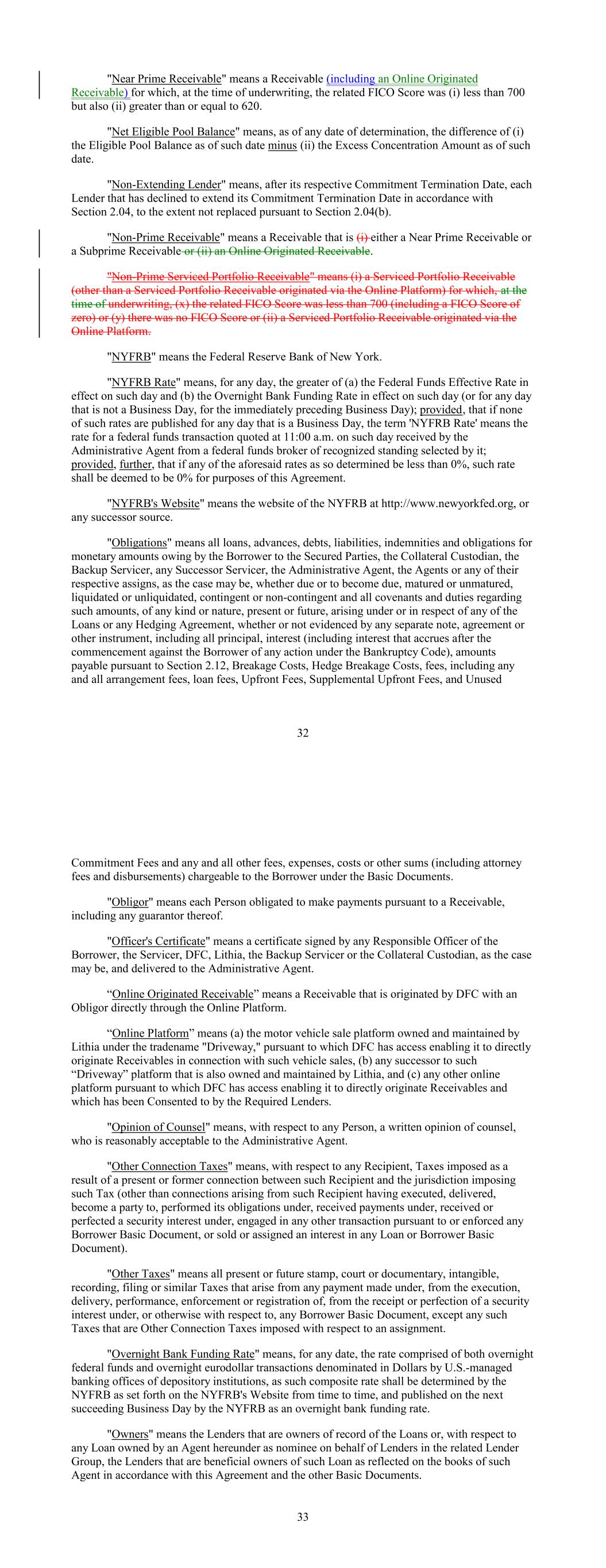 "Near Prime Receivable" means a Receivable (including an Online Originated Receivable) for which, at the time of underwriting, the related FICO Score was (i) less than 700 but also (ii) greater than or equal to 620. "Net Eligible Pool Balance" means, as of any date of determination, the difference of (i) the Eligible Pool Balance as of such date minus (ii) the Excess Concentration Amount as of such date. "Non-Extending Lender" means, after its respective Commitment Termination Date, each Lender that has declined to extend its Commitment Termination Date in accordance with Section 2.04, to the extent not replaced pursuant to Section 2.04(b). "Non-Prime Receivable" means a Receivable that is (i) either a Near Prime Receivable or a Subprime Receivable or (ii) an Online Originated Receivable. "Non-Prime Serviced Portfolio Receivable" means (i) a Serviced Portfolio Receivable (other than a Serviced Portfolio Receivable originated via the Online Platform) for which, at the time of underwriting, (x) the related FICO Score was less than 700 (including a FICO Score of zero) or (y) there was no FICO Score or (ii) a Serviced Portfolio Receivable originated via the Online Platform. "NYFRB" means the Federal Reserve Bank of New York. "NYFRB Rate" means, for any day, the greater of (a) the Federal Funds Effective Rate in effect on such day and (b) the Overnight Bank Funding Rate in effect on such day (or for any day that is not a Business Day, for the immediately preceding Business Day); provided, that if none of such rates are published for any day that is a Business Day, the term 'NYFRB Rate' means the rate for a federal funds transaction quoted at 11:00 a.m. on such day received by the Administrative Agent from a federal funds broker of recognized standing selected by it; provided, further, that if any of the aforesaid rates as so determined be less than 0%, such rate shall be deemed to be 0% for purposes of this Agreement. "NYFRB's Website" means the website of the NYFRB at http://www.newyorkfed.org, or any successor source. "Obligations" means all loans, advances, debts, liabilities, indemnities and obligations for monetary amounts owing by the Borrower to the Secured Parties, the Collateral Custodian, the Backup Servicer, any Successor Servicer, the Administrative Agent, the Agents or any of their respective assigns, as the case may be, whether due or to become due, matured or unmatured, liquidated or unliquidated, contingent or non-contingent and all covenants and duties regarding such amounts, of any kind or nature, present or future, arising under or in respect of any of the Loans or any Hedging Agreement, whether or not evidenced by any separate note, agreement or other instrument, including all principal, interest (including interest that accrues after the commencement against the Borrower of any action under the Bankruptcy Code), amounts payable pursuant to Section 2.12, Breakage Costs, Hedge Breakage Costs, fees, including any and all arrangement fees, loan fees, Upfront Fees, Supplemental Upfront Fees, and Unused 32 Commitment Fees and any and all other fees, expenses, costs or other sums (including attorney fees and disbursements) chargeable to the Borrower under the Basic Documents. "Obligor" means each Person obligated to make payments pursuant to a Receivable, including any guarantor thereof. "Officer's Certificate" means a certificate signed by any Responsible Officer of the Borrower, the Servicer, DFC, Lithia, the Backup Servicer or the Collateral Custodian, as the case may be, and delivered to the Administrative Agent. “Online Originated Receivable” means a Receivable that is originated by DFC with an Obligor directly through the Online Platform. “Online Platform” means (a) the motor vehicle sale platform owned and maintained by Lithia under the tradename "Driveway," pursuant to which DFC has access enabling it to directly originate Receivables in connection with such vehicle sales, (b) any successor to such “Driveway” platform that is also owned and maintained by Lithia, and (c) any other online platform pursuant to which DFC has access enabling it to directly originate Receivables and which has been Consented to by the Required Lenders. "Opinion of Counsel" means, with respect to any Person, a written opinion of counsel, who is reasonably acceptable to the Administrative Agent. "Other Connection Taxes" means, with respect to any Recipient, Taxes imposed as a result of a present or former connection between such Recipient and the jurisdiction imposing such Tax (other than connections arising from such Recipient having executed, delivered, become a party to, performed its obligations under, received payments under, received or perfected a security interest under, engaged in any other transaction pursuant to or enforced any Borrower Basic Document, or sold or assigned an interest in any Loan or Borrower Basic Document). "Other Taxes" means all present or future stamp, court or documentary, intangible, recording, filing or similar Taxes that arise from any payment made under, from the execution, delivery, performance, enforcement or registration of, from the receipt or perfection of a security interest under, or otherwise with respect to, any Borrower Basic Document, except any such Taxes that are Other Connection Taxes imposed with respect to an assignment. "Overnight Bank Funding Rate" means, for any date, the rate comprised of both overnight federal funds and overnight eurodollar transactions denominated in Dollars by U.S.-managed banking offices of depository institutions, as such composite rate shall be determined by the NYFRB as set forth on the NYFRB's Website from time to time, and published on the next succeeding Business Day by the NYFRB as an overnight bank funding rate. "Owners" means the Lenders that are owners of record of the Loans or, with respect to any Loan owned by an Agent hereunder as nominee on behalf of Lenders in the related Lender Group, the Lend