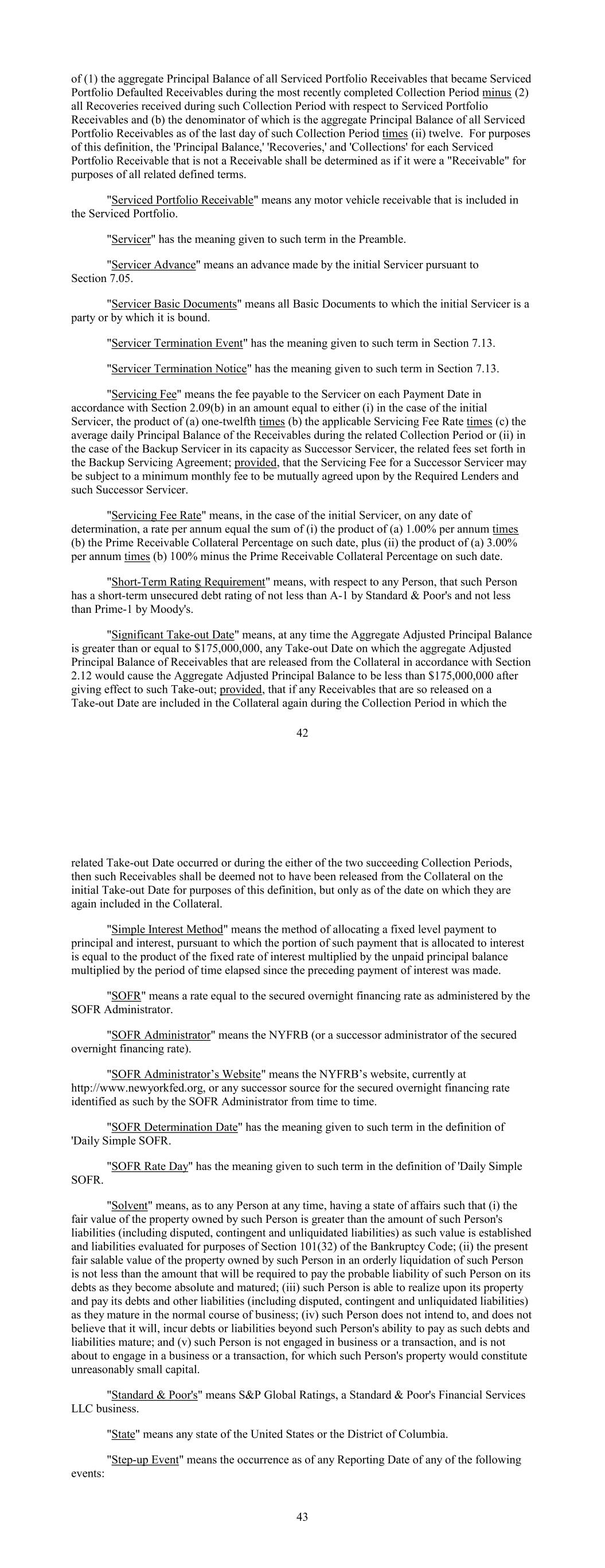 of (1) the aggregate Principal Balance of all Serviced Portfolio Receivables that became Serviced Portfolio Defaulted Receivables during the most recently completed Collection Period minus (2) all Recoveries received during such Collection Period with respect to Serviced Portfolio Receivables and (b) the denominator of which is the aggregate Principal Balance of all Serviced Portfolio Receivables as of the last day of such Collection Period times (ii) twelve. For purposes of this definition, the 'Principal Balance,' 'Recoveries,' and 'Collections' for each Serviced Portfolio Receivable that is not a Receivable shall be determined as if it were a "Receivable" for purposes of all related defined terms. "Serviced Portfolio Receivable" means any motor vehicle receivable that is included in the Serviced Portfolio. "Servicer" has the meaning given to such term in the Preamble. "Servicer Advance" means an advance made by the initial Servicer pursuant to Section 7.05. "Servicer Basic Documents" means all Basic Documents to which the initial Servicer is a party or by which it is bound. "Servicer Termination Event" has the meaning given to such term in Section 7.13. "Servicer Termination Notice" has the meaning given to such term in Section 7.13. "Servicing Fee" means the fee payable to the Servicer on each Payment Date in accordance with Section 2.09(b) in an amount equal to either (i) in the case of the initial Servicer, the product of (a) one-twelfth times (b) the applicable Servicing Fee Rate times (c) the average daily Principal Balance of the Receivables during the related Collection Period or (ii) in the case of the Backup Servicer in its capacity as Successor Servicer, the related fees set forth in the Backup Servicing Agreement; provided, that the Servicing Fee for a Successor Servicer may be subject to a minimum monthly fee to be mutually agreed upon by the Required Lenders and such Successor Servicer. "Servicing Fee Rate" means, in the case of the initial Servicer, on any date of determination, a rate per annum equal the sum of (i) the product of (a) 1.00% per annum times (b) the Prime Receivable Collateral Percentage on such date, plus (ii) the product of (a) 3.00% per annum times (b) 100% minus the Prime Receivable Collateral Percentage on such date. "Short-Term Rating Requirement" means, with respect to any Person, that such Person has a short-term unsecured debt rating of not less than A-1 by Standard & Poor's and not less than Prime-1 by Moody's. "Significant Take-out Date" means, at any time the Aggregate Adjusted Principal Balance is greater than or equal to $175,000,000, any Take-out Date on which the aggregate Adjusted Principal Balance of Receivables that are released from the Collateral in accordance with Section 2.12 would cause the Aggregate Adjusted Principal Balance to be less than $175,000,000 after giving effect to such Take-out; provided, that if any Receivables that are so released on a Take-out Date are included in the Collateral again during the Collection Period in which the 42 related Take-out Date occurred or during the either of the two succeeding Collection Periods, then such Receivables shall be deemed not to have been released from the Collateral on the initial Take-out Date for purposes of this definition, but only as of the date on which they are again included in the Collateral. "Simple Interest Method" means the method of allocating a fixed level payment to principal and interest, pursuant to which the portion of such payment that is allocated to interest is equal to the product of the fixed rate of interest multiplied by the unpaid principal balance multiplied by the period of time elapsed since the preceding payment of interest was made. "SOFR" means a rate equal to the secured overnight financing rate as administered by the SOFR Administrator. "SOFR Administrator" means the NYFRB (or a successor administrator of the secured overnight financing rate). "SOFR Administrator’s Website" means the NYFRB’s website, currently at http://www.newyorkfed.org, or any successor source for the secured overnight financing rate identified as such by the SOFR Administrator from time to time. "SOFR Determination Date" has the meaning given to such term in the definition of 'Daily Simple SOFR. "SOFR Rate Day" has the meaning given to such term in the definition of 'Daily Simple SOFR. "Solvent" means, as to any Person at any time, having a state of affairs such that (i) the fair value of the property owned by such Person is greater than the amount of such Person's liabilities (including disputed, contingent and unliquidated liabilities) as such value is established and liabilities evaluated for purposes of Section 101(32) of the Bankruptcy Code; (ii) the present fair salable value of the property owned by such Person in an orderly liquidation of such Person is not less than the amount that will be required to pay the probable liability of such Person on its debts as they become absolute and matured; (iii) such Person is able to realize upon its property and pay its debts and other liabilities (including disputed, contingent and unliquidated liabilities) as they mature in the normal course of business; (iv) such Person does not intend to, and does not believe that it will, incur debts or liabilities beyond such Person's ability to pay as such debts and liabilities mature; and (v) such Person is not engaged in business or a transaction, and is not about to engage in a business or a transaction, for which such Person's property would constitute unreasonably small capital. "Standard & Poor's" means S&P Global Ratings, a Standard & Poor's Financial Services LLC business. "State" means any state of the United States or the District of Columbia. "Step-up Event" means the occurrence as of any Reporting Date of any of the following events: 43