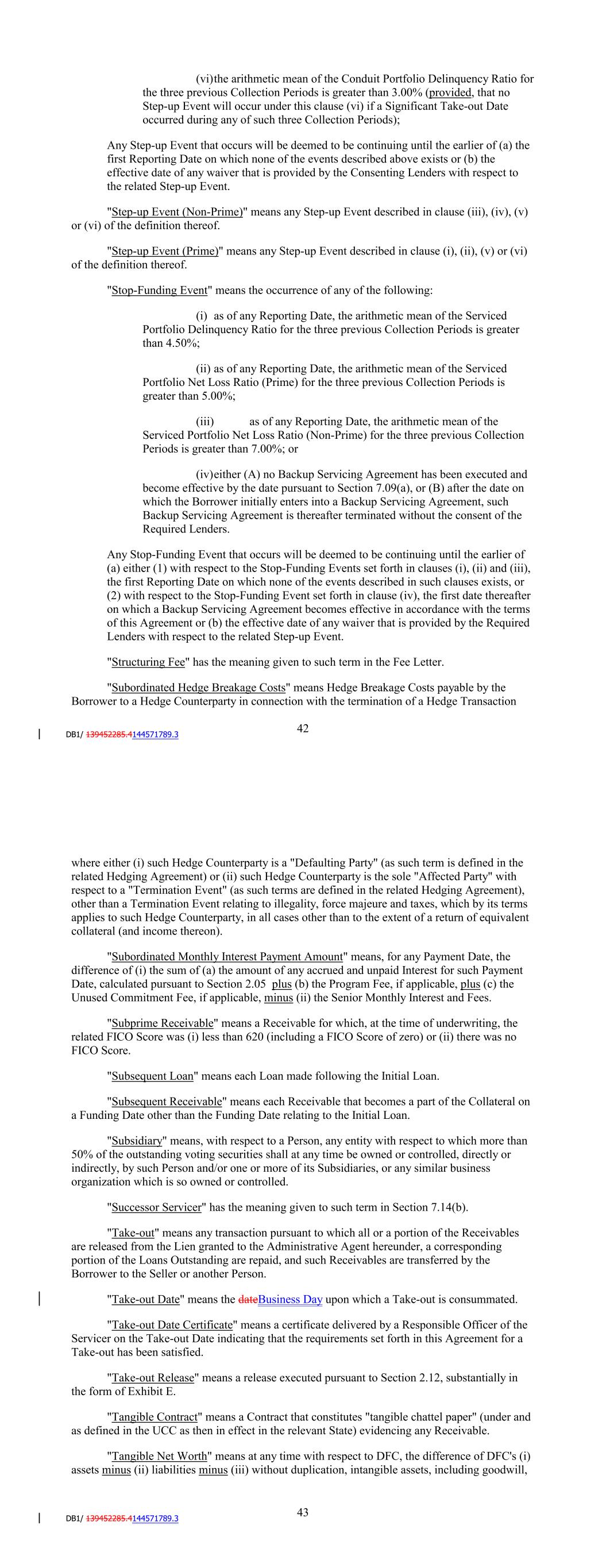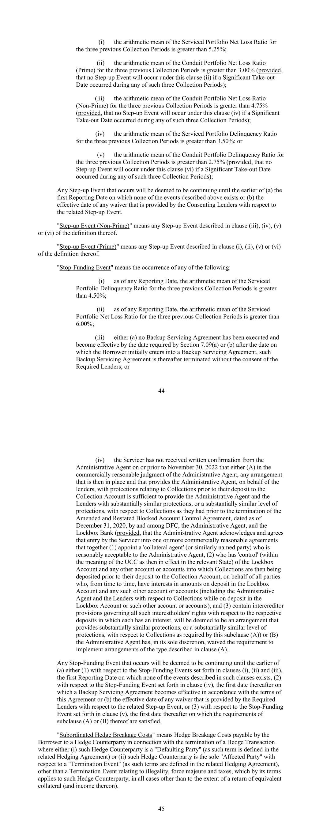 (i) the arithmetic mean of the Serviced Portfolio Net Loss Ratio for the three previous Collection Periods is greater than 5.25%; (ii) the arithmetic mean of the Conduit Portfolio Net Loss Ratio (Prime) for the three previous Collection Periods is greater than 3.00% (provided, that no Step-up Event will occur under this clause (ii) if a Significant Take-out Date occurred during any of such three Collection Periods); (iii) the arithmetic mean of the Conduit Portfolio Net Loss Ratio (Non-Prime) for the three previous Collection Periods is greater than 4.75% (provided, that no Step-up Event will occur under this clause (iv) if a Significant Take-out Date occurred during any of such three Collection Periods); (iv) the arithmetic mean of the Serviced Portfolio Delinquency Ratio for the three previous Collection Periods is greater than 3.50%; or (v) the arithmetic mean of the Conduit Portfolio Delinquency Ratio for the three previous Collection Periods is greater than 2.75% (provided, that no Step-up Event will occur under this clause (vi) if a Significant Take-out Date occurred during any of such three Collection Periods); Any Step-up Event that occurs will be deemed to be continuing until the earlier of (a) the first Reporting Date on which none of the events described above exists or (b) the effective date of any waiver that is provided by the Consenting Lenders with respect to the related Step-up Event. "Step-up Event (Non-Prime)" means any Step-up Event described in clause (iii), (iv), (v) or (vi) of the definition thereof. "Step-up Event (Prime)" means any Step-up Event described in clause (i), (ii), (v) or (vi) of the definition thereof. "Stop-Funding Event" means the occurrence of any of the following: (i) as of any Reporting Date, the arithmetic mean of the Serviced Portfolio Delinquency Ratio for the three previous Collection Periods is greater than 4.50%; (ii) as of any Reporting Date, the arithmetic mean of the Serviced Portfolio Net Loss Ratio for the three previous Collection Periods is greater than 6.00%; (iii) either (a) no Backup Servicing Agreement has been executed and become effective by the date required by Section 7.09(a) or (b) after the date on which the Borrower initially enters into a Backup Servicing Agreement, such Backup Servicing Agreement is thereafter terminated without the consent of the Required Lenders; or 44 (iv) the Servicer has not received written confirmation from the Administrative Agent on or prior to November 30, 2022 that either (A) in the commercially reasonable judgment of the Administrative Agent, any arrangement that is then in place and that provides the Administrative Agent, on behalf of the lenders, with protections relating to Collections prior to their deposit to the Collection Account is sufficient to provide the Administrative Agent and the Lenders with substantially similar protections, or a substantially similar level of protections, with respect to Collections as they had prior to the termination of the Amended and Restated Blocked Account Control Agreement, dated as of December 31, 2020, by and among DFC, the Administrative Agent, and the Lockbox Bank (provided, that the Administrative Agent acknowledges and agrees that entry by the Servicer into one or more commercially reasonable agreements that together (1) appoint a 'collateral agent' (or similarly named party) who is reasonably acceptable to the Administrative Agent, (2) who has 'control' (within the meaning of the UCC as then in effect in the relevant State) of the Lockbox Account and any other account or accounts into which Collections are then being deposited prior to their deposit to the Collection Account, on behalf of all parties who, from time to time, have interests in amounts on deposit in the Lockbox Account and any such other account or accounts (including the Administrative Agent and the Lenders with respect to Collections while on deposit in the Lockbox Account or such other account or accounts), and (3) contain intercreditor provisions governing all such interestholders' rights with respect to the respective deposits in which each has an interest, will be deemed to be an arrangement that provides substantially similar protections, or a substantially similar level of protections, with respect to Collections as required by this subclause (A)) or (B) the Administrative Agent has, in its sole discretion, waived the requirement to implement arrangements of the type described in clause (A). Any Stop-Funding Event that occurs will be deemed to be continuing until the earlier of (a) either (1) with respect to the Stop-Funding Events set forth in clauses (i), (ii) and (iii), the first Reporting Date on which none of the events described in such clauses exists, (2) with respect to the Stop-Funding Event set forth in clause (iv), the first date thereafter on which a Backup Servicing Agreement becomes effective in accordance with the terms of this Agreement or (b) the effective date of any waiver that is provided by the Required Lenders with respect to the related Step-up Event, or (3) with respect to the Stop-Funding Event set forth in clause (v), the first date thereafter on which the requirements of subclause (A) or (B) thereof are satisfied. "Subordinated Hedge Breakage Costs" means Hedge Breakage Costs payable by the Borrower to a Hedge Counterparty in connection with the termination of a Hedge Transaction where either (i) such Hedge Counterparty is a "Defaulting Party" (as such term is defined in the related Hedging Agreement) or (ii) such Hedge Counterparty is the sole "Affected Party" with respect to a "Termination Event" (as such terms are defined in the related Hedging Agreement), other than a Termination Event relating to illegality, force majeure and taxes, which by its terms applies to such Hedge Counterparty, in all cases other than to the extent of a return of equivalent collateral (and income thereon). 45