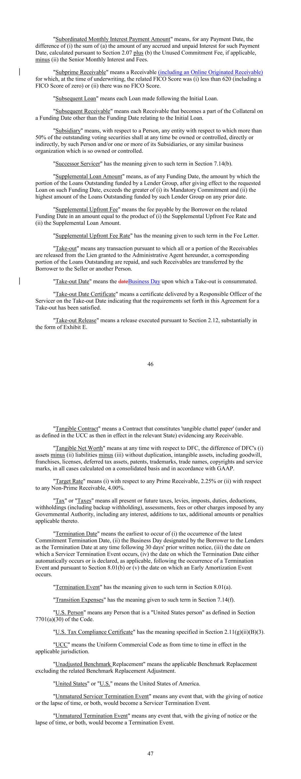 "Subordinated Monthly Interest Payment Amount" means, for any Payment Date, the difference of (i) the sum of (a) the amount of any accrued and unpaid Interest for such Payment Date, calculated pursuant to Section 2.07 plus (b) the Unused Commitment Fee, if applicable, minus (ii) the Senior Monthly Interest and Fees. "Subprime Receivable" means a Receivable (including an Online Originated Receivable) for which, at the time of underwriting, the related FICO Score was (i) less than 620 (including a FICO Score of zero) or (ii) there was no FICO Score. "Subsequent Loan" means each Loan made following the Initial Loan. "Subsequent Receivable" means each Receivable that becomes a part of the Collateral on a Funding Date other than the Funding Date relating to the Initial Loan. "Subsidiary" means, with respect to a Person, any entity with respect to which more than 50% of the outstanding voting securities shall at any time be owned or controlled, directly or indirectly, by such Person and/or one or more of its Subsidiaries, or any similar business organization which is so owned or controlled. "Successor Servicer" has the meaning given to such term in Section 7.14(b). "Supplemental Loan Amount" means, as of any Funding Date, the amount by which the portion of the Loans Outstanding funded by a Lender Group, after giving effect to the requested Loan on such Funding Date, exceeds the greater of (i) its Mandatory Commitment and (ii) the highest amount of the Loans Outstanding funded by such Lender Group on any prior date. "Supplemental Upfront Fee" means the fee payable by the Borrower on the related Funding Date in an amount equal to the product of (i) the Supplemental Upfront Fee Rate and (ii) the Supplemental Loan Amount. "Supplemental Upfront Fee Rate" has the meaning given to such term in the Fee Letter. "Take-out" means any transaction pursuant to which all or a portion of the Receivables are released from the Lien granted to the Administrative Agent hereunder, a corresponding portion of the Loans Outstanding are repaid, and such Receivables are transferred by the Borrower to the Seller or another Person. "Take-out Date" means the dateBusiness Day upon which a Take-out is consummated. "Take-out Date Certificate" means a certificate delivered by a Responsible Officer of the Servicer on the Take-out Date indicating that the requirements set forth in this Agreement for a Take-out has been satisfied. "Take-out Release" means a release executed pursuant to Section 2.12, substantially in the form of Exhibit E. 46 "Tangible Contract" means a Contract that constitutes 'tangible chattel paper' (under and as defined in the UCC as then in effect in the relevant State) evidencing any Receivable. "Tangible Net Worth" means at any time with respect to DFC, the difference of DFC's (i) assets minus (ii) liabilities minus (iii) without duplication, intangible assets, including goodwill, franchises, licenses, deferred tax assets, patents, trademarks, trade names, copyrights and service marks, in all cases calculated on a consolidated basis and in accordance with GAAP. "Target Rate" means (i) with respect to any Prime Receivable, 2.25% or (ii) with respect to any Non-Prime Receivable, 4.00%. "Tax" or "Taxes" means all present or future taxes, levies, imposts, duties, deductions, withholdings (including backup withholding), assessments, fees or other charges imposed by any Governmental Authority, including any interest, additions to tax, additional amounts or penalties applicable thereto. "Termination Date" means the earliest to occur of (i) the occurrence of the latest Commitment Termination Date, (ii) the Business Day designated by the Borrower to the Lenders as the Termination Date at any time following 30 days' prior written notice, (iii) the date on which a Servicer Termination Event occurs, (iv) the date on which the Termination Date either automatically occurs or is declared, as applicable, following the occurrence of a Termination Event and pursuant to Section 8.01(b) or (v) the date on which an Early Amortization Event occurs. "Termination Event" has the meaning given to such term in Section 8.01(a). "Transition Expenses" has the meaning given to such term in Section 7.14(f). "U.S. Person" means any Person that is a "United States person" as defined in Section 7701(a)(30) of the Code. "U.S. Tax Compliance Certificate" has the meaning specified in Section 2.11(g)(ii)(B)(3). "UCC" means the Uniform Commercial Code as from time to time in effect in the applicable jurisdiction. "Unadjusted Benchmark Replacement" means the applicable Benchmark Replacement excluding the related Benchmark Replacement Adjustment. "United States" or "U.S." means the United States of America. "Unmatured Servicer Termination Event" means any event that, with the giving of notice or the lapse of time, or both, would become a Servicer Termination Event. "Unmatured Termination Event" means any event that, with the giving of notice or the lapse of time, or both, would become a Termination Event. 47
