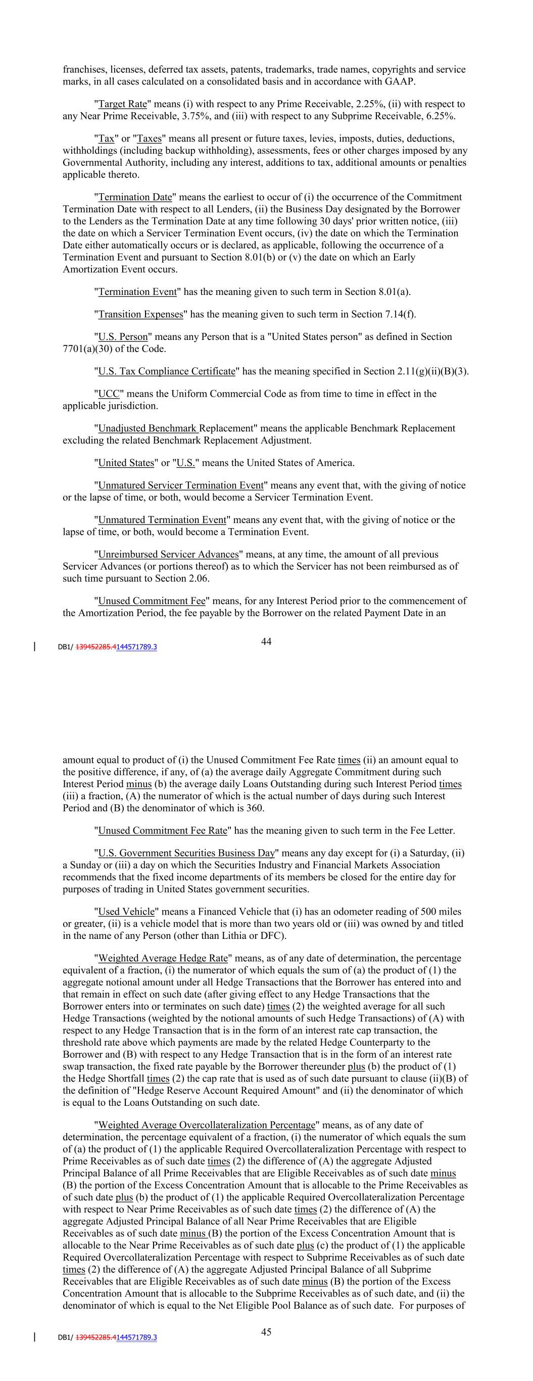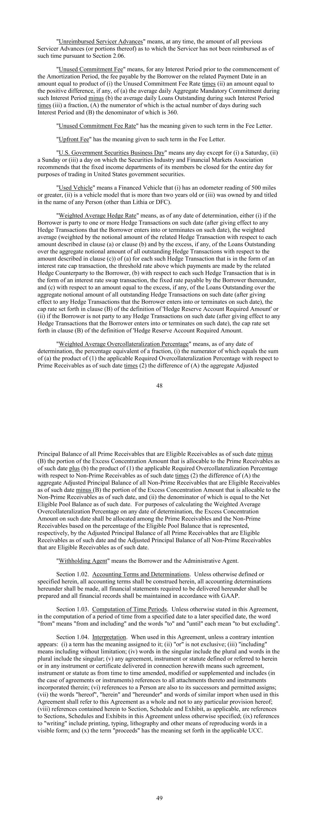 "Unreimbursed Servicer Advances" means, at any time, the amount of all previous Servicer Advances (or portions thereof) as to which the Servicer has not been reimbursed as of such time pursuant to Section 2.06. "Unused Commitment Fee" means, for any Interest Period prior to the commencement of the Amortization Period, the fee payable by the Borrower on the related Payment Date in an amount equal to product of (i) the Unused Commitment Fee Rate times (ii) an amount equal to the positive difference, if any, of (a) the average daily Aggregate Mandatory Commitment during such Interest Period minus (b) the average daily Loans Outstanding during such Interest Period times (iii) a fraction, (A) the numerator of which is the actual number of days during such Interest Period and (B) the denominator of which is 360. "Unused Commitment Fee Rate" has the meaning given to such term in the Fee Letter. "Upfront Fee" has the meaning given to such term in the Fee Letter. "U.S. Government Securities Business Day" means any day except for (i) a Saturday, (ii) a Sunday or (iii) a day on which the Securities Industry and Financial Markets Association recommends that the fixed income departments of its members be closed for the entire day for purposes of trading in United States government securities. "Used Vehicle" means a Financed Vehicle that (i) has an odometer reading of 500 miles or greater, (ii) is a vehicle model that is more than two years old or (iii) was owned by and titled in the name of any Person (other than Lithia or DFC). "Weighted Average Hedge Rate" means, as of any date of determination, either (i) if the Borrower is party to one or more Hedge Transactions on such date (after giving effect to any Hedge Transactions that the Borrower enters into or terminates on such date), the weighted average (weighted by the notional amount of the related Hedge Transaction with respect to each amount described in clause (a) or clause (b) and by the excess, if any, of the Loans Outstanding over the aggregate notional amount of all outstanding Hedge Transactions with respect to the amount described in clause (c)) of (a) for each such Hedge Transaction that is in the form of an interest rate cap transaction, the threshold rate above which payments are made by the related Hedge Counterparty to the Borrower, (b) with respect to each such Hedge Transaction that is in the form of an interest rate swap transaction, the fixed rate payable by the Borrower thereunder, and (c) with respect to an amount equal to the excess, if any, of the Loans Outstanding over the aggregate notional amount of all outstanding Hedge Transactions on such date (after giving effect to any Hedge Transactions that the Borrower enters into or terminates on such date), the cap rate set forth in clause (B) of the definition of 'Hedge Reserve Account Required Amount' or (ii) if the Borrower is not party to any Hedge Transactions on such date (after giving effect to any Hedge Transactions that the Borrower enters into or terminates on such date), the cap rate set forth in clause (B) of the definition of 'Hedge Reserve Account Required Amount. "Weighted Average Overcollateralization Percentage" means, as of any date of determination, the percentage equivalent of a fraction, (i) the numerator of which equals the sum of (a) the product of (1) the applicable Required Overcollateralization Percentage with respect to Prime Receivables as of such date times (2) the difference of (A) the aggregate Adjusted 48 Principal Balance of all Prime Receivables that are Eligible Receivables as of such date minus (B) the portion of the Excess Concentration Amount that is allocable to the Prime Receivables as of such date plus (b) the product of (1) the applicable Required Overcollateralization Percentage with respect to Non-Prime Receivables as of such date times (2) the difference of (A) the aggregate Adjusted Principal Balance of all Non-Prime Receivables that are Eligible Receivables as of such date minus (B) the portion of the Excess Concentration Amount that is allocable to the Non-Prime Receivables as of such date, and (ii) the denominator of which is equal to the Net Eligible Pool Balance as of such date. For purposes of calculating the Weighted Average Overcollateralization Percentage on any date of determination, the Excess Concentration Amount on such date shall be allocated among the Prime Receivables and the Non-Prime Receivables based on the percentage of the Eligible Pool Balance that is represented, respectively, by the Adjusted Principal Balance of all Prime Receivables that are Eligible Receivables as of such date and the Adjusted Principal Balance of all Non-Prime Receivables that are Eligible Receivables as of such date. "Withholding Agent" means the Borrower and the Administrative Agent. Section 1.02. Accounting Terms and Determinations. Unless otherwise defined or specified herein, all accounting terms shall be construed herein, all accounting determinations hereunder shall be made, all financial statements required to be delivered hereunder shall be prepared and all financial records shall be maintained in accordance with GAAP. Section 1.03. Computation of Time Periods. Unless otherwise stated in this Agreement, in the computation of a period of time from a specified date to a later specified date, the word "from" means "from and including" and the words "to" and "until" each mean "to but excluding". Section 1.04. Interpretation. When used in this Agreement, unless a contrary intention appears: (i) a term has the meaning assigned to it; (ii) "or" is not exclusive; (iii) "including" means including without limitation; (iv) words in the singular include the plural and words in the plural include the singular; (v) any agreement, instrument or statute defined or referred to herein or in any instrument or certificate delivered in connection herewith means such agreement, instrument or statute as from time to time amended, modified or supplemented 