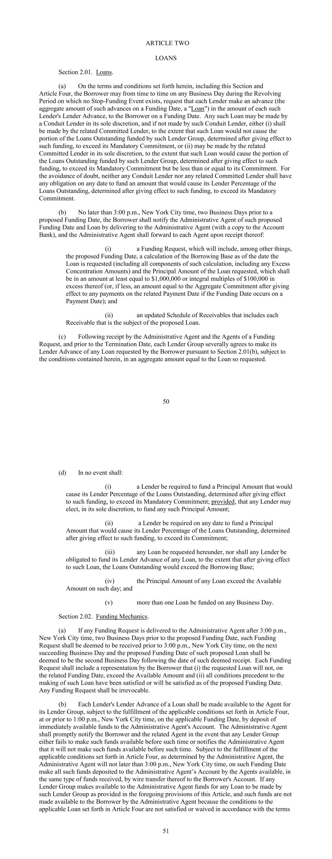 ARTICLE TWO LOANS Section 2.01. Loans. (a) On the terms and conditions set forth herein, including this Section and Article Four, the Borrower may from time to time on any Business Day during the Revolving Period on which no Stop-Funding Event exists, request that each Lender make an advance (the aggregate amount of such advances on a Funding Date, a "Loan") in the amount of each such Lender's Lender Advance, to the Borrower on a Funding Date. Any such Loan may be made by a Conduit Lender in its sole discretion, and if not made by such Conduit Lender, either (i) shall be made by the related Committed Lender, to the extent that such Loan would not cause the portion of the Loans Outstanding funded by such Lender Group, determined after giving effect to such funding, to exceed its Mandatory Commitment, or (ii) may be made by the related Committed Lender in its sole discretion, to the extent that such Loan would cause the portion of the Loans Outstanding funded by such Lender Group, determined after giving effect to such funding, to exceed its Mandatory Commitment but be less than or equal to its Commitment. For the avoidance of doubt, neither any Conduit Lender nor any related Committed Lender shall have any obligation on any date to fund an amount that would cause its Lender Percentage of the Loans Outstanding, determined after giving effect to such funding, to exceed its Mandatory Commitment. (b) No later than 3:00 p.m., New York City time, two Business Days prior to a proposed Funding Date, the Borrower shall notify the Administrative Agent of such proposed Funding Date and Loan by delivering to the Administrative Agent (with a copy to the Account Bank), and the Administrative Agent shall forward to each Agent upon receipt thereof: (i) a Funding Request, which will include, among other things, the proposed Funding Date, a calculation of the Borrowing Base as of the date the Loan is requested (including all components of such calculation, including any Excess Concentration Amounts) and the Principal Amount of the Loan requested, which shall be in an amount at least equal to $1,000,000 or integral multiples of $100,000 in excess thereof (or, if less, an amount equal to the Aggregate Commitment after giving effect to any payments on the related Payment Date if the Funding Date occurs on a Payment Date); and (ii) an updated Schedule of Receivables that includes each Receivable that is the subject of the proposed Loan. (c) Following receipt by the Administrative Agent and the Agents of a Funding Request, and prior to the Termination Date, each Lender Group severally agrees to make its Lender Advance of any Loan requested by the Borrower pursuant to Section 2.01(b), subject to the conditions contained herein, in an aggregate amount equal to the Loan so requested. 50 (d) In no event shall: (i) a Lender be required to fund a Principal Amount that would cause its Lender Percentage of the Loans Outstanding, determined after giving effect to such funding, to exceed its Mandatory Commitment; provided, that any Lender may elect, in its sole discretion, to fund any such Principal Amount; (ii) a Lender be required on any date to fund a Principal Amount that would cause its Lender Percentage of the Loans Outstanding, determined after giving effect to such funding, to exceed its Commitment; (iii) any Loan be requested hereunder, nor shall any Lender be obligated to fund its Lender Advance of any Loan, to the extent that after giving effect to such Loan, the Loans Outstanding would exceed the Borrowing Base; (iv) the Principal Amount of any Loan exceed the Available Amount on such day; and (v) more than one Loan be funded on any Business Day. Section 2.02. Funding Mechanics. (a) If any Funding Request is delivered to the Administrative Agent after 3:00 p.m., New York City time, two Business Days prior to the proposed Funding Date, such Funding Request shall be deemed to be received prior to 3:00 p.m., New York City time, on the next succeeding Business Day and the proposed Funding Date of such proposed Loan shall be deemed to be the second Business Day following the date of such deemed receipt. Each Funding Request shall include a representation by the Borrower that (i) the requested Loan will not, on the related Funding Date, exceed the Available Amount and (ii) all conditions precedent to the making of such Loan have been satisfied or will be satisfied as of the proposed Funding Date. Any Funding Request shall be irrevocable. (b) Each Lender's Lender Advance of a Loan shall be made available to the Agent for its Lender Group, subject to the fulfillment of the applicable conditions set forth in Article Four, at or prior to 1:00 p.m., New York City time, on the applicable Funding Date, by deposit of immediately available funds to the Administrative Agent's Account. The Administrative Agent shall promptly notify the Borrower and the related Agent in the event that any Lender Group either fails to make such funds available before such time or notifies the Administrative Agent that it will not make such funds available before such time. Subject to the fulfillment of the applicable conditions set forth in Article Four, as determined by the Administrative Agent, the Administrative Agent will not later than 3:00 p.m., New York City time, on such Funding Date make all such funds deposited to the Administrative Agent’s Account by the Agents available, in the same type of funds received, by wire transfer thereof to the Borrower's Account. If any Lender Group makes available to the Administrative Agent funds for any Loan to be made by such Lender Group as provided in the foregoing provisions of this Article, and such funds are not made available to the Borrower by the Administrative Agent because the conditions to the applicable Loan set forth in Article Four are not satisfied or waived in accordance with the terms 51