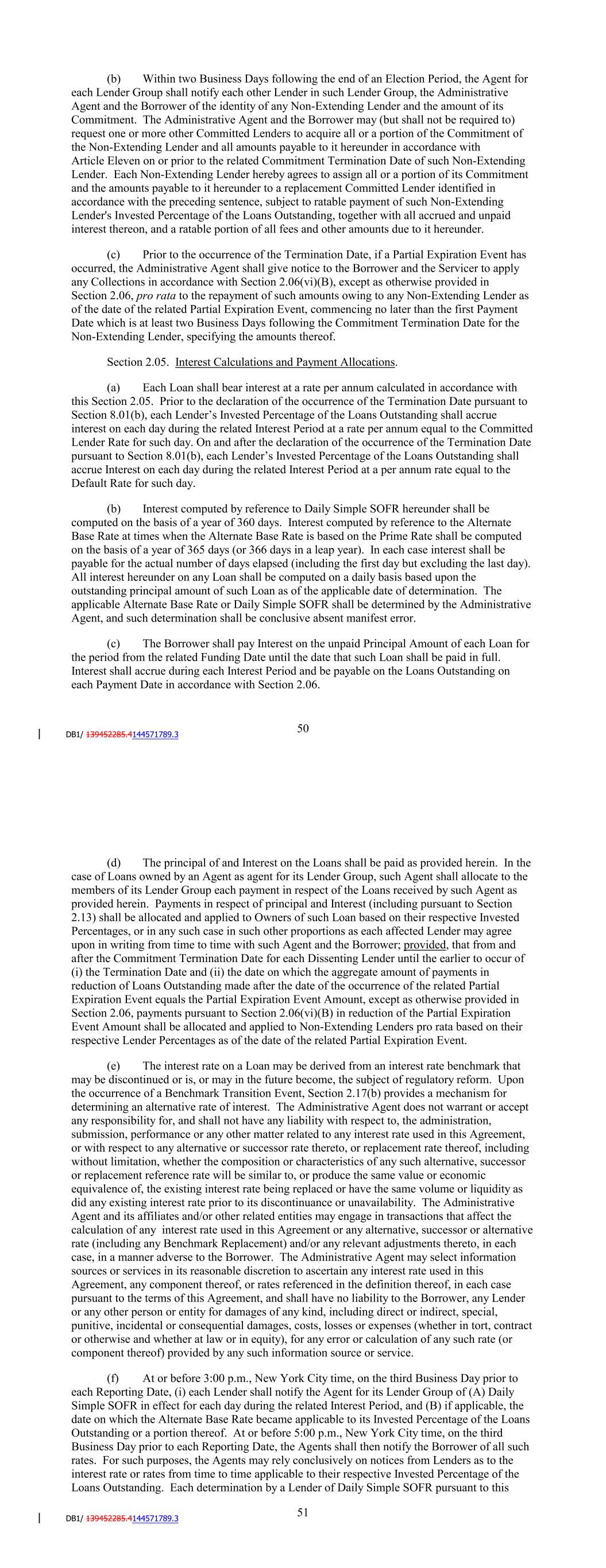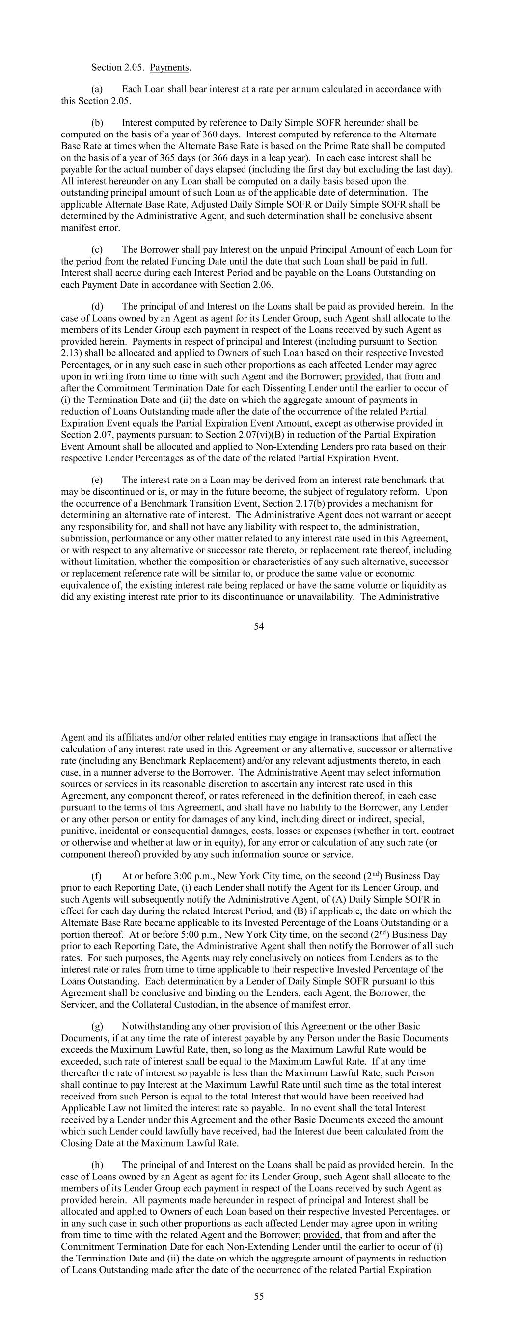 Section 2.05. Payments. (a) Each Loan shall bear interest at a rate per annum calculated in accordance with this Section 2.05. (b) Interest computed by reference to Daily Simple SOFR hereunder shall be computed on the basis of a year of 360 days. Interest computed by reference to the Alternate Base Rate at times when the Alternate Base Rate is based on the Prime Rate shall be computed on the basis of a year of 365 days (or 366 days in a leap year). In each case interest shall be payable for the actual number of days elapsed (including the first day but excluding the last day). All interest hereunder on any Loan shall be computed on a daily basis based upon the outstanding principal amount of such Loan as of the applicable date of determination. The applicable Alternate Base Rate, Adjusted Daily Simple SOFR or Daily Simple SOFR shall be determined by the Administrative Agent, and such determination shall be conclusive absent manifest error. (c) The Borrower shall pay Interest on the unpaid Principal Amount of each Loan for the period from the related Funding Date until the date that such Loan shall be paid in full. Interest shall accrue during each Interest Period and be payable on the Loans Outstanding on each Payment Date in accordance with Section 2.06. (d) The principal of and Interest on the Loans shall be paid as provided herein. In the case of Loans owned by an Agent as agent for its Lender Group, such Agent shall allocate to the members of its Lender Group each payment in respect of the Loans received by such Agent as provided herein. Payments in respect of principal and Interest (including pursuant to Section 2.13) shall be allocated and applied to Owners of such Loan based on their respective Invested Percentages, or in any such case in such other proportions as each affected Lender may agree upon in writing from time to time with such Agent and the Borrower; provided, that from and after the Commitment Termination Date for each Dissenting Lender until the earlier to occur of (i) the Termination Date and (ii) the date on which the aggregate amount of payments in reduction of Loans Outstanding made after the date of the occurrence of the related Partial Expiration Event equals the Partial Expiration Event Amount, except as otherwise provided in Section 2.07, payments pursuant to Section 2.07(vi)(B) in reduction of the Partial Expiration Event Amount shall be allocated and applied to Non-Extending Lenders pro rata based on their respective Lender Percentages as of the date of the related Partial Expiration Event. (e) The interest rate on a Loan may be derived from an interest rate benchmark that may be discontinued or is, or may in the future become, the subject of regulatory reform. Upon the occurrence of a Benchmark Transition Event, Section 2.17(b) provides a mechanism for determining an alternative rate of interest. The Administrative Agent does not warrant or accept any responsibility for, and shall not have any liability with respect to, the administration, submission, performance or any other matter related to any interest rate used in this Agreement, or with respect to any alternative or successor rate thereto, or replacement rate thereof, including without limitation, whether the composition or characteristics of any such alternative, successor or replacement reference rate will be similar to, or produce the same value or economic equivalence of, the existing interest rate being replaced or have the same volume or liquidity as did any existing interest rate prior to its discontinuance or unavailability. The Administrative 54 Agent and its affiliates and/or other related entities may engage in transactions that affect the calculation of any interest rate used in this Agreement or any alternative, successor or alternative rate (including any Benchmark Replacement) and/or any relevant adjustments thereto, in each case, in a manner adverse to the Borrower. The Administrative Agent may select information sources or services in its reasonable discretion to ascertain any interest rate used in this Agreement, any component thereof, or rates referenced in the definition thereof, in each case pursuant to the terms of this Agreement, and shall have no liability to the Borrower, any Lender or any other person or entity for damages of any kind, including direct or indirect, special, punitive, incidental or consequential damages, costs, losses or expenses (whether in tort, contract or otherwise and whether at law or in equity), for any error or calculation of any such rate (or component thereof) provided by any such information source or service. (f) At or before 3:00 p.m., New York City time, on the second (2nd) Business Day prior to each Reporting Date, (i) each Lender shall notify the Agent for its Lender Group, and such Agents will subsequently notify the Administrative Agent, of (A) Daily Simple SOFR in effect for each day during the related Interest Period, and (B) if applicable, the date on which the Alternate Base Rate became applicable to its Invested Percentage of the Loans Outstanding or a portion thereof. At or before 5:00 p.m., New York City time, on the second (2nd) Business Day prior to each Reporting Date, the Administrative Agent shall then notify the Borrower of all such rates. For such purposes, the Agents may rely conclusively on notices from Lenders as to the interest rate or rates from time to time applicable to their respective Invested Percentage of the Loans Outstanding. Each determination by a Lender of Daily Simple SOFR pursuant to this Agreement shall be conclusive and binding on the Lenders, each Agent, the Borrower, the Servicer, and the Collateral Custodian, in the absence of manifest error. (g) Notwithstanding any other provision of this Agreement or the other Basic Documents, if at any time the rate of interest payable by any Person under the Basic Documents exceeds the Maximum Lawful Rate, then, so long as the Maximum Lawful Rate would be exceeded, suc