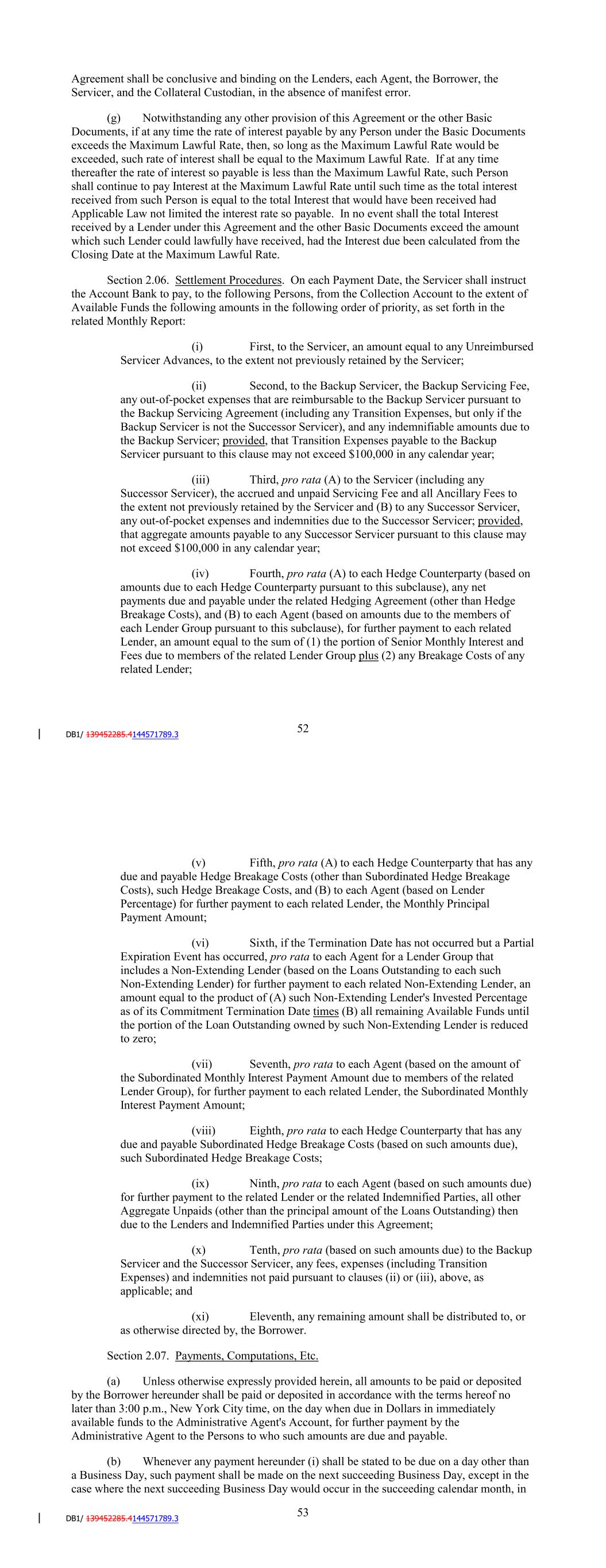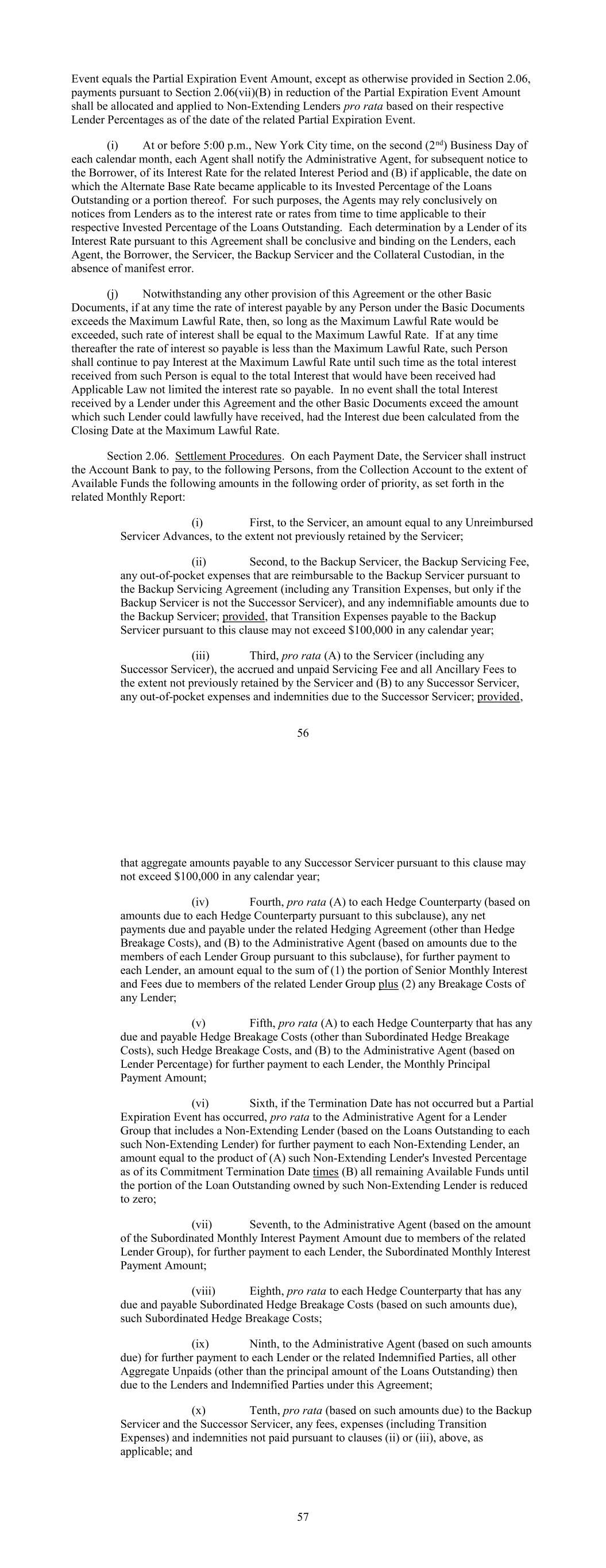 Event equals the Partial Expiration Event Amount, except as otherwise provided in Section 2.06, payments pursuant to Section 2.06(vii)(B) in reduction of the Partial Expiration Event Amount shall be allocated and applied to Non-Extending Lenders pro rata based on their respective Lender Percentages as of the date of the related Partial Expiration Event. (i) At or before 5:00 p.m., New York City time, on the second (2nd) Business Day of each calendar month, each Agent shall notify the Administrative Agent, for subsequent notice to the Borrower, of its Interest Rate for the related Interest Period and (B) if applicable, the date on which the Alternate Base Rate became applicable to its Invested Percentage of the Loans Outstanding or a portion thereof. For such purposes, the Agents may rely conclusively on notices from Lenders as to the interest rate or rates from time to time applicable to their respective Invested Percentage of the Loans Outstanding. Each determination by a Lender of its Interest Rate pursuant to this Agreement shall be conclusive and binding on the Lenders, each Agent, the Borrower, the Servicer, the Backup Servicer and the Collateral Custodian, in the absence of manifest error. (j) Notwithstanding any other provision of this Agreement or the other Basic Documents, if at any time the rate of interest payable by any Person under the Basic Documents exceeds the Maximum Lawful Rate, then, so long as the Maximum Lawful Rate would be exceeded, such rate of interest shall be equal to the Maximum Lawful Rate. If at any time thereafter the rate of interest so payable is less than the Maximum Lawful Rate, such Person shall continue to pay Interest at the Maximum Lawful Rate until such time as the total interest received from such Person is equal to the total Interest that would have been received had Applicable Law not limited the interest rate so payable. In no event shall the total Interest received by a Lender under this Agreement and the other Basic Documents exceed the amount which such Lender could lawfully have received, had the Interest due been calculated from the Closing Date at the Maximum Lawful Rate. Section 2.06. Settlement Procedures. On each Payment Date, the Servicer shall instruct the Account Bank to pay, to the following Persons, from the Collection Account to the extent of Available Funds the following amounts in the following order of priority, as set forth in the related Monthly Report: (i) First, to the Servicer, an amount equal to any Unreimbursed Servicer Advances, to the extent not previously retained by the Servicer; (ii) Second, to the Backup Servicer, the Backup Servicing Fee, any out-of-pocket expenses that are reimbursable to the Backup Servicer pursuant to the Backup Servicing Agreement (including any Transition Expenses, but only if the Backup Servicer is not the Successor Servicer), and any indemnifiable amounts due to the Backup Servicer; provided, that Transition Expenses payable to the Backup Servicer pursuant to this clause may not exceed $100,000 in any calendar year; (iii) Third, pro rata (A) to the Servicer (including any Successor Servicer), the accrued and unpaid Servicing Fee and all Ancillary Fees to the extent not previously retained by the Servicer and (B) to any Successor Servicer, any out-of-pocket expenses and indemnities due to the Successor Servicer; provided, 56 that aggregate amounts payable to any Successor Servicer pursuant to this clause may not exceed $100,000 in any calendar year; (iv) Fourth, pro rata (A) to each Hedge Counterparty (based on amounts due to each Hedge Counterparty pursuant to this subclause), any net payments due and payable under the related Hedging Agreement (other than Hedge Breakage Costs), and (B) to the Administrative Agent (based on amounts due to the members of each Lender Group pursuant to this subclause), for further payment to each Lender, an amount equal to the sum of (1) the portion of Senior Monthly Interest and Fees due to members of the related Lender Group plus (2) any Breakage Costs of any Lender; (v) Fifth, pro rata (A) to each Hedge Counterparty that has any due and payable Hedge Breakage Costs (other than Subordinated Hedge Breakage Costs), such Hedge Breakage Costs, and (B) to the Administrative Agent (based on Lender Percentage) for further payment to each Lender, the Monthly Principal Payment Amount; (vi) Sixth, if the Termination Date has not occurred but a Partial Expiration Event has occurred, pro rata to the Administrative Agent for a Lender Group that includes a Non-Extending Lender (based on the Loans Outstanding to each such Non-Extending Lender) for further payment to each Non-Extending Lender, an amount equal to the product of (A) such Non-Extending Lender's Invested Percentage as of its Commitment Termination Date times (B) all remaining Available Funds until the portion of the Loan Outstanding owned by such Non-Extending Lender is reduced to zero; (vii) Seventh, to the Administrative Agent (based on the amount of the Subordinated Monthly Interest Payment Amount due to members of the related Lender Group), for further payment to each Lender, the Subordinated Monthly Interest Payment Amount; (viii) Eighth, pro rata to each Hedge Counterparty that has any due and payable Subordinated Hedge Breakage Costs (based on such amounts due), such Subordinated Hedge Breakage Costs; (ix) Ninth, to the Administrative Agent (based on such amounts due) for further payment to each Lender or the related Indemnified Parties, all other Aggregate Unpaids (other than the principal amount of the Loans Outstanding) then due to the Lenders and Indemnified Parties under this Agreement; (x) Tenth, pro rata (based on such amounts due) to the Backup Servicer and the Successor Servicer, any fees, expenses (including Transition Expenses) and indemnities not paid pursuant to clauses (ii) or (iii), above, as applicable; and 57