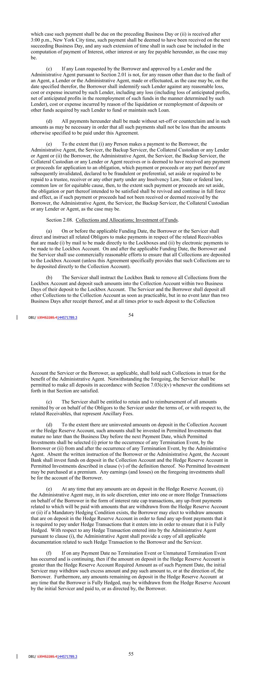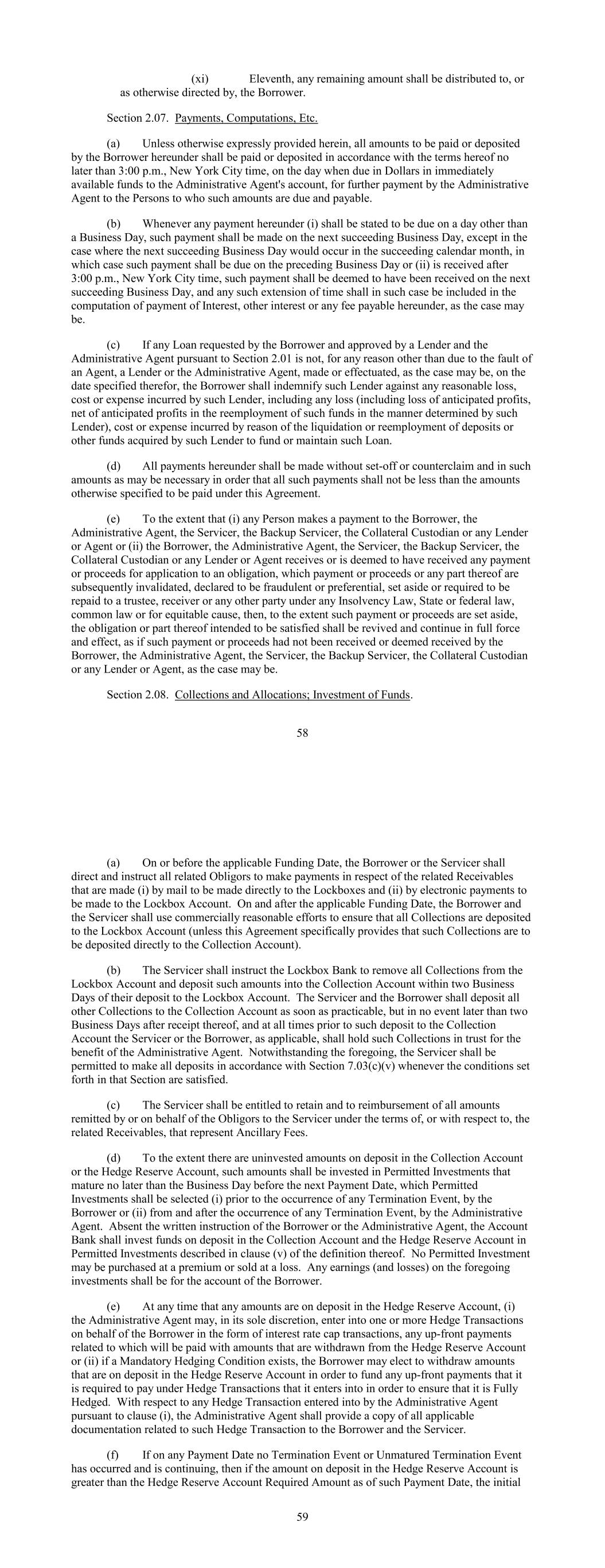 (xi) Eleventh, any remaining amount shall be distributed to, or as otherwise directed by, the Borrower. Section 2.07. Payments, Computations, Etc. (a) Unless otherwise expressly provided herein, all amounts to be paid or deposited by the Borrower hereunder shall be paid or deposited in accordance with the terms hereof no later than 3:00 p.m., New York City time, on the day when due in Dollars in immediately available funds to the Administrative Agent's account, for further payment by the Administrative Agent to the Persons to who such amounts are due and payable. (b) Whenever any payment hereunder (i) shall be stated to be due on a day other than a Business Day, such payment shall be made on the next succeeding Business Day, except in the case where the next succeeding Business Day would occur in the succeeding calendar month, in which case such payment shall be due on the preceding Business Day or (ii) is received after 3:00 p.m., New York City time, such payment shall be deemed to have been received on the next succeeding Business Day, and any such extension of time shall in such case be included in the computation of payment of Interest, other interest or any fee payable hereunder, as the case may be. (c) If any Loan requested by the Borrower and approved by a Lender and the Administrative Agent pursuant to Section 2.01 is not, for any reason other than due to the fault of an Agent, a Lender or the Administrative Agent, made or effectuated, as the case may be, on the date specified therefor, the Borrower shall indemnify such Lender against any reasonable loss, cost or expense incurred by such Lender, including any loss (including loss of anticipated profits, net of anticipated profits in the reemployment of such funds in the manner determined by such Lender), cost or expense incurred by reason of the liquidation or reemployment of deposits or other funds acquired by such Lender to fund or maintain such Loan. (d) All payments hereunder shall be made without set-off or counterclaim and in such amounts as may be necessary in order that all such payments shall not be less than the amounts otherwise specified to be paid under this Agreement. (e) To the extent that (i) any Person makes a payment to the Borrower, the Administrative Agent, the Servicer, the Backup Servicer, the Collateral Custodian or any Lender or Agent or (ii) the Borrower, the Administrative Agent, the Servicer, the Backup Servicer, the Collateral Custodian or any Lender or Agent receives or is deemed to have received any payment or proceeds for application to an obligation, which payment or proceeds or any part thereof are subsequently invalidated, declared to be fraudulent or preferential, set aside or required to be repaid to a trustee, receiver or any other party under any Insolvency Law, State or federal law, common law or for equitable cause, then, to the extent such payment or proceeds are set aside, the obligation or part thereof intended to be satisfied shall be revived and continue in full force and effect, as if such payment or proceeds had not been received or deemed received by the Borrower, the Administrative Agent, the Servicer, the Backup Servicer, the Collateral Custodian or any Lender or Agent, as the case may be. Section 2.08. Collections and Allocations; Investment of Funds. 58 (a) On or before the applicable Funding Date, the Borrower or the Servicer shall direct and instruct all related Obligors to make payments in respect of the related Receivables that are made (i) by mail to be made directly to the Lockboxes and (ii) by electronic payments to be made to the Lockbox Account. On and after the applicable Funding Date, the Borrower and the Servicer shall use commercially reasonable efforts to ensure that all Collections are deposited to the Lockbox Account (unless this Agreement specifically provides that such Collections are to be deposited directly to the Collection Account). (b) The Servicer shall instruct the Lockbox Bank to remove all Collections from the Lockbox Account and deposit such amounts into the Collection Account within two Business Days of their deposit to the Lockbox Account. The Servicer and the Borrower shall deposit all other Collections to the Collection Account as soon as practicable, but in no event later than two Business Days after receipt thereof, and at all times prior to such deposit to the Collection Account the Servicer or the Borrower, as applicable, shall hold such Collections in trust for the benefit of the Administrative Agent. Notwithstanding the foregoing, the Servicer shall be permitted to make all deposits in accordance with Section 7.03(c)(v) whenever the conditions set forth in that Section are satisfied. (c) The Servicer shall be entitled to retain and to reimbursement of all amounts remitted by or on behalf of the Obligors to the Servicer under the terms of, or with respect to, the related Receivables, that represent Ancillary Fees. (d) To the extent there are uninvested amounts on deposit in the Collection Account or the Hedge Reserve Account, such amounts shall be invested in Permitted Investments that mature no later than the Business Day before the next Payment Date, which Permitted Investments shall be selected (i) prior to the occurrence of any Termination Event, by the Borrower or (ii) from and after the occurrence of any Termination Event, by the Administrative Agent. Absent the written instruction of the Borrower or the Administrative Agent, the Account Bank shall invest funds on deposit in the Collection Account and the Hedge Reserve Account in Permitted Investments described in clause (v) of the definition thereof. No Permitted Investment may be purchased at a premium or sold at a loss. Any earnings (and losses) on the foregoing investments shall be for the account of the Borrower. (e) At any time that any amounts are on deposit in the Hedge Reserve Account, (i) the Administrative Agent may, in its sole discretion, enter into one or more Hedge Transa