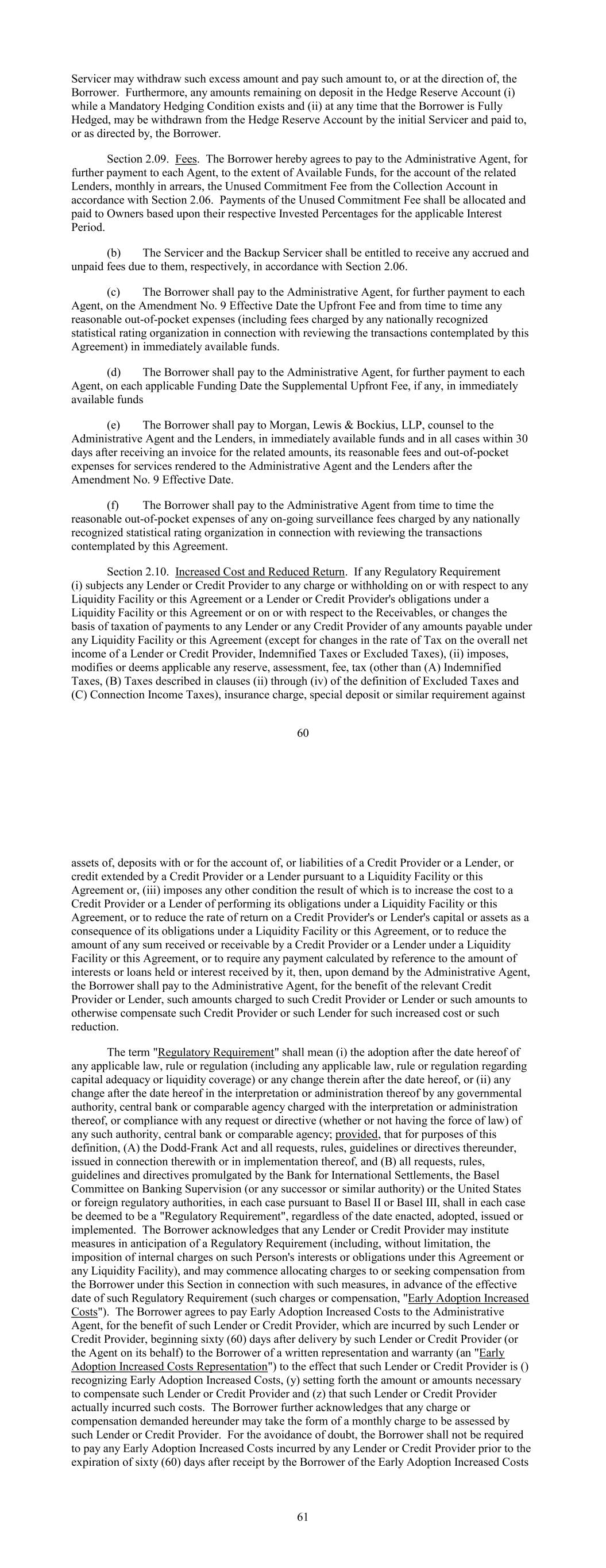 Servicer may withdraw such excess amount and pay such amount to, or at the direction of, the Borrower. Furthermore, any amounts remaining on deposit in the Hedge Reserve Account (i) while a Mandatory Hedging Condition exists and (ii) at any time that the Borrower is Fully Hedged, may be withdrawn from the Hedge Reserve Account by the initial Servicer and paid to, or as directed by, the Borrower. Section 2.09. Fees. The Borrower hereby agrees to pay to the Administrative Agent, for further payment to each Agent, to the extent of Available Funds, for the account of the related Lenders, monthly in arrears, the Unused Commitment Fee from the Collection Account in accordance with Section 2.06. Payments of the Unused Commitment Fee shall be allocated and paid to Owners based upon their respective Invested Percentages for the applicable Interest Period. (b) The Servicer and the Backup Servicer shall be entitled to receive any accrued and unpaid fees due to them, respectively, in accordance with Section 2.06. (c) The Borrower shall pay to the Administrative Agent, for further payment to each Agent, on the Amendment No. 9 Effective Date the Upfront Fee and from time to time any reasonable out-of-pocket expenses (including fees charged by any nationally recognized statistical rating organization in connection with reviewing the transactions contemplated by this Agreement) in immediately available funds. (d) The Borrower shall pay to the Administrative Agent, for further payment to each Agent, on each applicable Funding Date the Supplemental Upfront Fee, if any, in immediately available funds (e) The Borrower shall pay to Morgan, Lewis & Bockius, LLP, counsel to the Administrative Agent and the Lenders, in immediately available funds and in all cases within 30 days after receiving an invoice for the related amounts, its reasonable fees and out-of-pocket expenses for services rendered to the Administrative Agent and the Lenders after the Amendment No. 9 Effective Date. (f) The Borrower shall pay to the Administrative Agent from time to time the reasonable out-of-pocket expenses of any on-going surveillance fees charged by any nationally recognized statistical rating organization in connection with reviewing the transactions contemplated by this Agreement. Section 2.10. Increased Cost and Reduced Return. If any Regulatory Requirement (i) subjects any Lender or Credit Provider to any charge or withholding on or with respect to any Liquidity Facility or this Agreement or a Lender or Credit Provider's obligations under a Liquidity Facility or this Agreement or on or with respect to the Receivables, or changes the basis of taxation of payments to any Lender or any Credit Provider of any amounts payable under any Liquidity Facility or this Agreement (except for changes in the rate of Tax on the overall net income of a Lender or Credit Provider, Indemnified Taxes or Excluded Taxes), (ii) imposes, modifies or deems applicable any reserve, assessment, fee, tax (other than (A) Indemnified Taxes, (B) Taxes described in clauses (ii) through (iv) of the definition of Excluded Taxes and (C) Connection Income Taxes), insurance charge, special deposit or similar requirement against 60 assets of, deposits with or for the account of, or liabilities of a Credit Provider or a Lender, or credit extended by a Credit Provider or a Lender pursuant to a Liquidity Facility or this Agreement or, (iii) imposes any other condition the result of which is to increase the cost to a Credit Provider or a Lender of performing its obligations under a Liquidity Facility or this Agreement, or to reduce the rate of return on a Credit Provider's or Lender's capital or assets as a consequence of its obligations under a Liquidity Facility or this Agreement, or to reduce the amount of any sum received or receivable by a Credit Provider or a Lender under a Liquidity Facility or this Agreement, or to require any payment calculated by reference to the amount of interests or loans held or interest received by it, then, upon demand by the Administrative Agent, the Borrower shall pay to the Administrative Agent, for the benefit of the relevant Credit Provider or Lender, such amounts charged to such Credit Provider or Lender or such amounts to otherwise compensate such Credit Provider or such Lender for such increased cost or such reduction. The term "Regulatory Requirement" shall mean (i) the adoption after the date hereof of any applicable law, rule or regulation (including any applicable law, rule or regulation regarding capital adequacy or liquidity coverage) or any change therein after the date hereof, or (ii) any change after the date hereof in the interpretation or administration thereof by any governmental authority, central bank or comparable agency charged with the interpretation or administration thereof, or compliance with any request or directive (whether or not having the force of law) of any such authority, central bank or comparable agency; provided, that for purposes of this definition, (A) the Dodd-Frank Act and all requests, rules, guidelines or directives thereunder, issued in connection therewith or in implementation thereof, and (B) all requests, rules, guidelines and directives promulgated by the Bank for International Settlements, the Basel Committee on Banking Supervision (or any successor or similar authority) or the United States or foreign regulatory authorities, in each case pursuant to Basel II or Basel III, shall in each case be deemed to be a "Regulatory Requirement", regardless of the date enacted, adopted, issued or implemented. The Borrower acknowledges that any Lender or Credit Provider may institute measures in anticipation of a Regulatory Requirement (including, without limitation, the imposition of internal charges on such Person's interests or obligations under this Agreement or any Liquidity Facility), and may commence allocating charges to or seeking compensation from the Borrower under this Section in conn