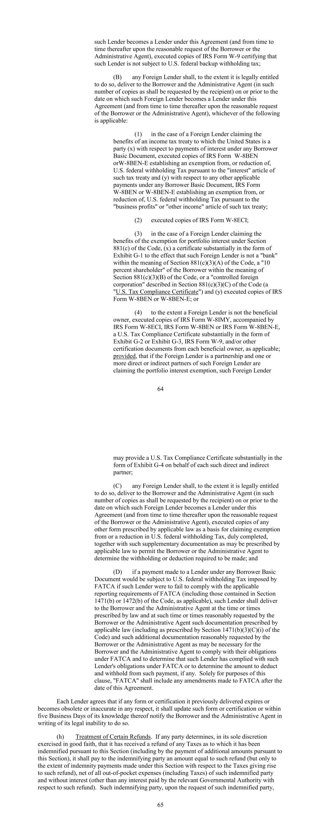 such Lender becomes a Lender under this Agreement (and from time to time thereafter upon the reasonable request of the Borrower or the Administrative Agent), executed copies of IRS Form W-9 certifying that such Lender is not subject to U.S. federal backup withholding tax; (B) any Foreign Lender shall, to the extent it is legally entitled to do so, deliver to the Borrower and the Administrative Agent (in such number of copies as shall be requested by the recipient) on or prior to the date on which such Foreign Lender becomes a Lender under this Agreement (and from time to time thereafter upon the reasonable request of the Borrower or the Administrative Agent), whichever of the following is applicable: (1) in the case of a Foreign Lender claiming the benefits of an income tax treaty to which the United States is a party (x) with respect to payments of interest under any Borrower Basic Document, executed copies of IRS Form W-8BEN orW-8BEN-E establishing an exemption from, or reduction of, U.S. federal withholding Tax pursuant to the "interest" article of such tax treaty and (y) with respect to any other applicable payments under any Borrower Basic Document, IRS Form W-8BEN or W-8BEN-E establishing an exemption from, or reduction of, U.S. federal withholding Tax pursuant to the "business profits" or "other income" article of such tax treaty; (2) executed copies of IRS Form W-8ECI; (3) in the case of a Foreign Lender claiming the benefits of the exemption for portfolio interest under Section 881(c) of the Code, (x) a certificate substantially in the form of Exhibit G-1 to the effect that such Foreign Lender is not a "bank" within the meaning of Section 881(c)(3)(A) of the Code, a "10 percent shareholder" of the Borrower within the meaning of Section 881(c)(3)(B) of the Code, or a "controlled foreign corporation" described in Section 881(c)(3)(C) of the Code (a "U.S. Tax Compliance Certificate") and (y) executed copies of IRS Form W-8BEN or W-8BEN-E; or (4) to the extent a Foreign Lender is not the beneficial owner, executed copies of IRS Form W-8IMY, accompanied by IRS Form W-8ECI, IRS Form W-8BEN or IRS Form W-8BEN-E, a U.S. Tax Compliance Certificate substantially in the form of Exhibit G-2 or Exhibit G-3, IRS Form W-9, and/or other certification documents from each beneficial owner, as applicable; provided, that if the Foreign Lender is a partnership and one or more direct or indirect partners of such Foreign Lender are claiming the portfolio interest exemption, such Foreign Lender 64 may provide a U.S. Tax Compliance Certificate substantially in the form of Exhibit G-4 on behalf of each such direct and indirect partner; (C) any Foreign Lender shall, to the extent it is legally entitled to do so, deliver to the Borrower and the Administrative Agent (in such number of copies as shall be requested by the recipient) on or prior to the date on which such Foreign Lender becomes a Lender under this Agreement (and from time to time thereafter upon the reasonable request of the Borrower or the Administrative Agent), executed copies of any other form prescribed by applicable law as a basis for claiming exemption from or a reduction in U.S. federal withholding Tax, duly completed, together with such supplementary documentation as may be prescribed by applicable law to permit the Borrower or the Administrative Agent to determine the withholding or deduction required to be made; and (D) if a payment made to a Lender under any Borrower Basic Document would be subject to U.S. federal withholding Tax imposed by FATCA if such Lender were to fail to comply with the applicable reporting requirements of FATCA (including those contained in Section 1471(b) or 1472(b) of the Code, as applicable), such Lender shall deliver to the Borrower and the Administrative Agent at the time or times prescribed by law and at such time or times reasonably requested by the Borrower or the Administrative Agent such documentation prescribed by applicable law (including as prescribed by Section 1471(b)(3)(C)(i) of the Code) and such additional documentation reasonably requested by the Borrower or the Administrative Agent as may be necessary for the Borrower and the Administrative Agent to comply with their obligations under FATCA and to determine that such Lender has complied with such Lender's obligations under FATCA or to determine the amount to deduct and withhold from such payment, if any. Solely for purposes of this clause, "FATCA" shall include any amendments made to FATCA after the date of this Agreement. Each Lender agrees that if any form or certification it previously delivered expires or becomes obsolete or inaccurate in any respect, it shall update such form or certification or within five Business Days of its knowledge thereof notify the Borrower and the Administrative Agent in writing of its legal inability to do so. (h) Treatment of Certain Refunds. If any party determines, in its sole discretion exercised in good faith, that it has received a refund of any Taxes as to which it has been indemnified pursuant to this Section (including by the payment of additional amounts pursuant to this Section), it shall pay to the indemnifying party an amount equal to such refund (but only to the extent of indemnity payments made under this Section with respect to the Taxes giving rise to such refund), net of all out-of-pocket expenses (including Taxes) of such indemnified party and without interest (other than any interest paid by the relevant Governmental Authority with respect to such refund). Such indemnifying party, upon the request of such indemnified party, 65