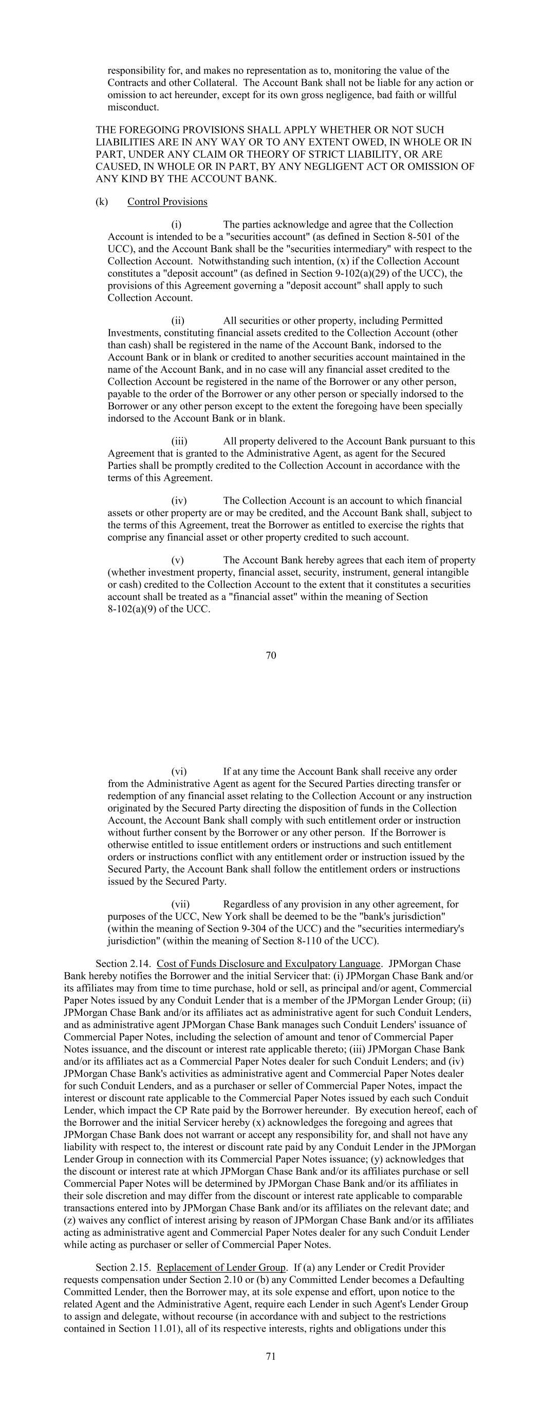 responsibility for, and makes no representation as to, monitoring the value of the Contracts and other Collateral. The Account Bank shall not be liable for any action or omission to act hereunder, except for its own gross negligence, bad faith or willful misconduct. THE FOREGOING PROVISIONS SHALL APPLY WHETHER OR NOT SUCH LIABILITIES ARE IN ANY WAY OR TO ANY EXTENT OWED, IN WHOLE OR IN PART, UNDER ANY CLAIM OR THEORY OF STRICT LIABILITY, OR ARE CAUSED, IN WHOLE OR IN PART, BY ANY NEGLIGENT ACT OR OMISSION OF ANY KIND BY THE ACCOUNT BANK. (k) Control Provisions (i) The parties acknowledge and agree that the Collection Account is intended to be a "securities account" (as defined in Section 8-501 of the UCC), and the Account Bank shall be the "securities intermediary" with respect to the Collection Account. Notwithstanding such intention, (x) if the Collection Account constitutes a "deposit account" (as defined in Section 9-102(a)(29) of the UCC), the provisions of this Agreement governing a "deposit account" shall apply to such Collection Account. (ii) All securities or other property, including Permitted Investments, constituting financial assets credited to the Collection Account (other than cash) shall be registered in the name of the Account Bank, indorsed to the Account Bank or in blank or credited to another securities account maintained in the name of the Account Bank, and in no case will any financial asset credited to the Collection Account be registered in the name of the Borrower or any other person, payable to the order of the Borrower or any other person or specially indorsed to the Borrower or any other person except to the extent the foregoing have been specially indorsed to the Account Bank or in blank. (iii) All property delivered to the Account Bank pursuant to this Agreement that is granted to the Administrative Agent, as agent for the Secured Parties shall be promptly credited to the Collection Account in accordance with the terms of this Agreement. (iv) The Collection Account is an account to which financial assets or other property are or may be credited, and the Account Bank shall, subject to the terms of this Agreement, treat the Borrower as entitled to exercise the rights that comprise any financial asset or other property credited to such account. (v) The Account Bank hereby agrees that each item of property (whether investment property, financial asset, security, instrument, general intangible or cash) credited to the Collection Account to the extent that it constitutes a securities account shall be treated as a "financial asset" within the meaning of Section 8-102(a)(9) of the UCC. 70 (vi) If at any time the Account Bank shall receive any order from the Administrative Agent as agent for the Secured Parties directing transfer or redemption of any financial asset relating to the Collection Account or any instruction originated by the Secured Party directing the disposition of funds in the Collection Account, the Account Bank shall comply with such entitlement order or instruction without further consent by the Borrower or any other person. If the Borrower is otherwise entitled to issue entitlement orders or instructions and such entitlement orders or instructions conflict with any entitlement order or instruction issued by the Secured Party, the Account Bank shall follow the entitlement orders or instructions issued by the Secured Party. (vii) Regardless of any provision in any other agreement, for purposes of the UCC, New York shall be deemed to be the "bank's jurisdiction" (within the meaning of Section 9-304 of the UCC) and the "securities intermediary's jurisdiction" (within the meaning of Section 8-110 of the UCC). Section 2.14. Cost of Funds Disclosure and Exculpatory Language. JPMorgan Chase Bank hereby notifies the Borrower and the initial Servicer that: (i) JPMorgan Chase Bank and/or its affiliates may from time to time purchase, hold or sell, as principal and/or agent, Commercial Paper Notes issued by any Conduit Lender that is a member of the JPMorgan Lender Group; (ii) JPMorgan Chase Bank and/or its affiliates act as administrative agent for such Conduit Lenders, and as administrative agent JPMorgan Chase Bank manages such Conduit Lenders' issuance of Commercial Paper Notes, including the selection of amount and tenor of Commercial Paper Notes issuance, and the discount or interest rate applicable thereto; (iii) JPMorgan Chase Bank and/or its affiliates act as a Commercial Paper Notes dealer for such Conduit Lenders; and (iv) JPMorgan Chase Bank's activities as administrative agent and Commercial Paper Notes dealer for such Conduit Lenders, and as a purchaser or seller of Commercial Paper Notes, impact the interest or discount rate applicable to the Commercial Paper Notes issued by each such Conduit Lender, which impact the CP Rate paid by the Borrower hereunder. By execution hereof, each of the Borrower and the initial Servicer hereby (x) acknowledges the foregoing and agrees that JPMorgan Chase Bank does not warrant or accept any responsibility for, and shall not have any liability with respect to, the interest or discount rate paid by any Conduit Lender in the JPMorgan Lender Group in connection with its Commercial Paper Notes issuance; (y) acknowledges that the discount or interest rate at which JPMorgan Chase Bank and/or its affiliates purchase or sell Commercial Paper Notes will be determined by JPMorgan Chase Bank and/or its affiliates in their sole discretion and may differ from the discount or interest rate applicable to comparable transactions entered into by JPMorgan Chase Bank and/or its affiliates on the relevant date; and (z) waives any conflict of interest arising by reason of JPMorgan Chase Bank and/or its affiliates acting as administrative agent and Commercial Paper Notes dealer for any such Conduit Lender while acting as purchaser or seller of Commercial Paper Notes. Section 2.15. Replacement of Lender Group. If (a) any Lender or Cre