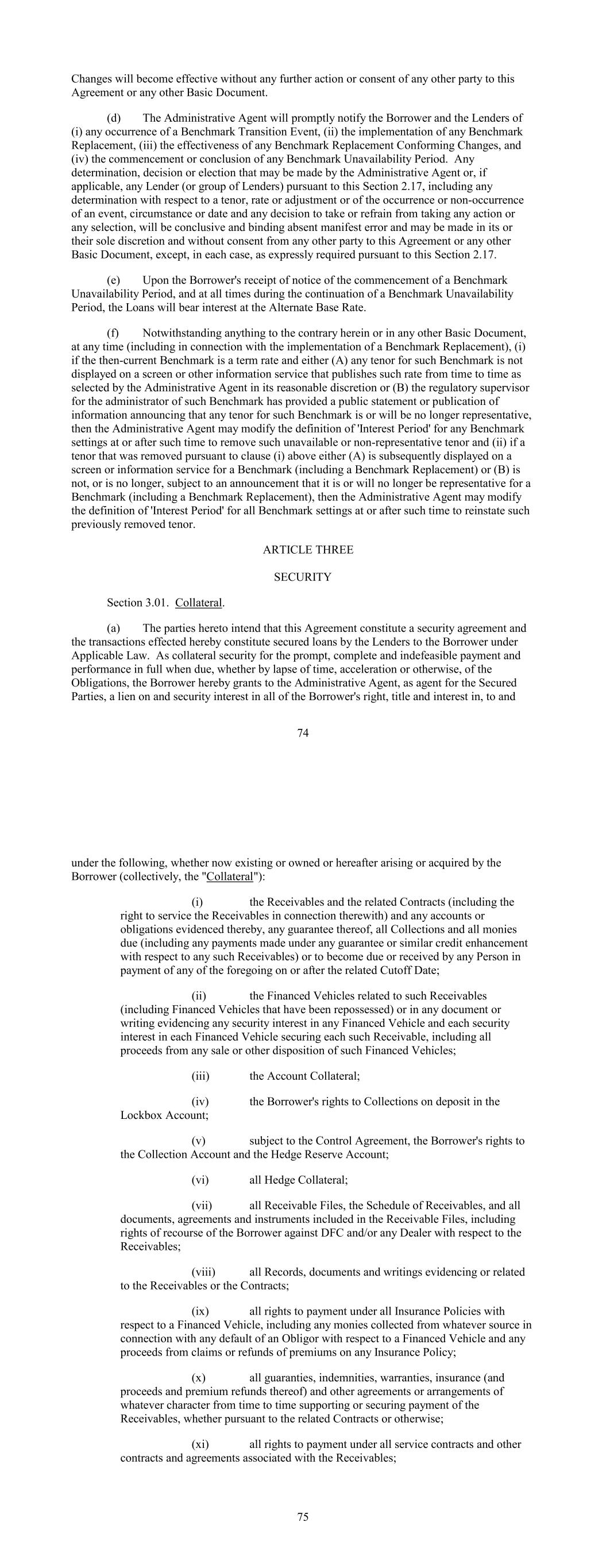 Changes will become effective without any further action or consent of any other party to this Agreement or any other Basic Document. (d) The Administrative Agent will promptly notify the Borrower and the Lenders of (i) any occurrence of a Benchmark Transition Event, (ii) the implementation of any Benchmark Replacement, (iii) the effectiveness of any Benchmark Replacement Conforming Changes, and (iv) the commencement or conclusion of any Benchmark Unavailability Period. Any determination, decision or election that may be made by the Administrative Agent or, if applicable, any Lender (or group of Lenders) pursuant to this Section 2.17, including any determination with respect to a tenor, rate or adjustment or of the occurrence or non-occurrence of an event, circumstance or date and any decision to take or refrain from taking any action or any selection, will be conclusive and binding absent manifest error and may be made in its or their sole discretion and without consent from any other party to this Agreement or any other Basic Document, except, in each case, as expressly required pursuant to this Section 2.17. (e) Upon the Borrower's receipt of notice of the commencement of a Benchmark Unavailability Period, and at all times during the continuation of a Benchmark Unavailability Period, the Loans will bear interest at the Alternate Base Rate. (f) Notwithstanding anything to the contrary herein or in any other Basic Document, at any time (including in connection with the implementation of a Benchmark Replacement), (i) if the then-current Benchmark is a term rate and either (A) any tenor for such Benchmark is not displayed on a screen or other information service that publishes such rate from time to time as selected by the Administrative Agent in its reasonable discretion or (B) the regulatory supervisor for the administrator of such Benchmark has provided a public statement or publication of information announcing that any tenor for such Benchmark is or will be no longer representative, then the Administrative Agent may modify the definition of 'Interest Period' for any Benchmark settings at or after such time to remove such unavailable or non-representative tenor and (ii) if a tenor that was removed pursuant to clause (i) above either (A) is subsequently displayed on a screen or information service for a Benchmark (including a Benchmark Replacement) or (B) is not, or is no longer, subject to an announcement that it is or will no longer be representative for a Benchmark (including a Benchmark Replacement), then the Administrative Agent may modify the definition of 'Interest Period' for all Benchmark settings at or after such time to reinstate such previously removed tenor. ARTICLE THREE SECURITY Section 3.01. Collateral. (a) The parties hereto intend that this Agreement constitute a security agreement and the transactions effected hereby constitute secured loans by the Lenders to the Borrower under Applicable Law. As collateral security for the prompt, complete and indefeasible payment and performance in full when due, whether by lapse of time, acceleration or otherwise, of the Obligations, the Borrower hereby grants to the Administrative Agent, as agent for the Secured Parties, a lien on and security interest in all of the Borrower's right, title and interest in, to and 74 under the following, whether now existing or owned or hereafter arising or acquired by the Borrower (collectively, the "Collateral"): (i) the Receivables and the related Contracts (including the right to service the Receivables in connection therewith) and any accounts or obligations evidenced thereby, any guarantee thereof, all Collections and all monies due (including any payments made under any guarantee or similar credit enhancement with respect to any such Receivables) or to become due or received by any Person in payment of any of the foregoing on or after the related Cutoff Date; (ii) the Financed Vehicles related to such Receivables (including Financed Vehicles that have been repossessed) or in any document or writing evidencing any security interest in any Financed Vehicle and each security interest in each Financed Vehicle securing each such Receivable, including all proceeds from any sale or other disposition of such Financed Vehicles; (iii) the Account Collateral; (iv) the Borrower's rights to Collections on deposit in the Lockbox Account; (v) subject to the Control Agreement, the Borrower's rights to the Collection Account and the Hedge Reserve Account; (vi) all Hedge Collateral; (vii) all Receivable Files, the Schedule of Receivables, and all documents, agreements and instruments included in the Receivable Files, including rights of recourse of the Borrower against DFC and/or any Dealer with respect to the Receivables; (viii) all Records, documents and writings evidencing or related to the Receivables or the Contracts; (ix) all rights to payment under all Insurance Policies with respect to a Financed Vehicle, including any monies collected from whatever source in connection with any default of an Obligor with respect to a Financed Vehicle and any proceeds from claims or refunds of premiums on any Insurance Policy; (x) all guaranties, indemnities, warranties, insurance (and proceeds and premium refunds thereof) and other agreements or arrangements of whatever character from time to time supporting or securing payment of the Receivables, whether pursuant to the related Contracts or otherwise; (xi) all rights to payment under all service contracts and other contracts and agreements associated with the Receivables; 75