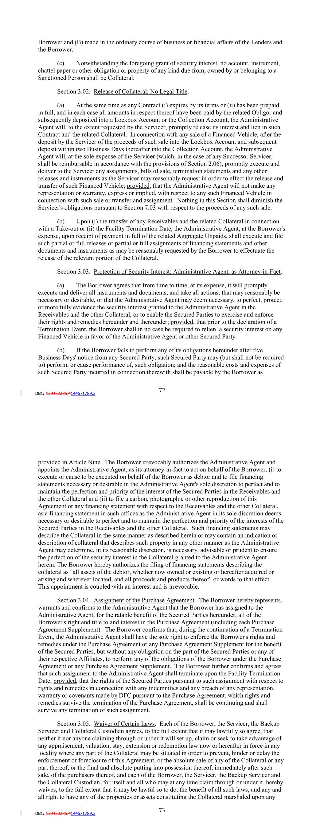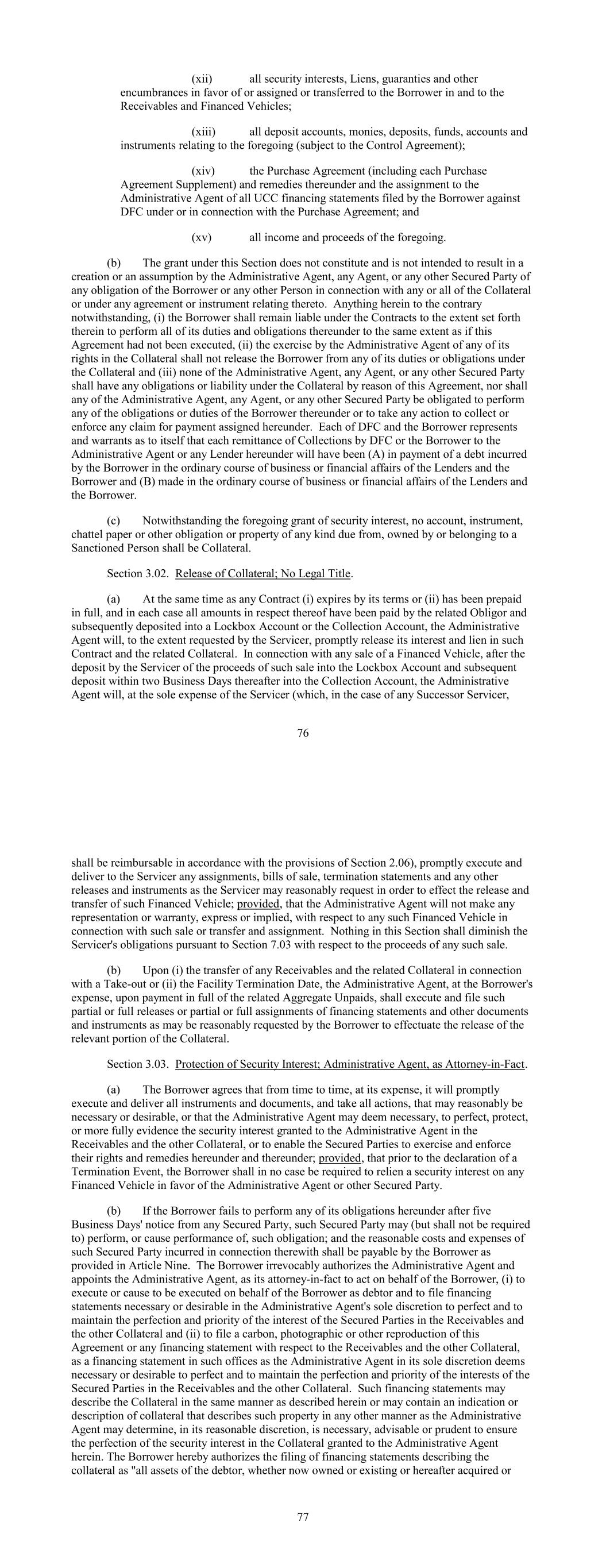 (xii) all security interests, Liens, guaranties and other encumbrances in favor of or assigned or transferred to the Borrower in and to the Receivables and Financed Vehicles; (xiii) all deposit accounts, monies, deposits, funds, accounts and instruments relating to the foregoing (subject to the Control Agreement); (xiv) the Purchase Agreement (including each Purchase Agreement Supplement) and remedies thereunder and the assignment to the Administrative Agent of all UCC financing statements filed by the Borrower against DFC under or in connection with the Purchase Agreement; and (xv) all income and proceeds of the foregoing. (b) The grant under this Section does not constitute and is not intended to result in a creation or an assumption by the Administrative Agent, any Agent, or any other Secured Party of any obligation of the Borrower or any other Person in connection with any or all of the Collateral or under any agreement or instrument relating thereto. Anything herein to the contrary notwithstanding, (i) the Borrower shall remain liable under the Contracts to the extent set forth therein to perform all of its duties and obligations thereunder to the same extent as if this Agreement had not been executed, (ii) the exercise by the Administrative Agent of any of its rights in the Collateral shall not release the Borrower from any of its duties or obligations under the Collateral and (iii) none of the Administrative Agent, any Agent, or any other Secured Party shall have any obligations or liability under the Collateral by reason of this Agreement, nor shall any of the Administrative Agent, any Agent, or any other Secured Party be obligated to perform any of the obligations or duties of the Borrower thereunder or to take any action to collect or enforce any claim for payment assigned hereunder. Each of DFC and the Borrower represents and warrants as to itself that each remittance of Collections by DFC or the Borrower to the Administrative Agent or any Lender hereunder will have been (A) in payment of a debt incurred by the Borrower in the ordinary course of business or financial affairs of the Lenders and the Borrower and (B) made in the ordinary course of business or financial affairs of the Lenders and the Borrower. (c) Notwithstanding the foregoing grant of security interest, no account, instrument, chattel paper or other obligation or property of any kind due from, owned by or belonging to a Sanctioned Person shall be Collateral. Section 3.02. Release of Collateral; No Legal Title. (a) At the same time as any Contract (i) expires by its terms or (ii) has been prepaid in full, and in each case all amounts in respect thereof have been paid by the related Obligor and subsequently deposited into a Lockbox Account or the Collection Account, the Administrative Agent will, to the extent requested by the Servicer, promptly release its interest and lien in such Contract and the related Collateral. In connection with any sale of a Financed Vehicle, after the deposit by the Servicer of the proceeds of such sale into the Lockbox Account and subsequent deposit within two Business Days thereafter into the Collection Account, the Administrative Agent will, at the sole expense of the Servicer (which, in the case of any Successor Servicer, 76 shall be reimbursable in accordance with the provisions of Section 2.06), promptly execute and deliver to the Servicer any assignments, bills of sale, termination statements and any other releases and instruments as the Servicer may reasonably request in order to effect the release and transfer of such Financed Vehicle; provided, that the Administrative Agent will not make any representation or warranty, express or implied, with respect to any such Financed Vehicle in connection with such sale or transfer and assignment. Nothing in this Section shall diminish the Servicer's obligations pursuant to Section 7.03 with respect to the proceeds of any such sale. (b) Upon (i) the transfer of any Receivables and the related Collateral in connection with a Take-out or (ii) the Facility Termination Date, the Administrative Agent, at the Borrower's expense, upon payment in full of the related Aggregate Unpaids, shall execute and file such partial or full releases or partial or full assignments of financing statements and other documents and instruments as may be reasonably requested by the Borrower to effectuate the release of the relevant portion of the Collateral. Section 3.03. Protection of Security Interest; Administrative Agent, as Attorney-in-Fact. (a) The Borrower agrees that from time to time, at its expense, it will promptly execute and deliver all instruments and documents, and take all actions, that may reasonably be necessary or desirable, or that the Administrative Agent may deem necessary, to perfect, protect, or more fully evidence the security interest granted to the Administrative Agent in the Receivables and the other Collateral, or to enable the Secured Parties to exercise and enforce their rights and remedies hereunder and thereunder; provided, that prior to the declaration of a Termination Event, the Borrower shall in no case be required to relien a security interest on any Financed Vehicle in favor of the Administrative Agent or other Secured Party. (b) If the Borrower fails to perform any of its obligations hereunder after five Business Days' notice from any Secured Party, such Secured Party may (but shall not be required to) perform, or cause performance of, such obligation; and the reasonable costs and expenses of such Secured Party incurred in connection therewith shall be payable by the Borrower as provided in Article Nine. The Borrower irrevocably authorizes the Administrative Agent and appoints the Administrative Agent, as its attorney-in-fact to act on behalf of the Borrower, (i) to execute or cause to be executed on behalf of the Borrower as debtor and to file financing statements necessary or desirable in the Administrative Agent's sole discr