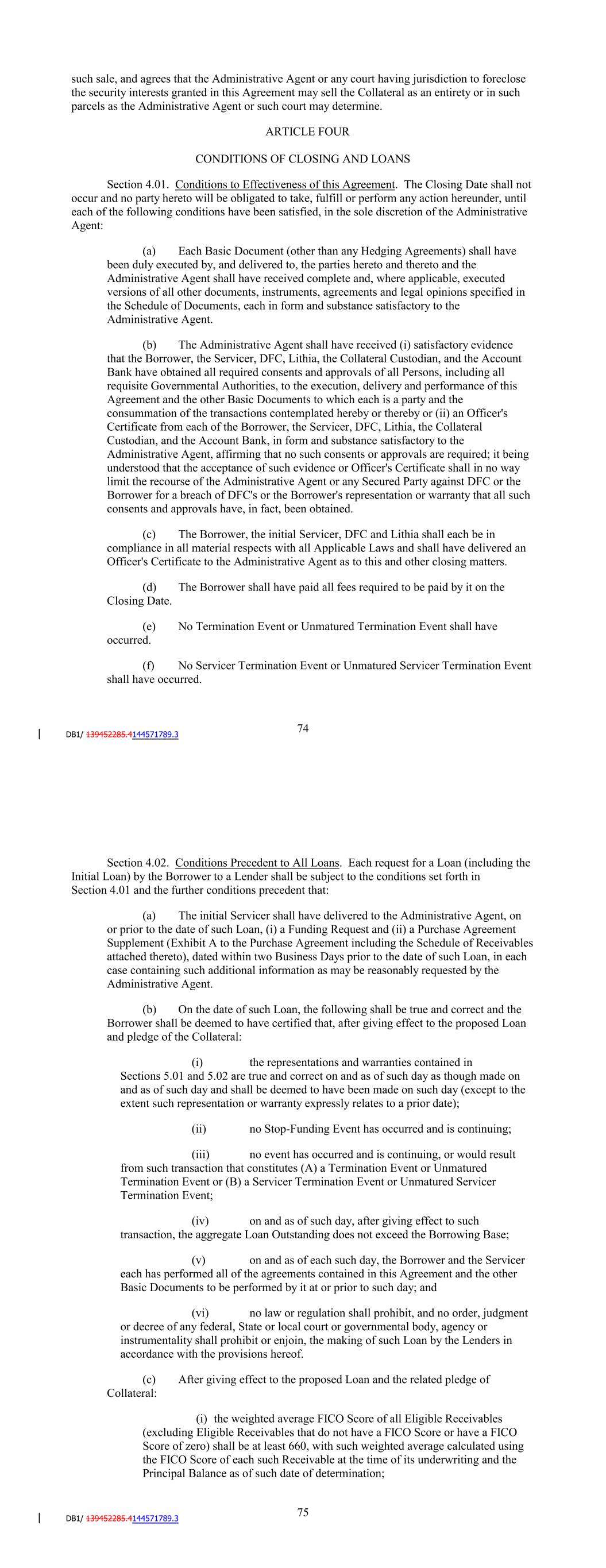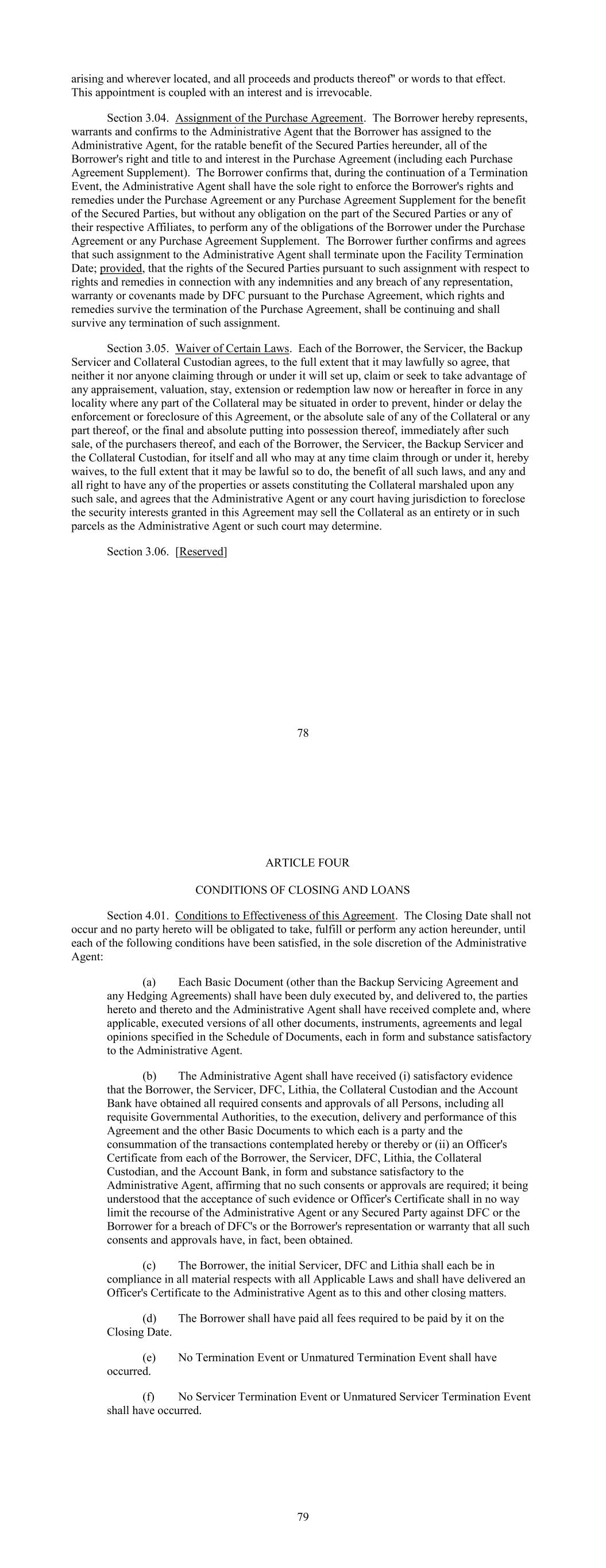 arising and wherever located, and all proceeds and products thereof" or words to that effect. This appointment is coupled with an interest and is irrevocable. Section 3.04. Assignment of the Purchase Agreement. The Borrower hereby represents, warrants and confirms to the Administrative Agent that the Borrower has assigned to the Administrative Agent, for the ratable benefit of the Secured Parties hereunder, all of the Borrower's right and title to and interest in the Purchase Agreement (including each Purchase Agreement Supplement). The Borrower confirms that, during the continuation of a Termination Event, the Administrative Agent shall have the sole right to enforce the Borrower's rights and remedies under the Purchase Agreement or any Purchase Agreement Supplement for the benefit of the Secured Parties, but without any obligation on the part of the Secured Parties or any of their respective Affiliates, to perform any of the obligations of the Borrower under the Purchase Agreement or any Purchase Agreement Supplement. The Borrower further confirms and agrees that such assignment to the Administrative Agent shall terminate upon the Facility Termination Date; provided, that the rights of the Secured Parties pursuant to such assignment with respect to rights and remedies in connection with any indemnities and any breach of any representation, warranty or covenants made by DFC pursuant to the Purchase Agreement, which rights and remedies survive the termination of the Purchase Agreement, shall be continuing and shall survive any termination of such assignment. Section 3.05. Waiver of Certain Laws. Each of the Borrower, the Servicer, the Backup Servicer and Collateral Custodian agrees, to the full extent that it may lawfully so agree, that neither it nor anyone claiming through or under it will set up, claim or seek to take advantage of any appraisement, valuation, stay, extension or redemption law now or hereafter in force in any locality where any part of the Collateral may be situated in order to prevent, hinder or delay the enforcement or foreclosure of this Agreement, or the absolute sale of any of the Collateral or any part thereof, or the final and absolute putting into possession thereof, immediately after such sale, of the purchasers thereof, and each of the Borrower, the Servicer, the Backup Servicer and the Collateral Custodian, for itself and all who may at any time claim through or under it, hereby waives, to the full extent that it may be lawful so to do, the benefit of all such laws, and any and all right to have any of the properties or assets constituting the Collateral marshaled upon any such sale, and agrees that the Administrative Agent or any court having jurisdiction to foreclose the security interests granted in this Agreement may sell the Collateral as an entirety or in such parcels as the Administrative Agent or such court may determine. Section 3.06. [Reserved] 78 ARTICLE FOUR CONDITIONS OF CLOSING AND LOANS Section 4.01. Conditions to Effectiveness of this Agreement. The Closing Date shall not occur and no party hereto will be obligated to take, fulfill or perform any action hereunder, until each of the following conditions have been satisfied, in the sole discretion of the Administrative Agent: (a) Each Basic Document (other than the Backup Servicing Agreement and any Hedging Agreements) shall have been duly executed by, and delivered to, the parties hereto and thereto and the Administrative Agent shall have received complete and, where applicable, executed versions of all other documents, instruments, agreements and legal opinions specified in the Schedule of Documents, each in form and substance satisfactory to the Administrative Agent. (b) The Administrative Agent shall have received (i) satisfactory evidence that the Borrower, the Servicer, DFC, Lithia, the Collateral Custodian and the Account Bank have obtained all required consents and approvals of all Persons, including all requisite Governmental Authorities, to the execution, delivery and performance of this Agreement and the other Basic Documents to which each is a party and the consummation of the transactions contemplated hereby or thereby or (ii) an Officer's Certificate from each of the Borrower, the Servicer, DFC, Lithia, the Collateral Custodian, and the Account Bank, in form and substance satisfactory to the Administrative Agent, affirming that no such consents or approvals are required; it being understood that the acceptance of such evidence or Officer's Certificate shall in no way limit the recourse of the Administrative Agent or any Secured Party against DFC or the Borrower for a breach of DFC's or the Borrower's representation or warranty that all such consents and approvals have, in fact, been obtained. (c) The Borrower, the initial Servicer, DFC and Lithia shall each be in compliance in all material respects with all Applicable Laws and shall have delivered an Officer's Certificate to the Administrative Agent as to this and other closing matters. (d) The Borrower shall have paid all fees required to be paid by it on the Closing Date. (e) No Termination Event or Unmatured Termination Event shall have occurred. (f) No Servicer Termination Event or Unmatured Servicer Termination Event shall have occurred. 79
