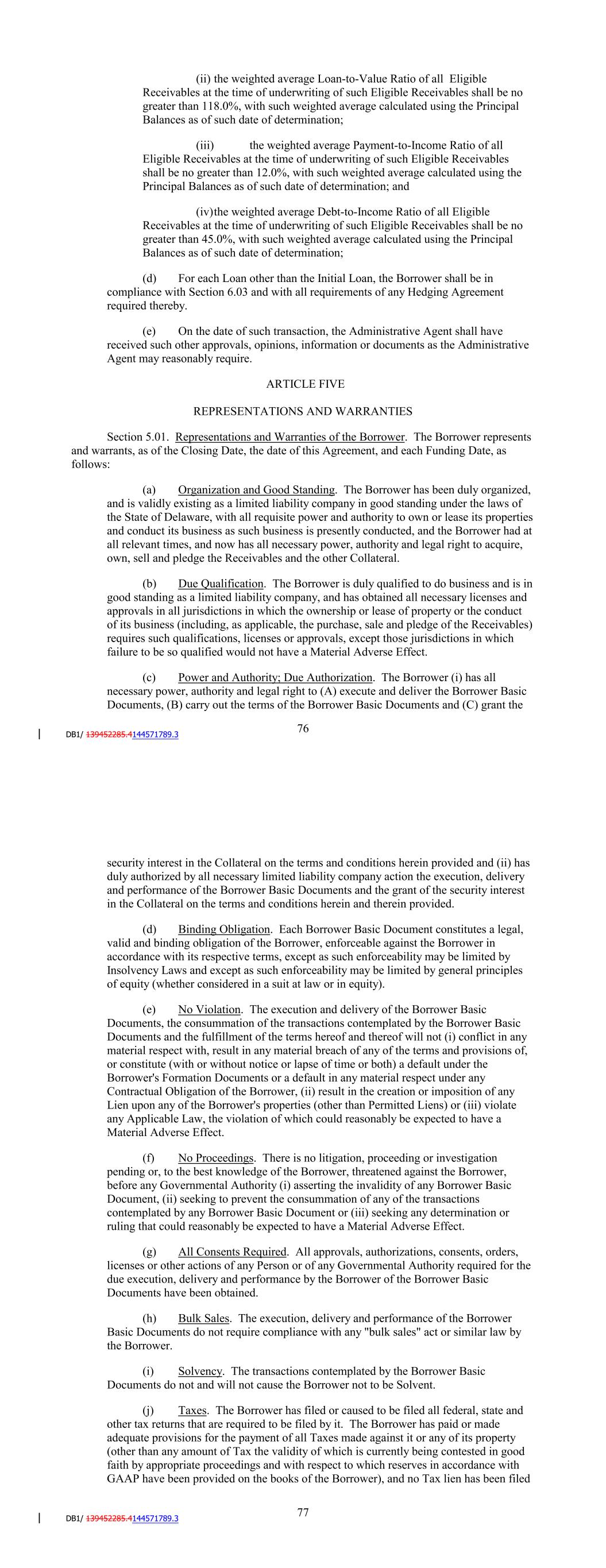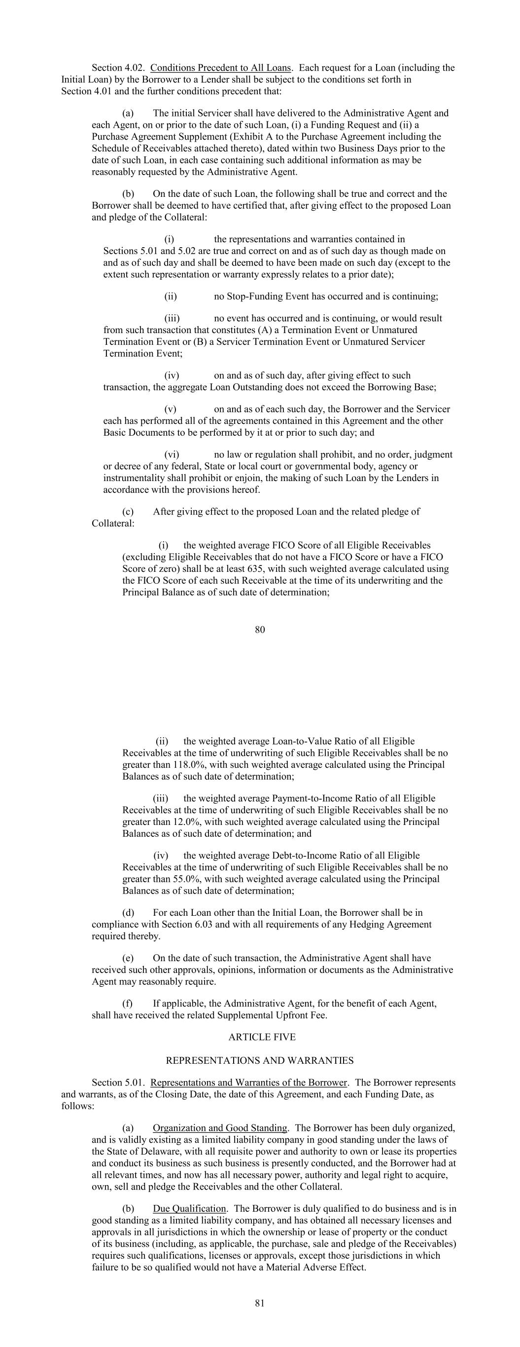 Section 4.02. Conditions Precedent to All Loans. Each request for a Loan (including the Initial Loan) by the Borrower to a Lender shall be subject to the conditions set forth in Section 4.01 and the further conditions precedent that: (a) The initial Servicer shall have delivered to the Administrative Agent and each Agent, on or prior to the date of such Loan, (i) a Funding Request and (ii) a Purchase Agreement Supplement (Exhibit A to the Purchase Agreement including the Schedule of Receivables attached thereto), dated within two Business Days prior to the date of such Loan, in each case containing such additional information as may be reasonably requested by the Administrative Agent. (b) On the date of such Loan, the following shall be true and correct and the Borrower shall be deemed to have certified that, after giving effect to the proposed Loan and pledge of the Collateral: (i) the representations and warranties contained in Sections 5.01 and 5.02 are true and correct on and as of such day as though made on and as of such day and shall be deemed to have been made on such day (except to the extent such representation or warranty expressly relates to a prior date); (ii) no Stop-Funding Event has occurred and is continuing; (iii) no event has occurred and is continuing, or would result from such transaction that constitutes (A) a Termination Event or Unmatured Termination Event or (B) a Servicer Termination Event or Unmatured Servicer Termination Event; (iv) on and as of such day, after giving effect to such transaction, the aggregate Loan Outstanding does not exceed the Borrowing Base; (v) on and as of each such day, the Borrower and the Servicer each has performed all of the agreements contained in this Agreement and the other Basic Documents to be performed by it at or prior to such day; and (vi) no law or regulation shall prohibit, and no order, judgment or decree of any federal, State or local court or governmental body, agency or instrumentality shall prohibit or enjoin, the making of such Loan by the Lenders in accordance with the provisions hereof. (c) After giving effect to the proposed Loan and the related pledge of Collateral: (i) the weighted average FICO Score of all Eligible Receivables (excluding Eligible Receivables that do not have a FICO Score or have a FICO Score of zero) shall be at least 635, with such weighted average calculated using the FICO Score of each such Receivable at the time of its underwriting and the Principal Balance as of such date of determination; 80 (ii) the weighted average Loan-to-Value Ratio of all Eligible Receivables at the time of underwriting of such Eligible Receivables shall be no greater than 118.0%, with such weighted average calculated using the Principal Balances as of such date of determination; (iii) the weighted average Payment-to-Income Ratio of all Eligible Receivables at the time of underwriting of such Eligible Receivables shall be no greater than 12.0%, with such weighted average calculated using the Principal Balances as of such date of determination; and (iv) the weighted average Debt-to-Income Ratio of all Eligible Receivables at the time of underwriting of such Eligible Receivables shall be no greater than 55.0%, with such weighted average calculated using the Principal Balances as of such date of determination; (d) For each Loan other than the Initial Loan, the Borrower shall be in compliance with Section 6.03 and with all requirements of any Hedging Agreement required thereby. (e) On the date of such transaction, the Administrative Agent shall have received such other approvals, opinions, information or documents as the Administrative Agent may reasonably require. (f) If applicable, the Administrative Agent, for the benefit of each Agent, shall have received the related Supplemental Upfront Fee. ARTICLE FIVE REPRESENTATIONS AND WARRANTIES Section 5.01. Representations and Warranties of the Borrower. The Borrower represents and warrants, as of the Closing Date, the date of this Agreement, and each Funding Date, as follows: (a) Organization and Good Standing. The Borrower has been duly organized, and is validly existing as a limited liability company in good standing under the laws of the State of Delaware, with all requisite power and authority to own or lease its properties and conduct its business as such business is presently conducted, and the Borrower had at all relevant times, and now has all necessary power, authority and legal right to acquire, own, sell and pledge the Receivables and the other Collateral. (b) Due Qualification. The Borrower is duly qualified to do business and is in good standing as a limited liability company, and has obtained all necessary licenses and approvals in all jurisdictions in which the ownership or lease of property or the conduct of its business (including, as applicable, the purchase, sale and pledge of the Receivables) requires such qualifications, licenses or approvals, except those jurisdictions in which failure to be so qualified would not have a Material Adverse Effect. 81