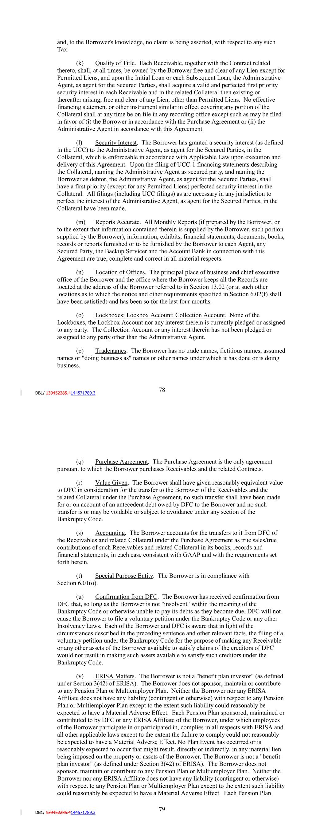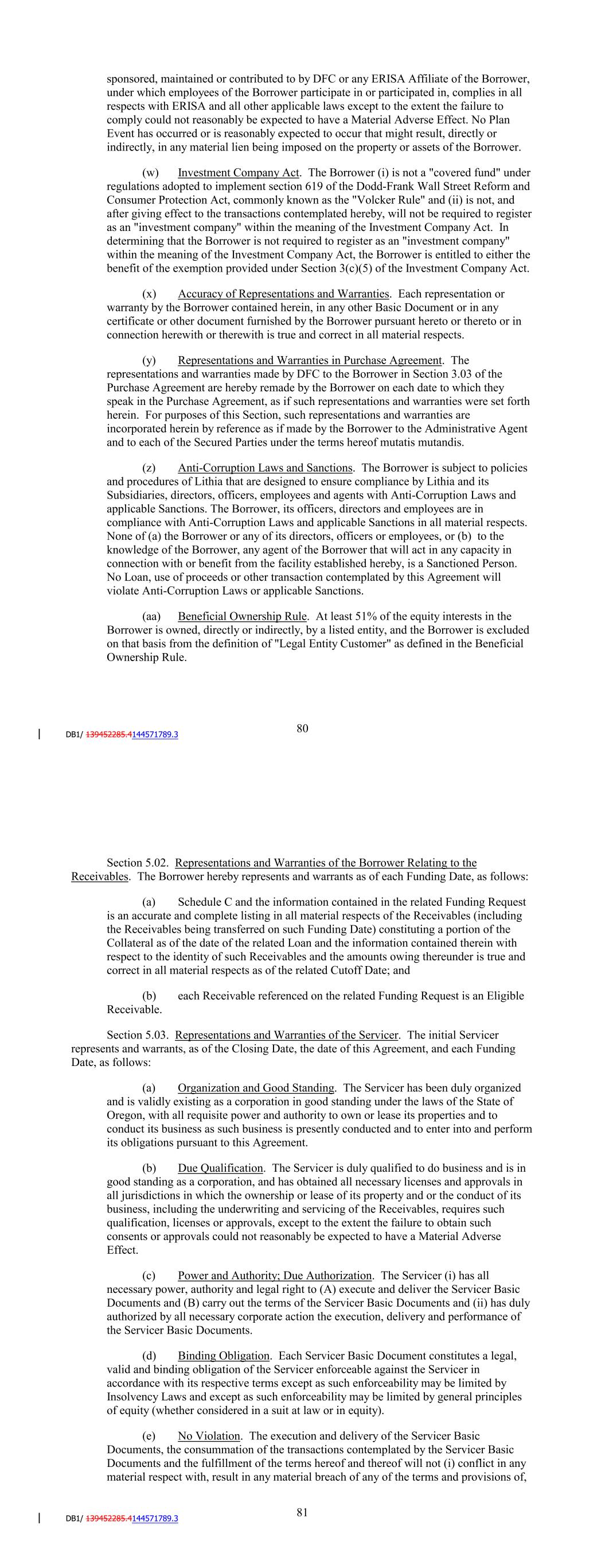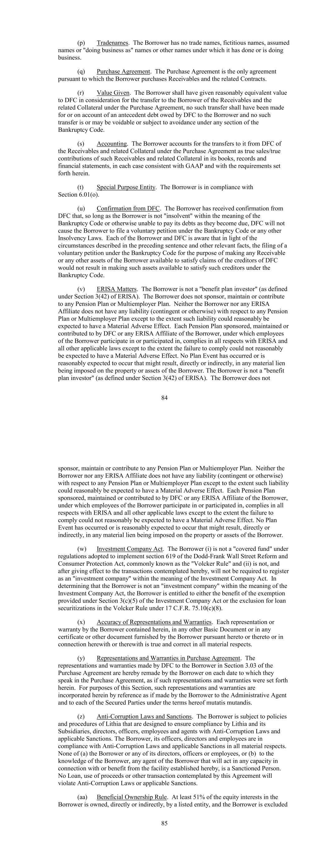 (p) Tradenames. The Borrower has no trade names, fictitious names, assumed names or "doing business as" names or other names under which it has done or is doing business. (q) Purchase Agreement. The Purchase Agreement is the only agreement pursuant to which the Borrower purchases Receivables and the related Contracts. (r) Value Given. The Borrower shall have given reasonably equivalent value to DFC in consideration for the transfer to the Borrower of the Receivables and the related Collateral under the Purchase Agreement, no such transfer shall have been made for or on account of an antecedent debt owed by DFC to the Borrower and no such transfer is or may be voidable or subject to avoidance under any section of the Bankruptcy Code. (s) Accounting. The Borrower accounts for the transfers to it from DFC of the Receivables and related Collateral under the Purchase Agreement as true sales/true contributions of such Receivables and related Collateral in its books, records and financial statements, in each case consistent with GAAP and with the requirements set forth herein. (t) Special Purpose Entity. The Borrower is in compliance with Section 6.01(o). (u) Confirmation from DFC. The Borrower has received confirmation from DFC that, so long as the Borrower is not "insolvent" within the meaning of the Bankruptcy Code or otherwise unable to pay its debts as they become due, DFC will not cause the Borrower to file a voluntary petition under the Bankruptcy Code or any other Insolvency Laws. Each of the Borrower and DFC is aware that in light of the circumstances described in the preceding sentence and other relevant facts, the filing of a voluntary petition under the Bankruptcy Code for the purpose of making any Receivable or any other assets of the Borrower available to satisfy claims of the creditors of DFC would not result in making such assets available to satisfy such creditors under the Bankruptcy Code. (v) ERISA Matters. The Borrower is not a "benefit plan investor" (as defined under Section 3(42) of ERISA). The Borrower does not sponsor, maintain or contribute to any Pension Plan or Multiemployer Plan. Neither the Borrower nor any ERISA Affiliate does not have any liability (contingent or otherwise) with respect to any Pension Plan or Multiemployer Plan except to the extent such liability could reasonably be expected to have a Material Adverse Effect. Each Pension Plan sponsored, maintained or contributed to by DFC or any ERISA Affiliate of the Borrower, under which employees of the Borrower participate in or participated in, complies in all respects with ERISA and all other applicable laws except to the extent the failure to comply could not reasonably be expected to have a Material Adverse Effect. No Plan Event has occurred or is reasonably expected to occur that might result, directly or indirectly, in any material lien being imposed on the property or assets of the Borrower. The Borrower is not a "benefit plan investor" (as defined under Section 3(42) of ERISA). The Borrower does not 84 sponsor, maintain or contribute to any Pension Plan or Multiemployer Plan. Neither the Borrower nor any ERISA Affiliate does not have any liability (contingent or otherwise) with respect to any Pension Plan or Multiemployer Plan except to the extent such liability could reasonably be expected to have a Material Adverse Effect. Each Pension Plan sponsored, maintained or contributed to by DFC or any ERISA Affiliate of the Borrower, under which employees of the Borrower participate in or participated in, complies in all respects with ERISA and all other applicable laws except to the extent the failure to comply could not reasonably be expected to have a Material Adverse Effect. No Plan Event has occurred or is reasonably expected to occur that might result, directly or indirectly, in any material lien being imposed on the property or assets of the Borrower. (w) Investment Company Act. The Borrower (i) is not a "covered fund" under regulations adopted to implement section 619 of the Dodd-Frank Wall Street Reform and Consumer Protection Act, commonly known as the "Volcker Rule" and (ii) is not, and after giving effect to the transactions contemplated hereby, will not be required to register as an "investment company" within the meaning of the Investment Company Act. In determining that the Borrower is not an "investment company" within the meaning of the Investment Company Act, the Borrower is entitled to either the benefit of the exemption provided under Section 3(c)(5) of the Investment Company Act or the exclusion for loan securitizations in the Volcker Rule under 17 C.F.R. 75.10(c)(8). (x) Accuracy of Representations and Warranties. Each representation or warranty by the Borrower contained herein, in any other Basic Document or in any certificate or other document furnished by the Borrower pursuant hereto or thereto or in connection herewith or therewith is true and correct in all material respects. (y) Representations and Warranties in Purchase Agreement. The representations and warranties made by DFC to the Borrower in Section 3.03 of the Purchase Agreement are hereby remade by the Borrower on each date to which they speak in the Purchase Agreement, as if such representations and warranties were set forth herein. For purposes of this Section, such representations and warranties are incorporated herein by reference as if made by the Borrower to the Administrative Agent and to each of the Secured Parties under the terms hereof mutatis mutandis. (z) Anti-Corruption Laws and Sanctions. The Borrower is subject to policies and procedures of Lithia that are designed to ensure compliance by Lithia and its Subsidiaries, directors, officers, employees and agents with Anti-Corruption Laws and applicable Sanctions. The Borrower, its officers, directors and employees are in compliance with Anti-Corruption Laws and applicable Sanctions in all material respects. None of (a) the Borrower or any of its directors, offi